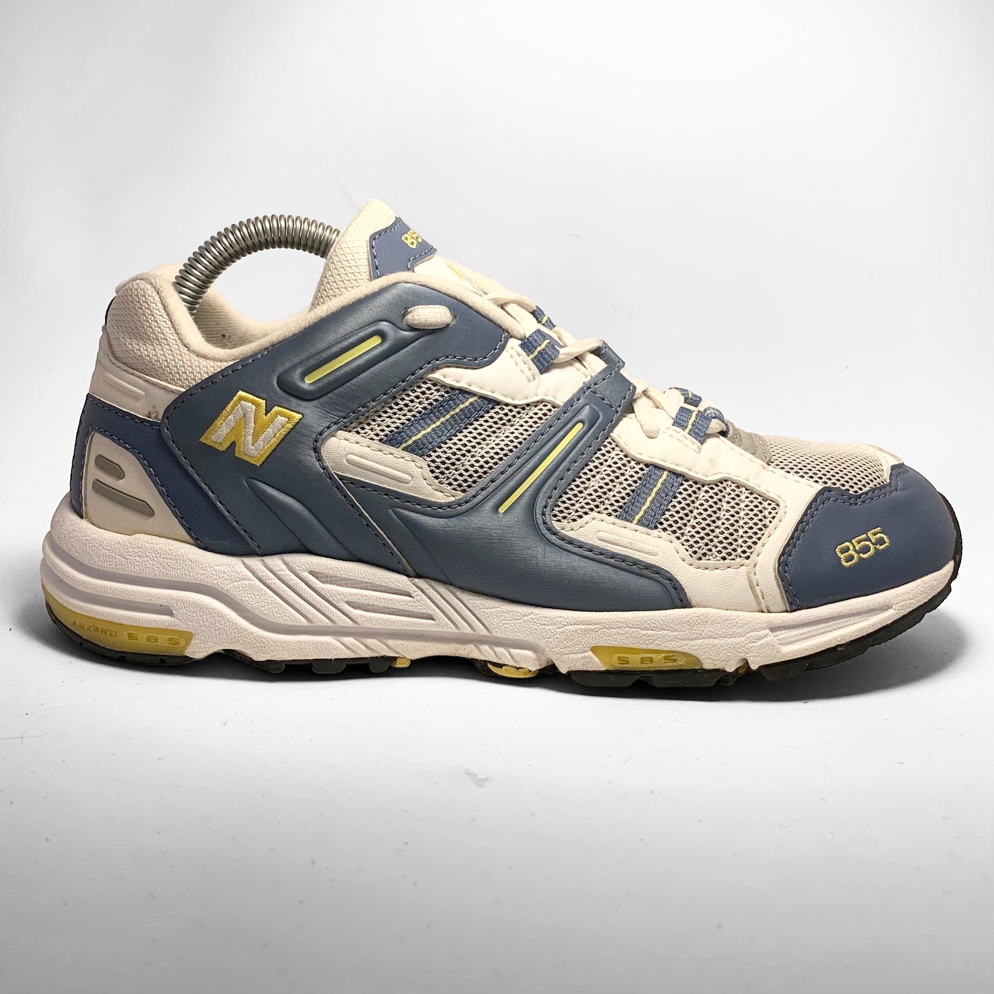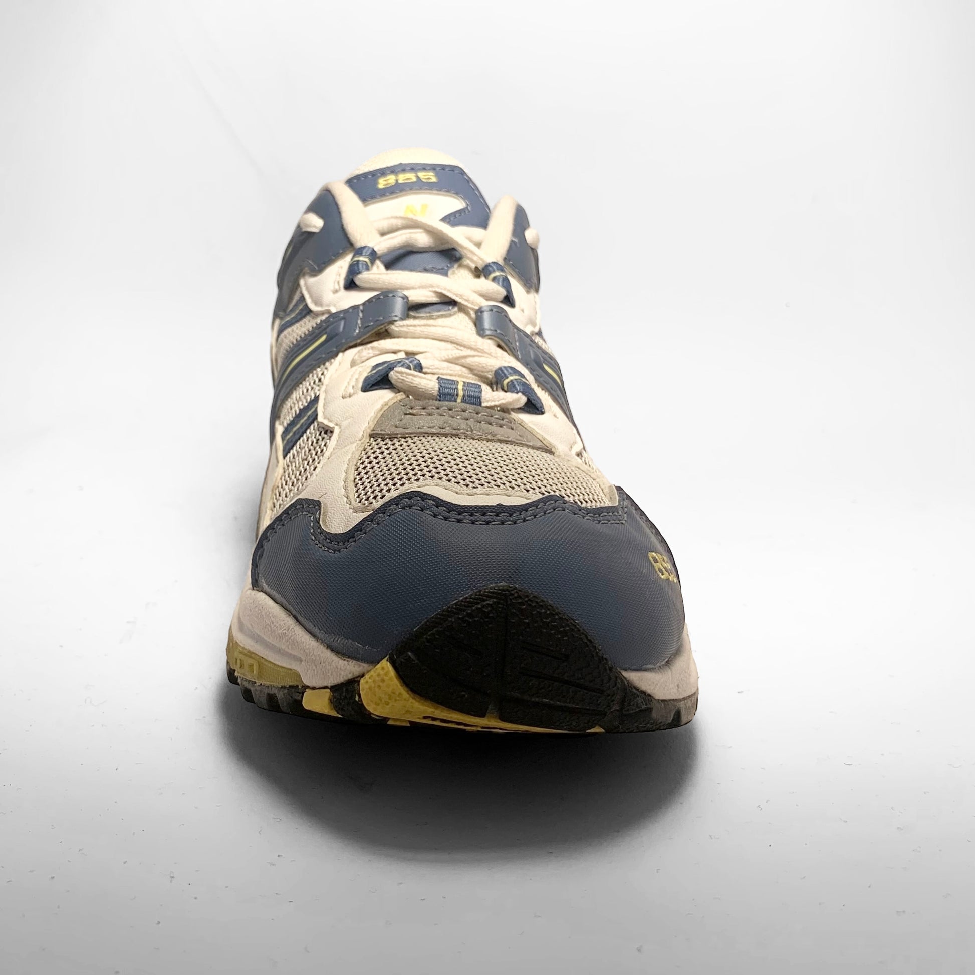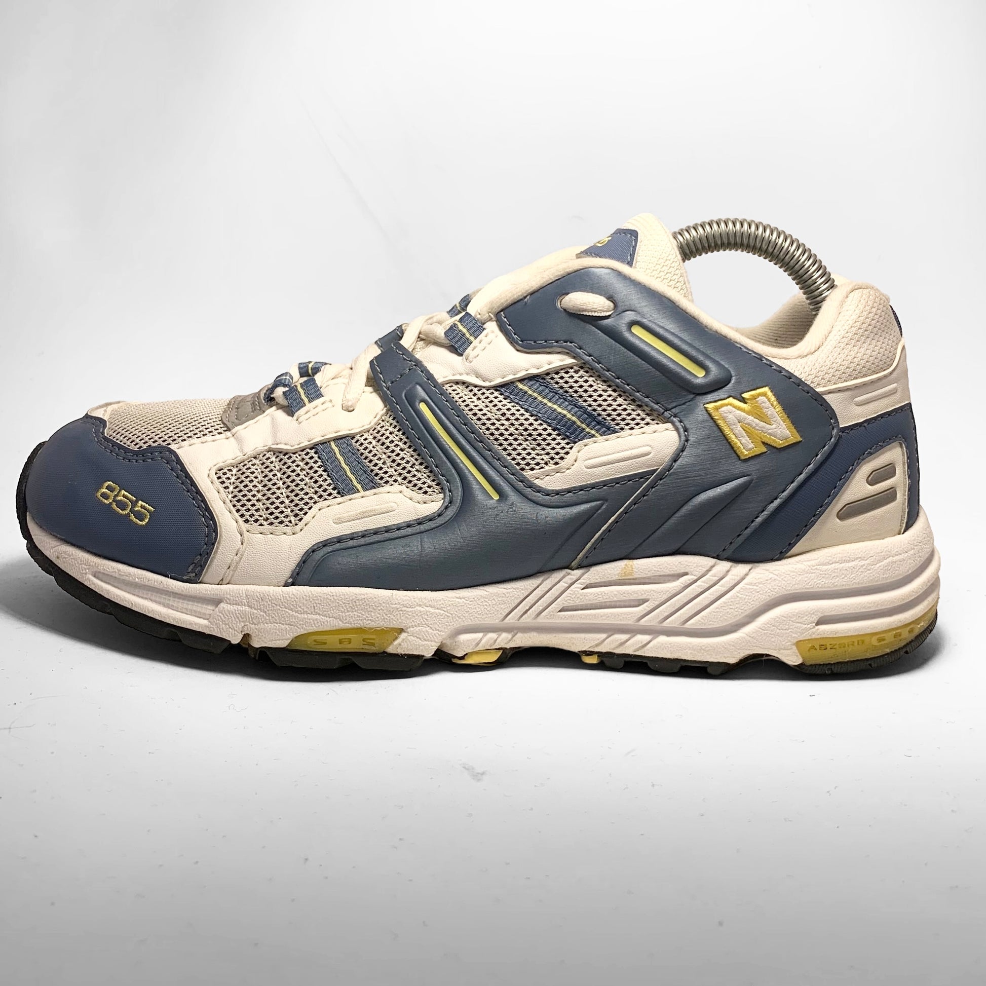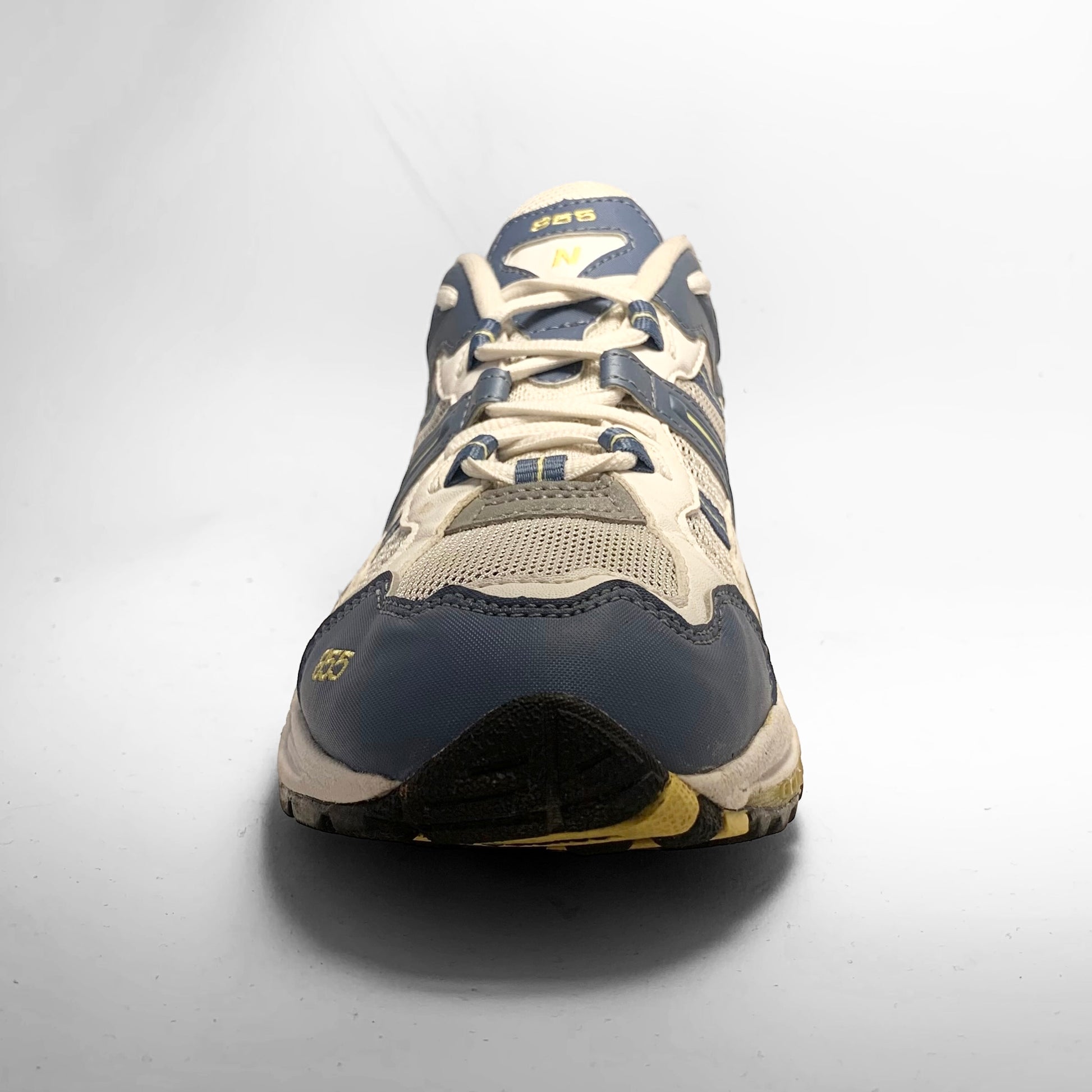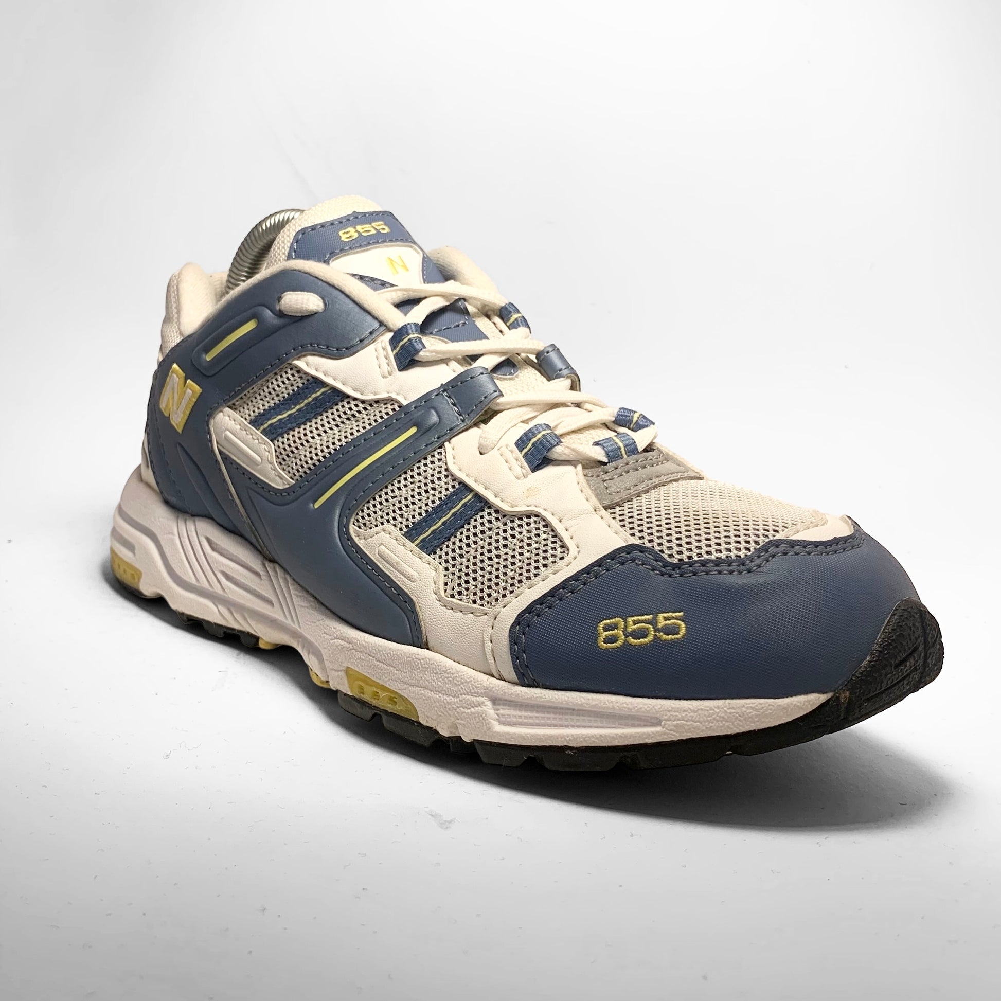 White mesh layered with white and arctic blue leather panels, yellow stripe and branding details, and Rollbar system for stability and comfort.