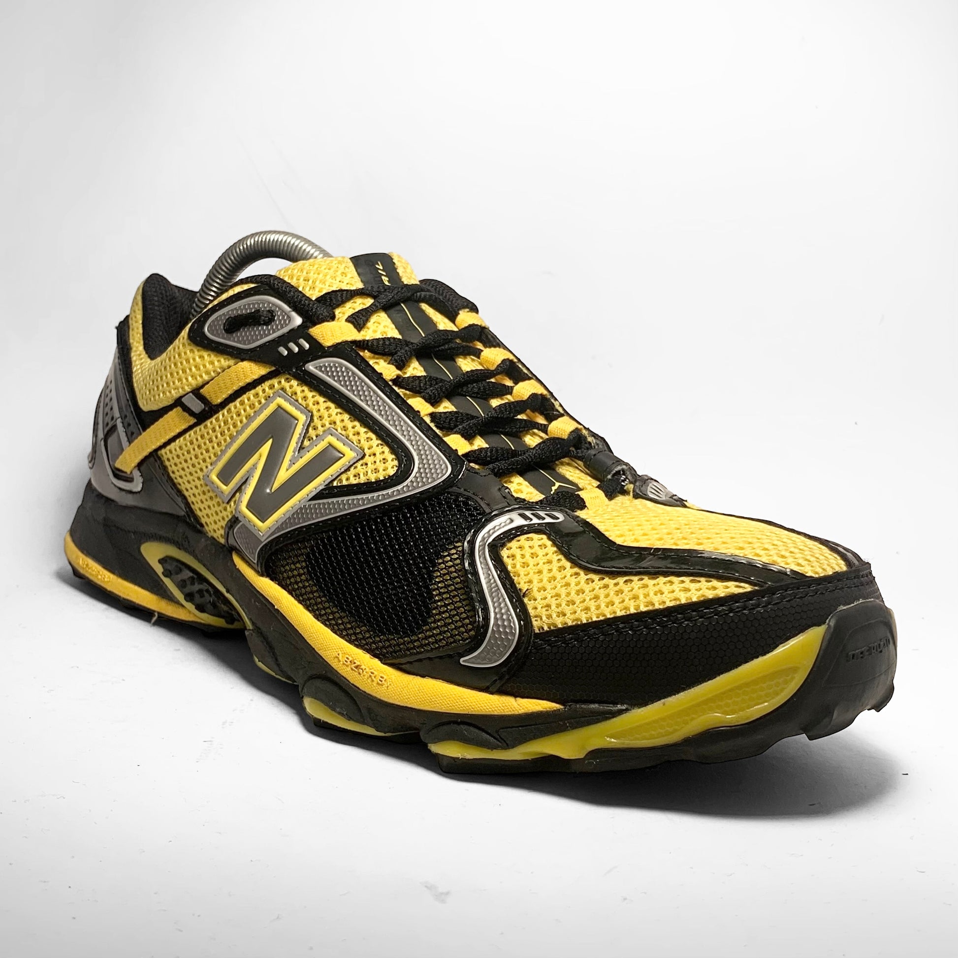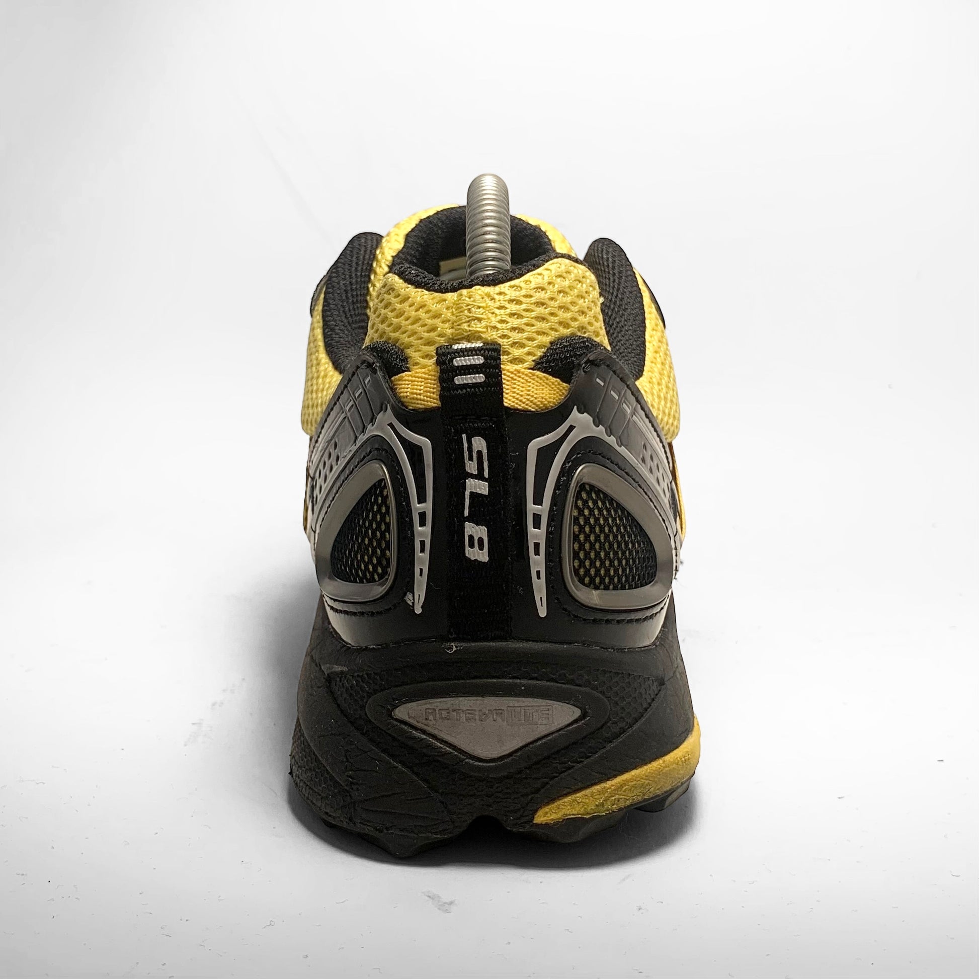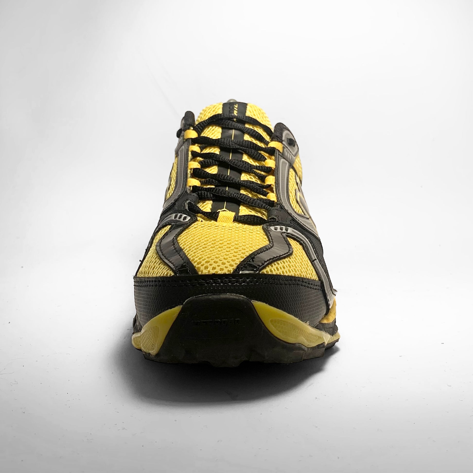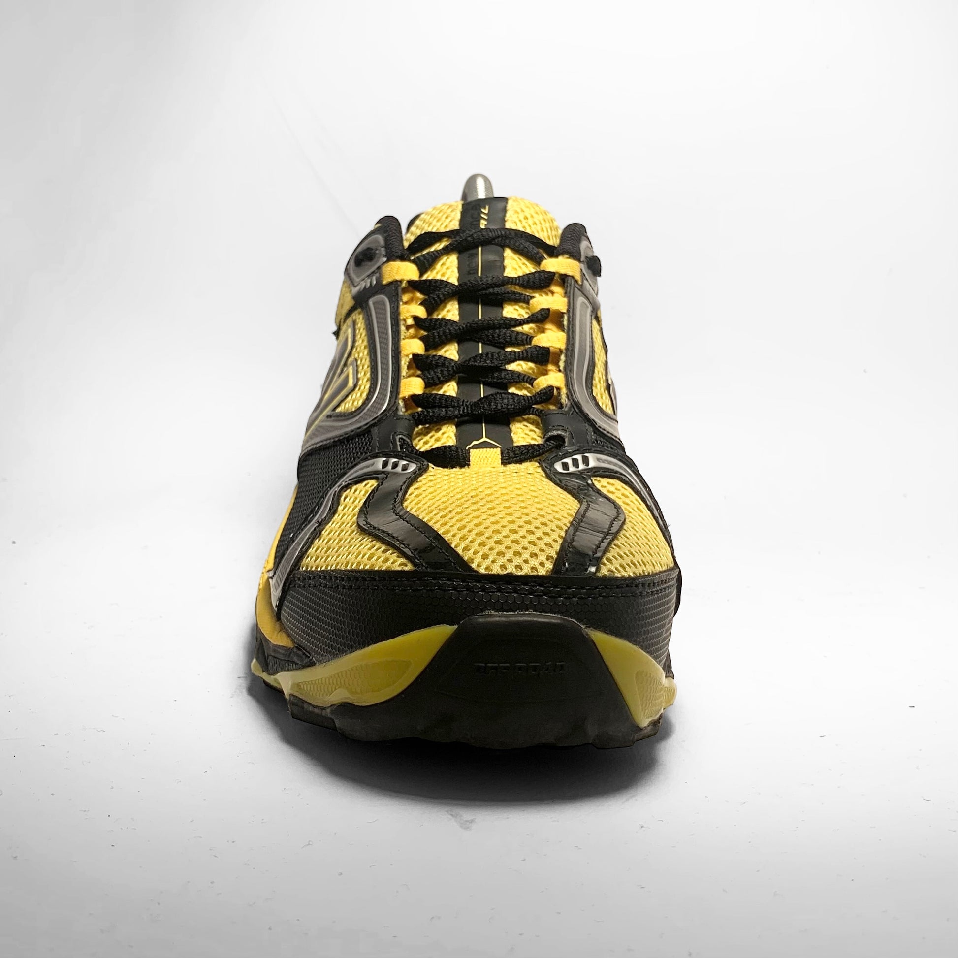 Double layered mesh base, overlayed with partly black mesh, patent leather panels and embossed detailed silver panels, yellow strap along the sides to keep the foot firm and All-Terrain outsole.