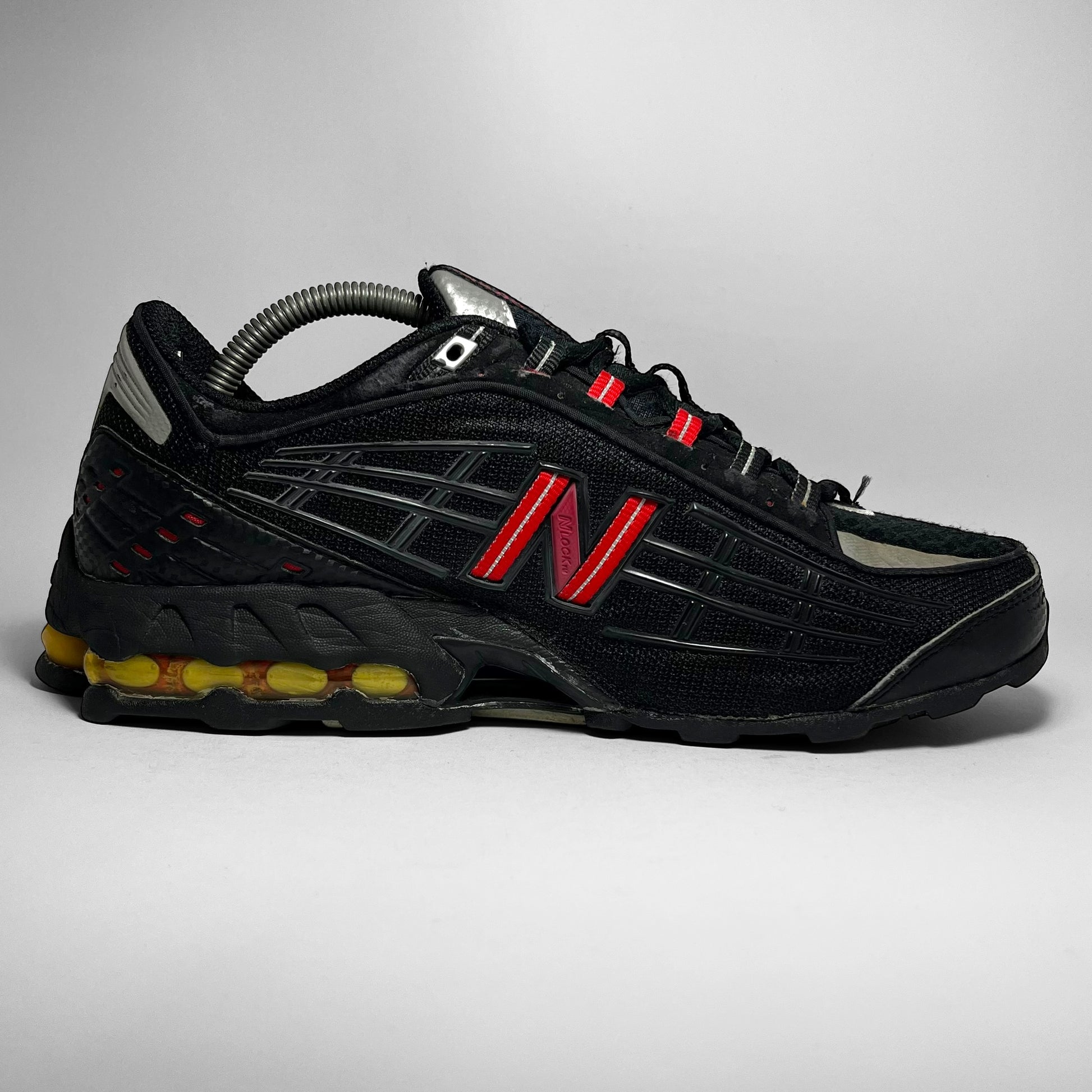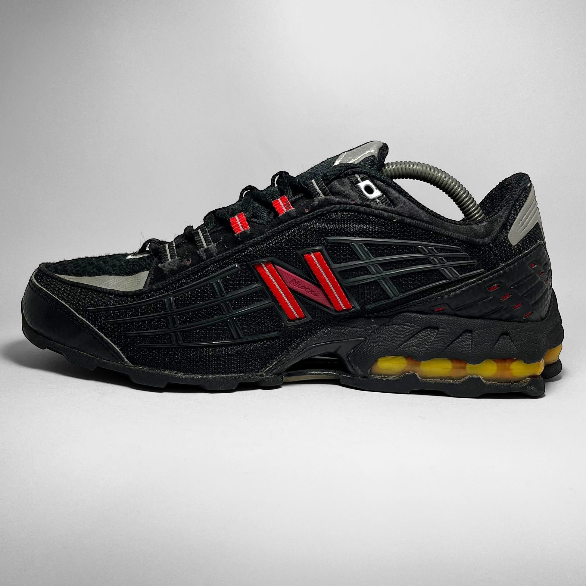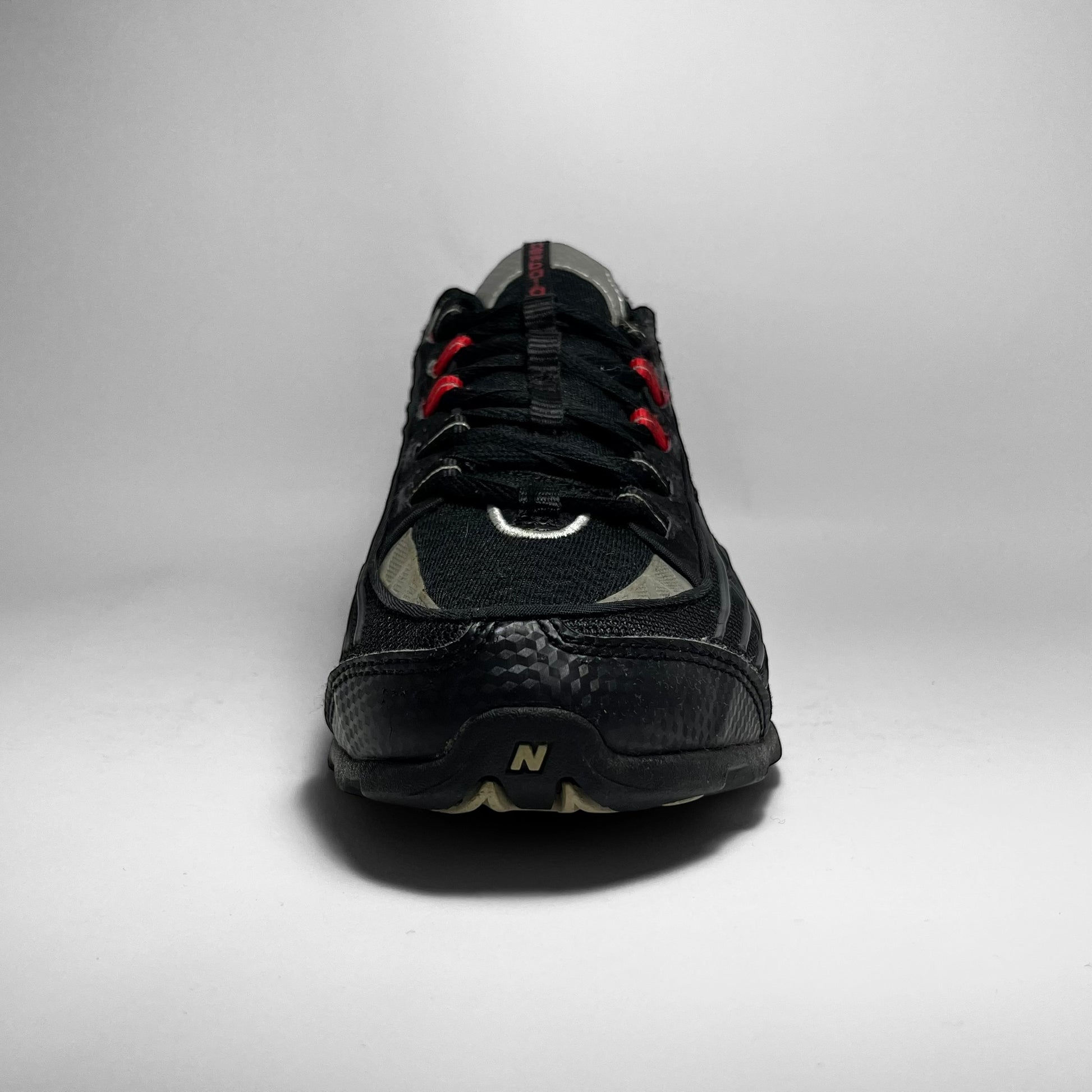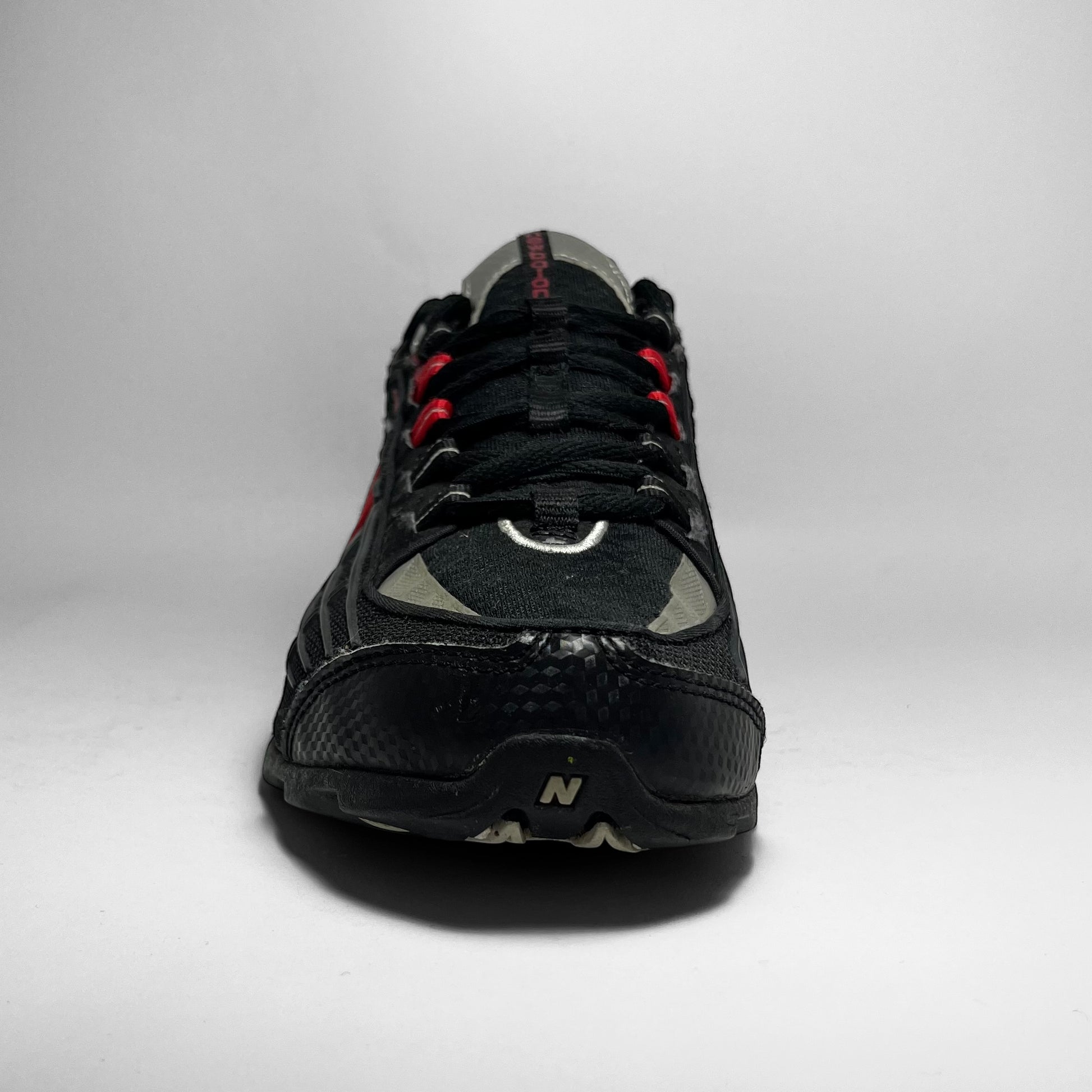 It’s like looking at a motor/dirtbike. Mesh underlay in several forms stacked with rubber striking parts, leather panels with carbon prints in silver and black throughout, nubuck collar, hints of 3M and tones of red like eyelets, woven cotton NB logo and perforations at heel, unique ‘air-units’ system at rear, which is super rare for NBs in general.