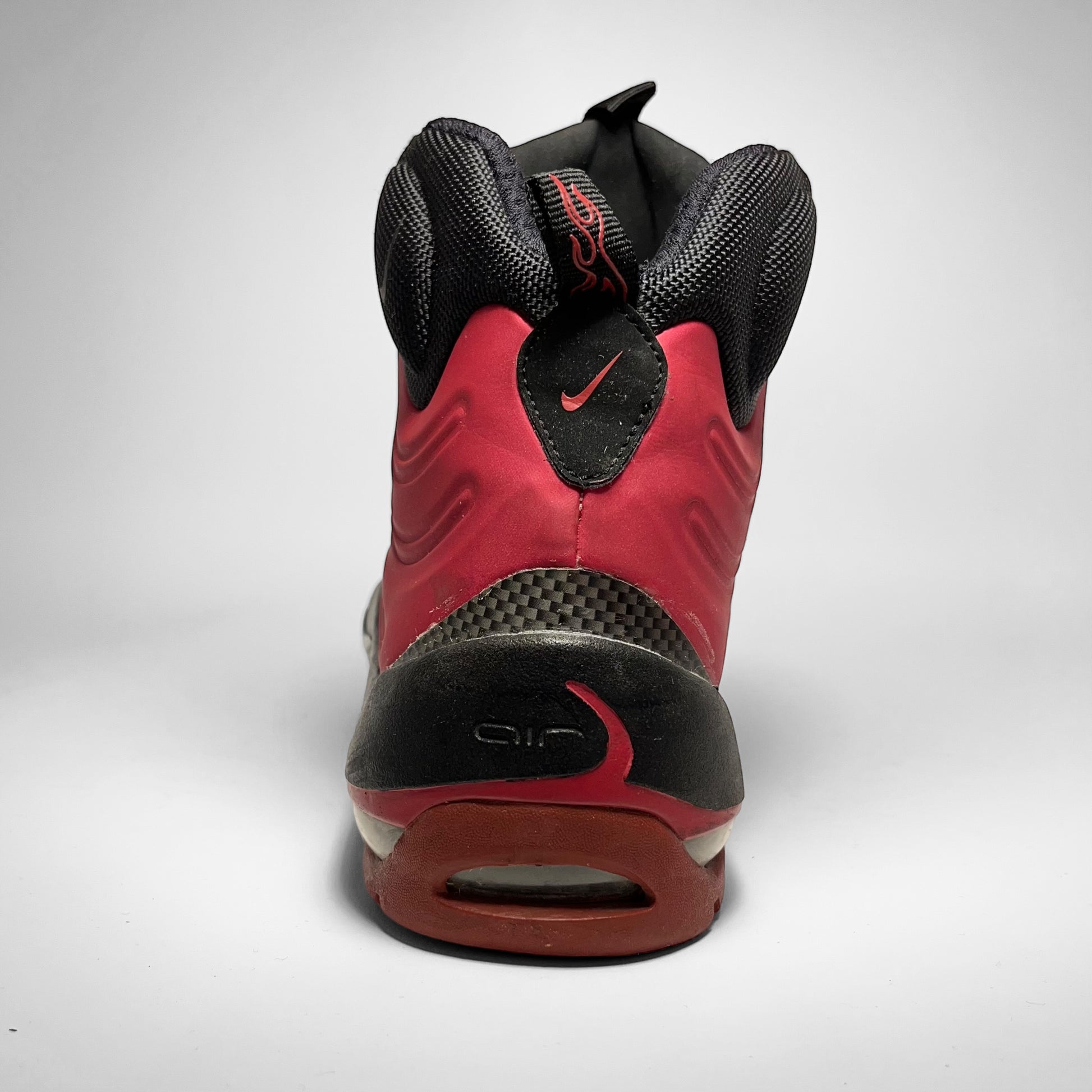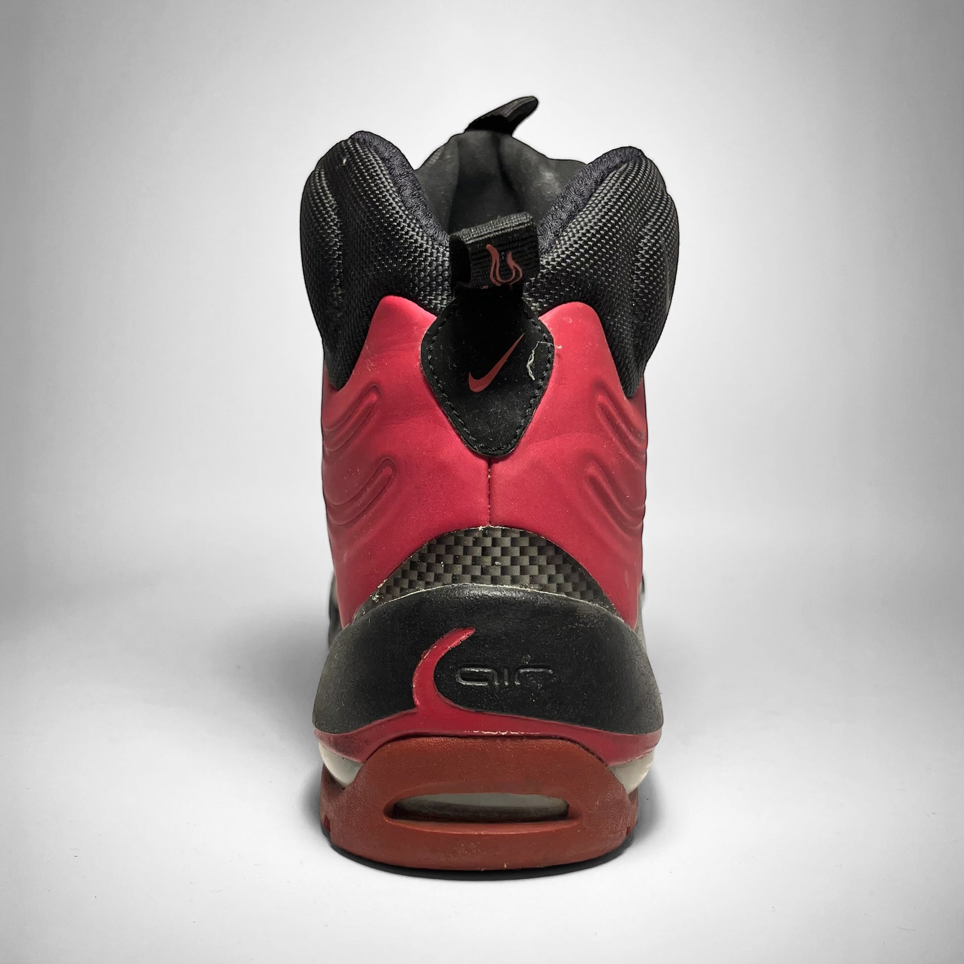 Red Foamposite upper with embossed detailing, Bakin’ mid- and outsole together with branding on heel- and tongue pull-tab, swoosh embossed placement on sides, canvas collar and tongue and Air Max units.