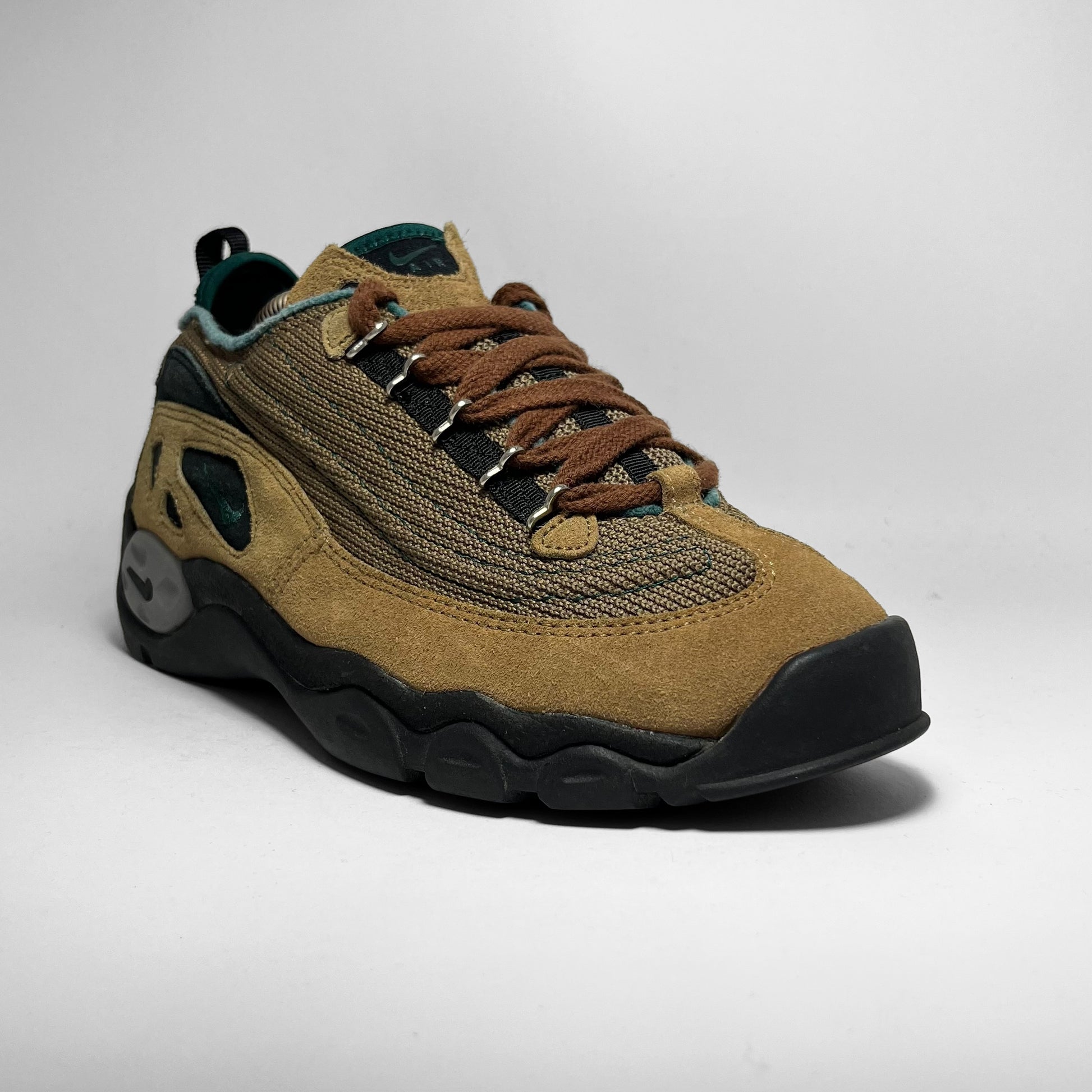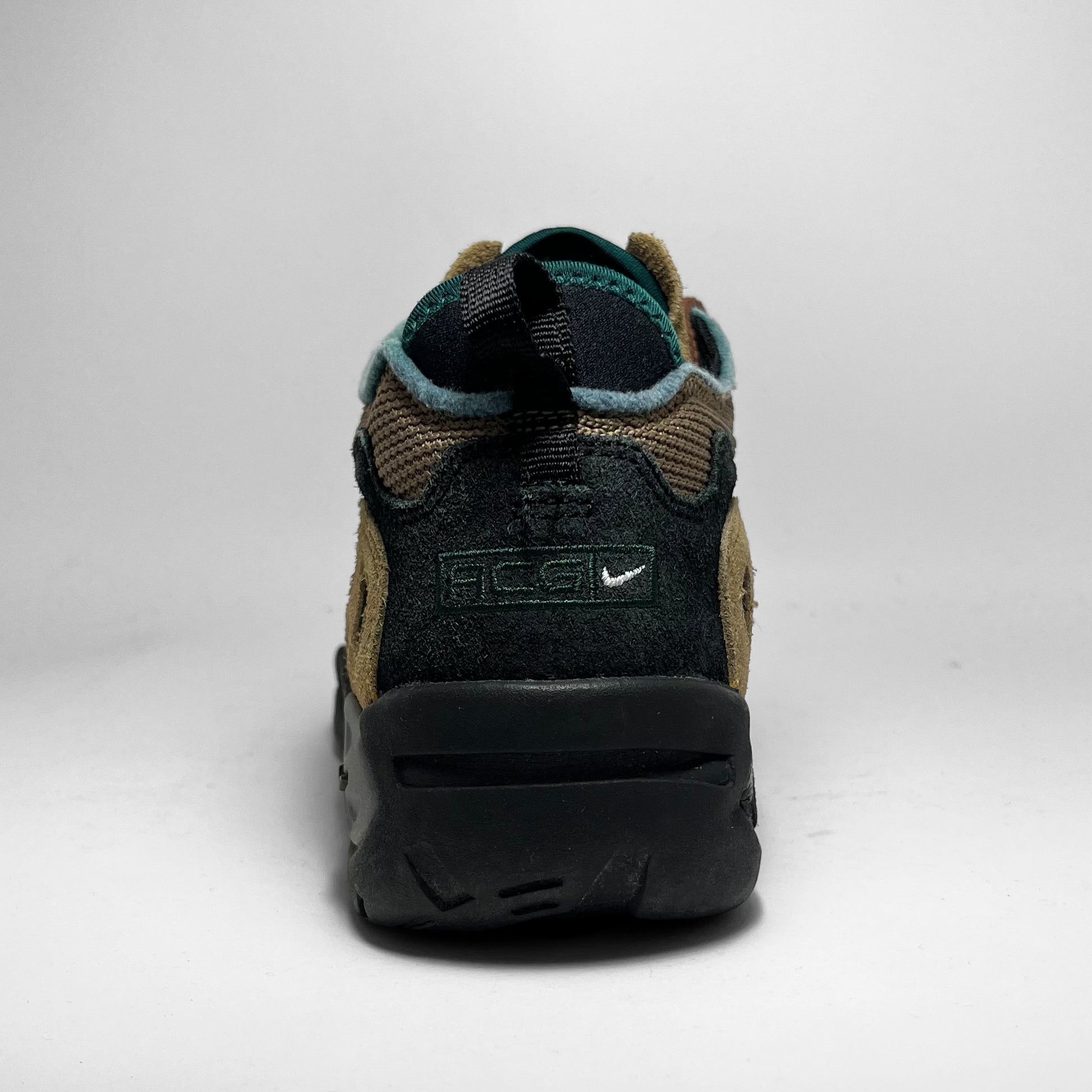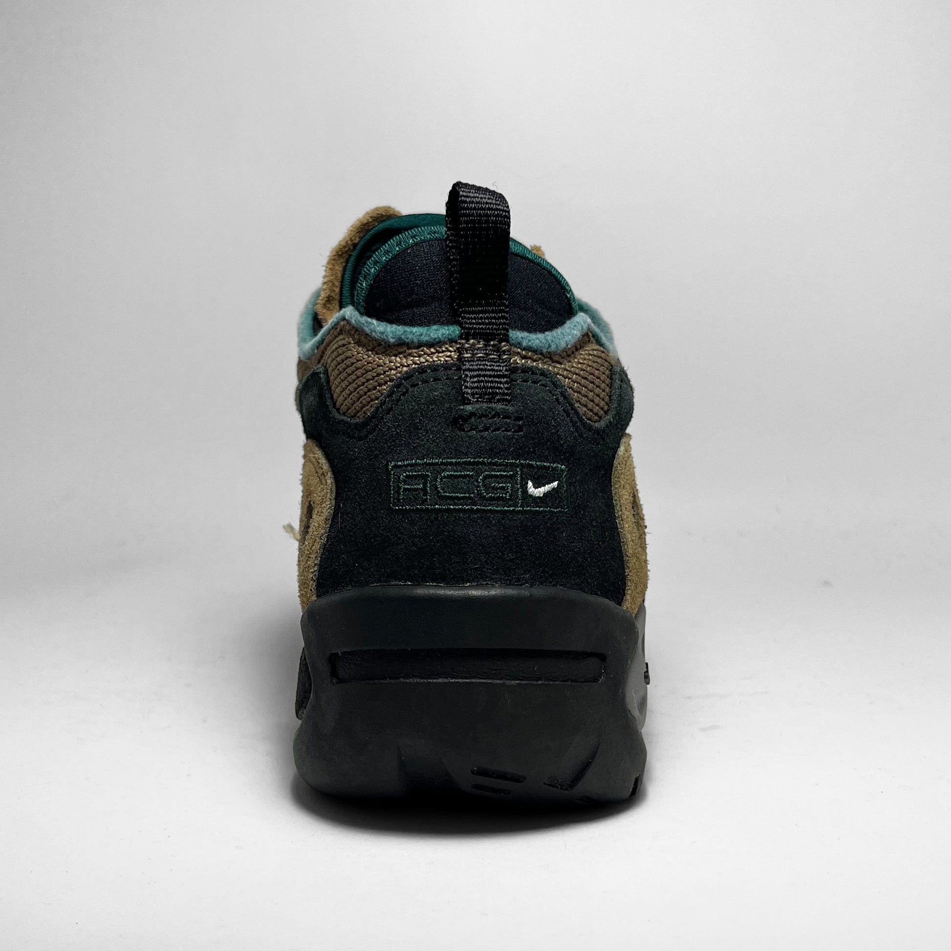 Mixture of canvas and suede upper panels, metal eyelets, green embroidered branding, footbed and trail outsole.