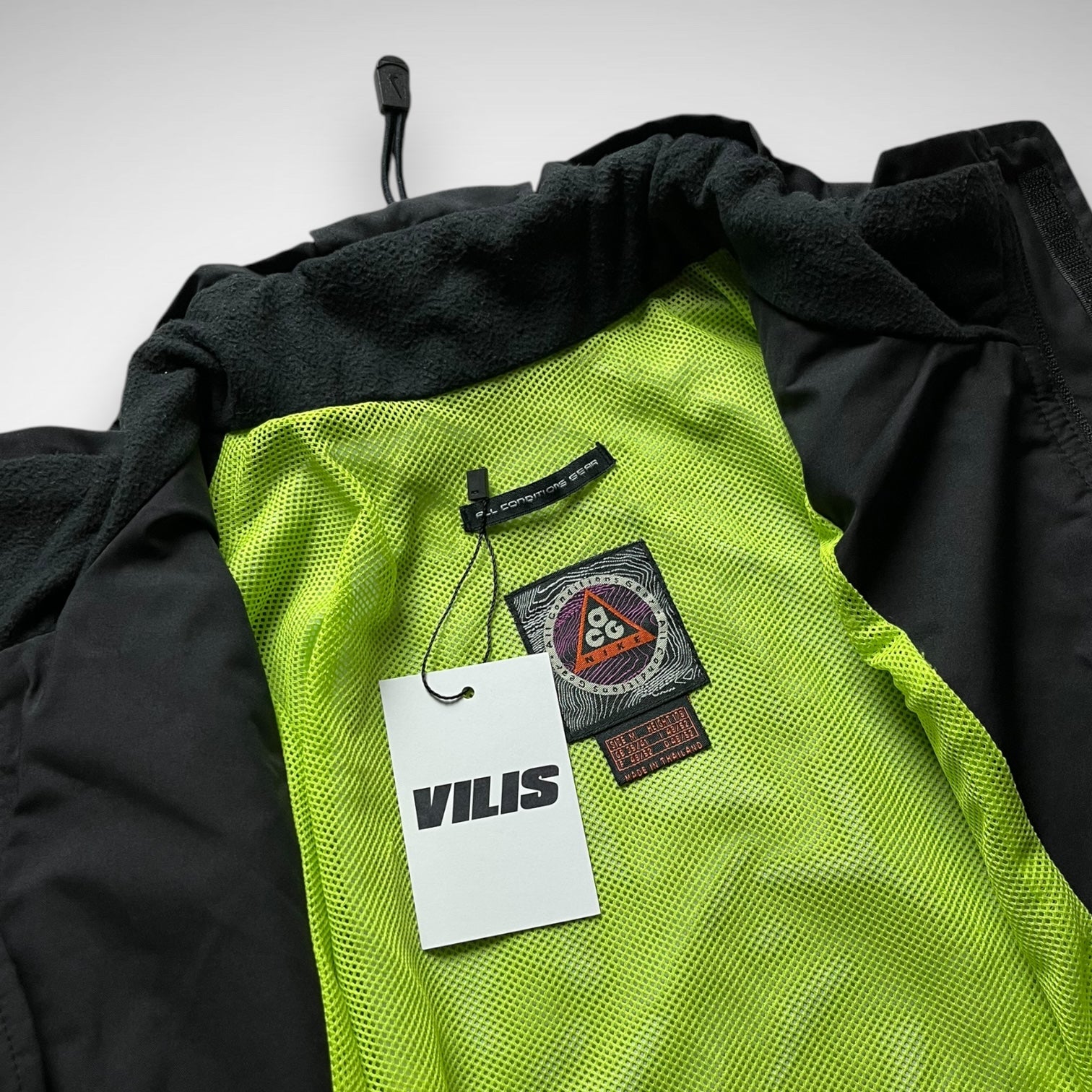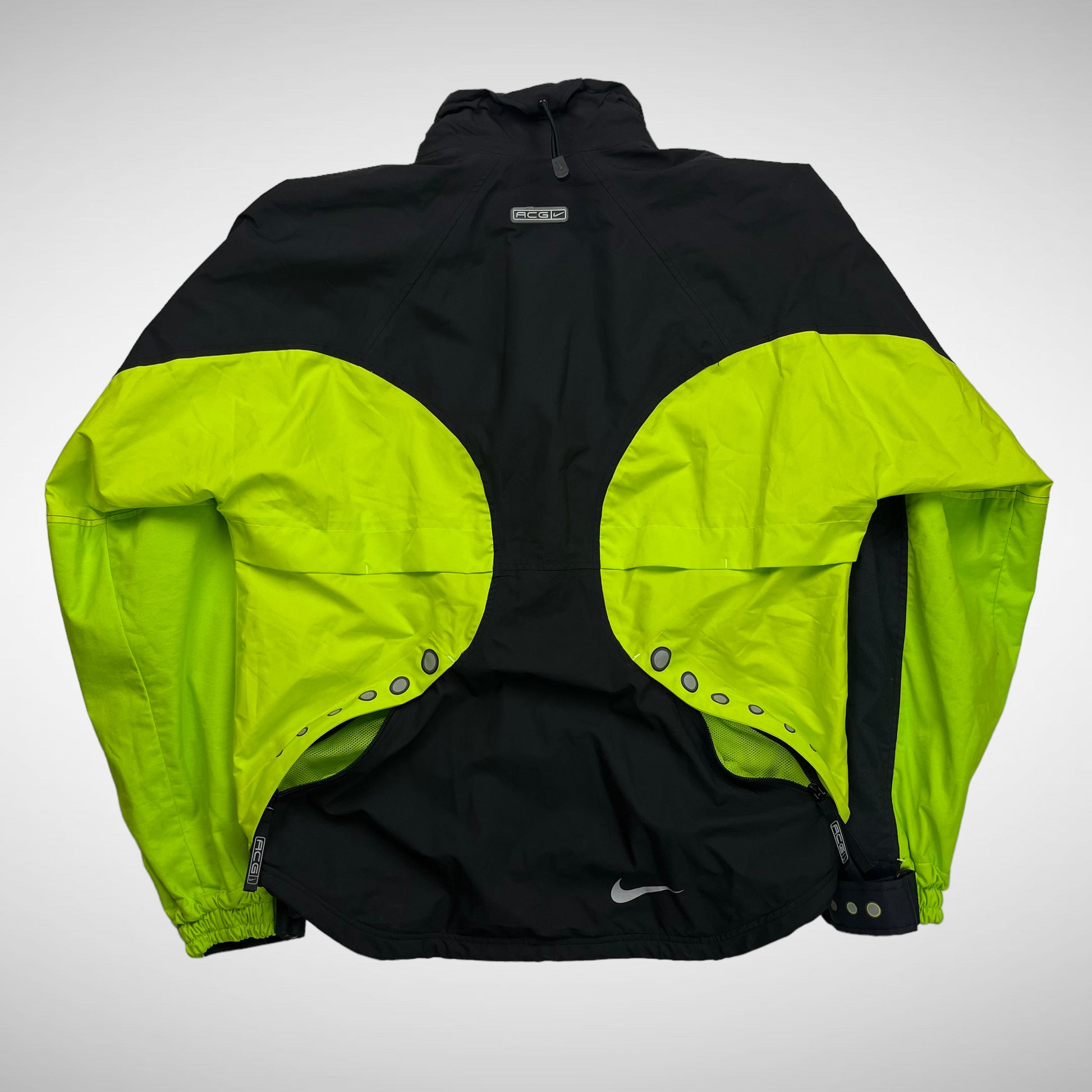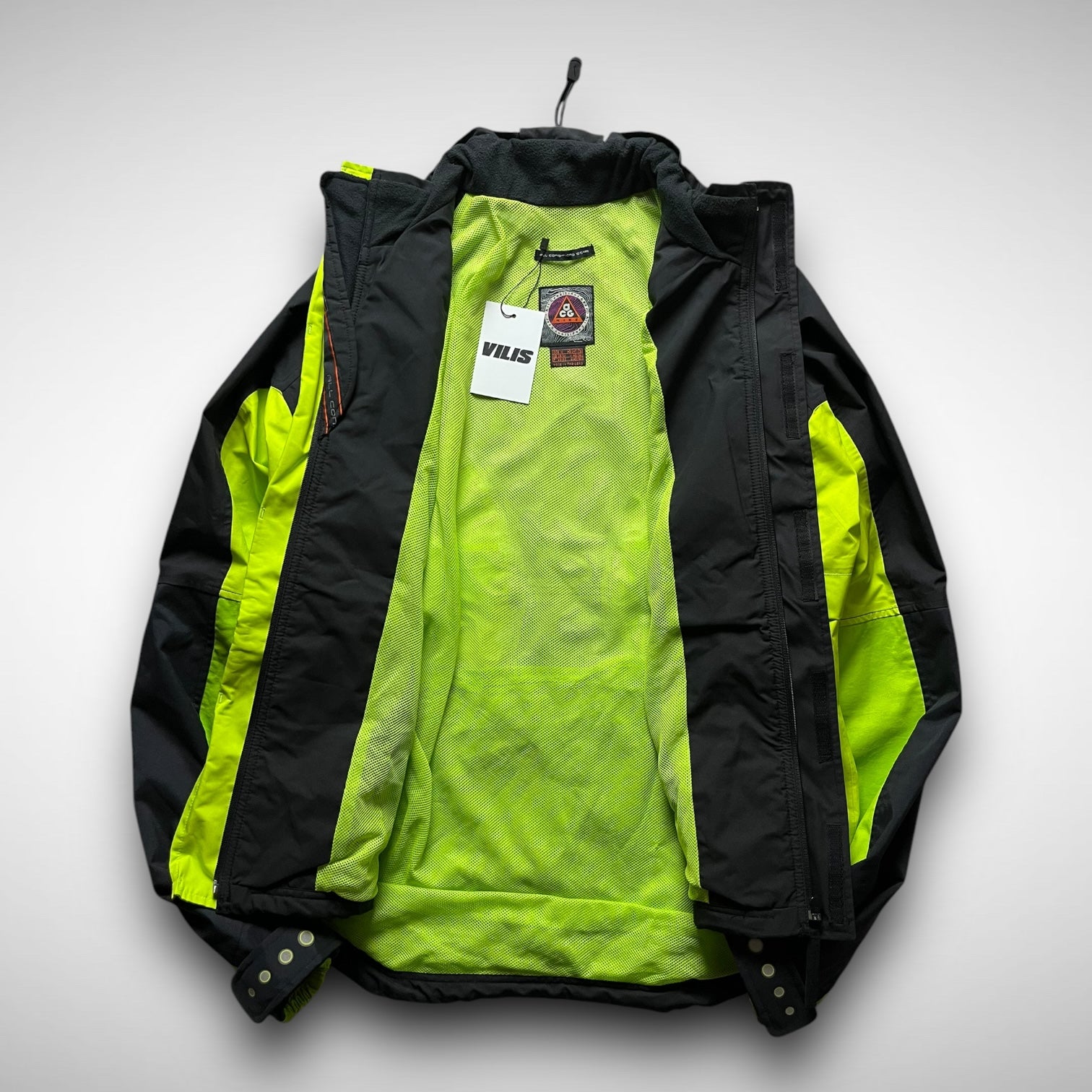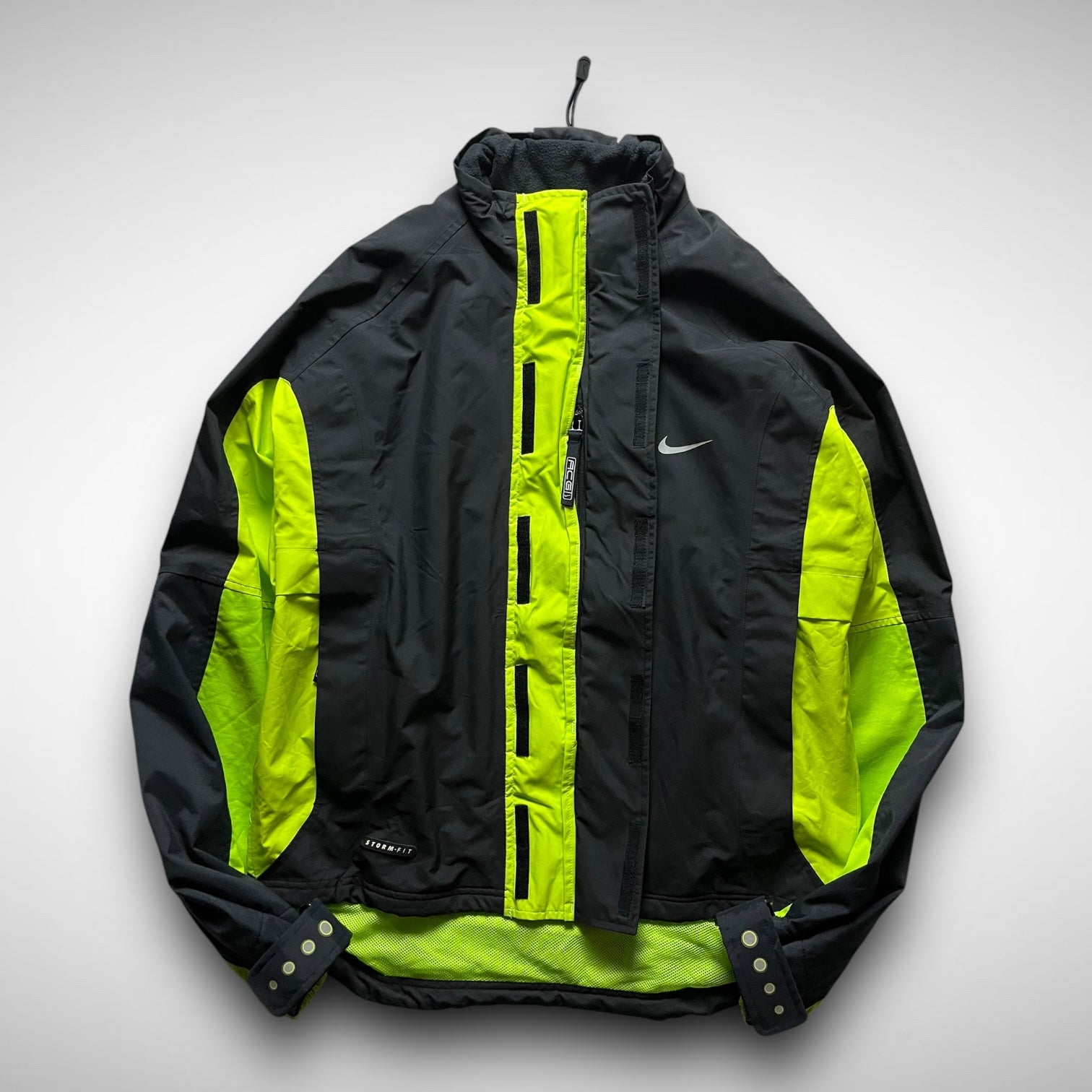 Storm-fit jacket in black & contrast neon, double velcro covering zip closure including branded stash pocket, double front zip pockets, elastic velcro adjustable cuffs and 3M circled contrast details, same on the back side, covering the zip mesh ventilations, rubber ACG lungs logo on upper arm and branding below the adjustable toggle at rear collar.