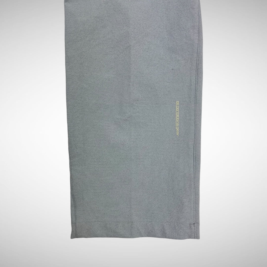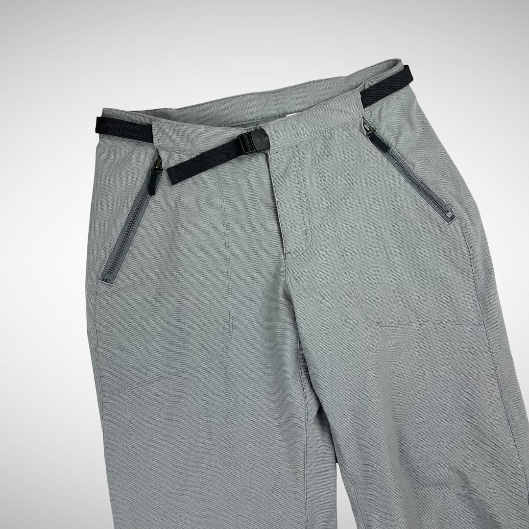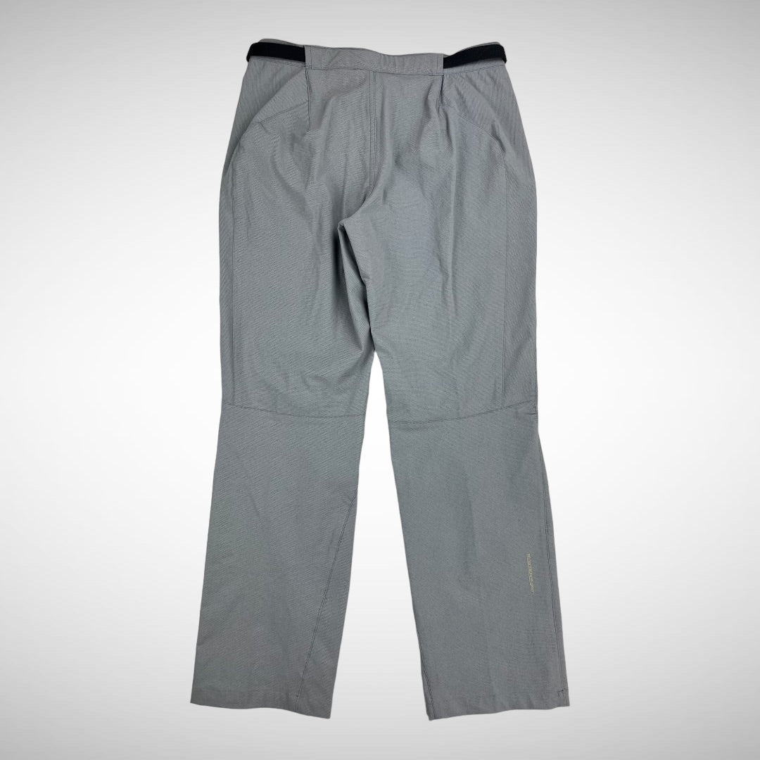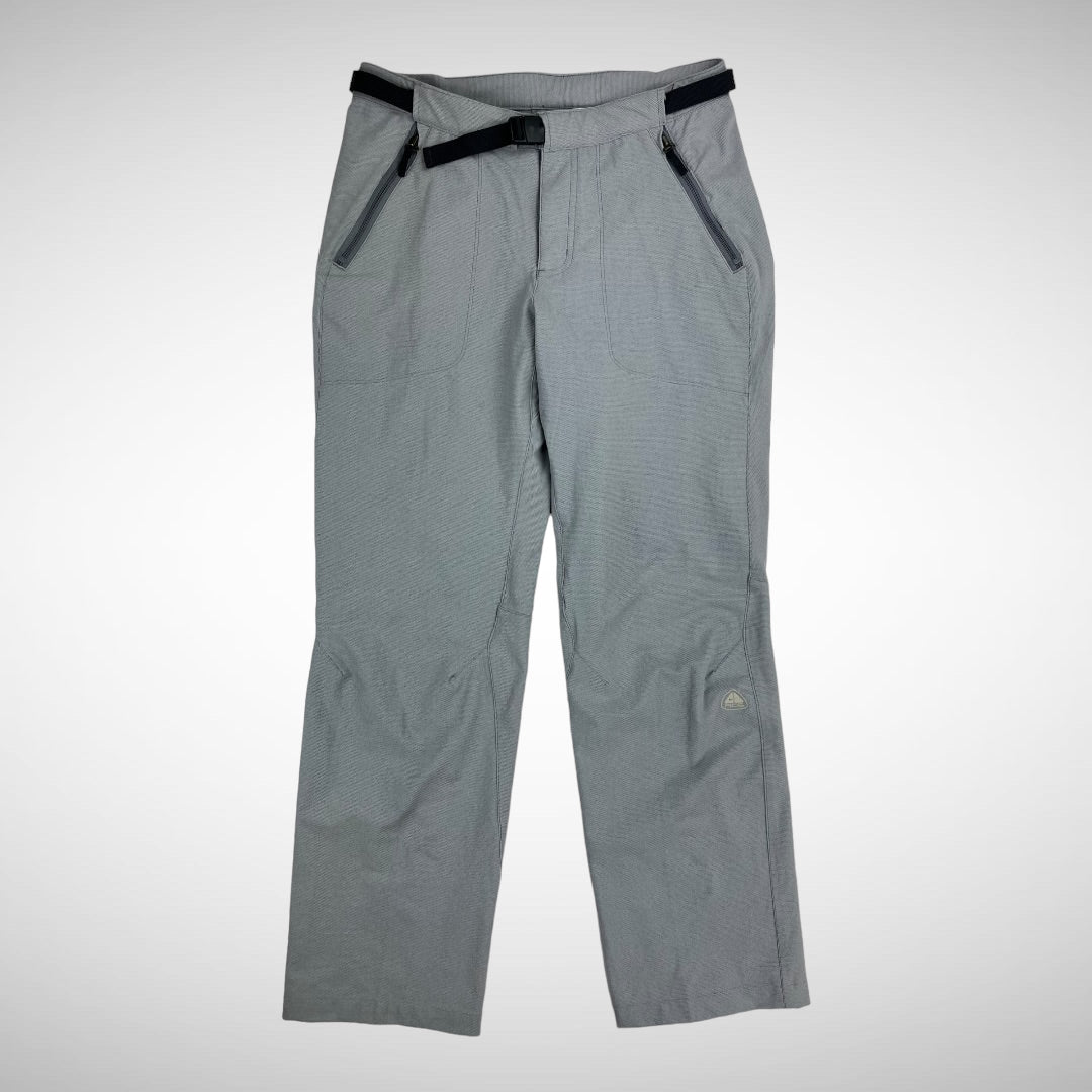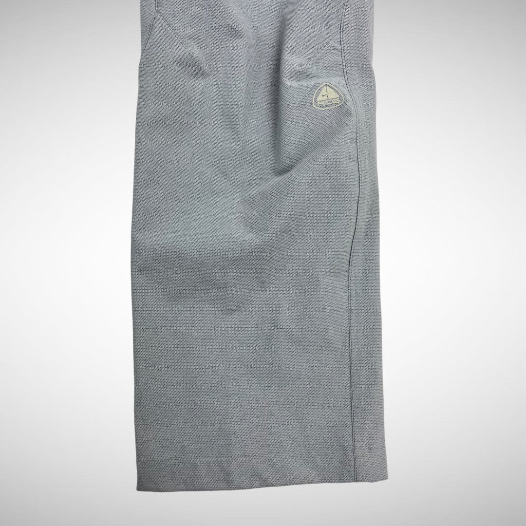 Hiking pants made from a grey cotton woven material with structured knees, integrated belt, zip-pockets and ACG branding on lower knee and spell-out on back.