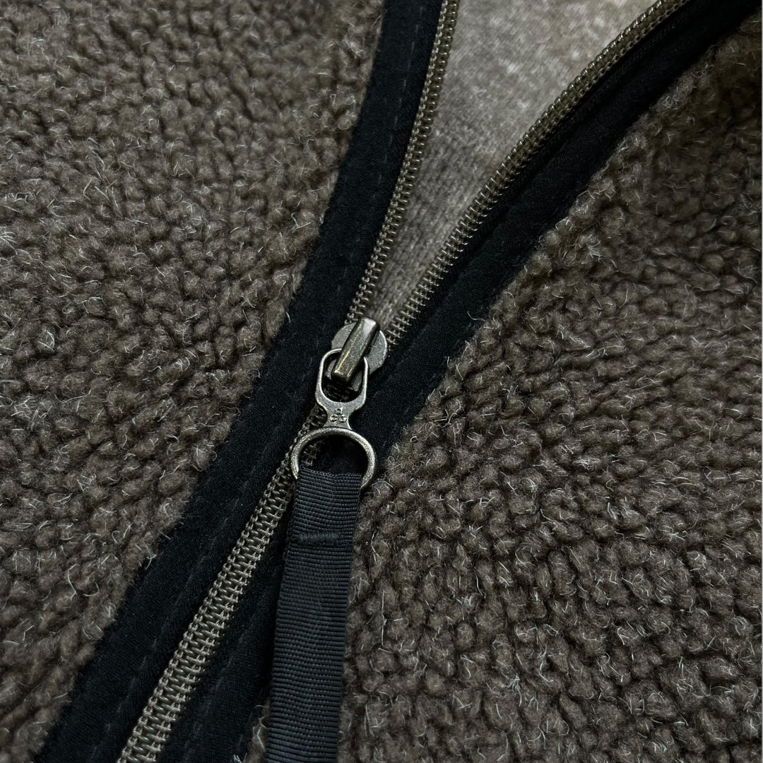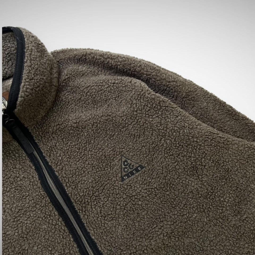 Brown deep-pile fleece with embroidered ACG branding on chest, branded 1/4 zip closure, elastic piping along neck, collar and hem, and ‘Dog’-patch on the inside-collar.