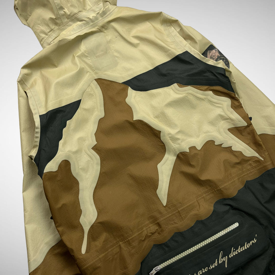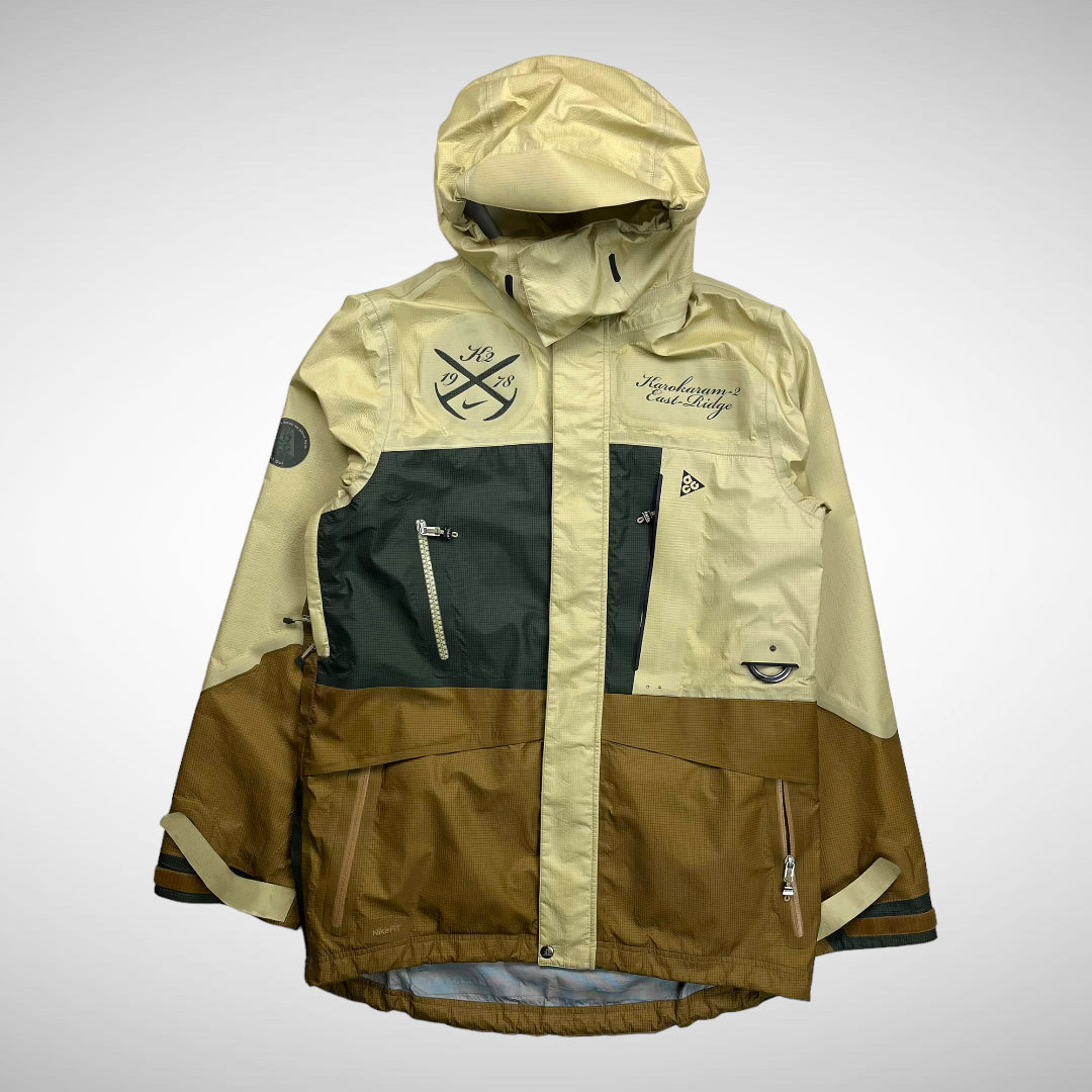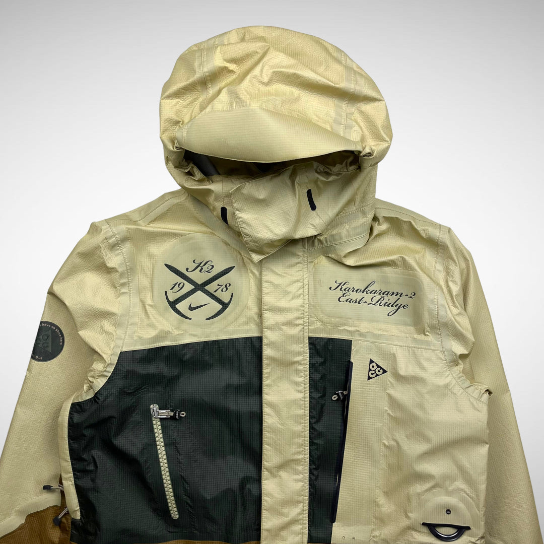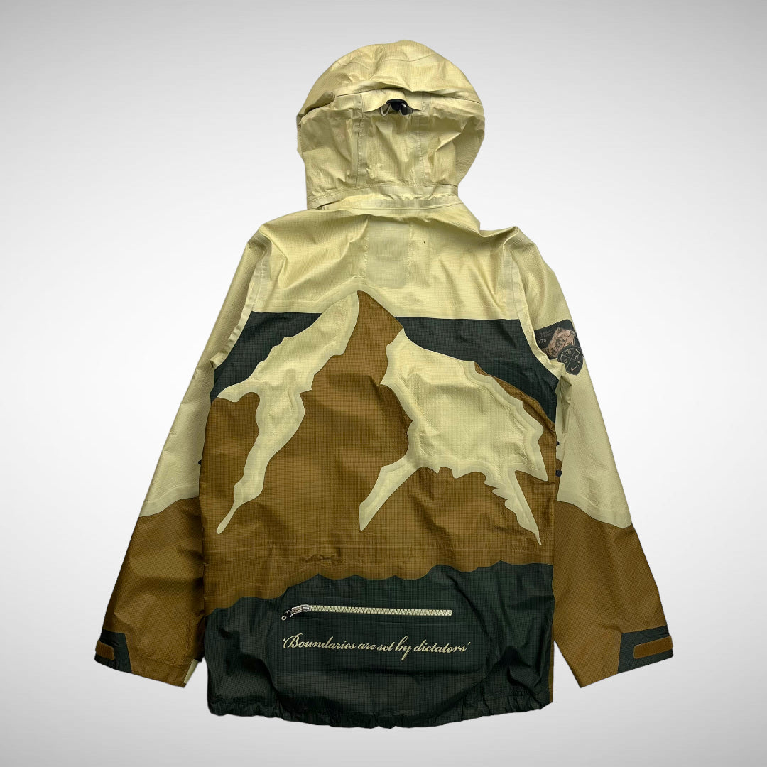 Taking inspiration from the famous K2 trail of mountain Karokaram on the East Ridge featuring 3 layers, fully taped seams, 4 metal-branded waterproof zip-pull pockets, reference print-branding on chest, ACG print on upper left arm, arm-pit vents, velcro stormflap, and K2-mountain panels in various natural tones on the back with printed quote: ‘Boundaries are set by dictators.’