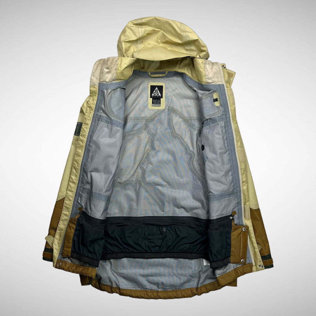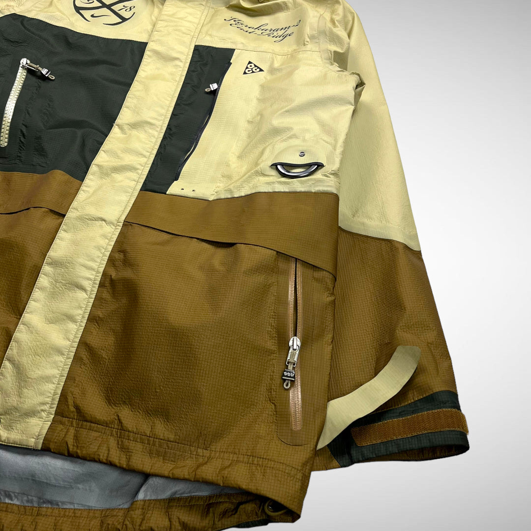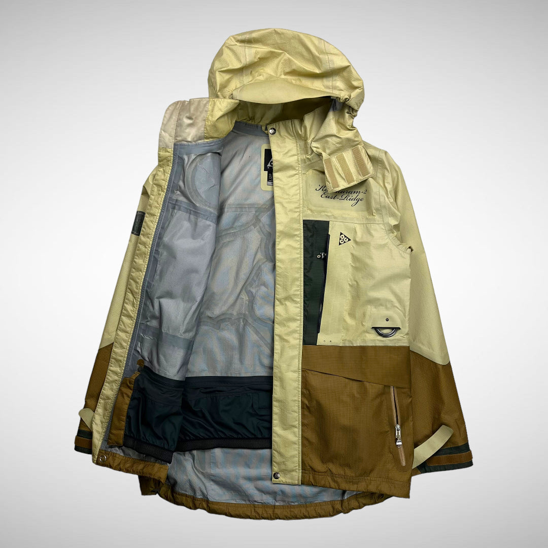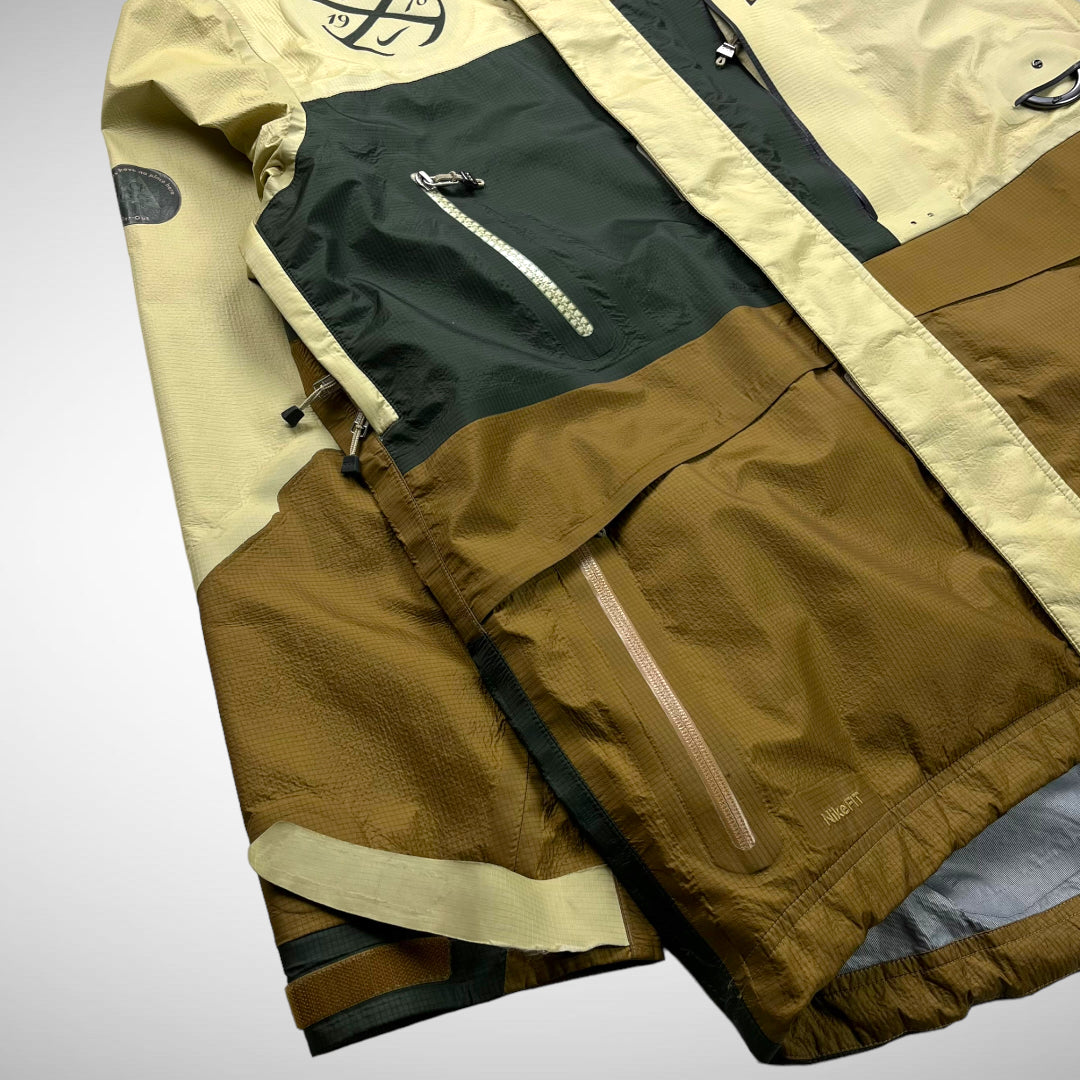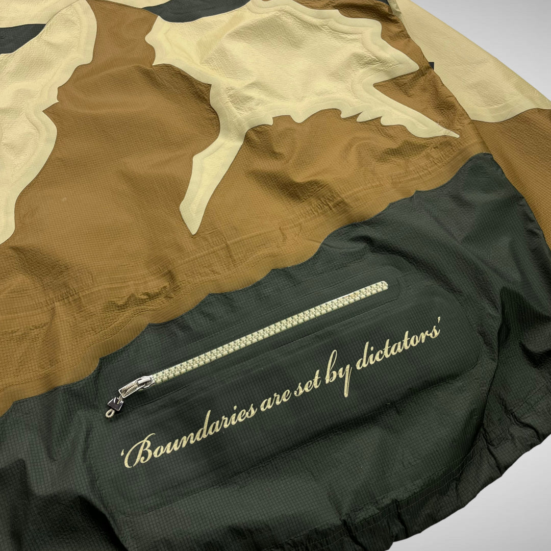 Taking inspiration from the famous K2 trail of mountain Karokaram on the East Ridge featuring 3 layers, fully taped seams, 4 metal-branded waterproof zip-pull pockets, reference print-branding on chest, ACG print on upper left arm, arm-pit vents, velcro stormflap, and K2-mountain panels in various natural tones on the back with printed quote: ‘Boundaries are set by dictators.’