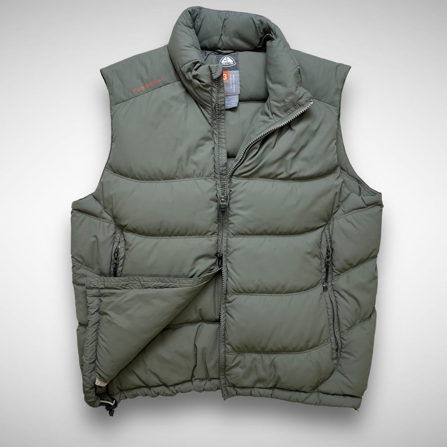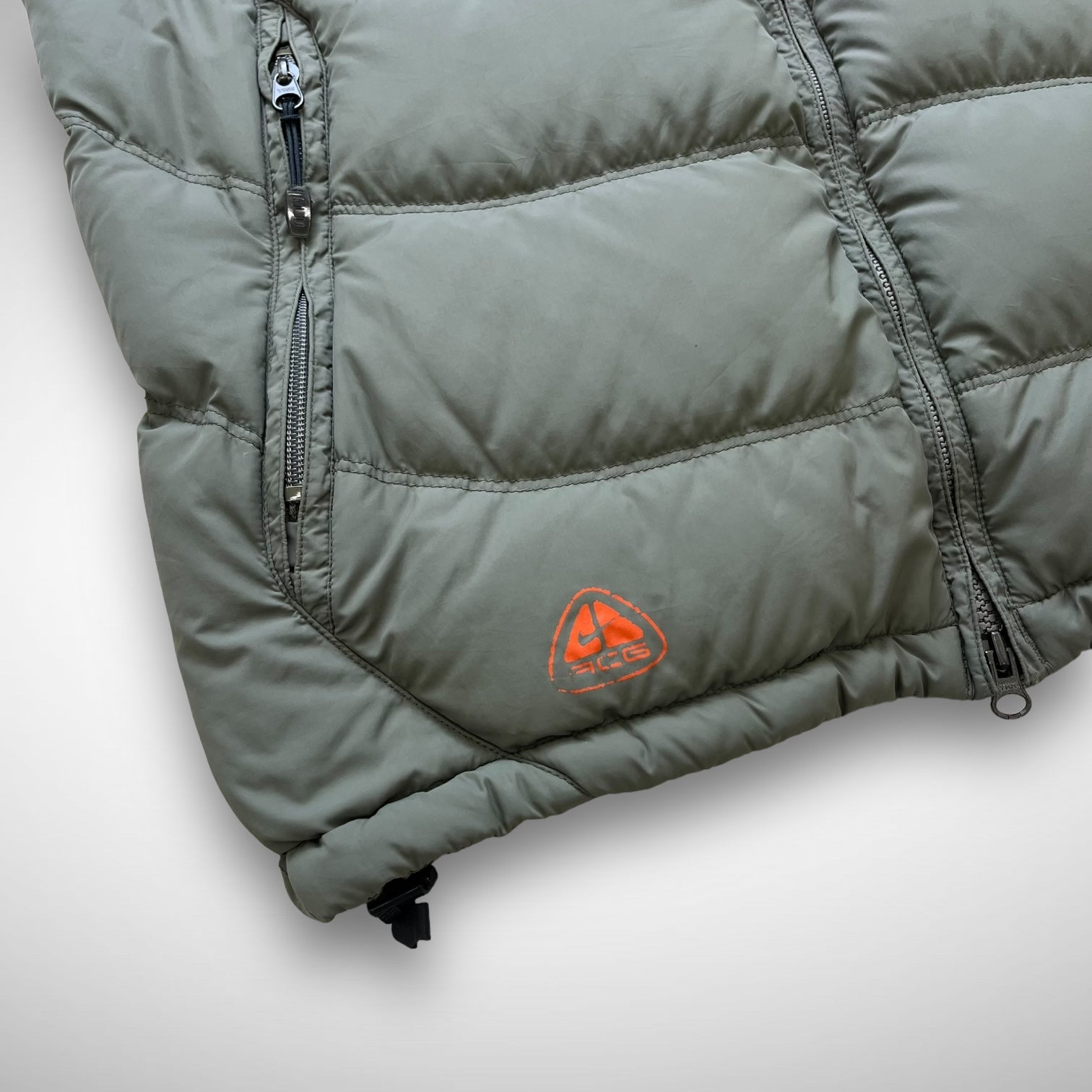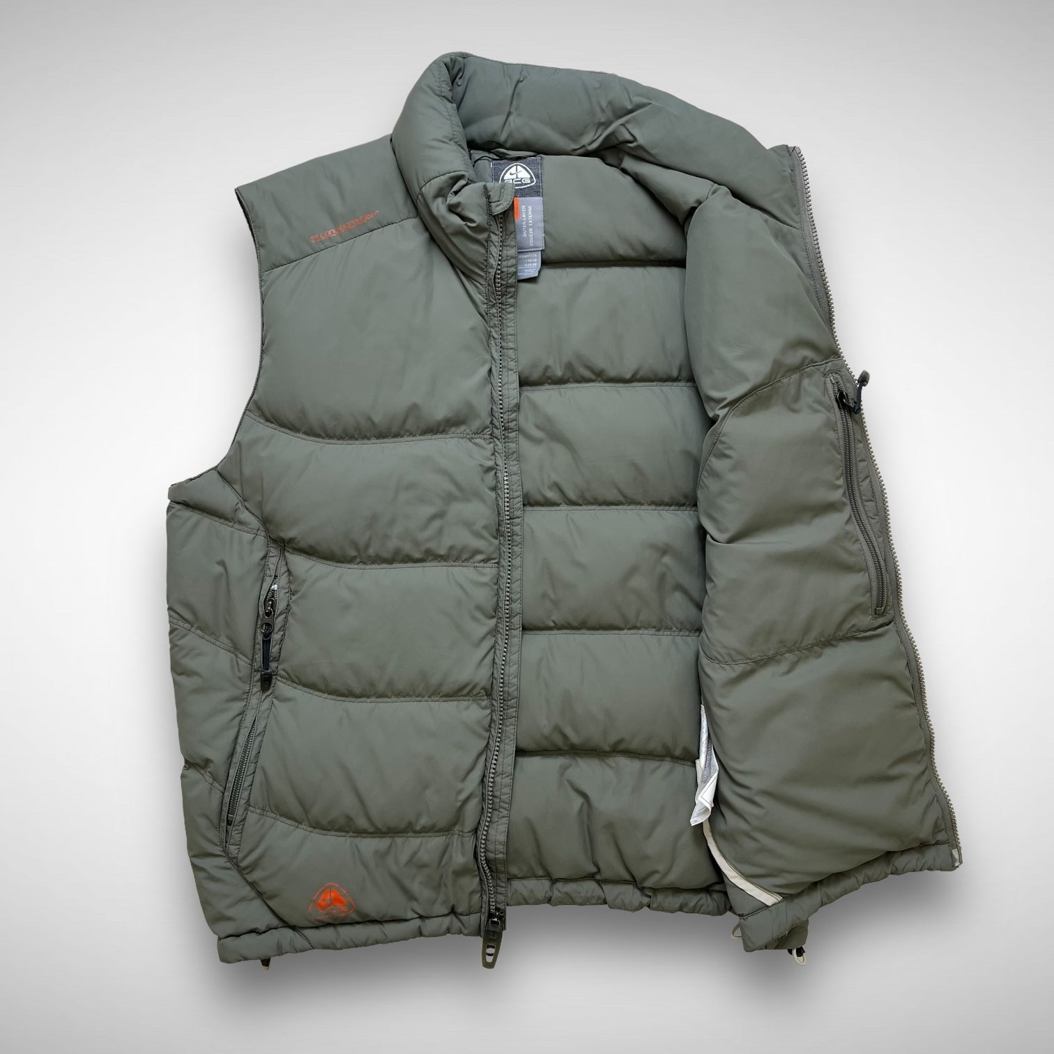 Khaki/grey puffer vest featuring two-way zip, double zip-pockets, zip stash pocket on the inside, lightly faded ACG logo and script branding.