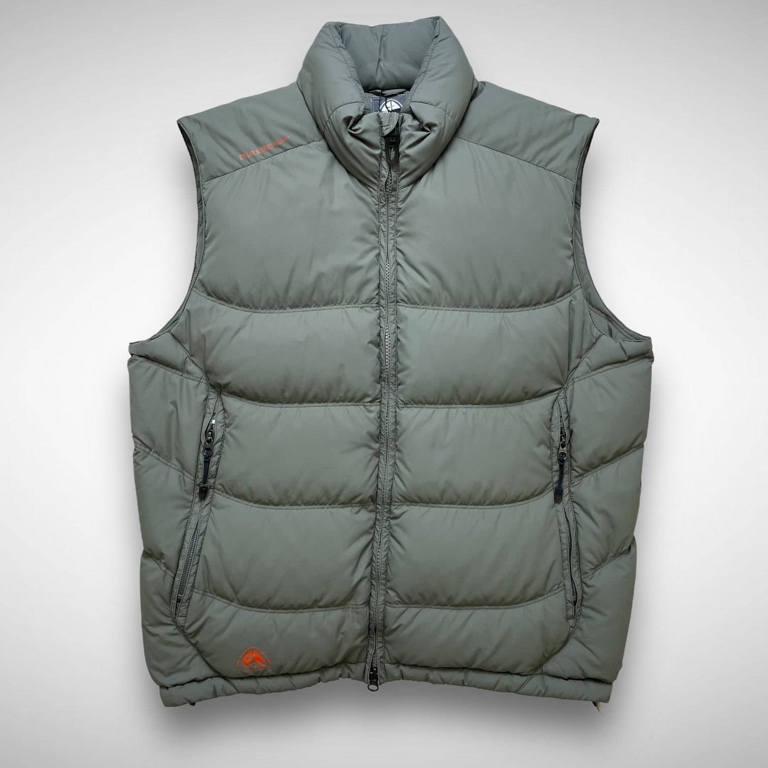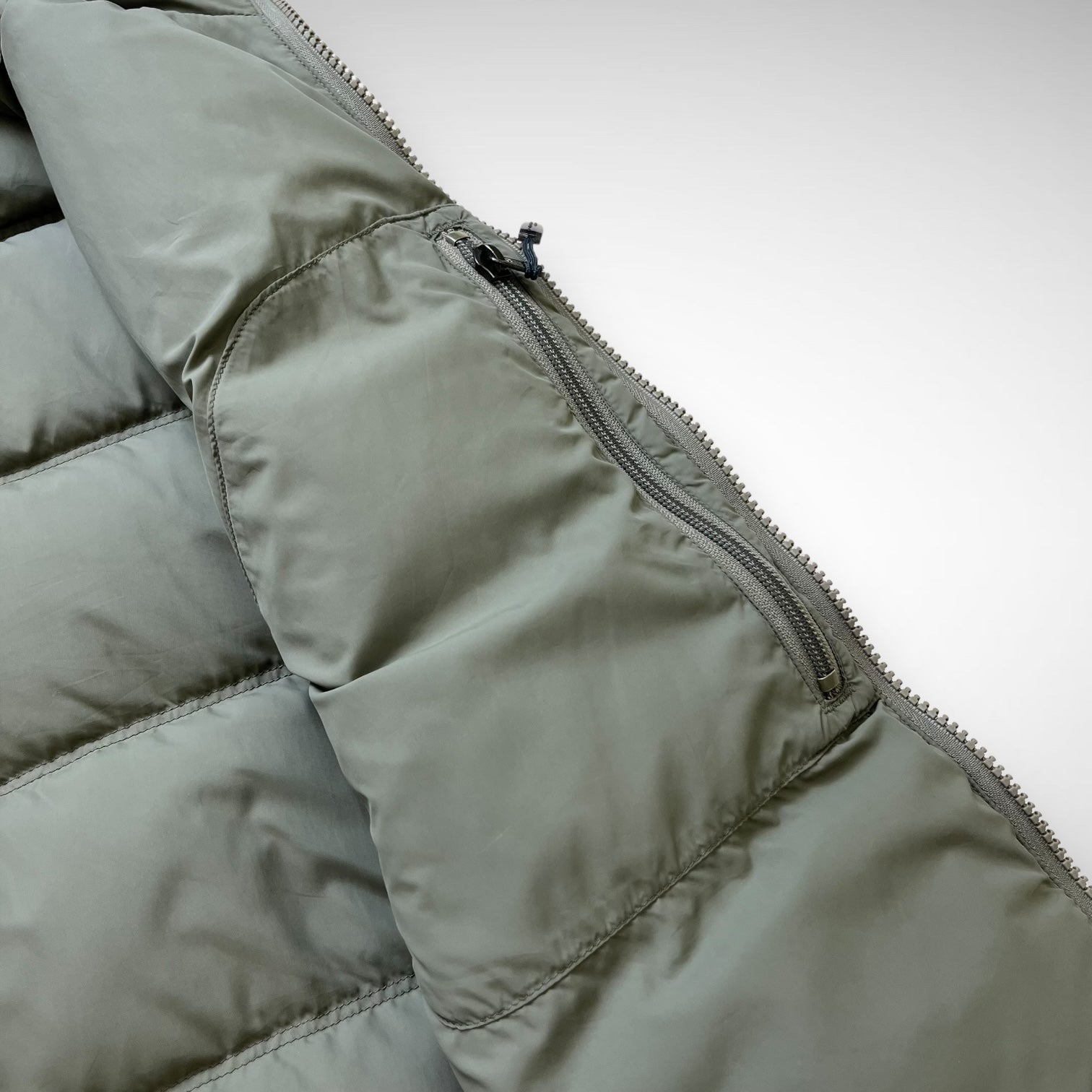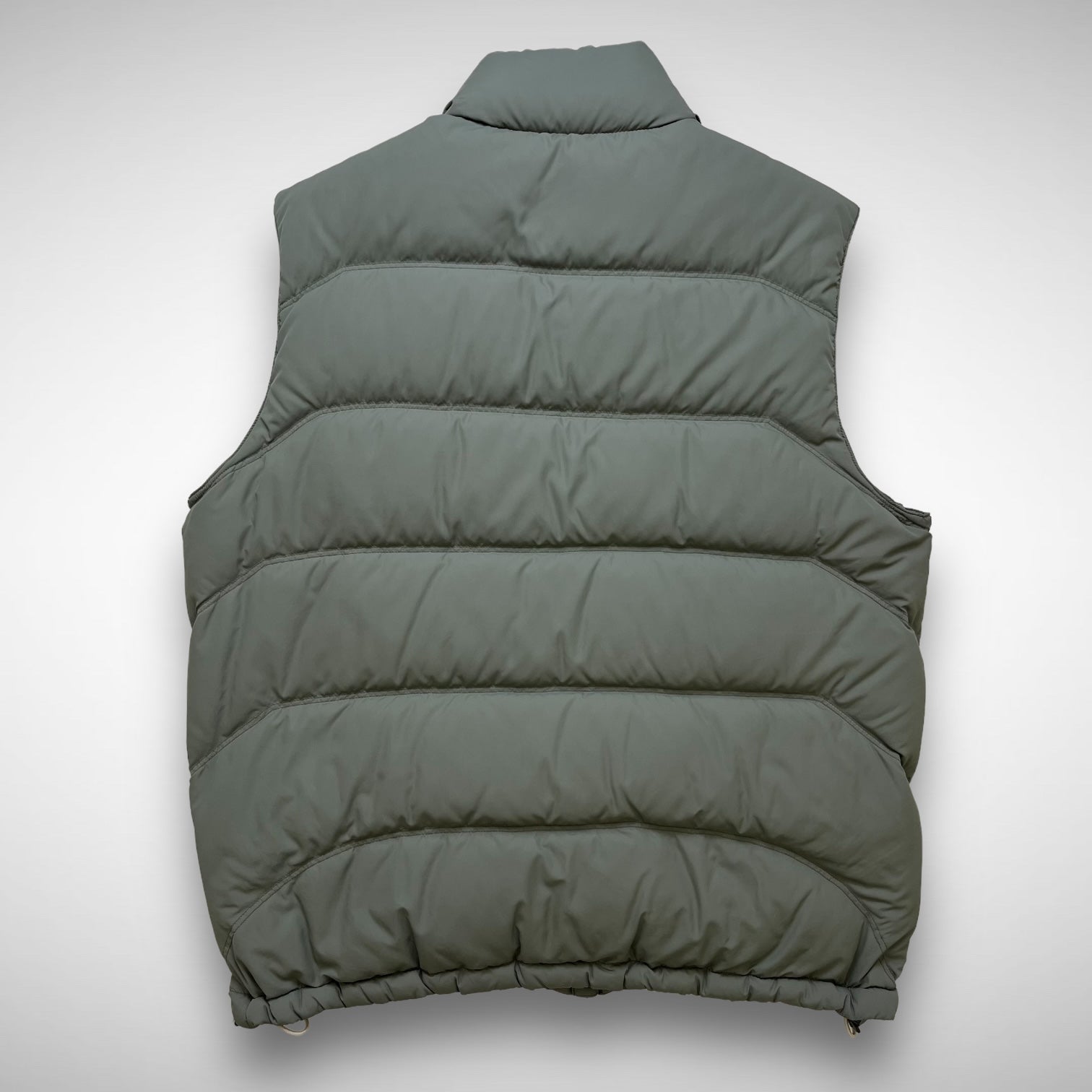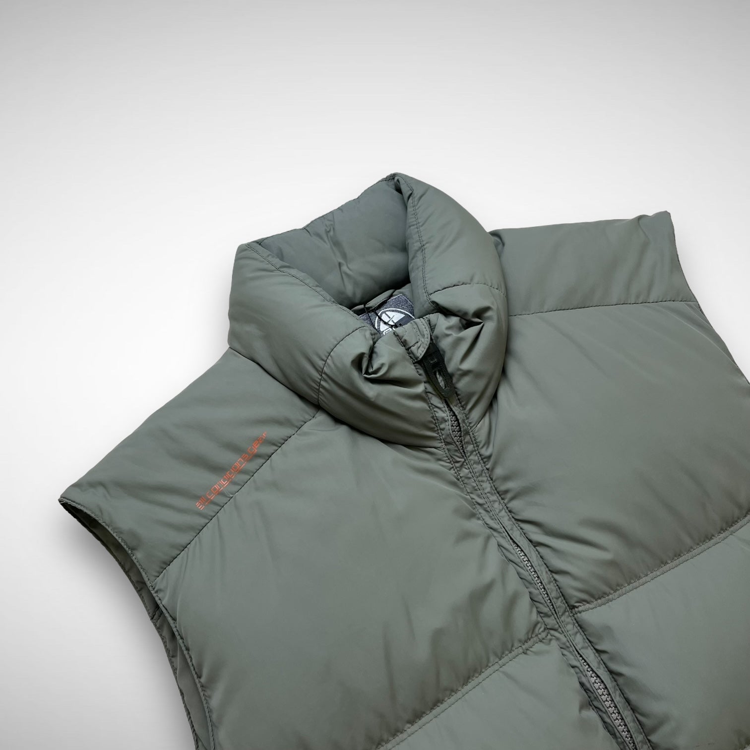 Khaki/grey puffer vest featuring two-way zip, double zip-pockets, zip stash pocket on the inside, lightly faded ACG logo and script branding.