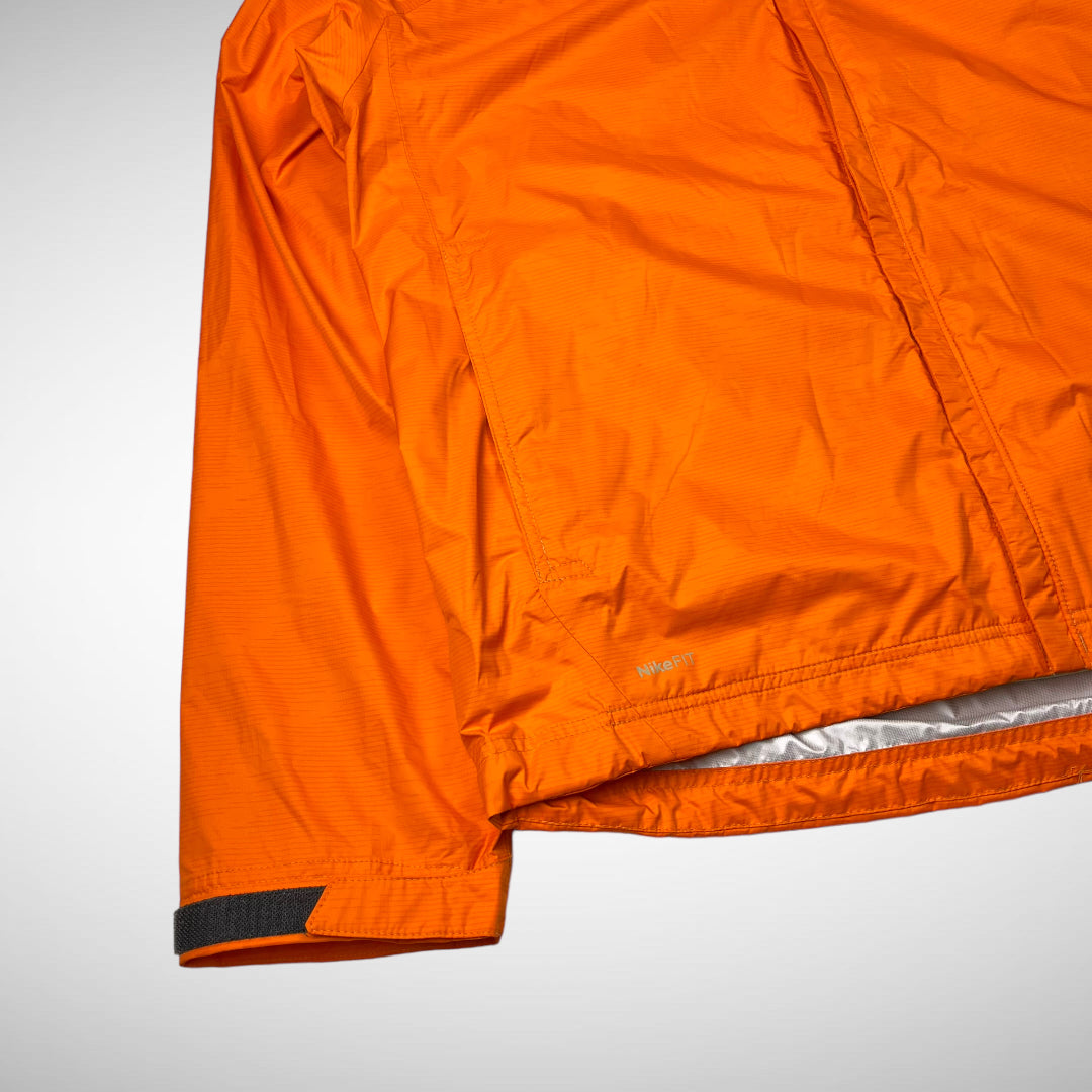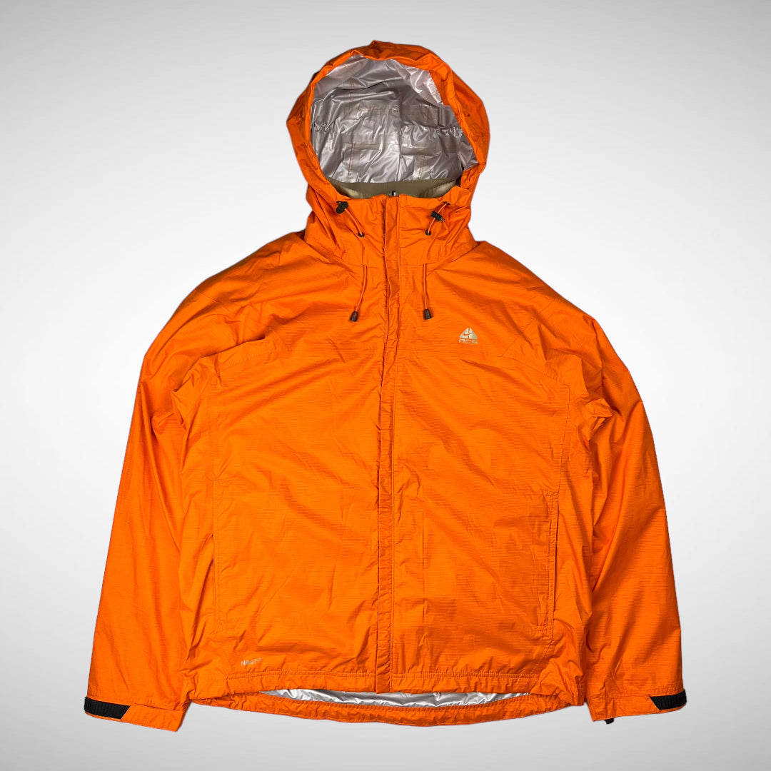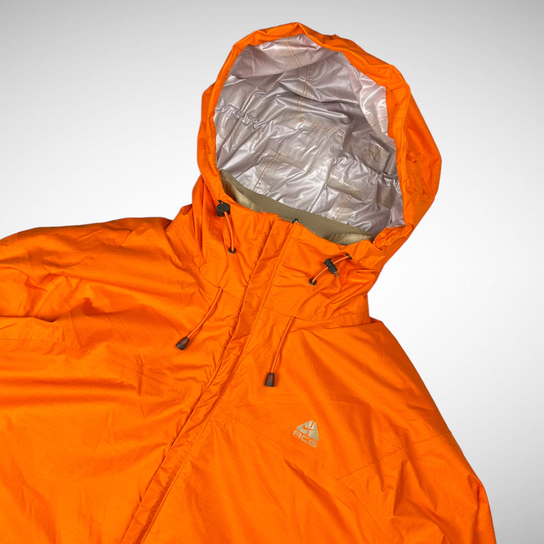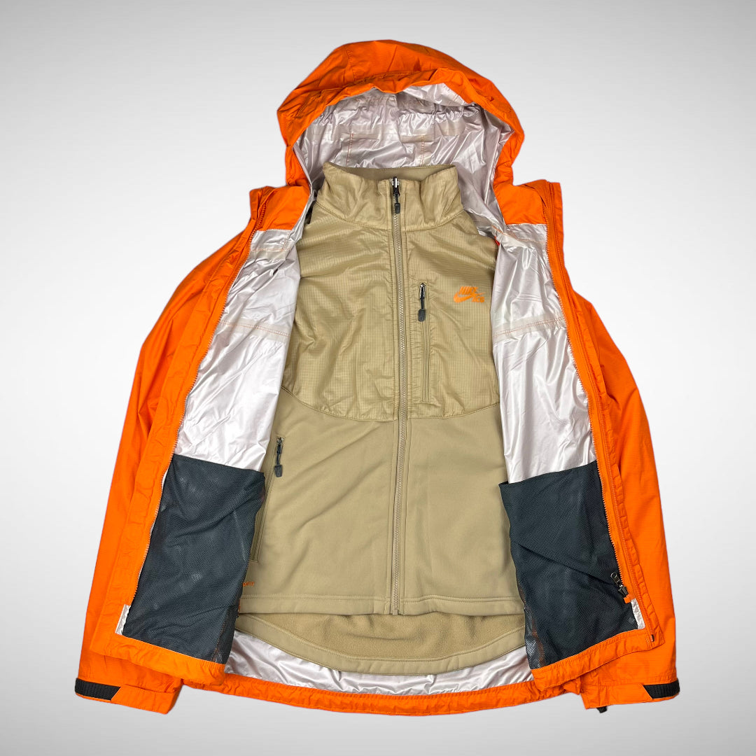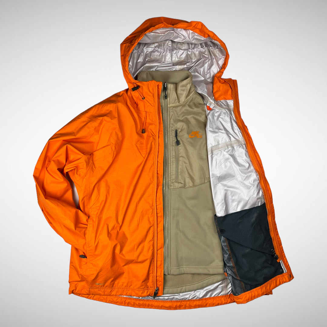 Waterproof ACG jacket in orange with chest lungs-logo, adjustable hood, cuffs and hem, and taped seams with silver lining, including removable and separately wearable tan fleece jacket with orange branding and upper body rip-stop nylon.