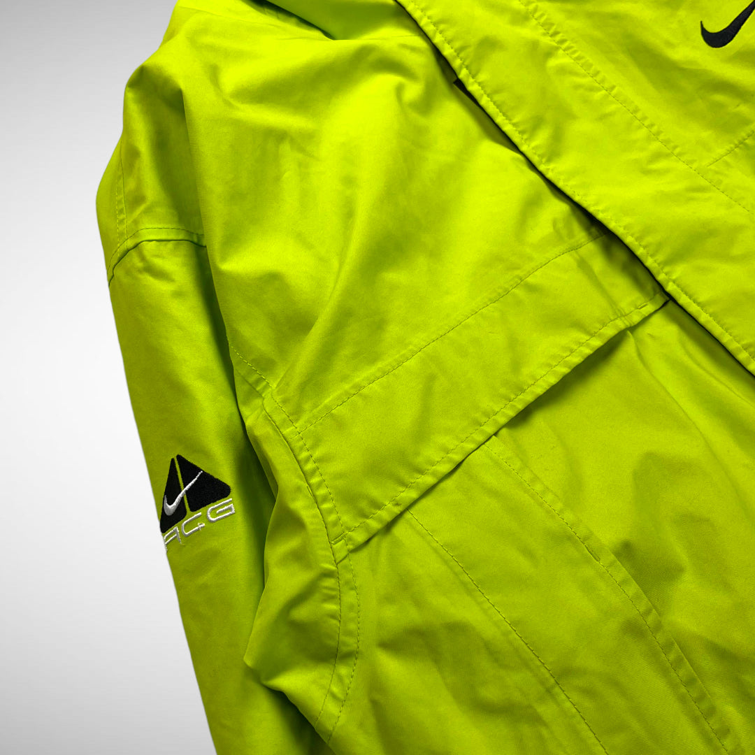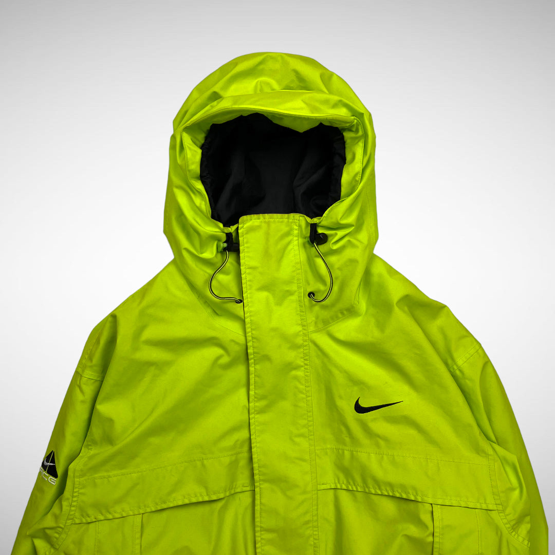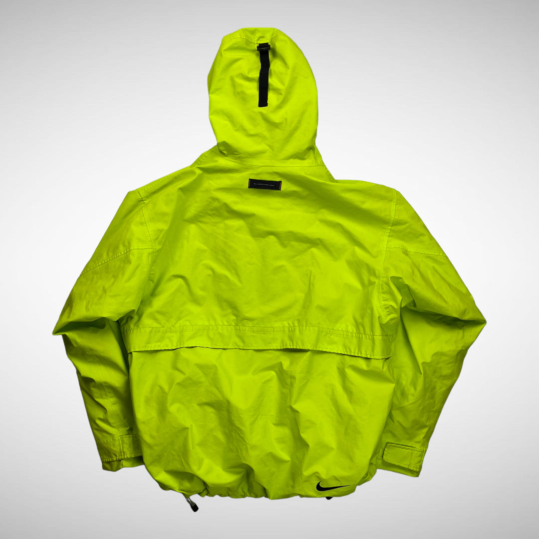 Bright green storm-fit jacket featuring double front zip-pockets, elastic toggles and strap on backside to adjust hood, velcro adjustable cuffs with storm-fit rubber patch on left wrist, ACG lungs-logo embroidery on upper right arm, mesh lining for ventilation, adjustable hem, branded script tag on neck and big embroidered swoosh on lower right body.