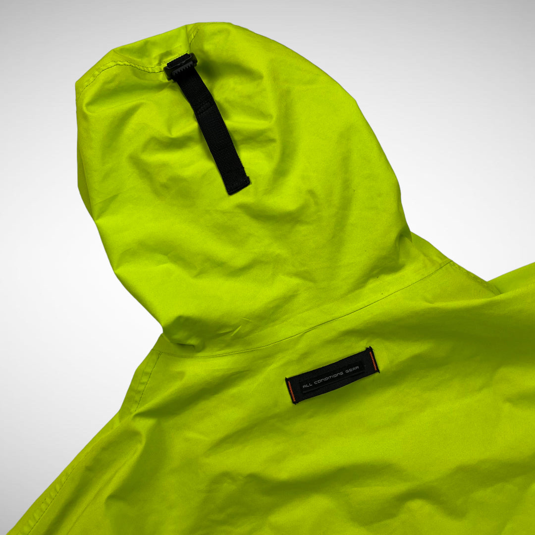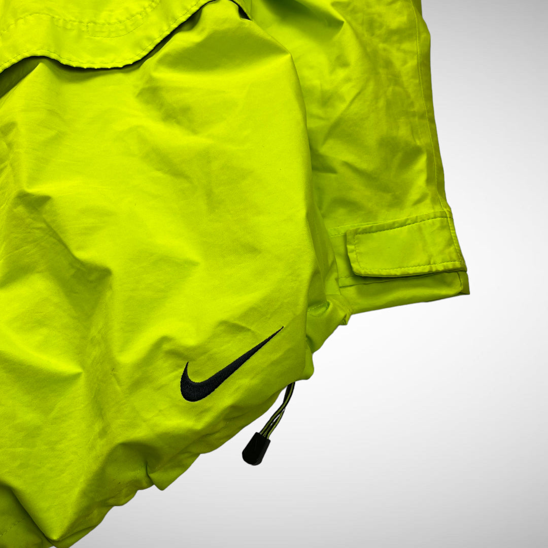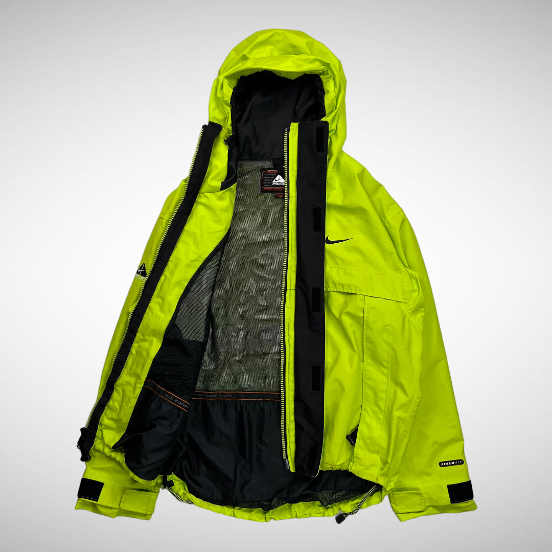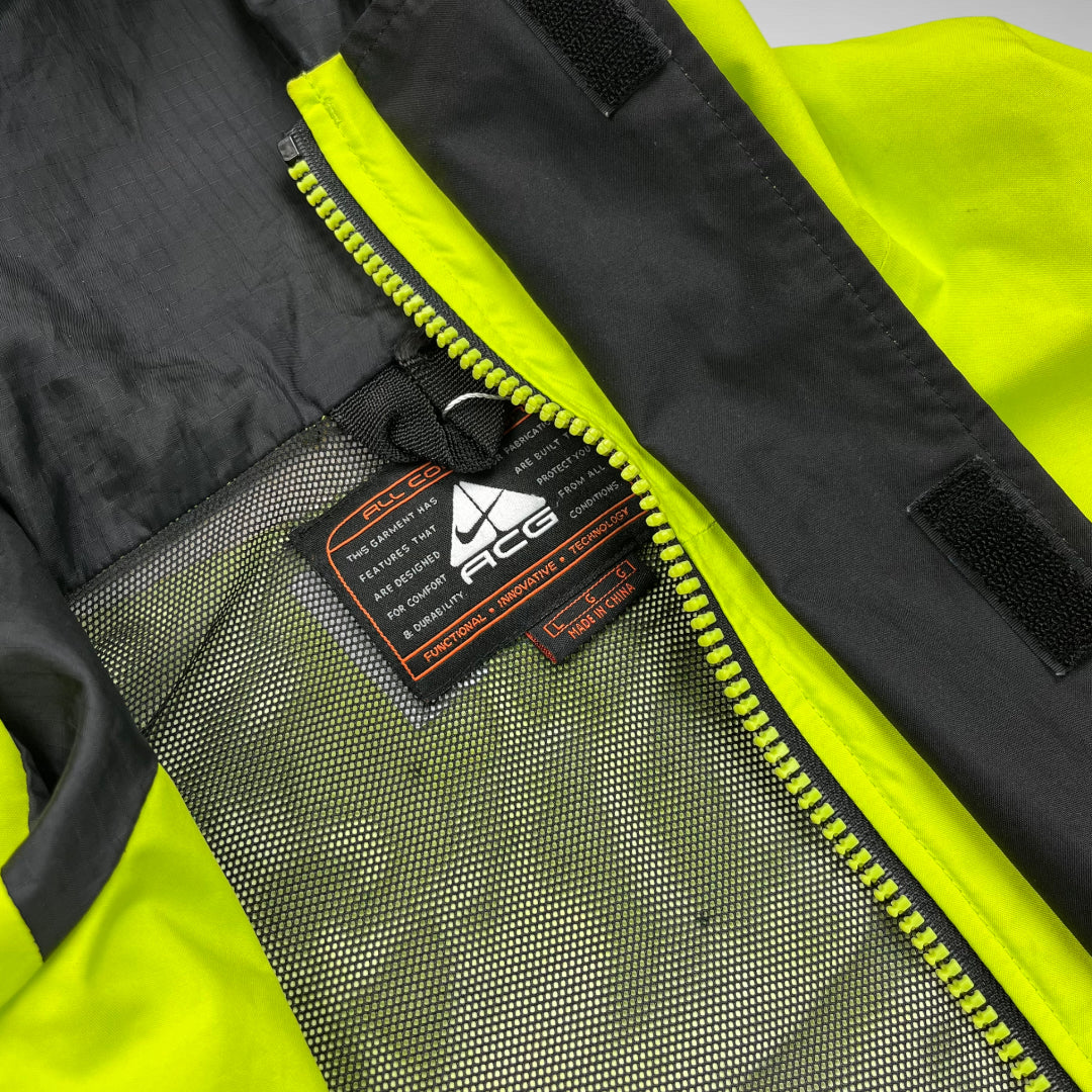 Bright green storm-fit jacket featuring double front zip-pockets, elastic toggles and strap on backside to adjust hood, velcro adjustable cuffs with storm-fit rubber patch on left wrist, ACG lungs-logo embroidery on upper right arm, mesh lining for ventilation, adjustable hem, branded script tag on neck and big embroidered swoosh on lower right body.