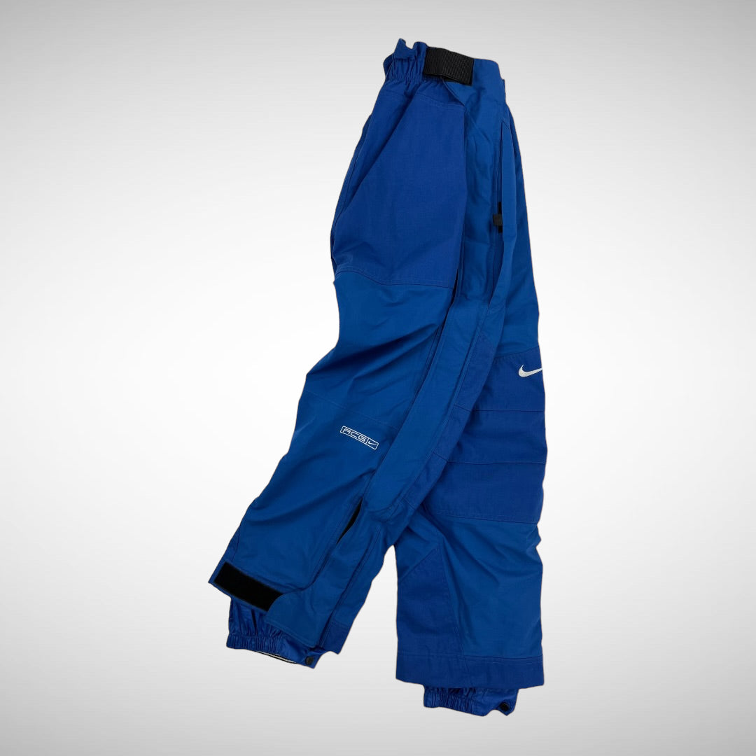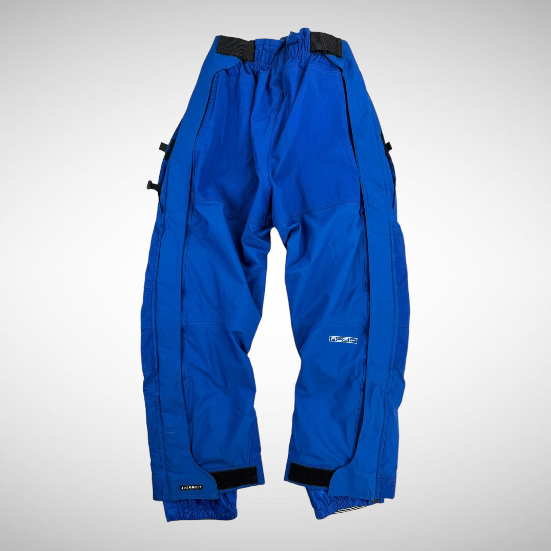 Blue woven nylon rip-stop material, made in Hong Kong, double back-side full-zip to adjust fit and for easy access, ACG embroidered branding on front and back, Storm-Fit rubber patch at lower leg, waterproof lining, internal belt and elastic waist to adjust sizing.