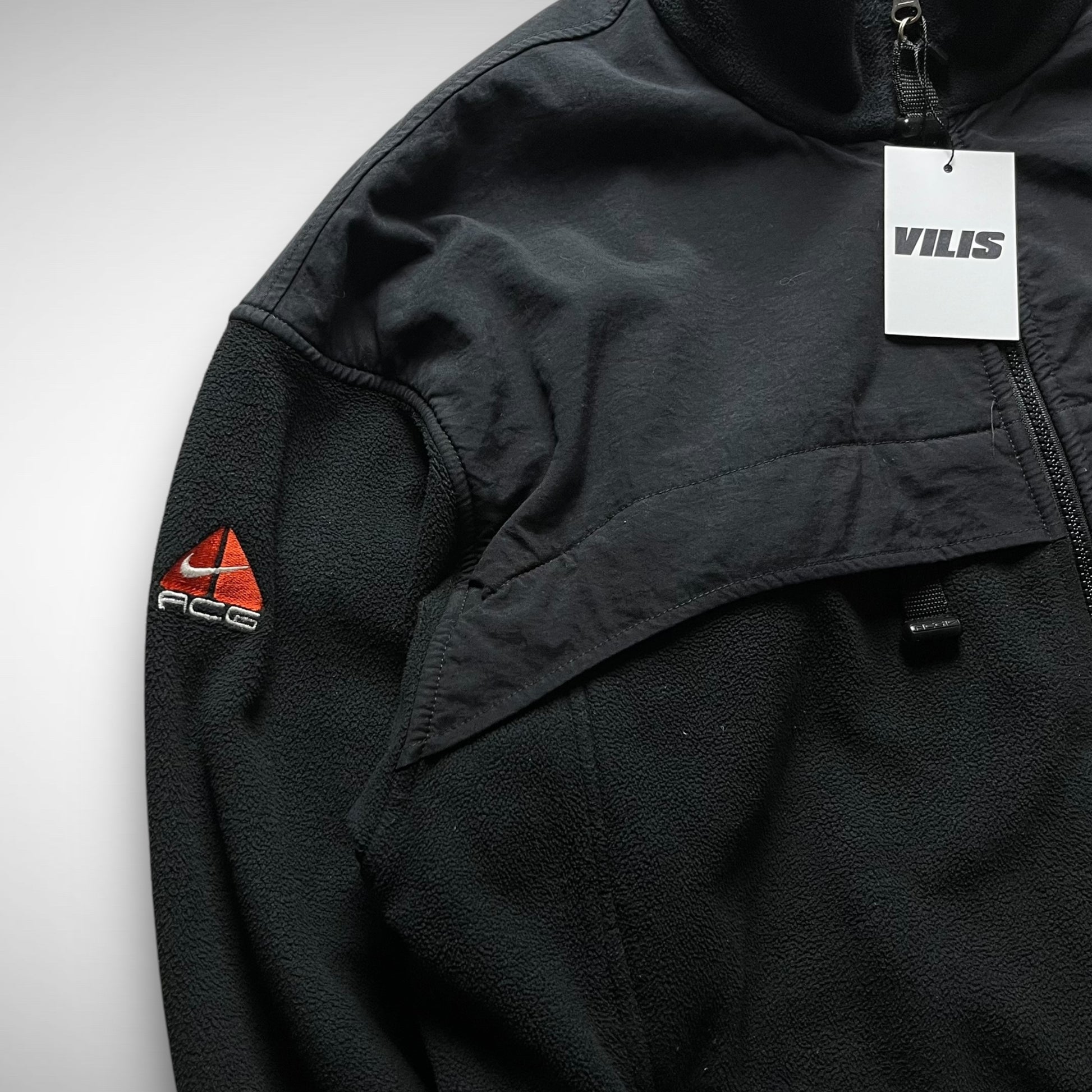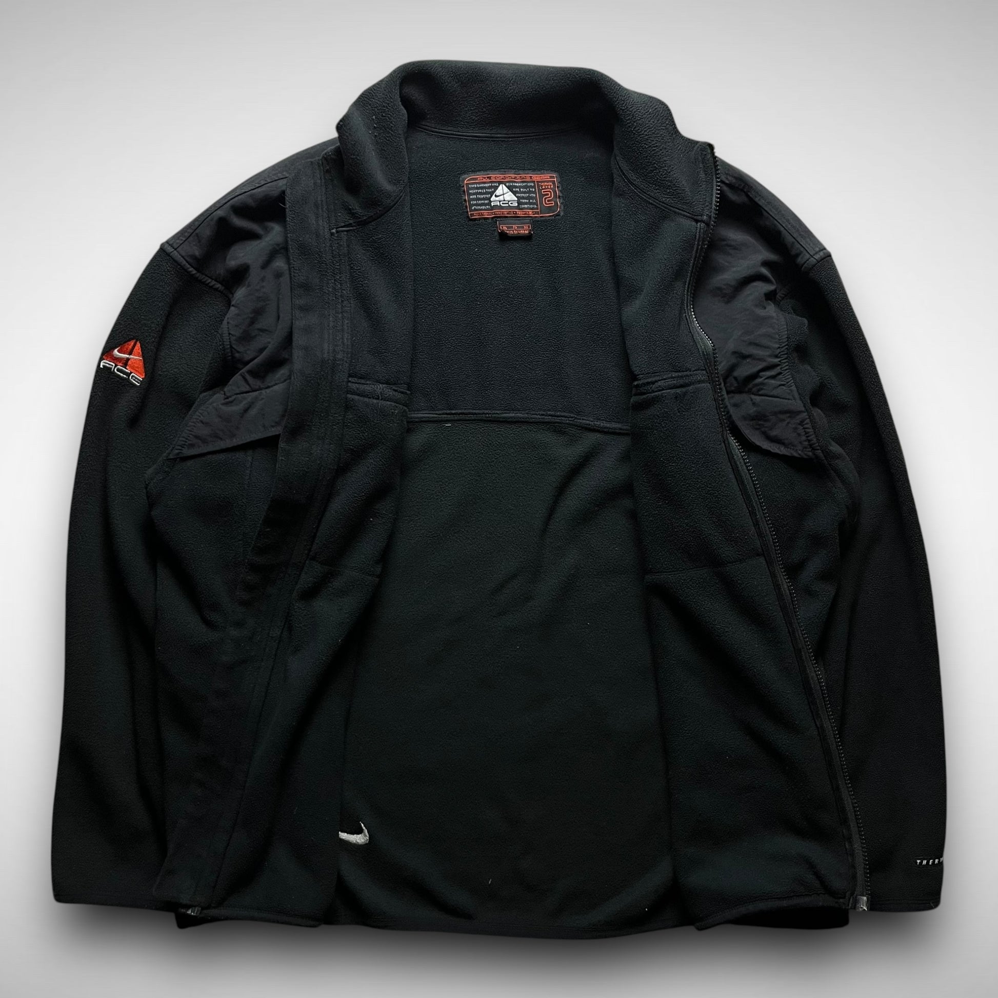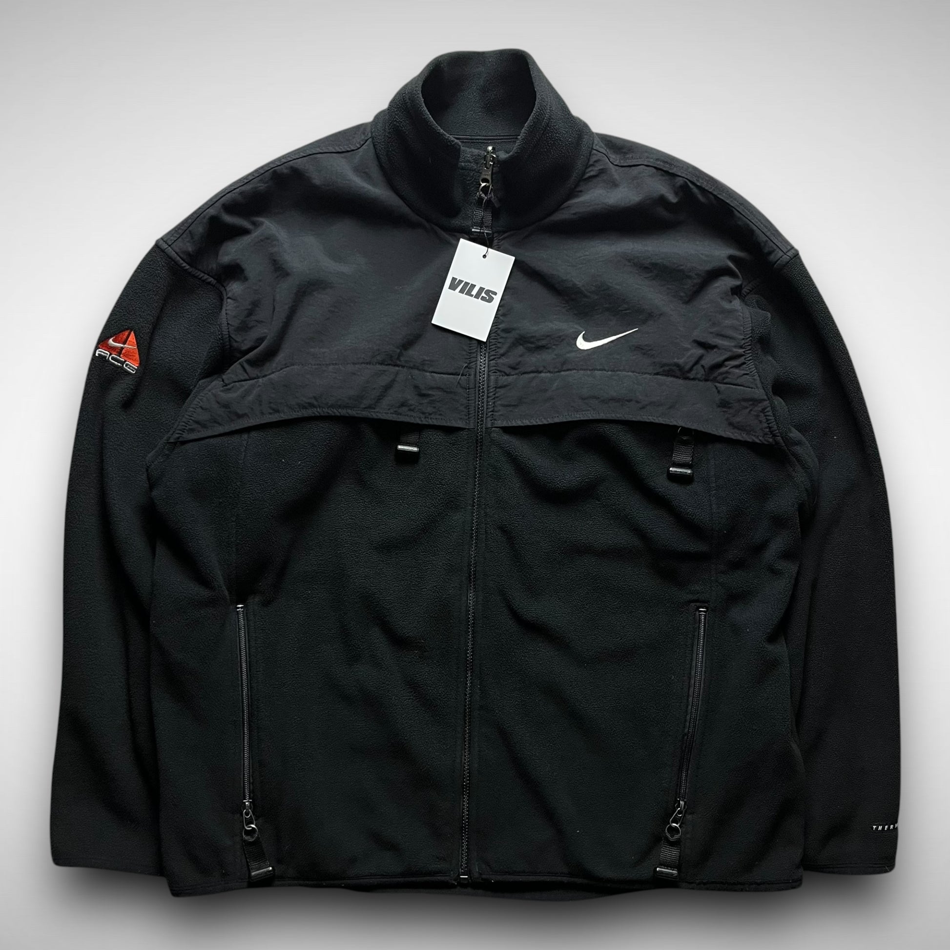 Thermo fleece jacket featuring a nylon upper body including elbows, branded hardware on all four front zip-pockets and closure, elasticated cuffs, embroidered swoosh on chest and lower back, ACG lungs-logo on upper arm, Thermo-Fit tag at lower arm and ACG script branded tag at upper-neck. Including arm-pit zips for ventilation.