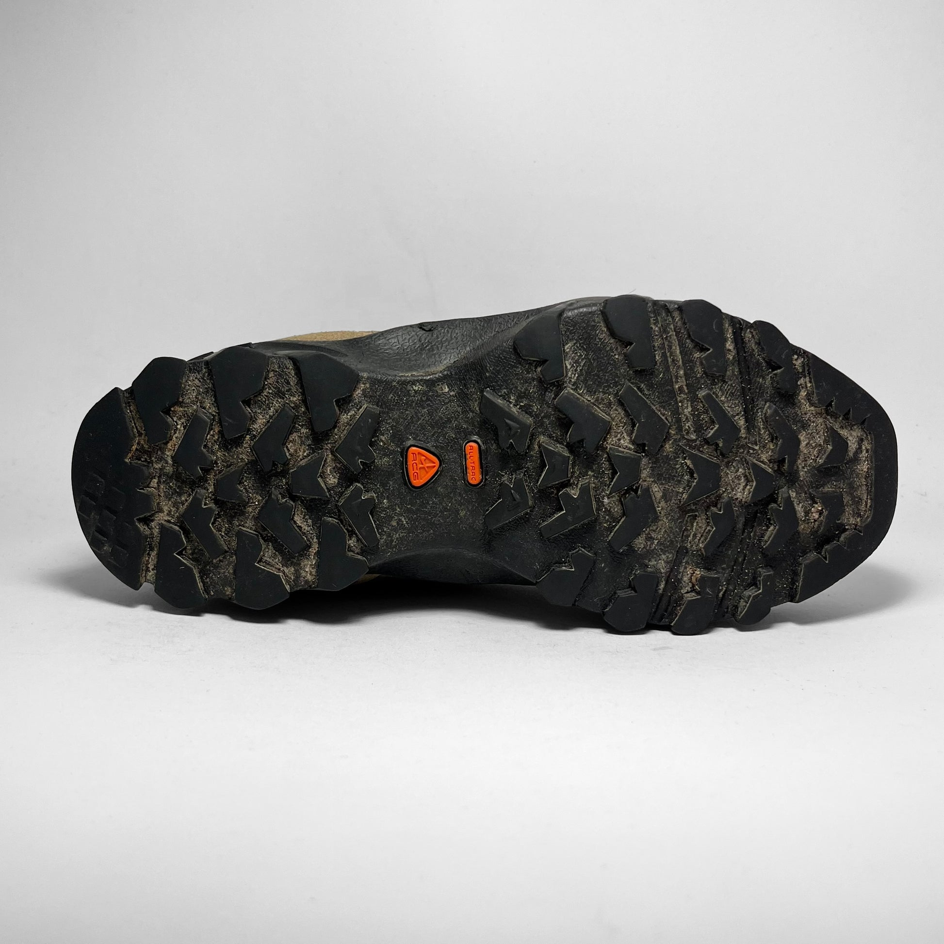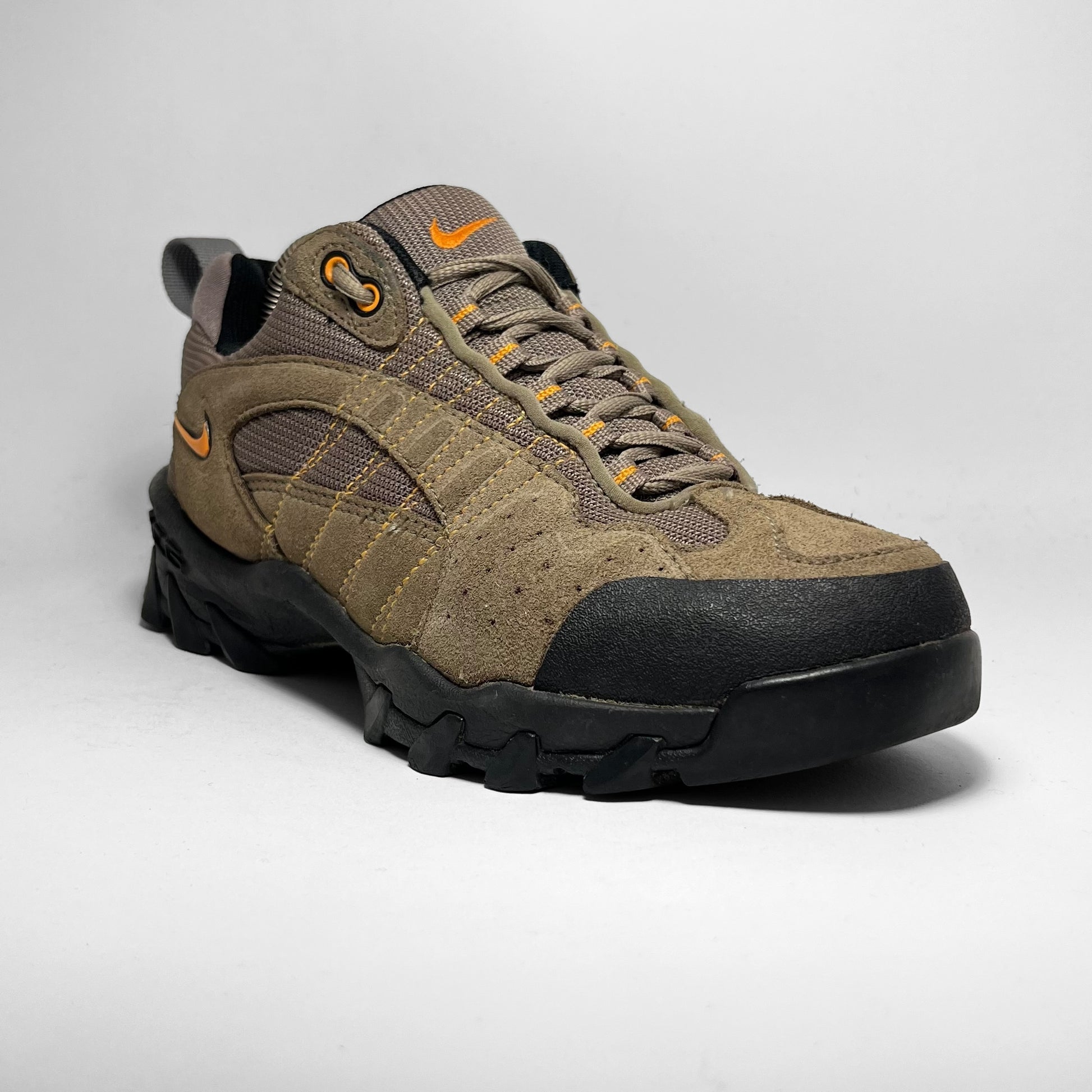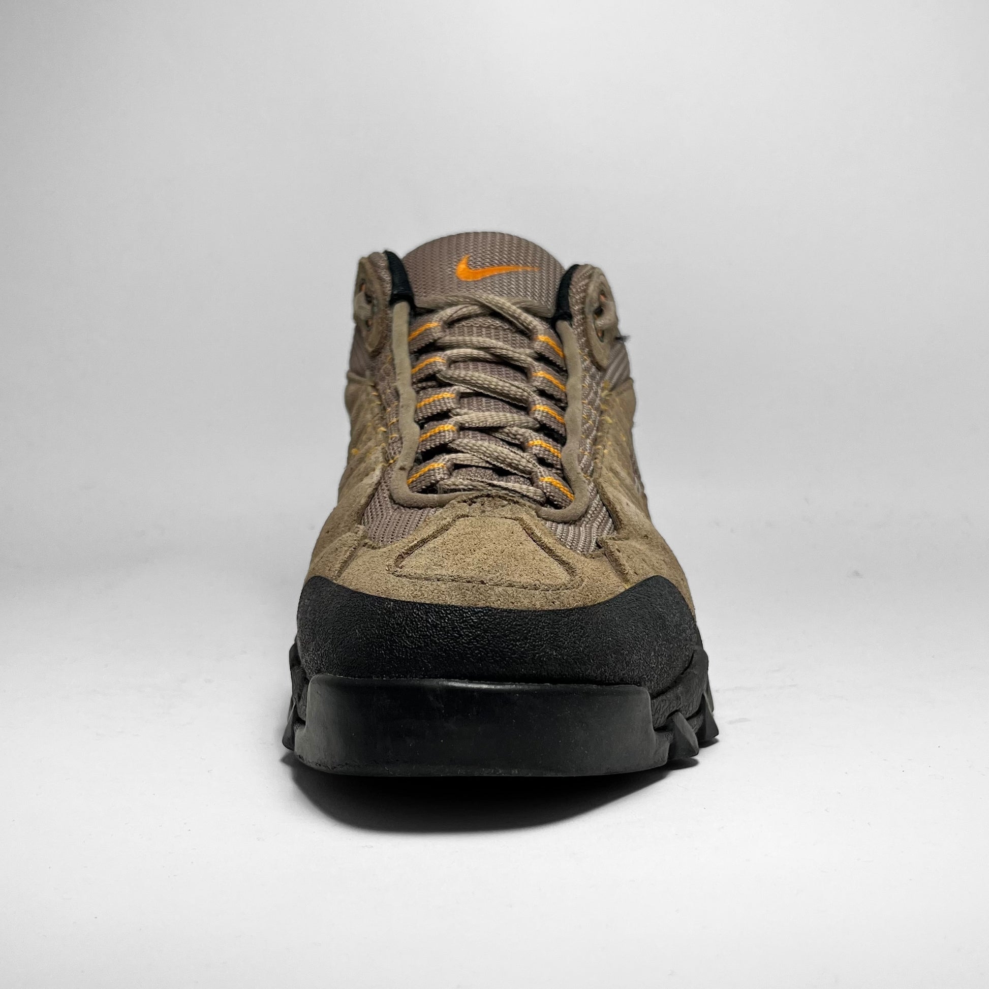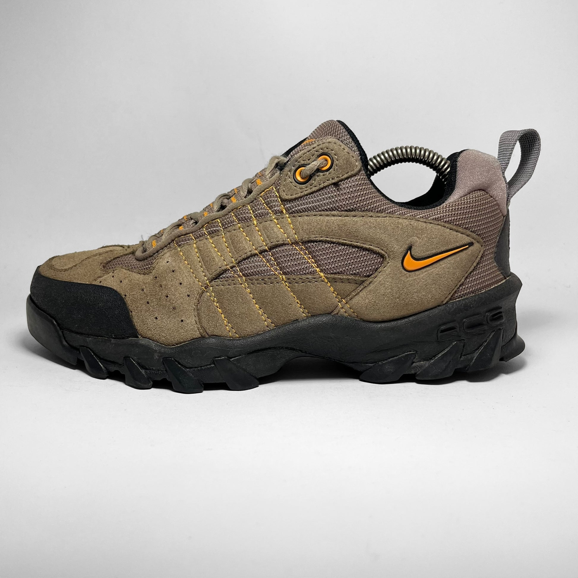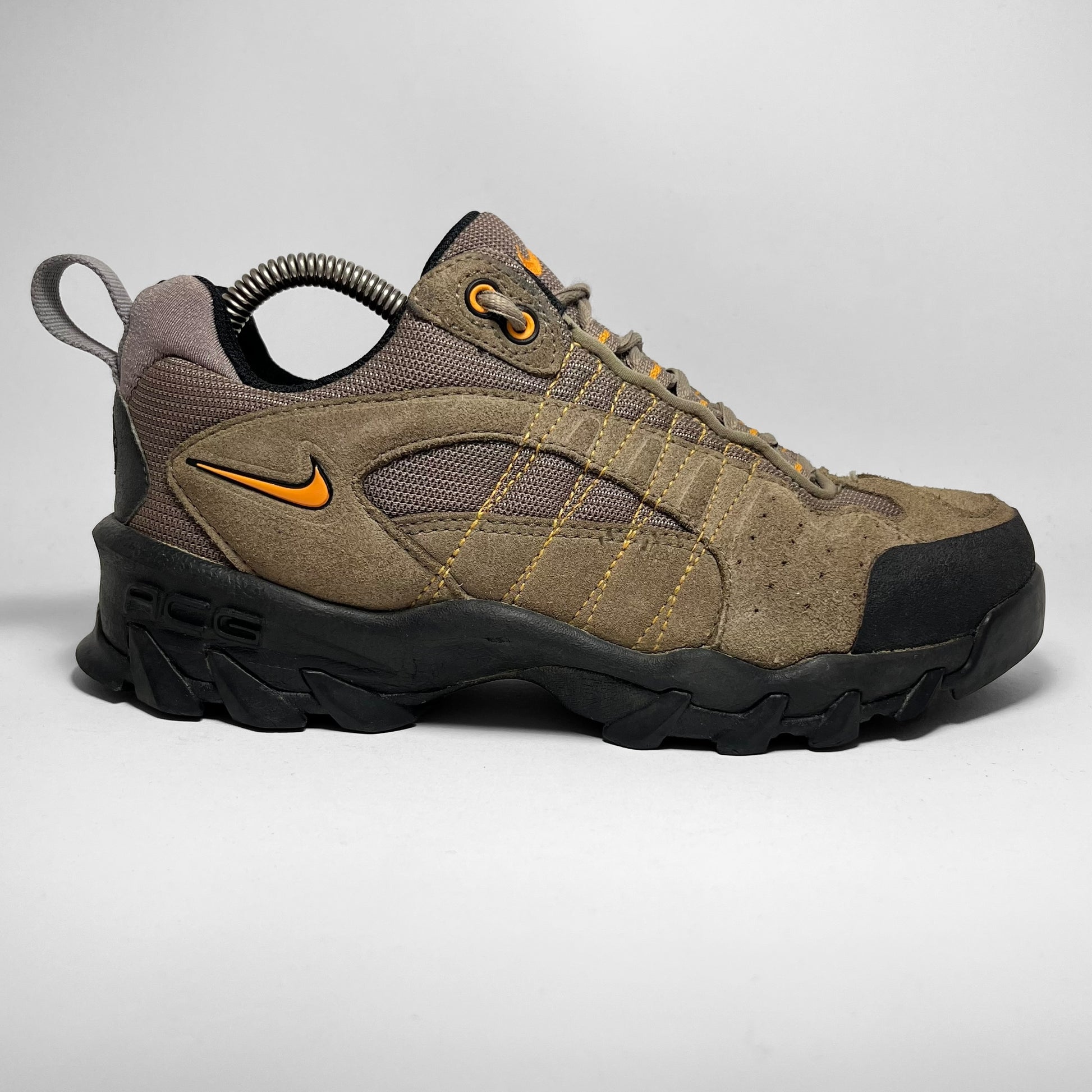 Suede panels and mesh uppers in sand tones mixed with contrast orange stitching, eyelets’ details, mini-swoosh placement and branding on tongue and heel, vulcanised rubber mudguard, thick collar and padding for comfort, and ACG all-terrain sole.