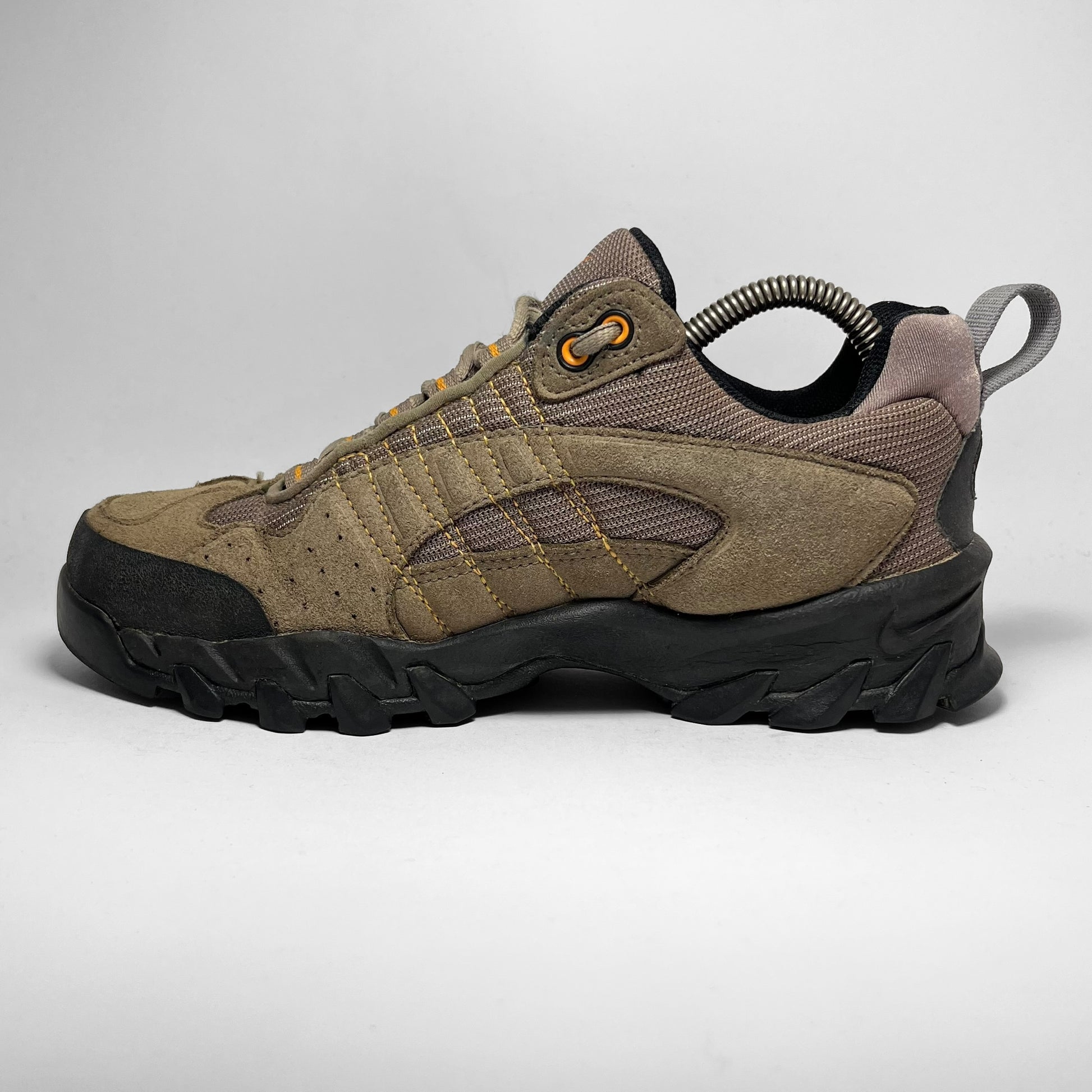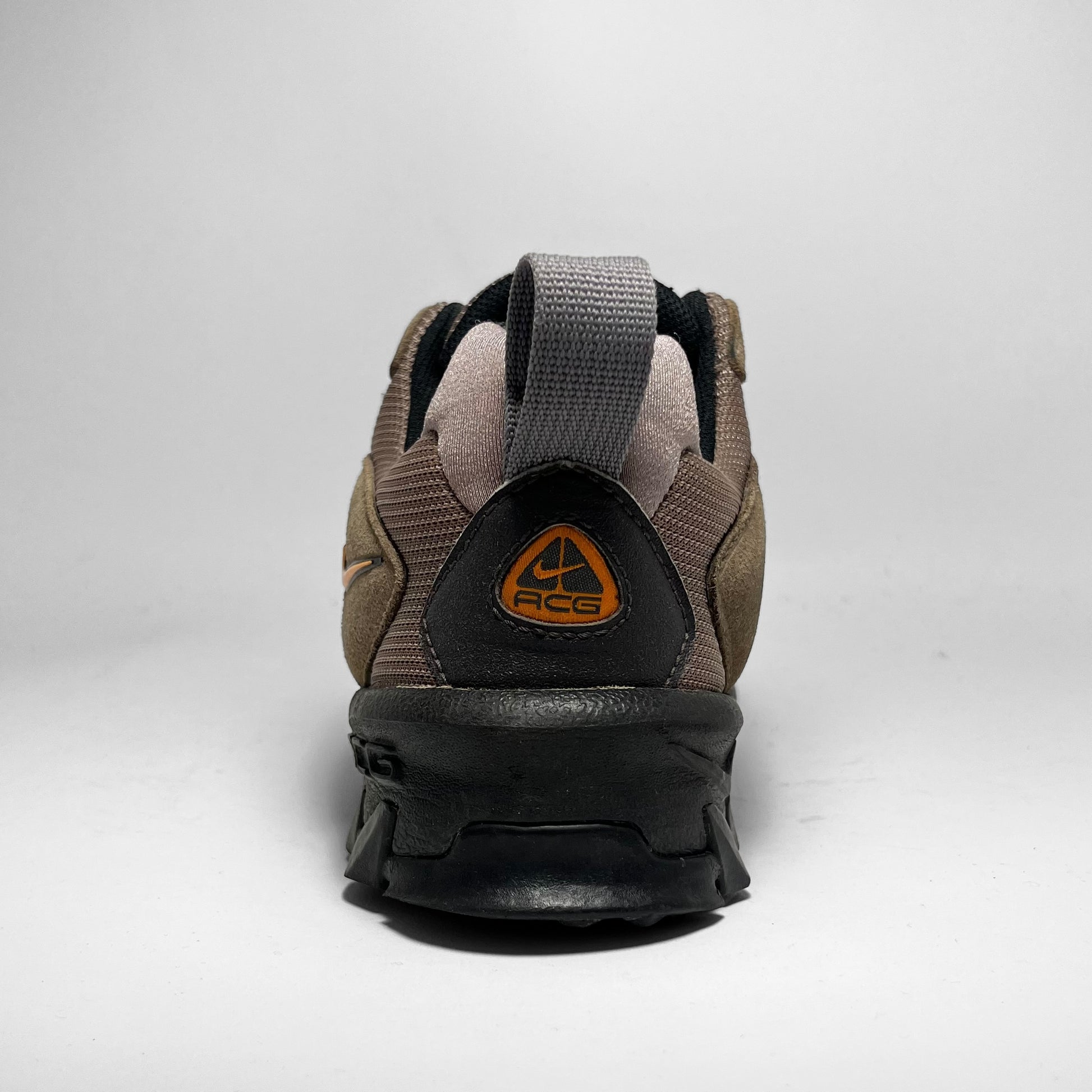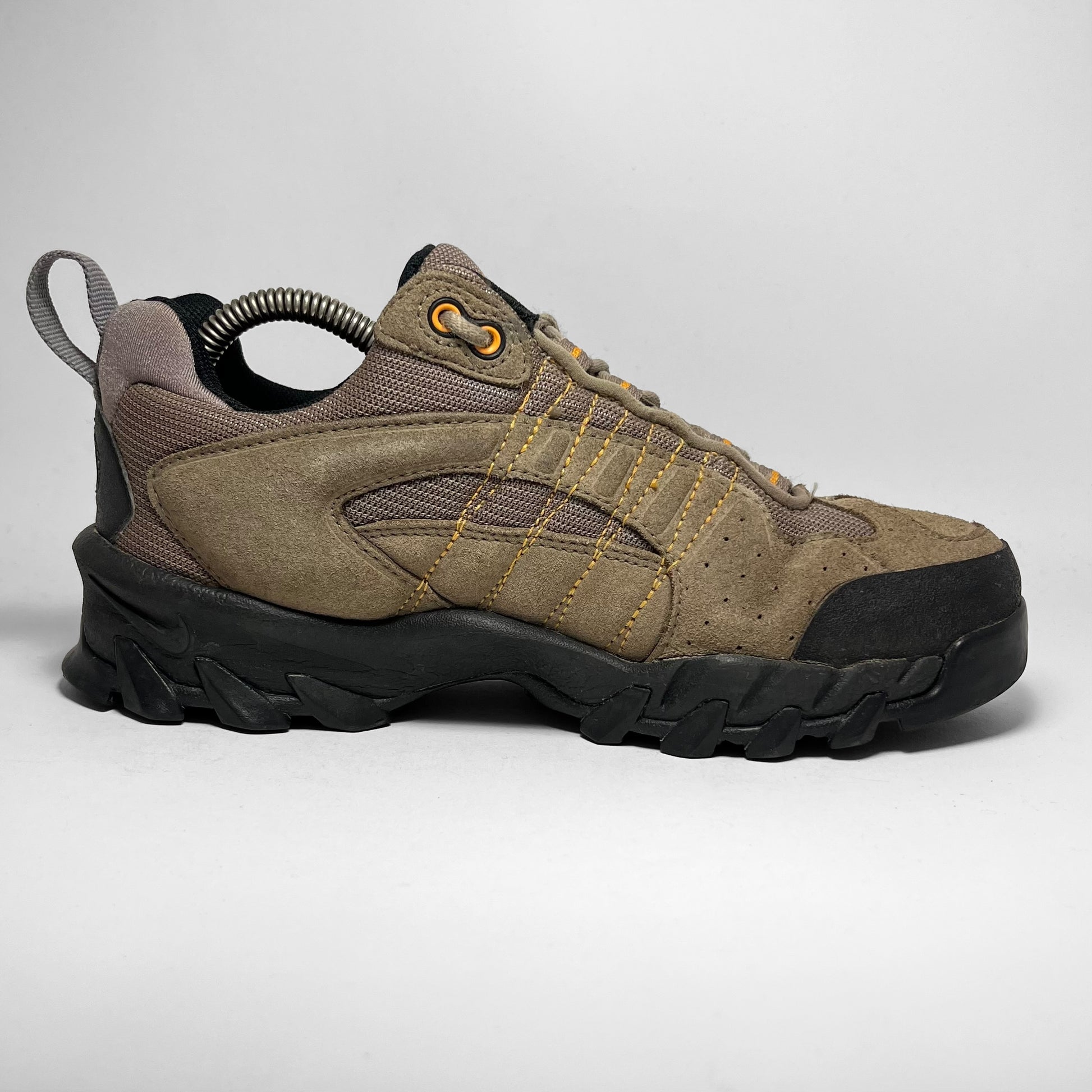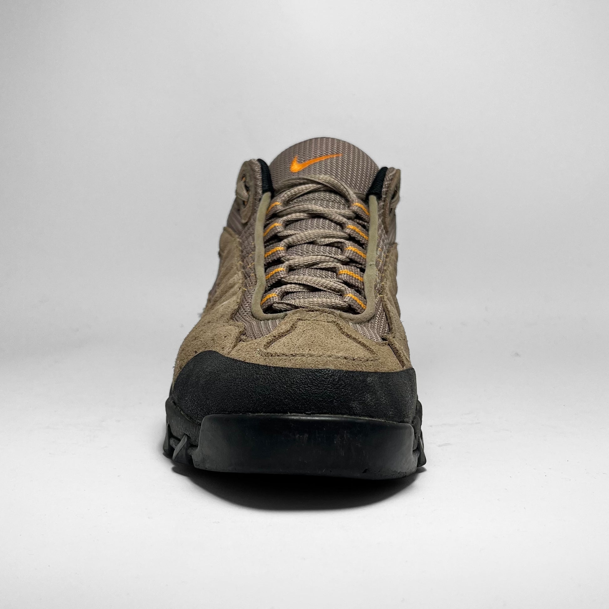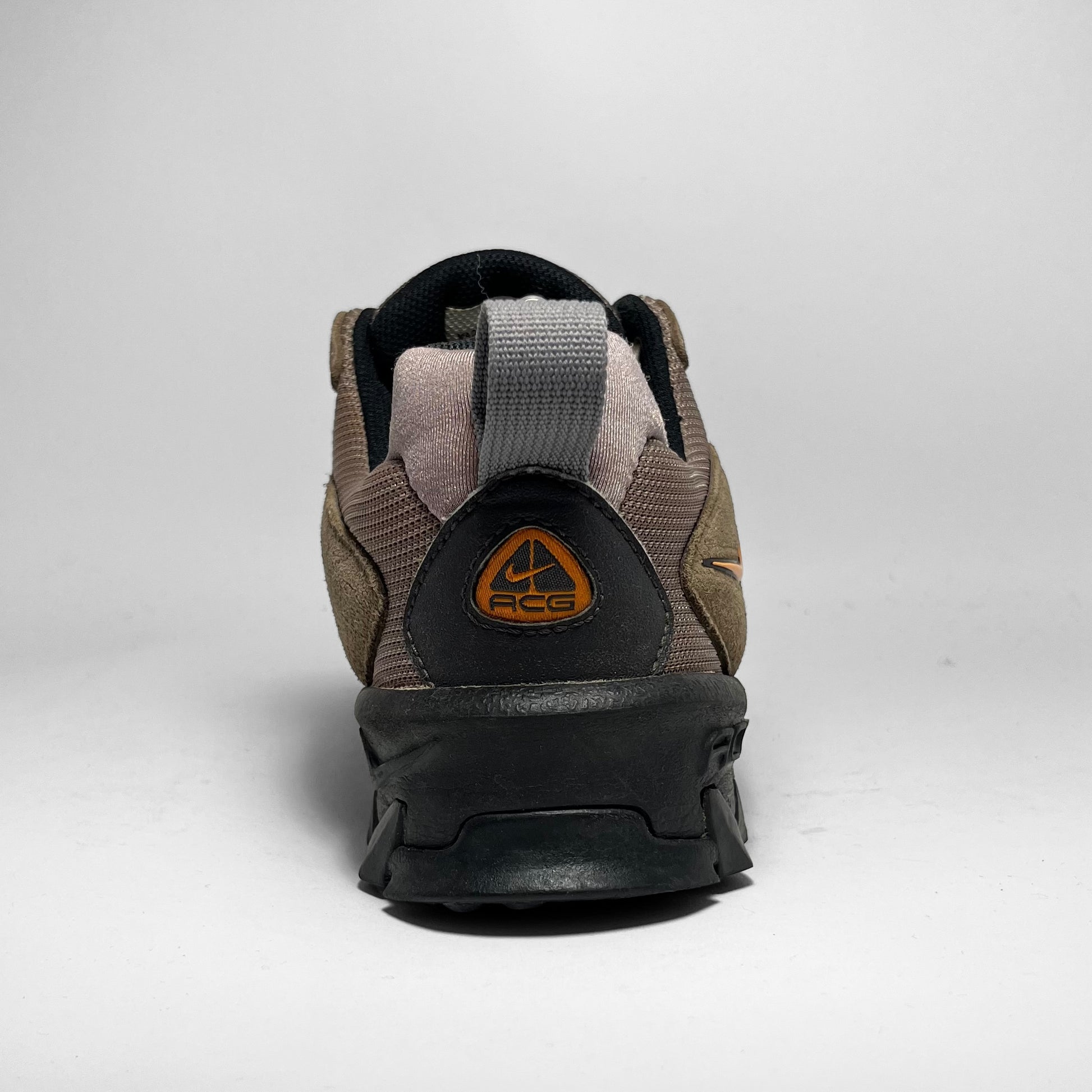 Suede panels and mesh uppers in sand tones mixed with contrast orange stitching, eyelets’ details, mini-swoosh placement and branding on tongue and heel, vulcanised rubber mudguard, thick collar and padding for comfort, and ACG all-terrain sole.