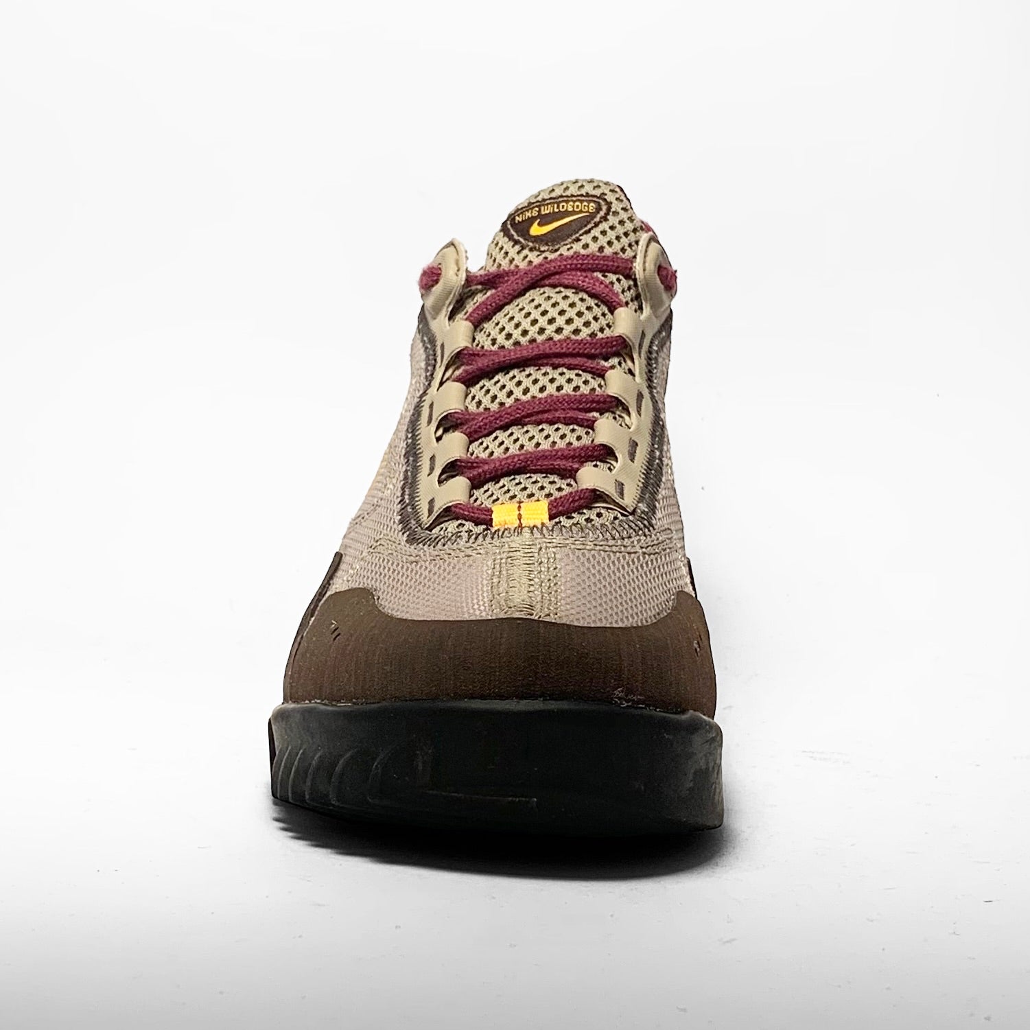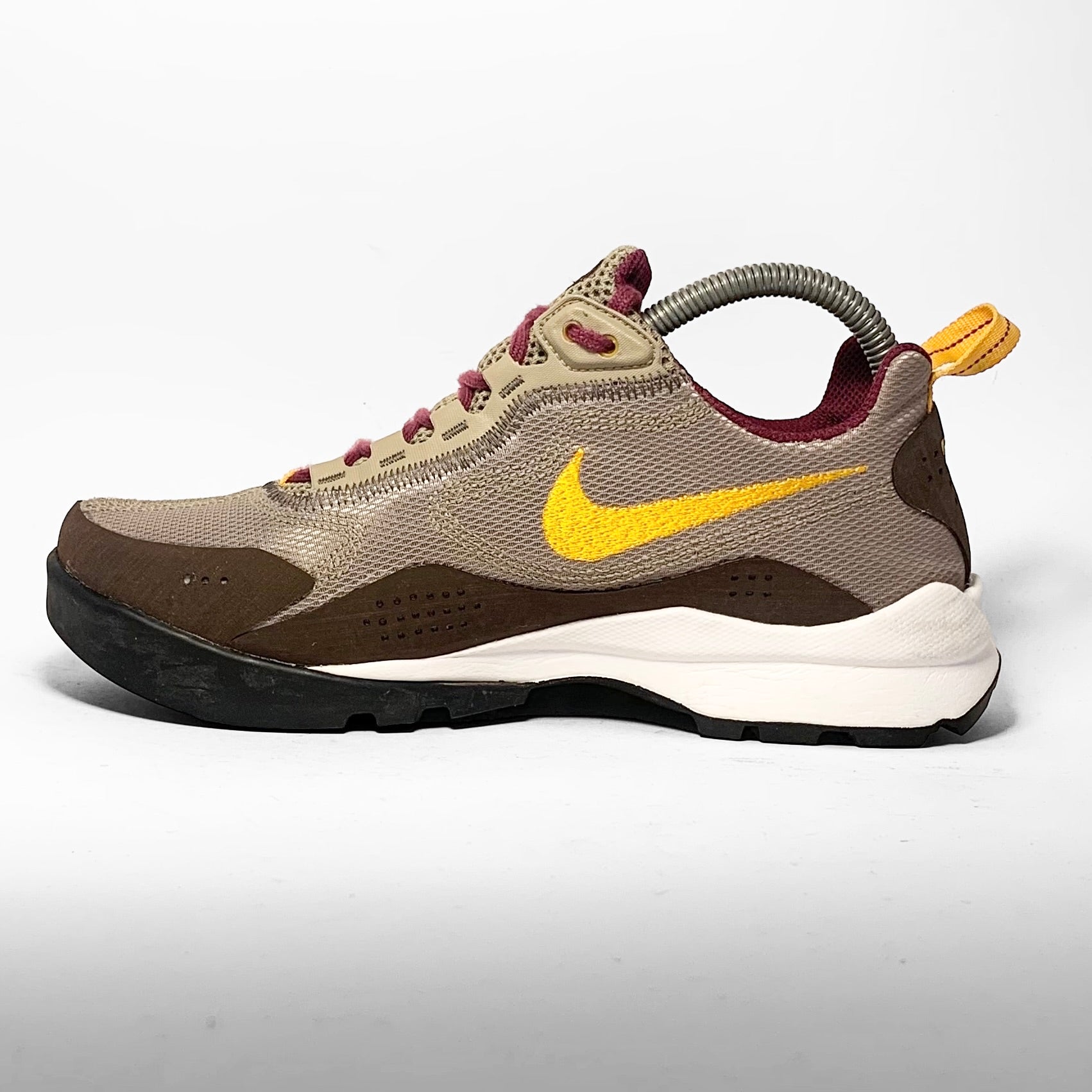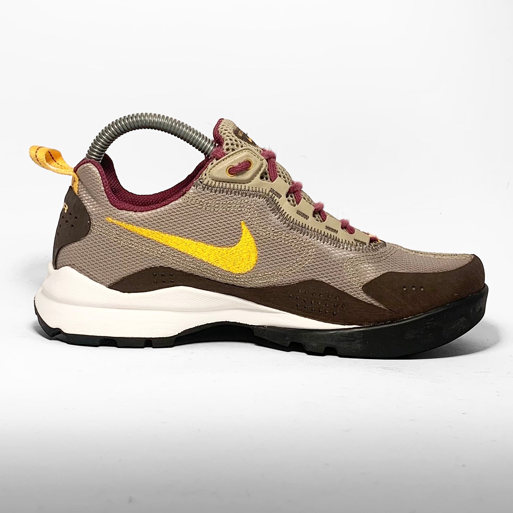 Light-brown mesh throughout with brown rubberised mudguards, yellow swoosh, purple laces & sock-liner.