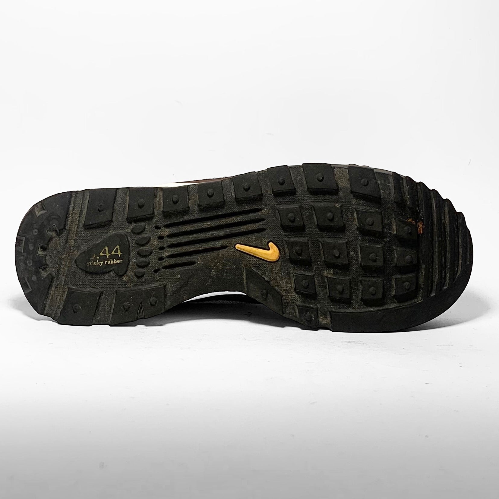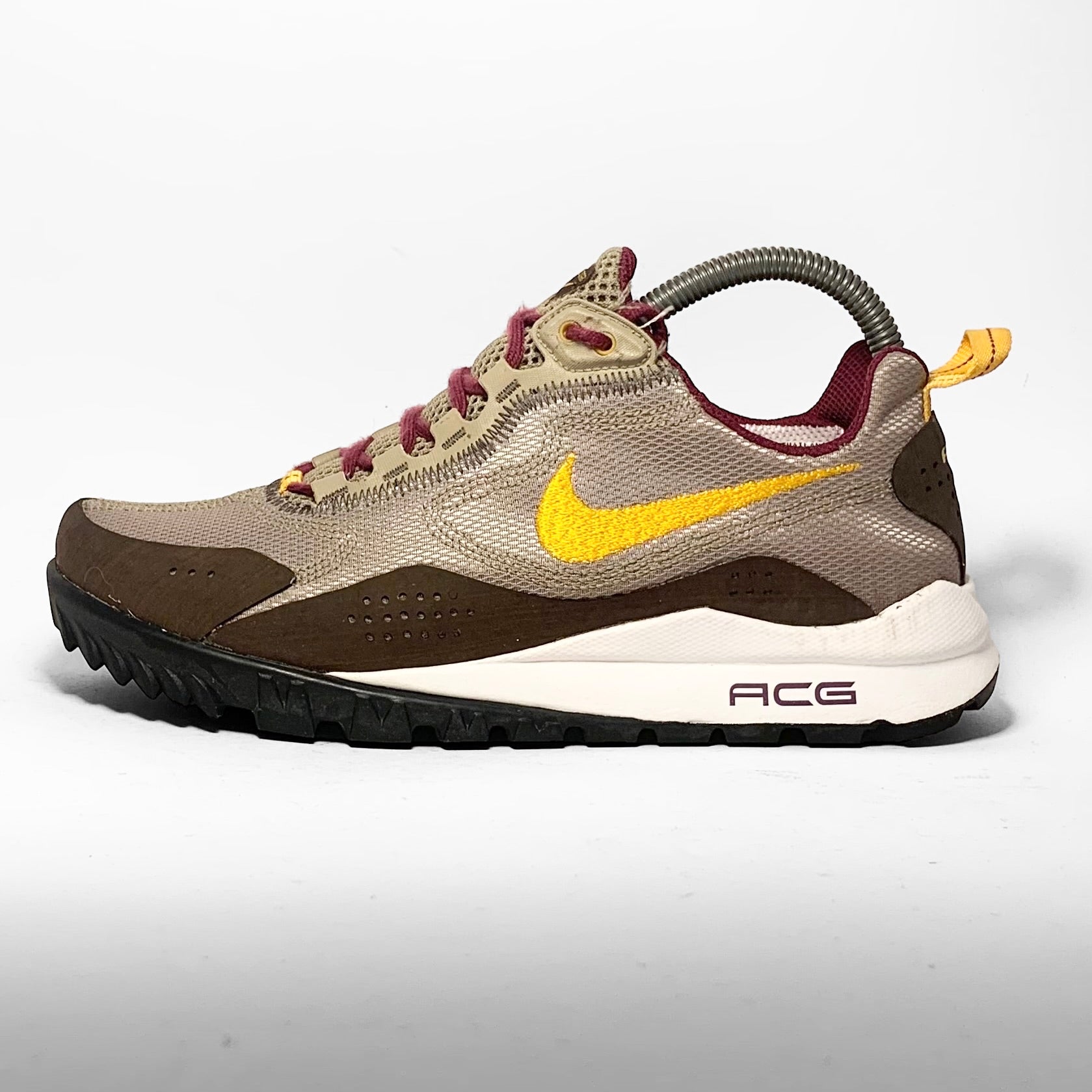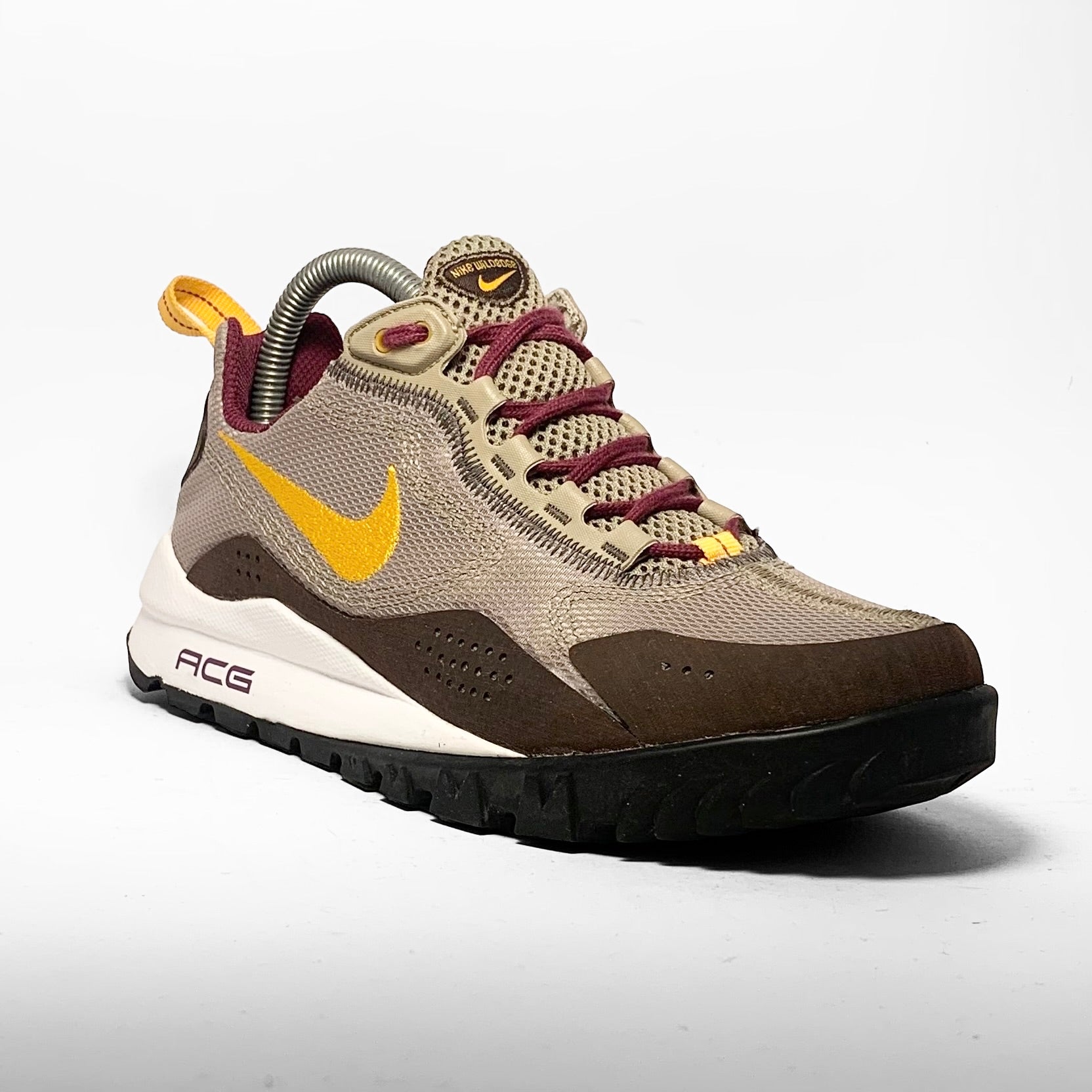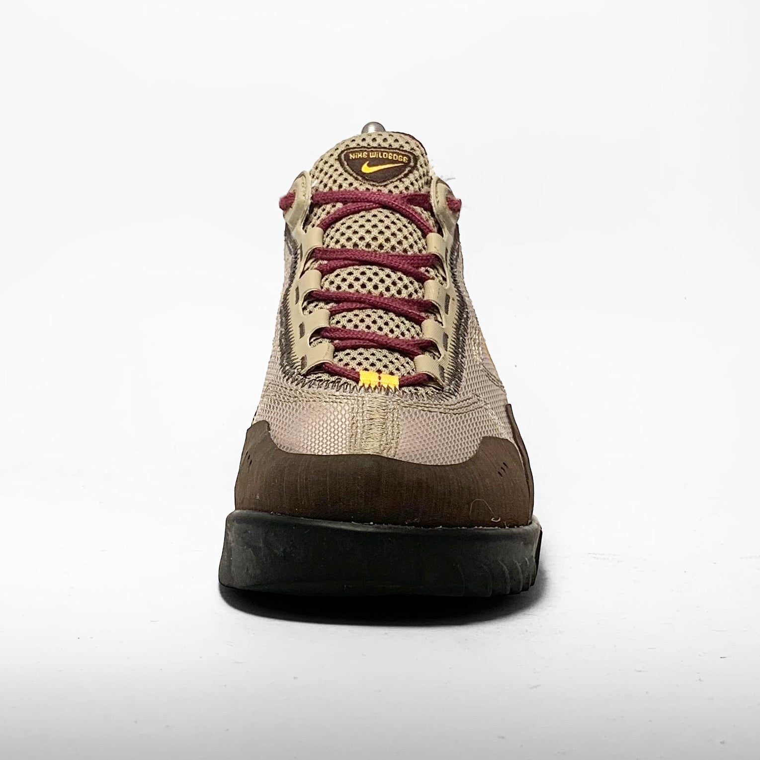 Light-brown mesh throughout with brown rubberised mudguards, yellow swoosh, purple laces & sock-liner.