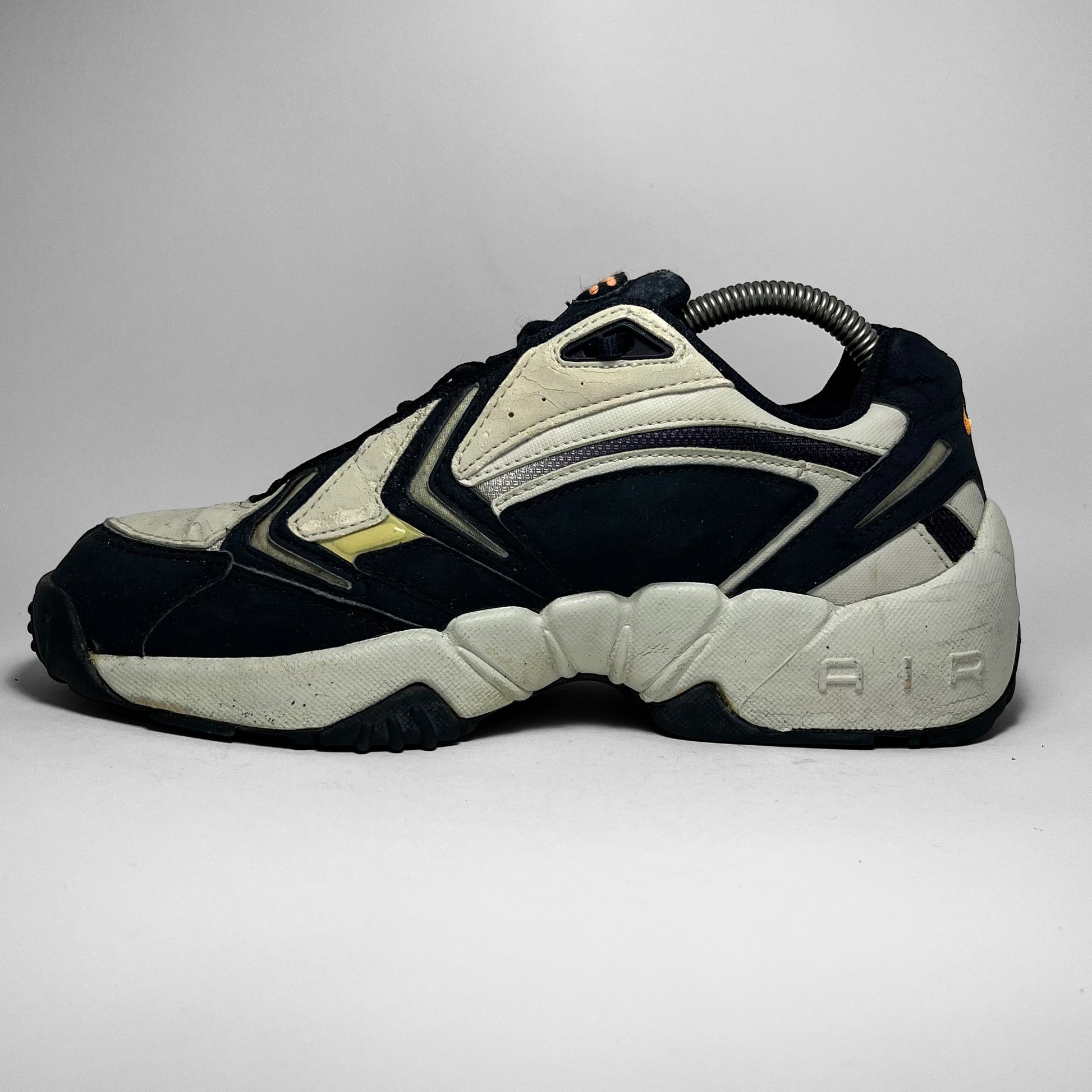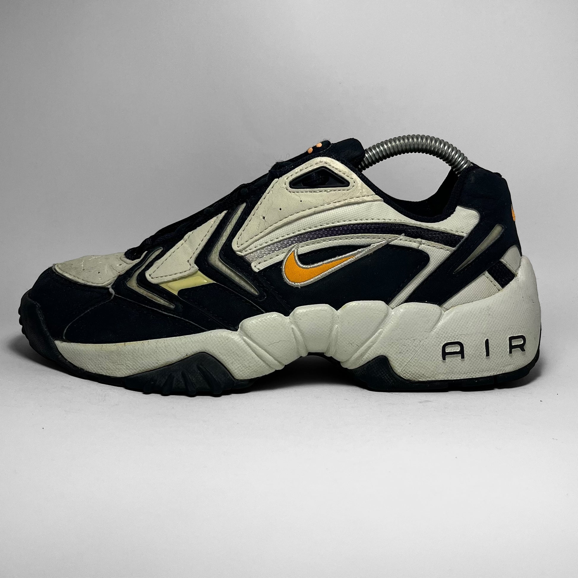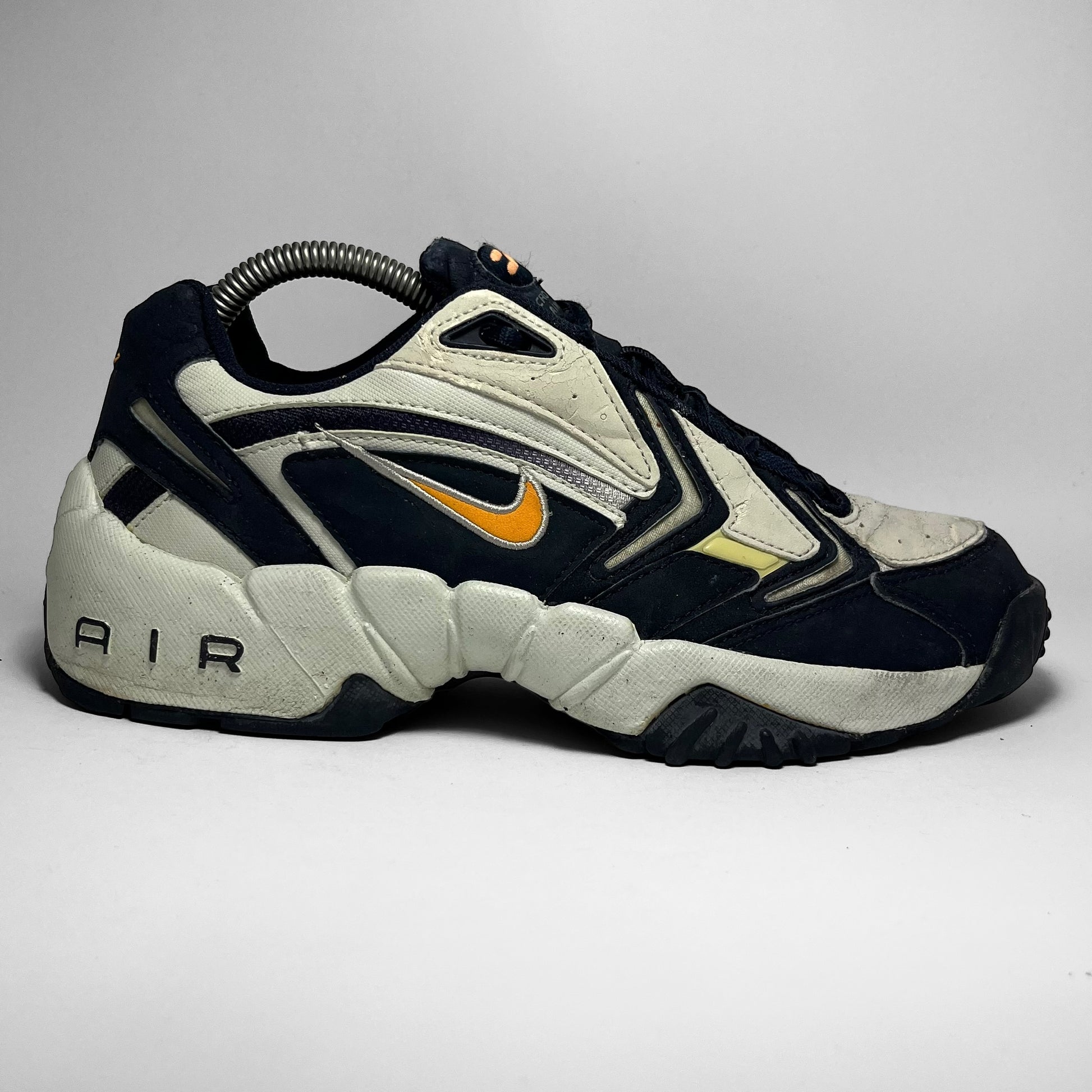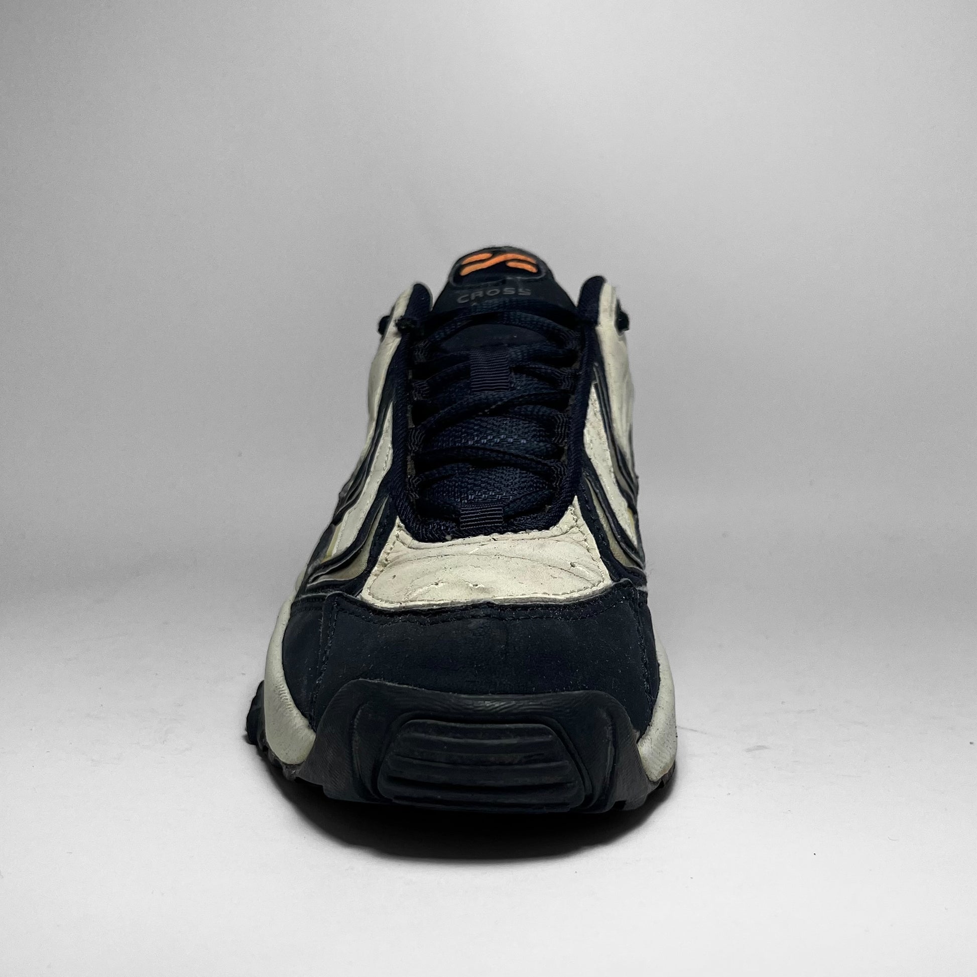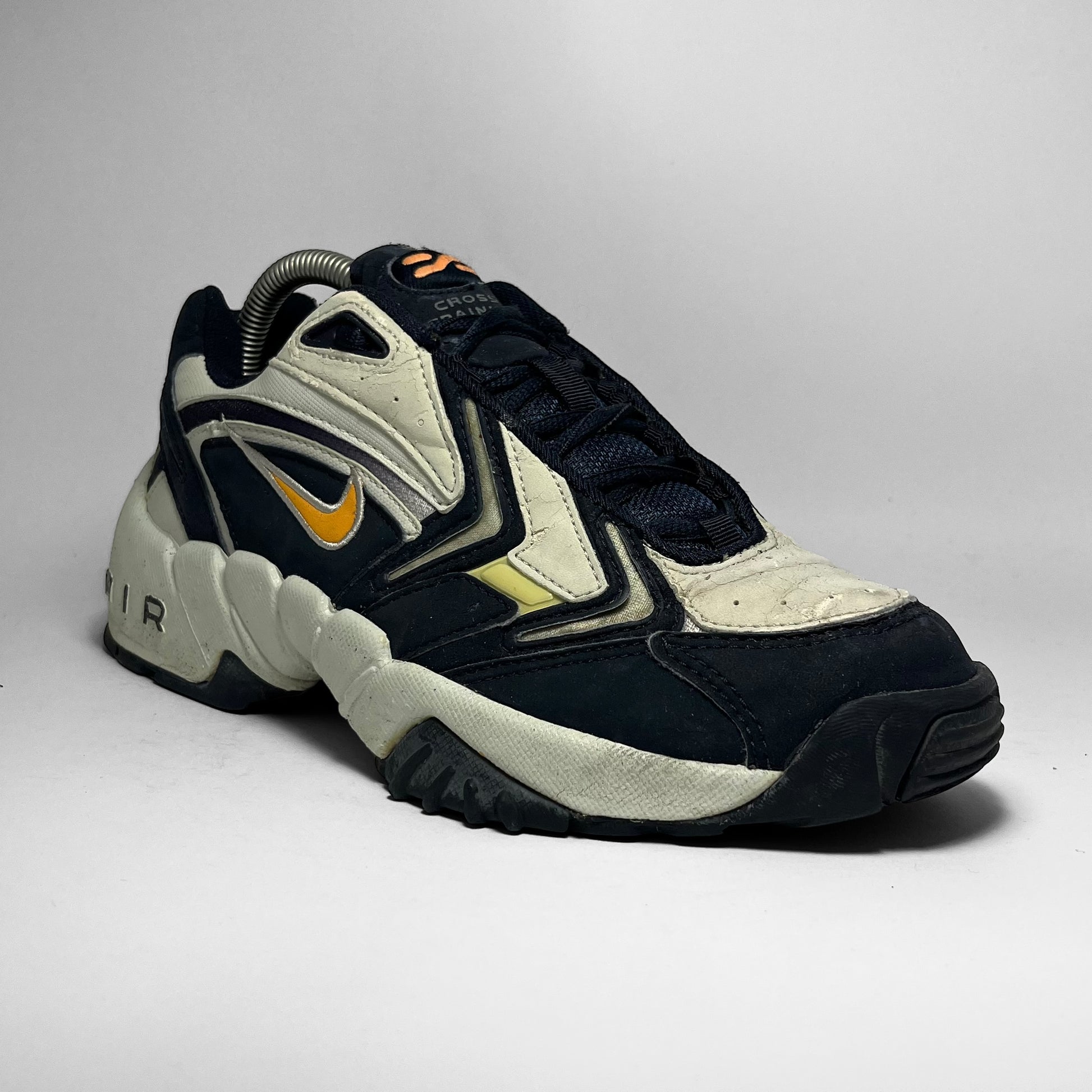 Navy and cream nubuck panels with fading mesh, orange swoosh on side and heel, Cross Training logo on tongue, and experimental midsole.