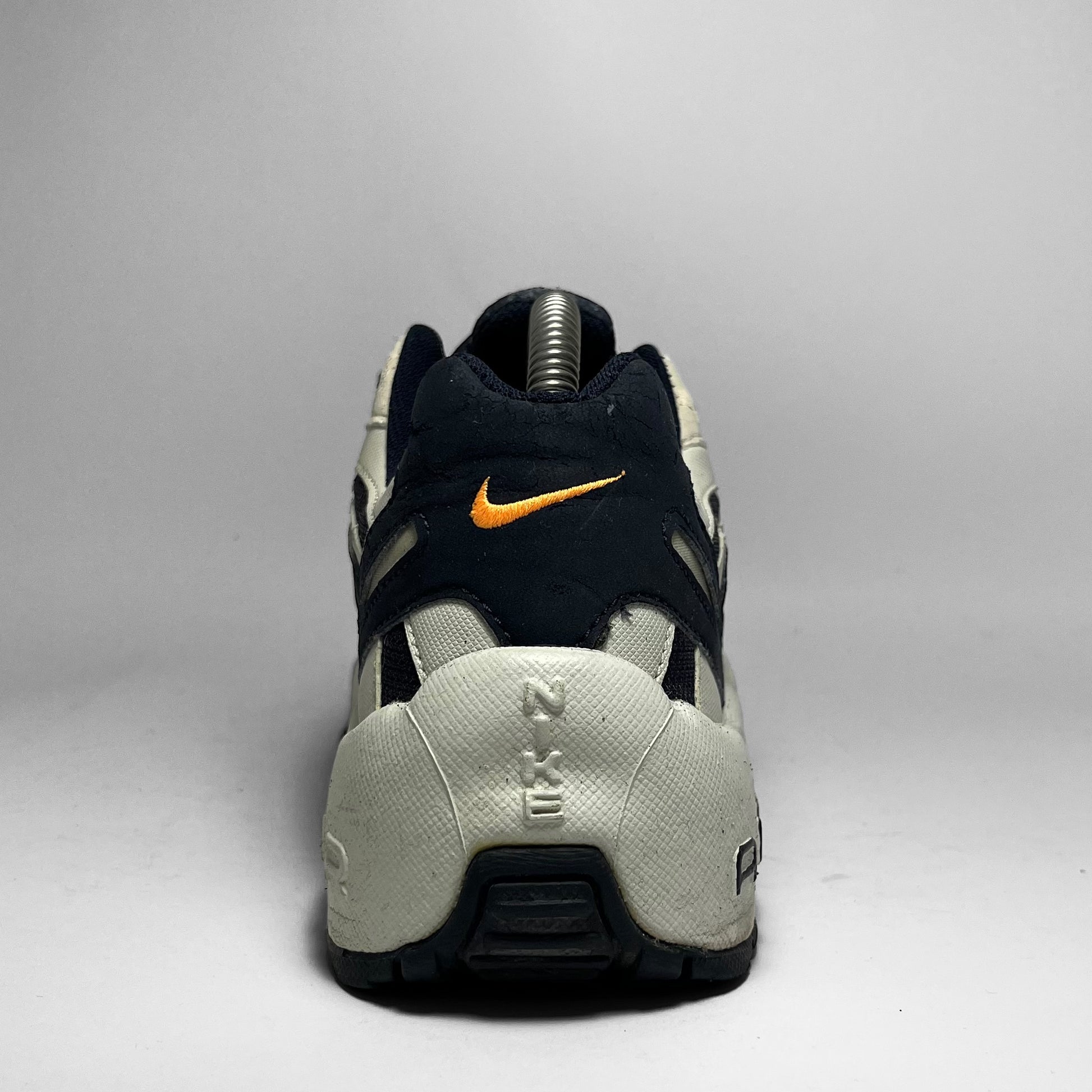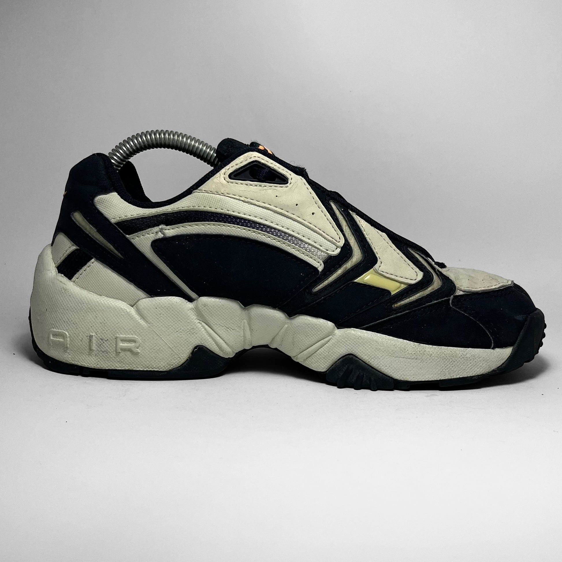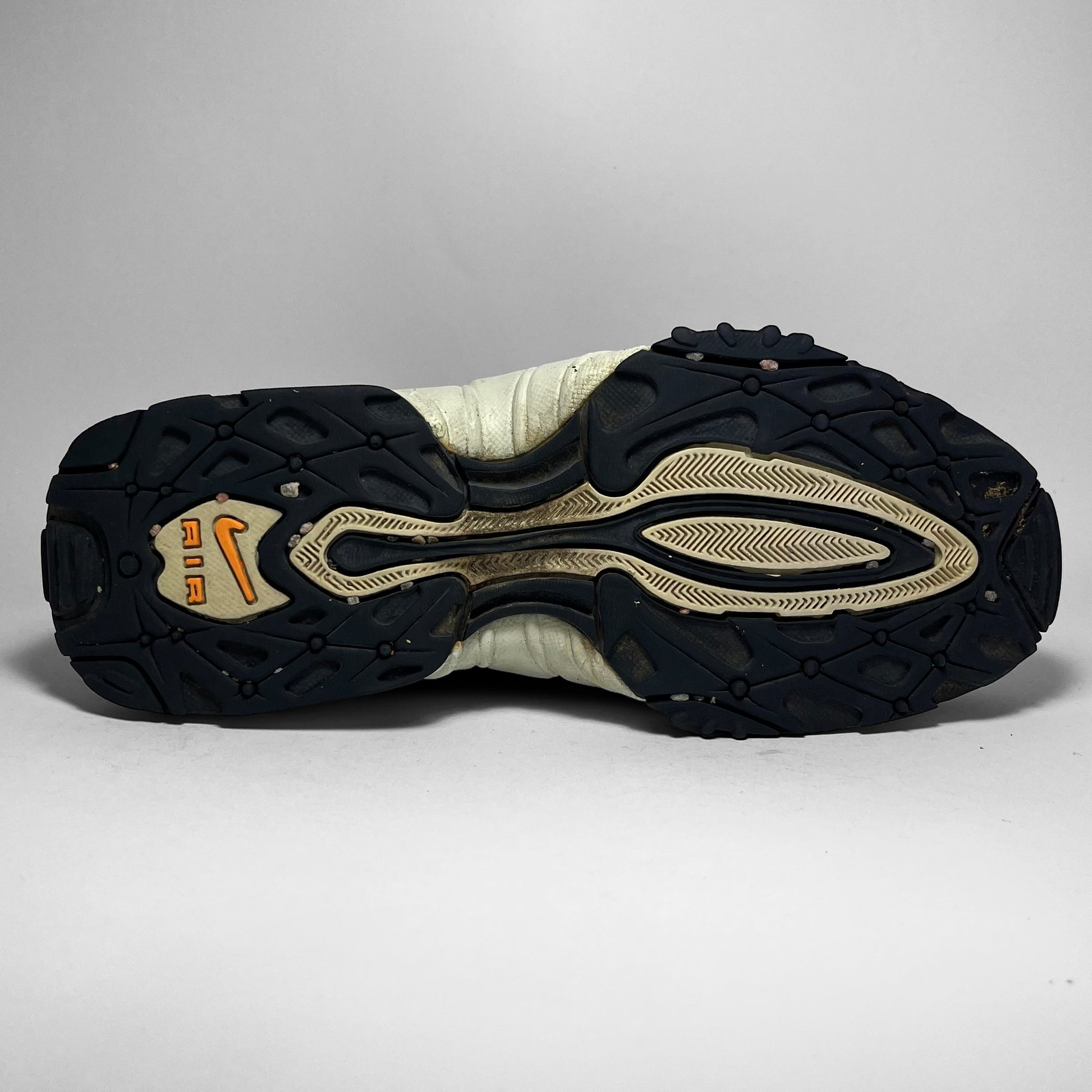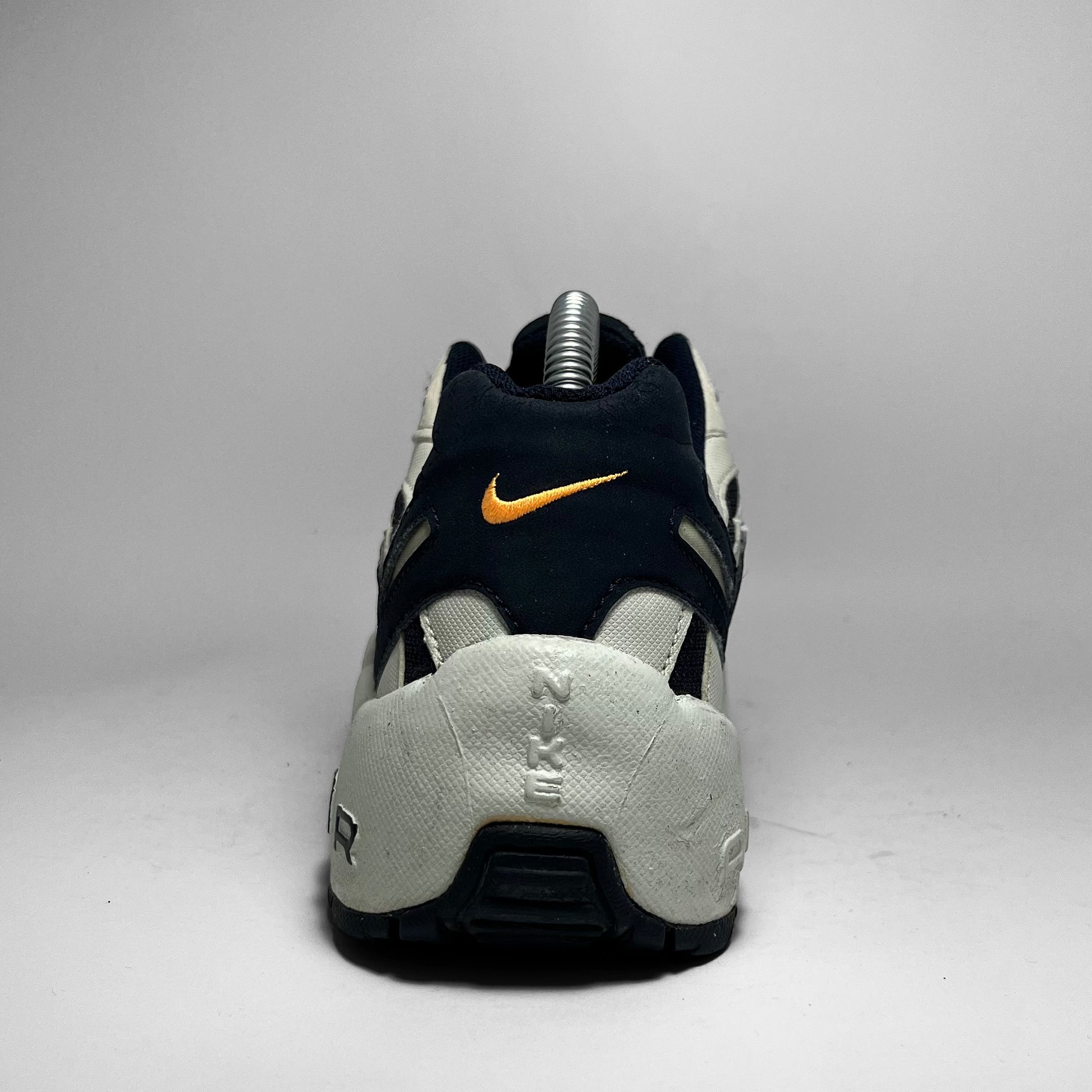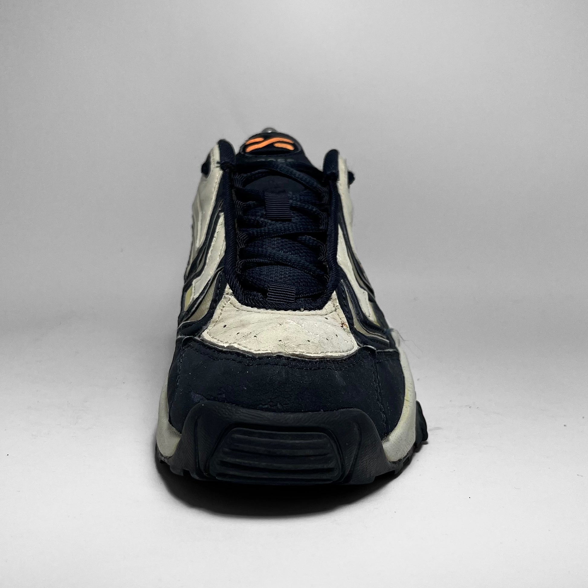 Navy and cream nubuck panels with fading mesh, orange swoosh on side and heel, Cross Training logo on tongue, and experimental midsole.
