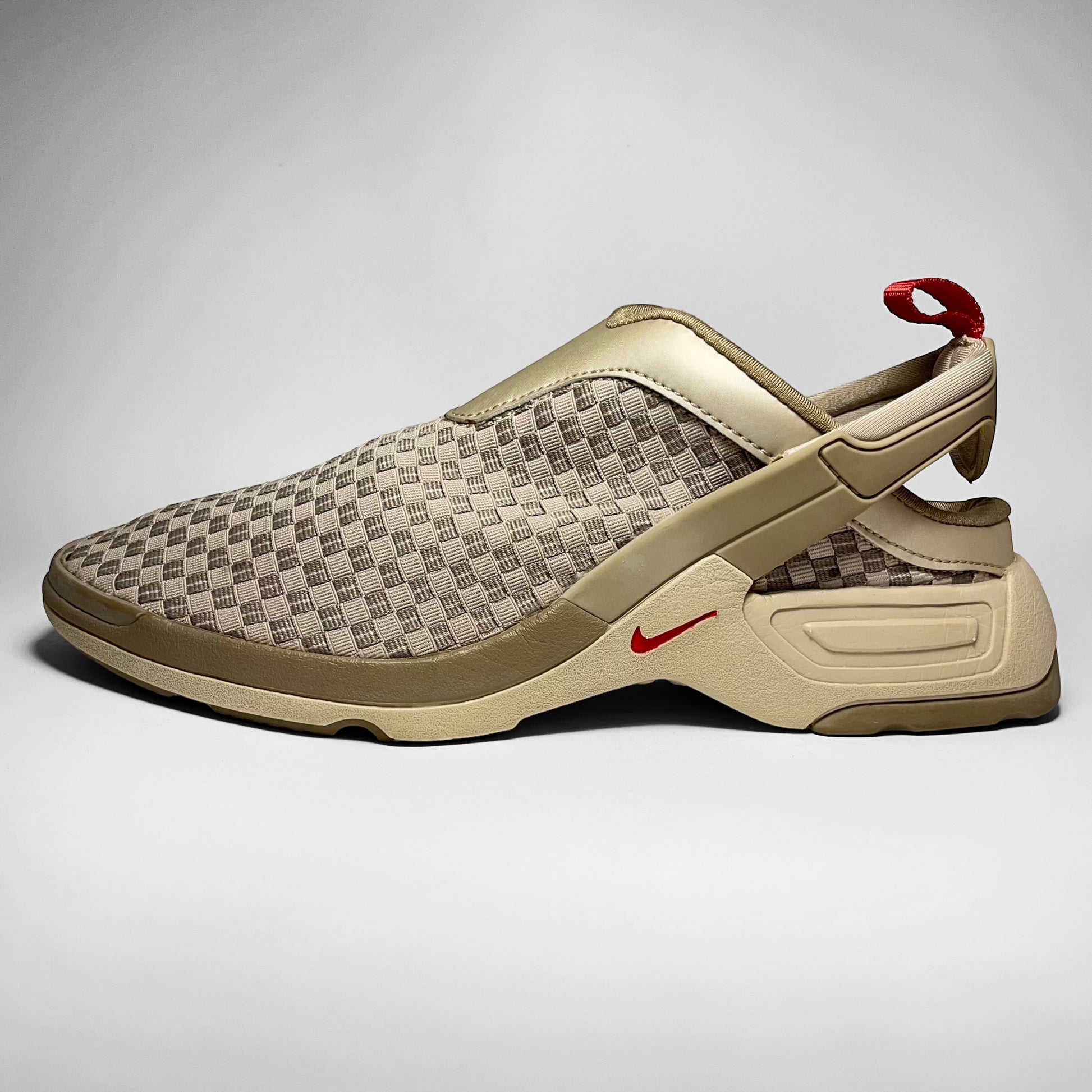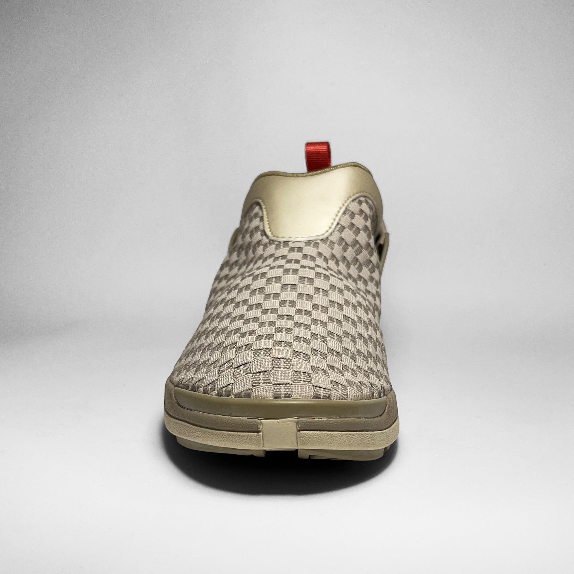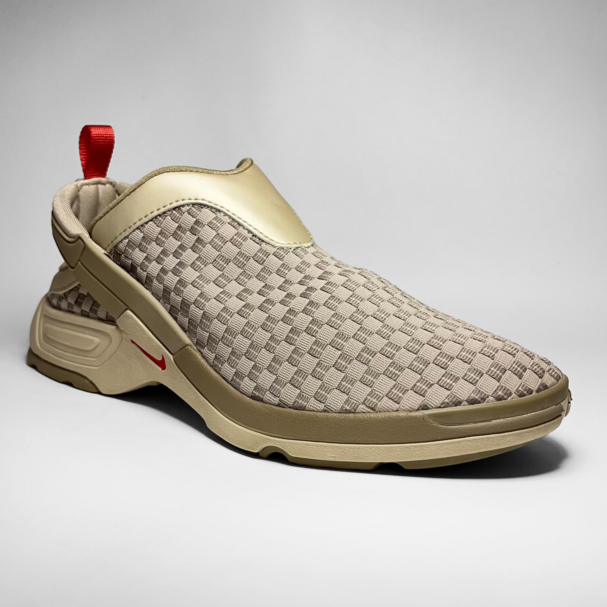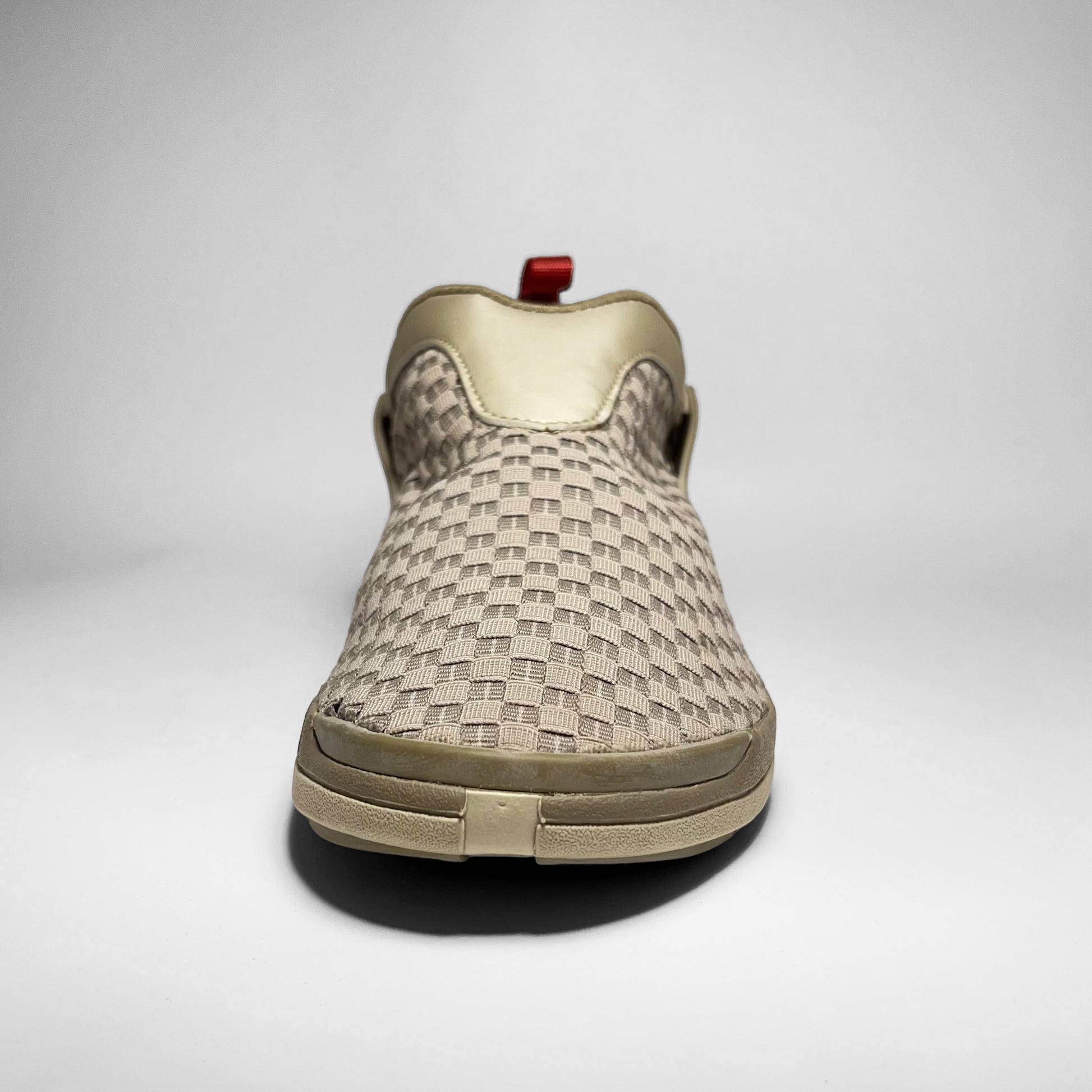 Woven cotton upper in two-toned beige, golden leather sock-collar, rubber heel strap with cushioning for comfort and red heeltab complementing the red embossed mini-swoosh on both midsole sides and outsole.