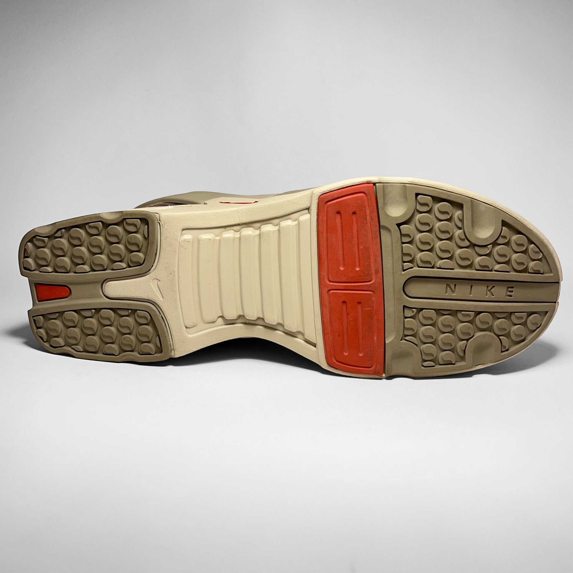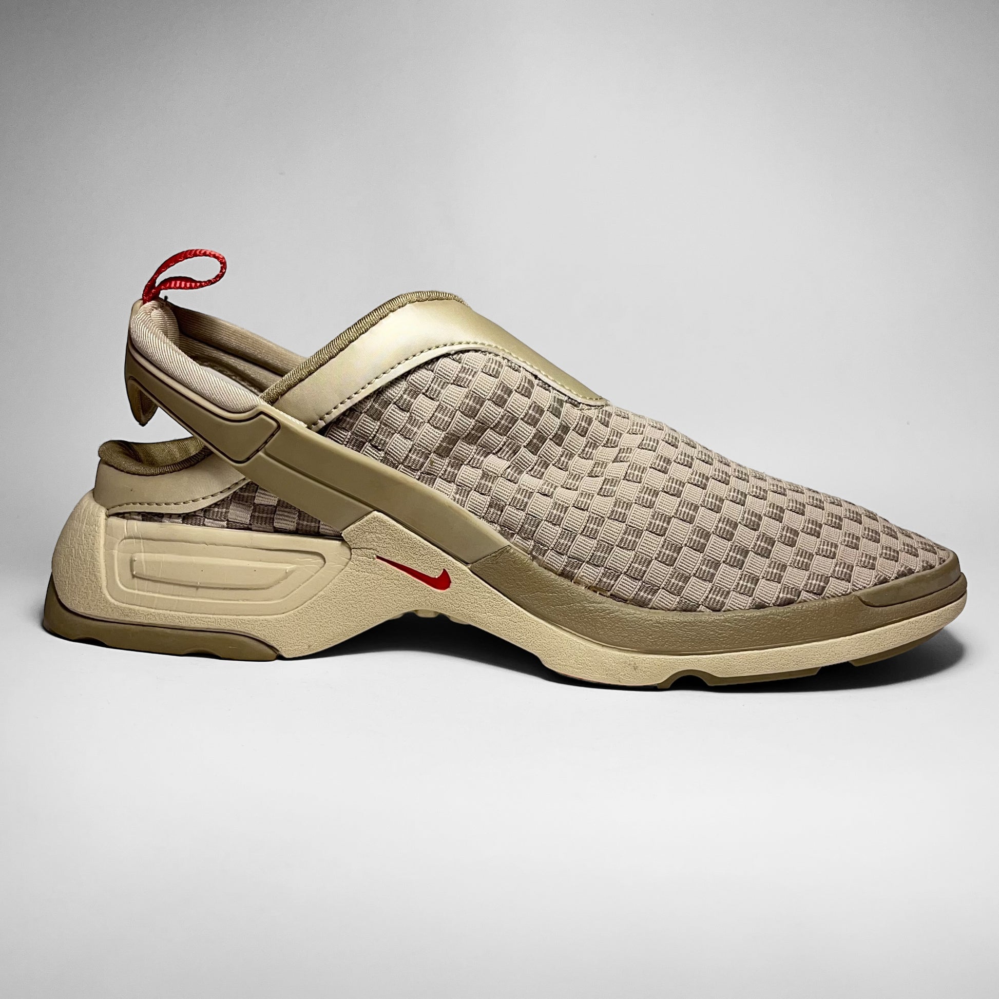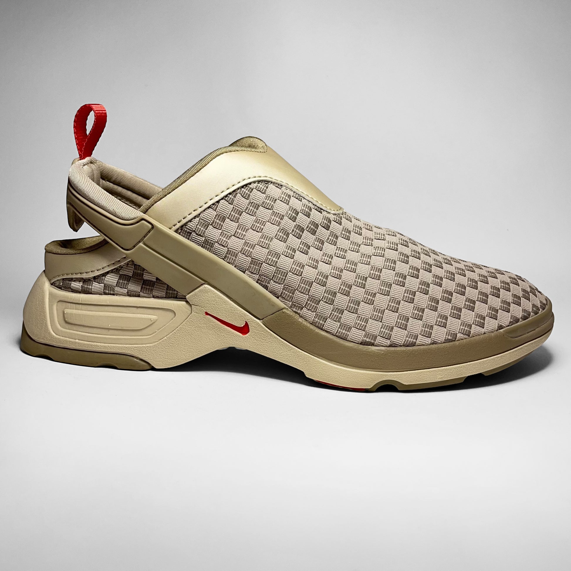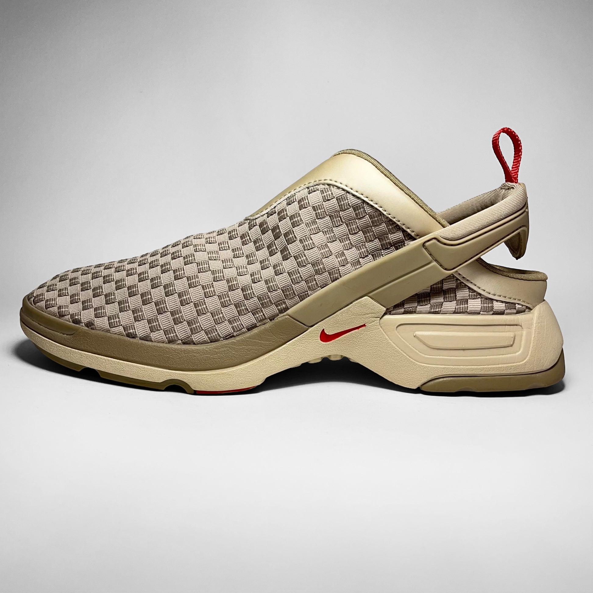 Woven cotton upper in two-toned beige, golden leather sock-collar, rubber heel strap with cushioning for comfort and red heeltab complementing the red embossed mini-swoosh on both midsole sides and outsole.