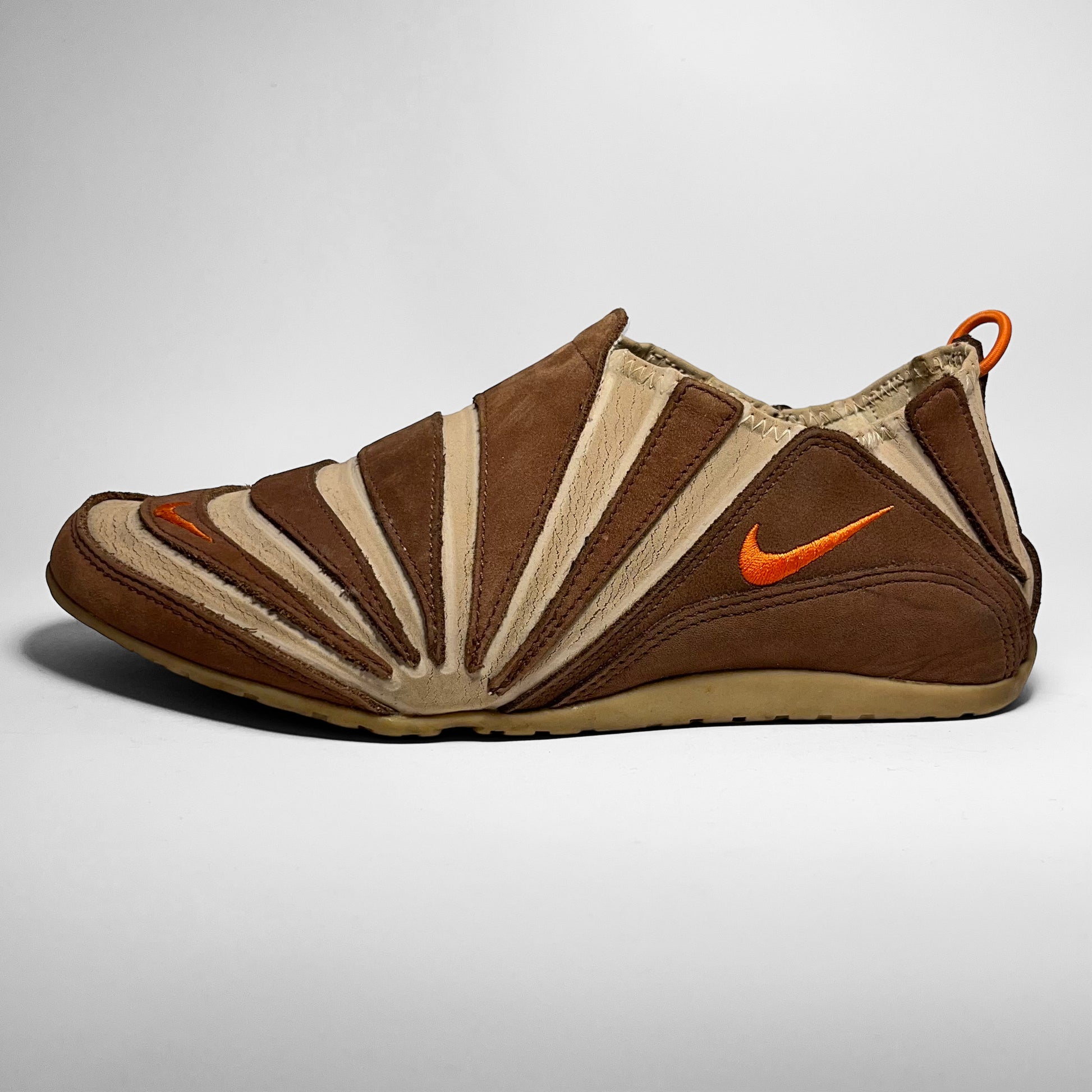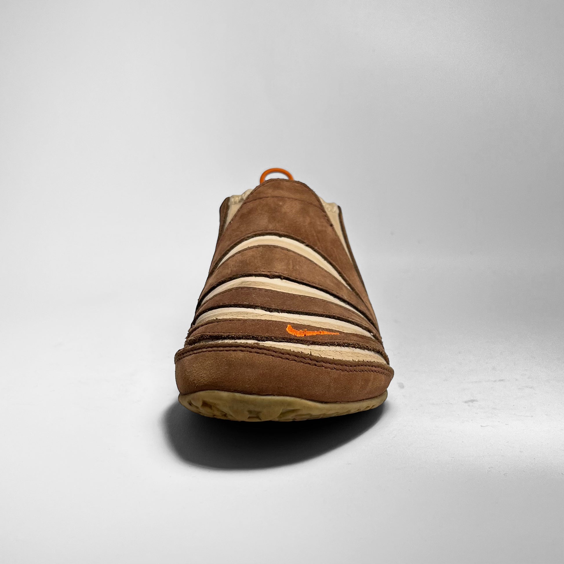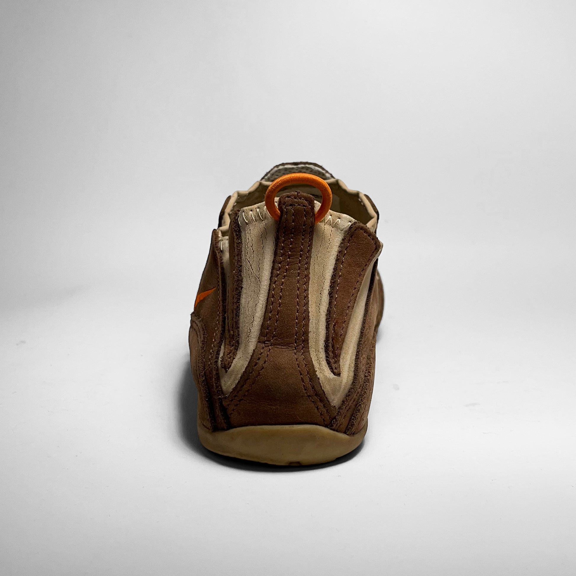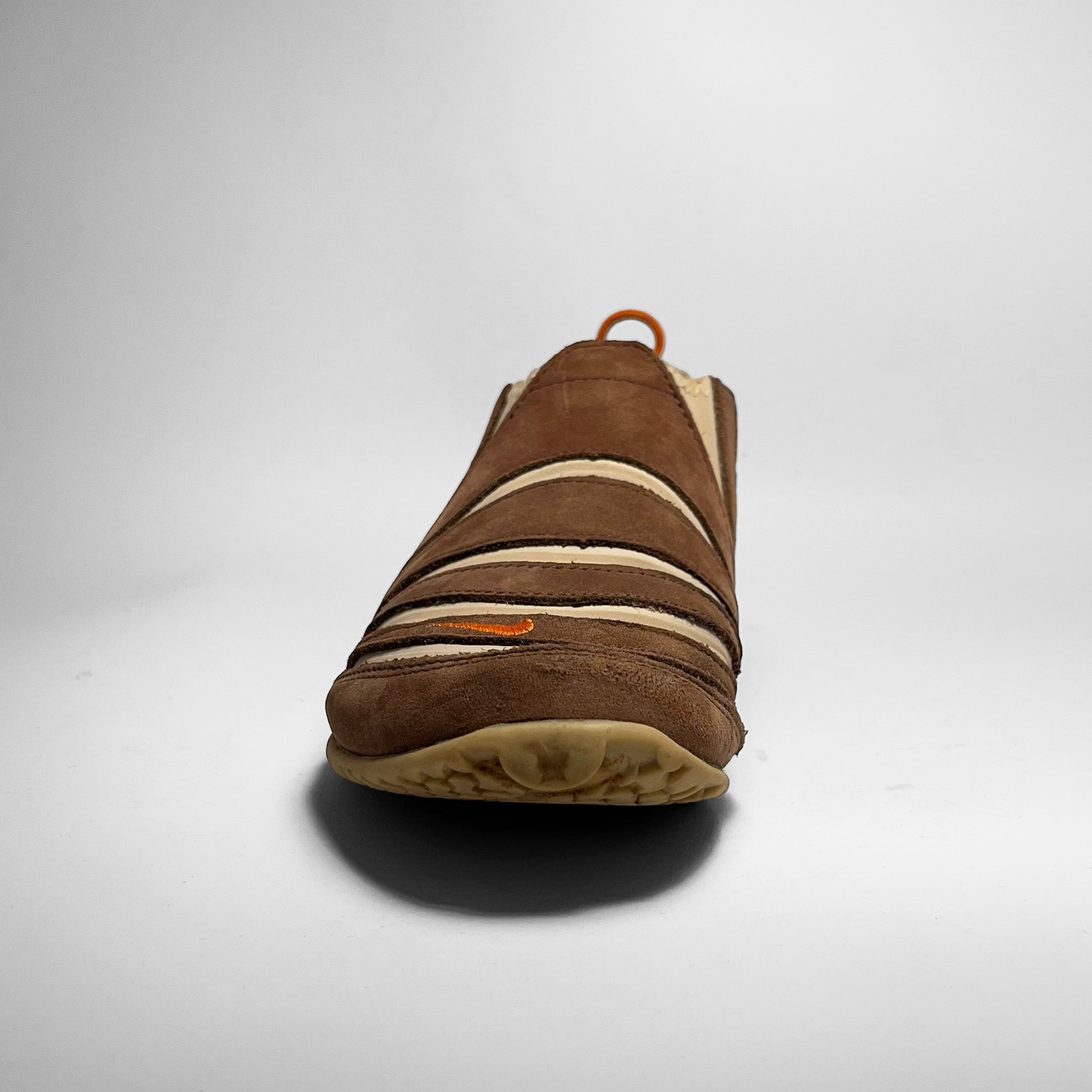 Stretch- and foldable leather upper combined with brown suede panels, orange details such as pull-tab, embroidered swoosh placements and branding on outsole. The gripped outsole has a hook, which holds the pull-tab in place, so your shoes can be folded and easily carried along. Made for the nomads.
