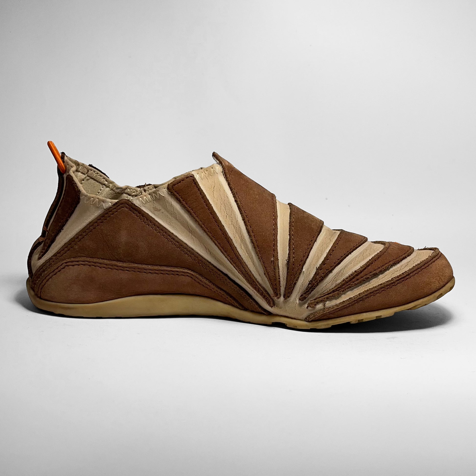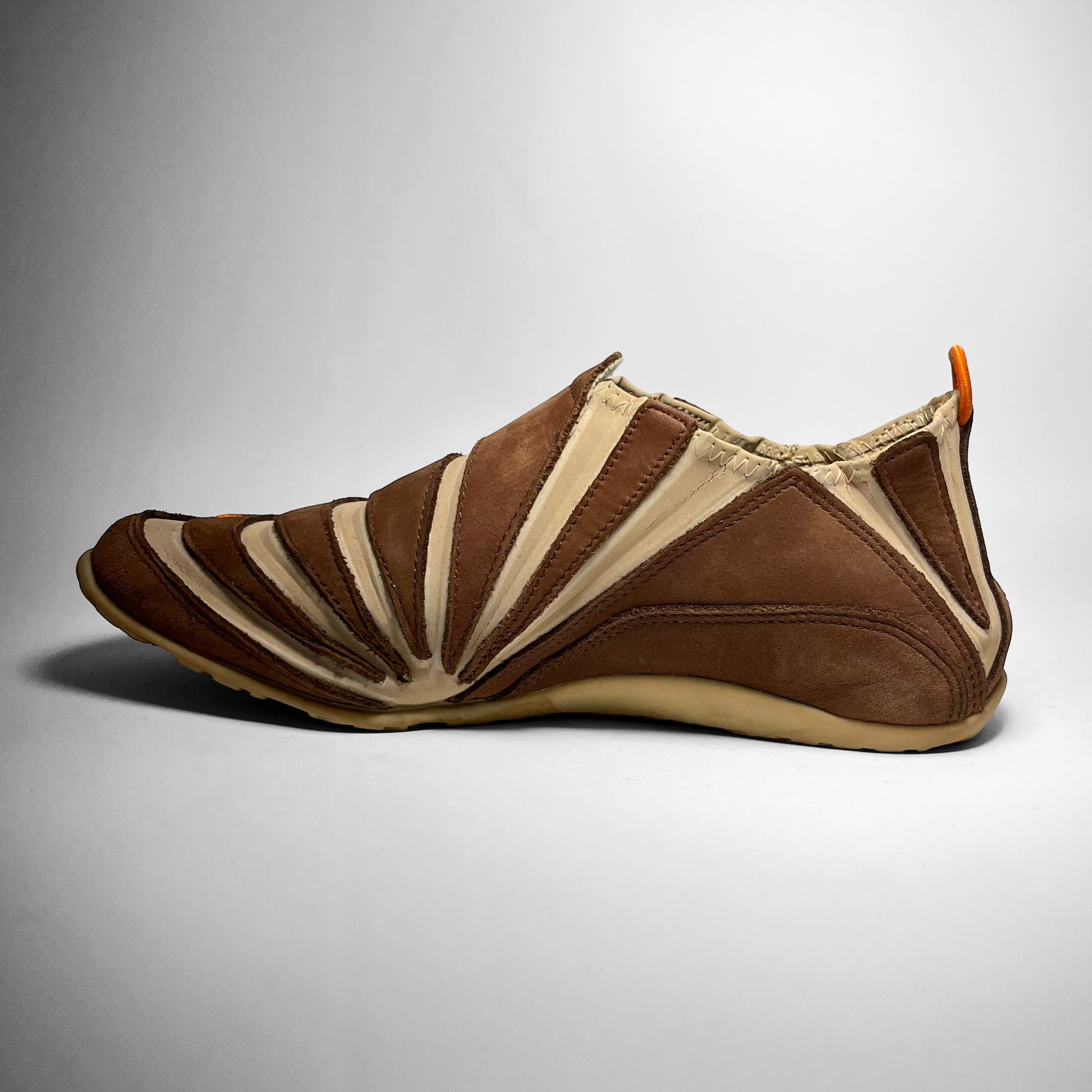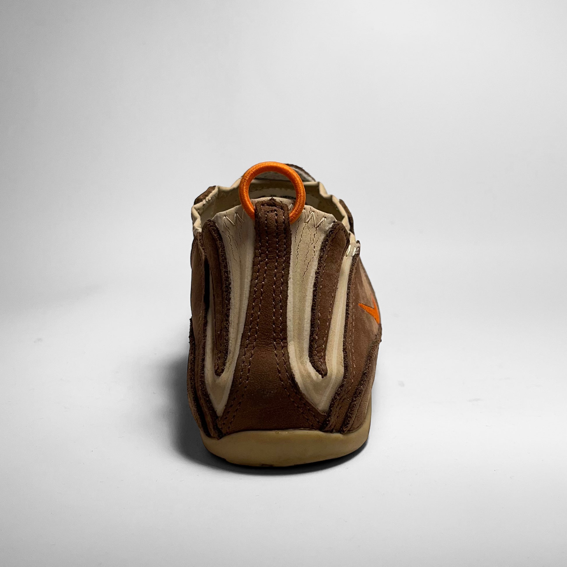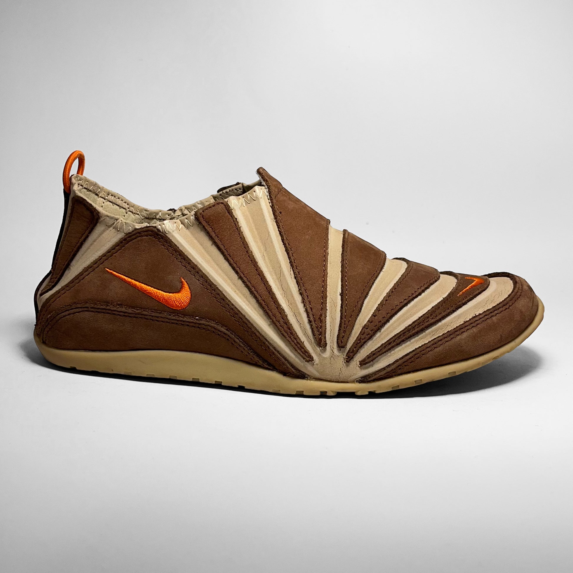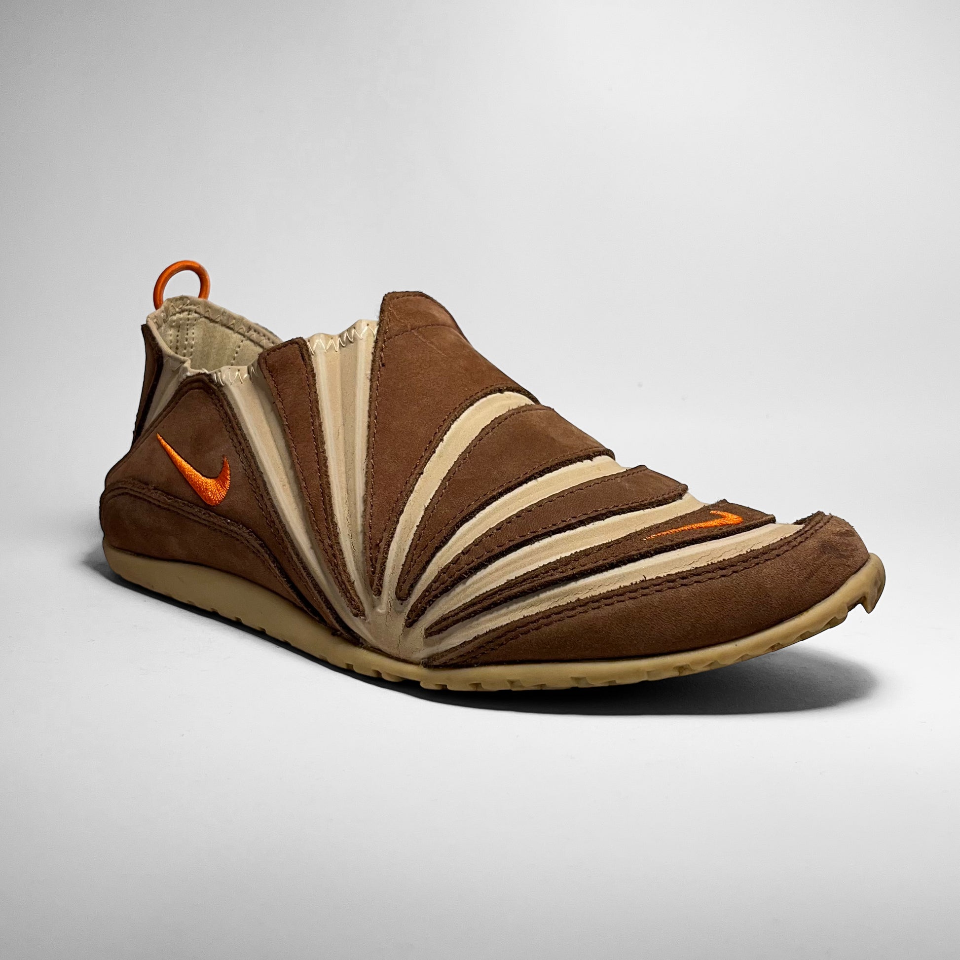 Stretch- and foldable leather upper combined with brown suede panels, orange details such as pull-tab, embroidered swoosh placements and branding on outsole. The gripped outsole has a hook, which holds the pull-tab in place, so your shoes can be folded and easily carried along. Made for the nomads.