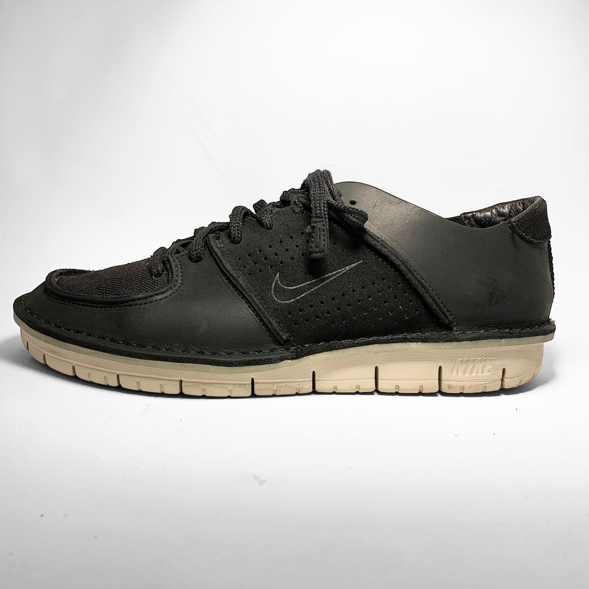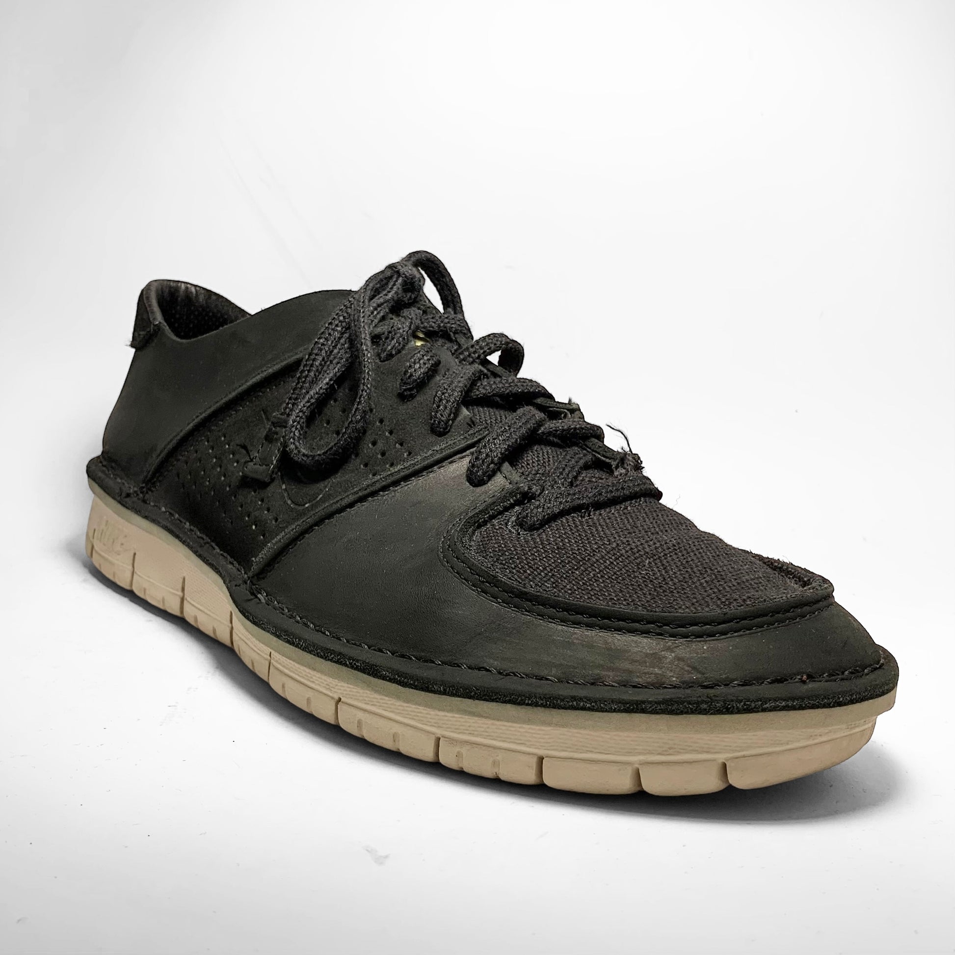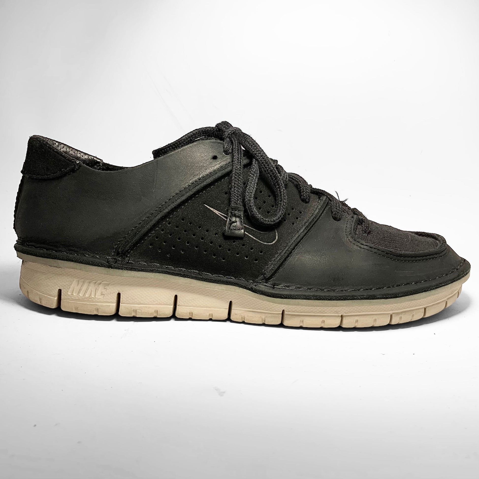 Black leather upper with perforated side panel and embossed swoosh, stitching throughout keeping all panels together as well as the sole together with a canvas toebox and tongue.