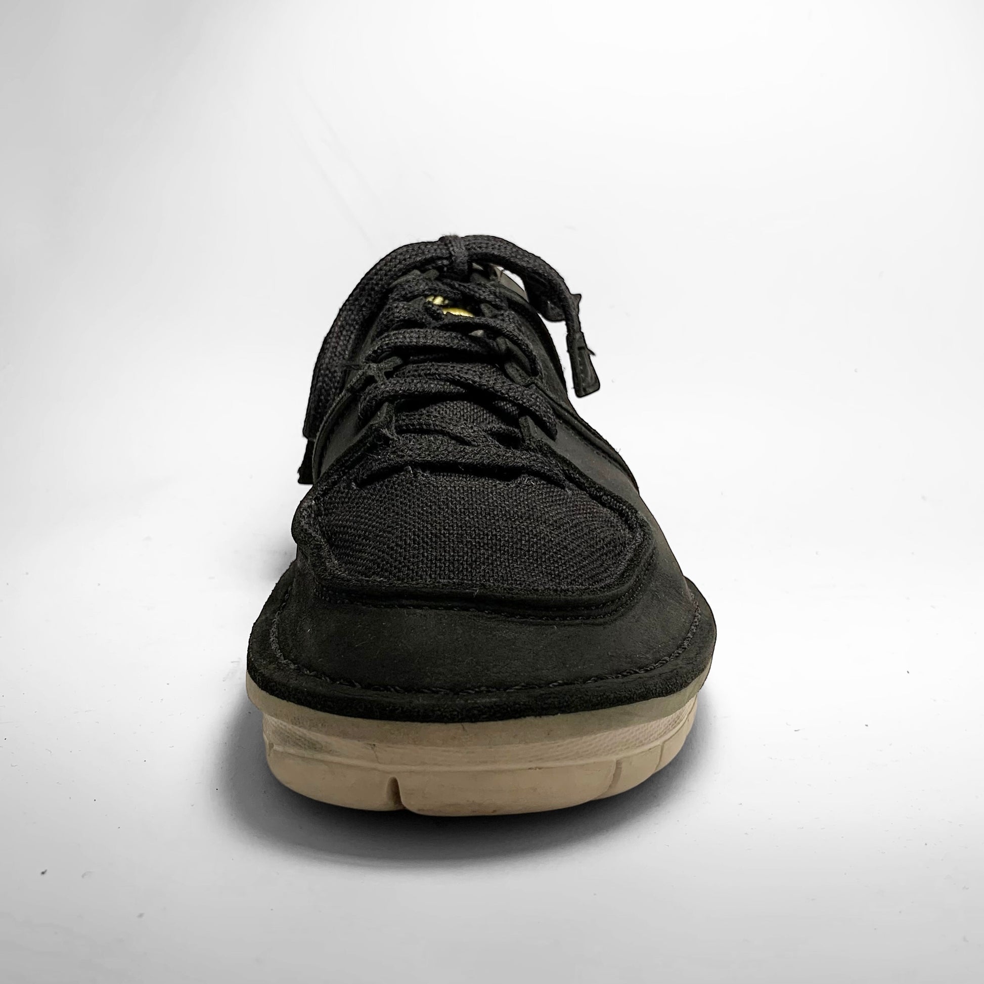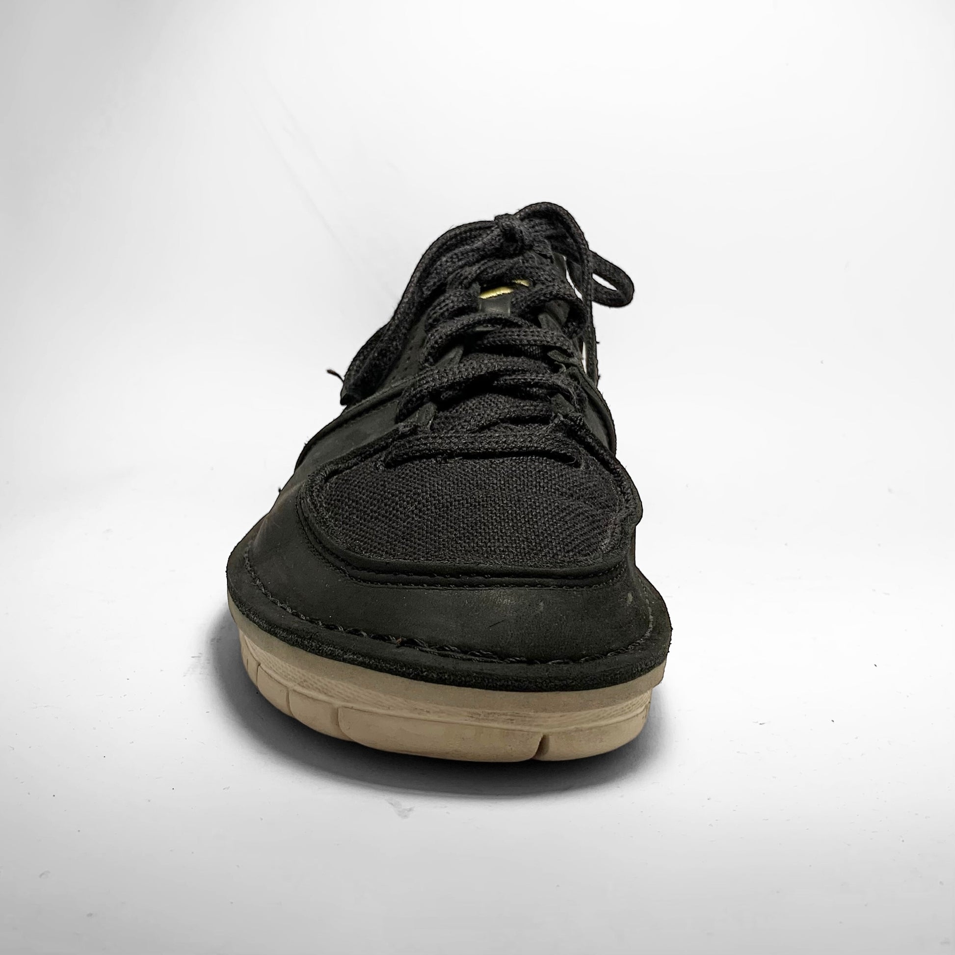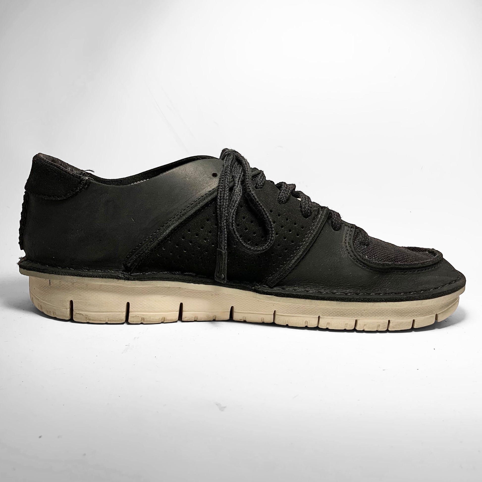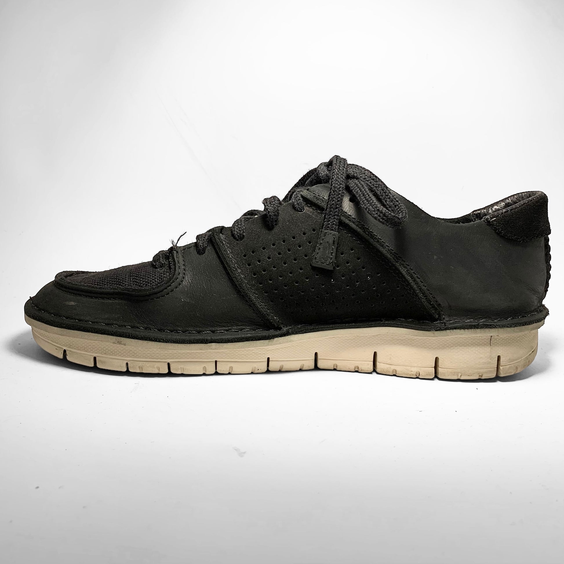 Black leather upper with perforated side panel and embossed swoosh, stitching throughout keeping all panels together as well as the sole together with a canvas toebox and tongue.