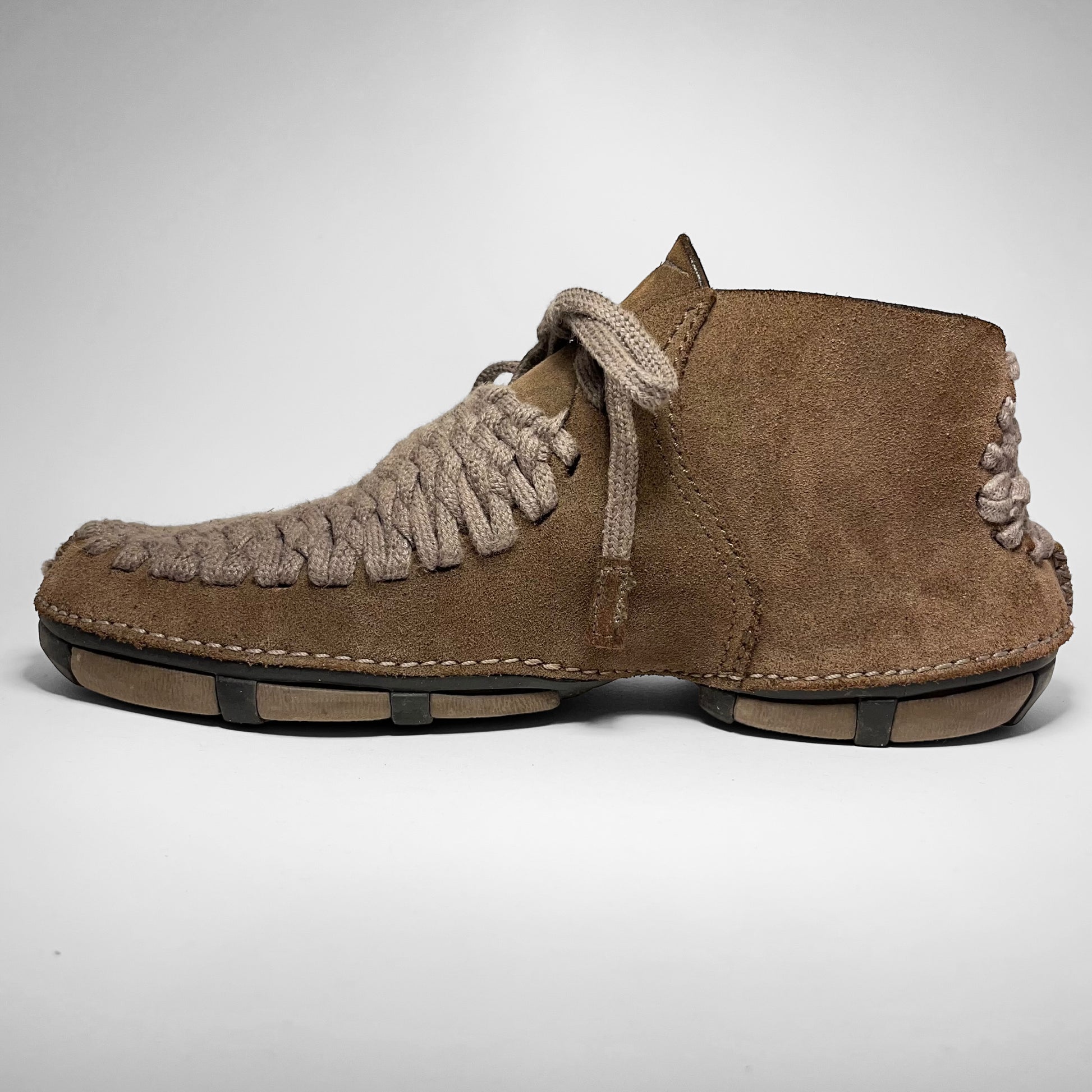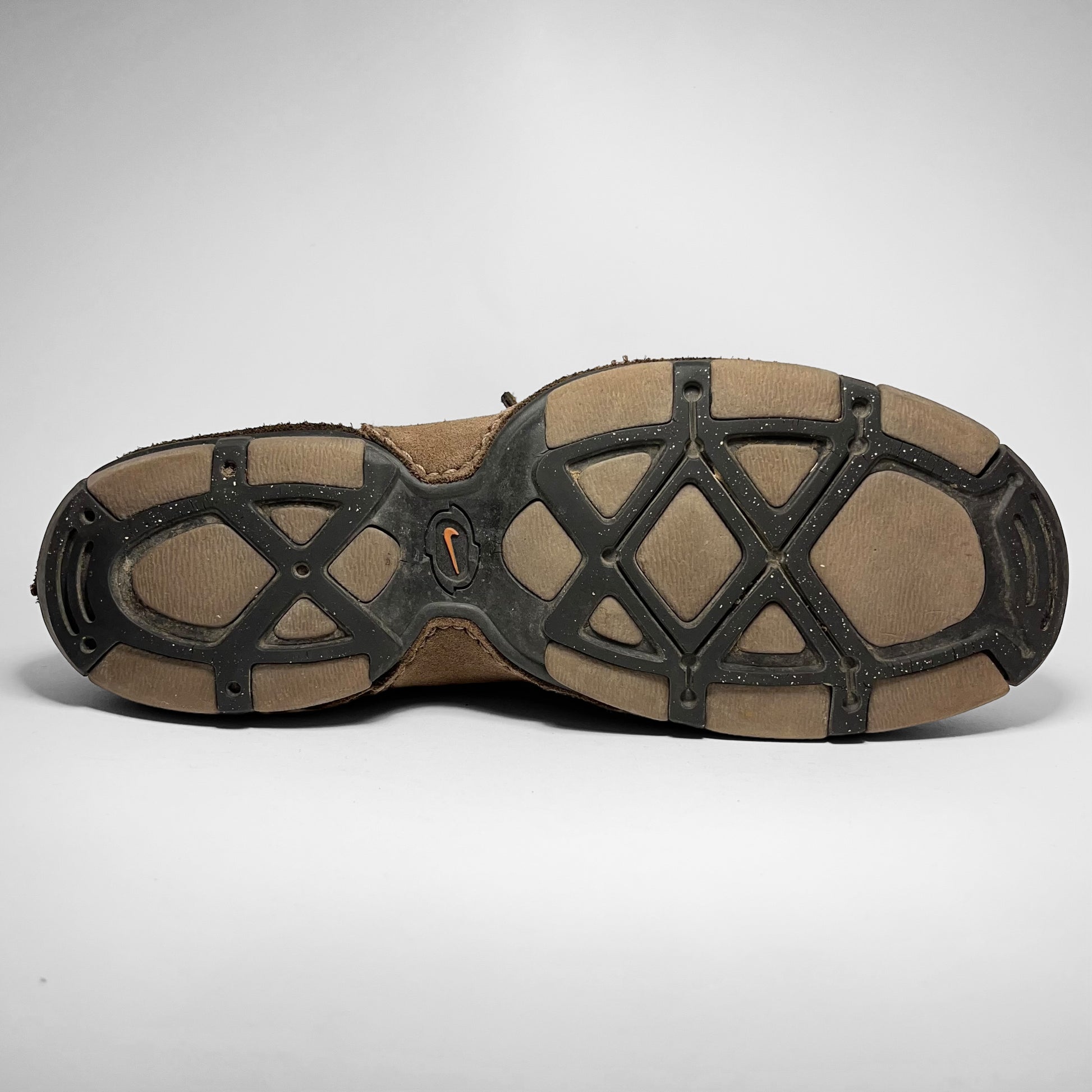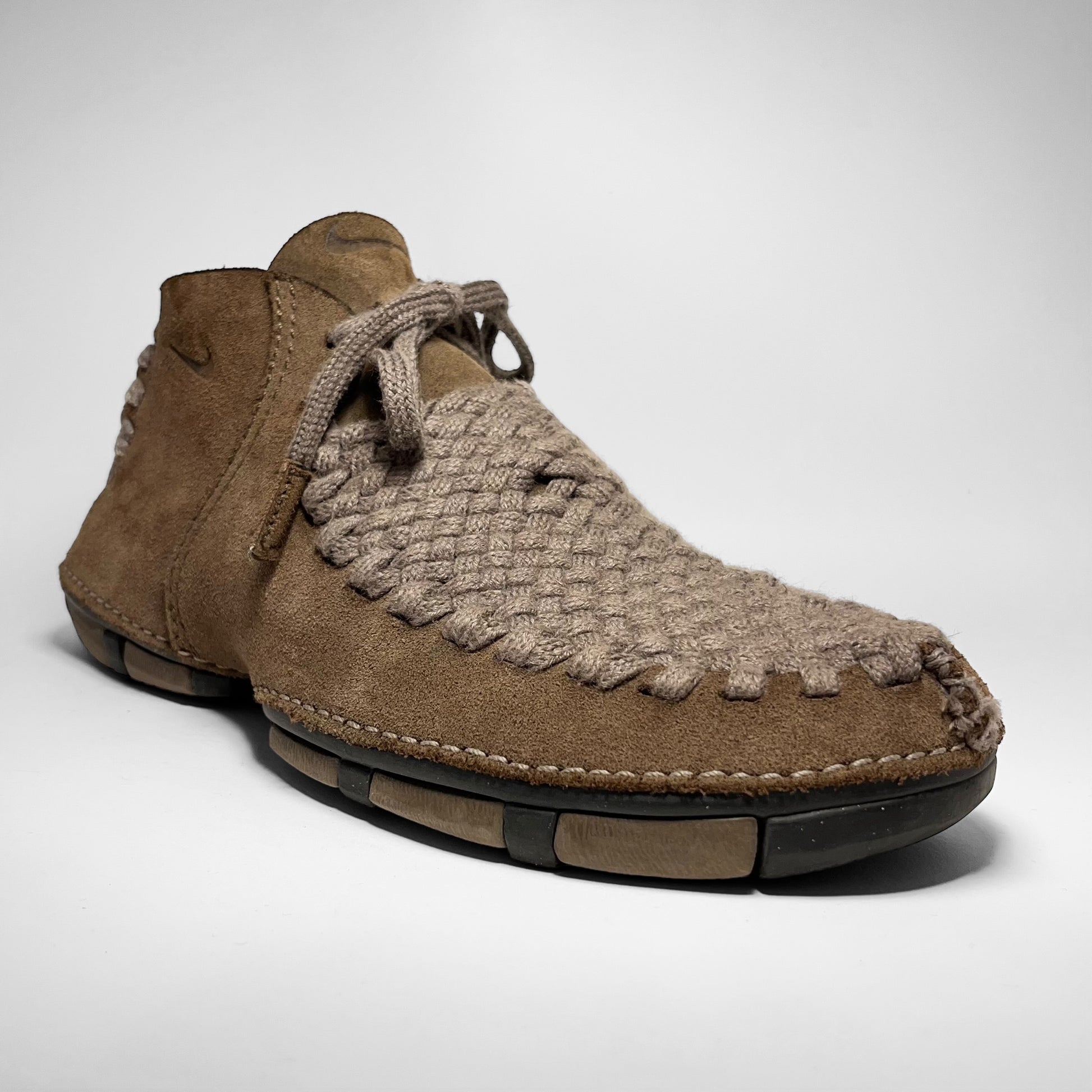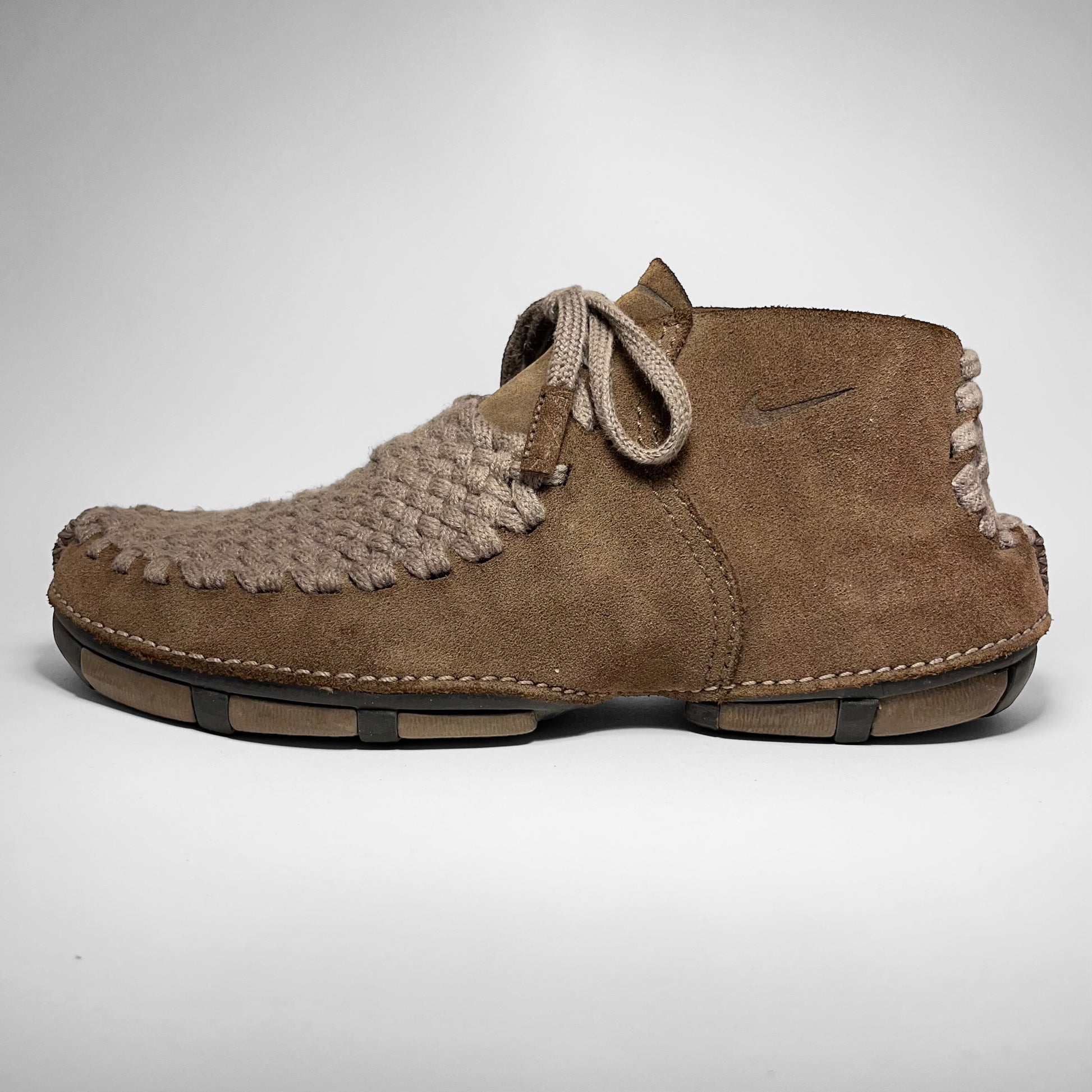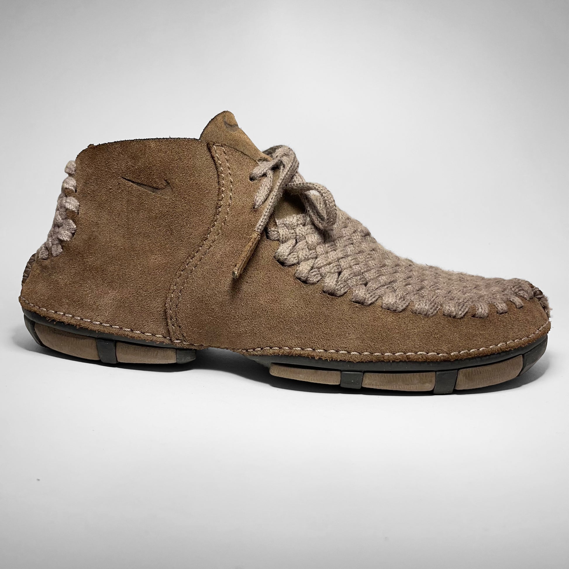 High top considered boot constructed from a brown suede upper and woven structure on the top and heel part with embossed swoosh branding on the outer-side and tongue.