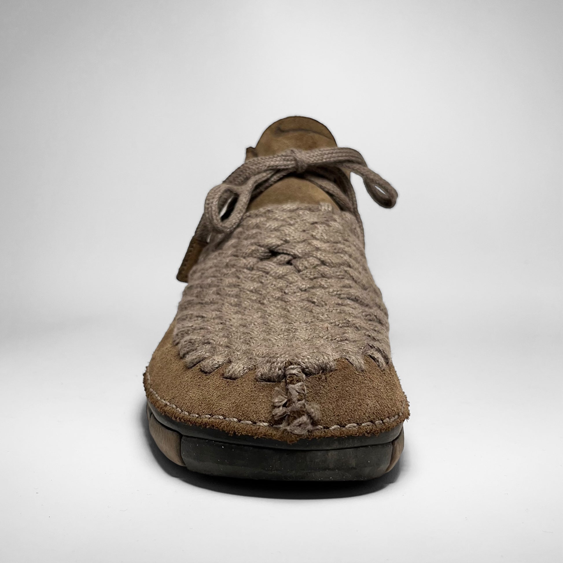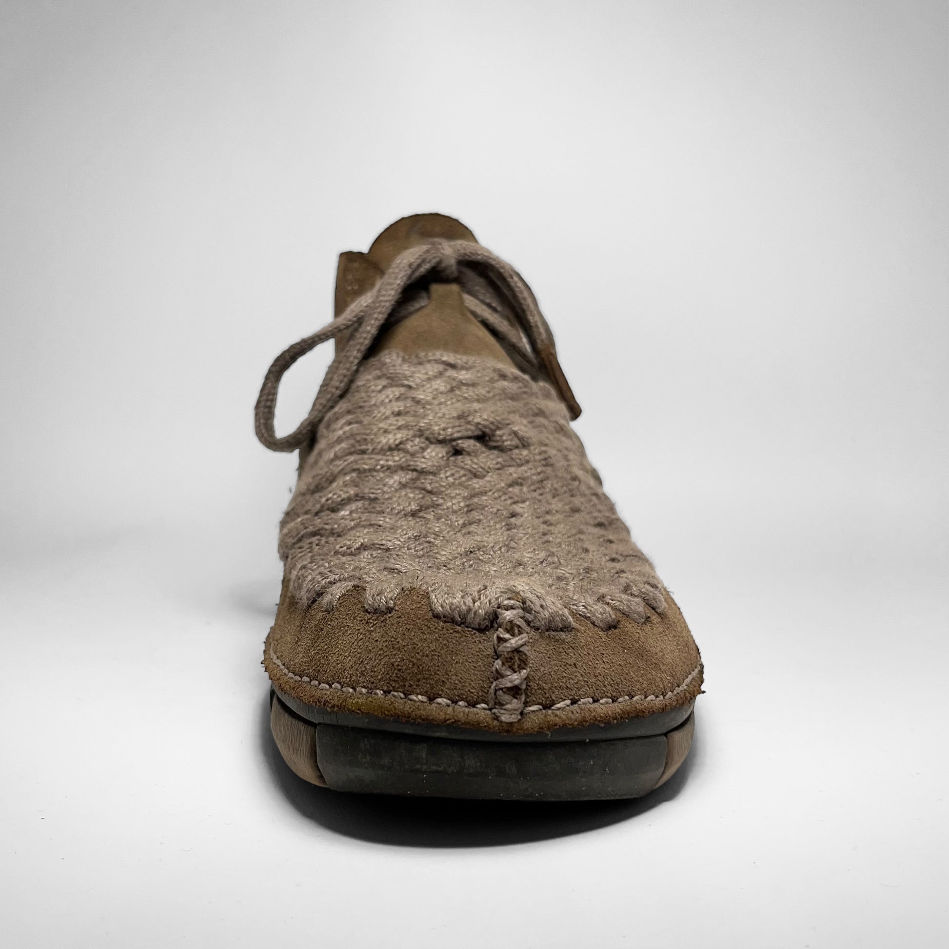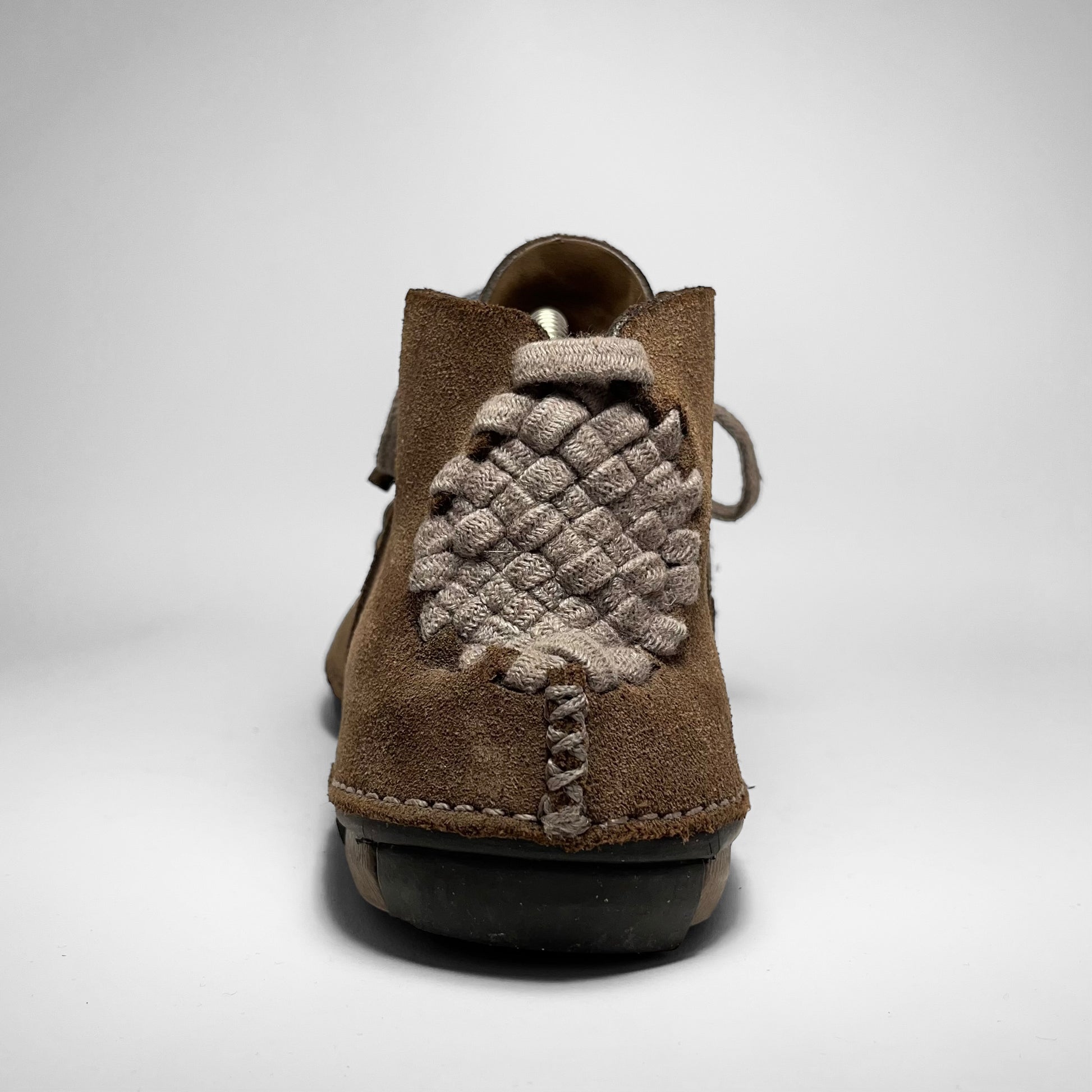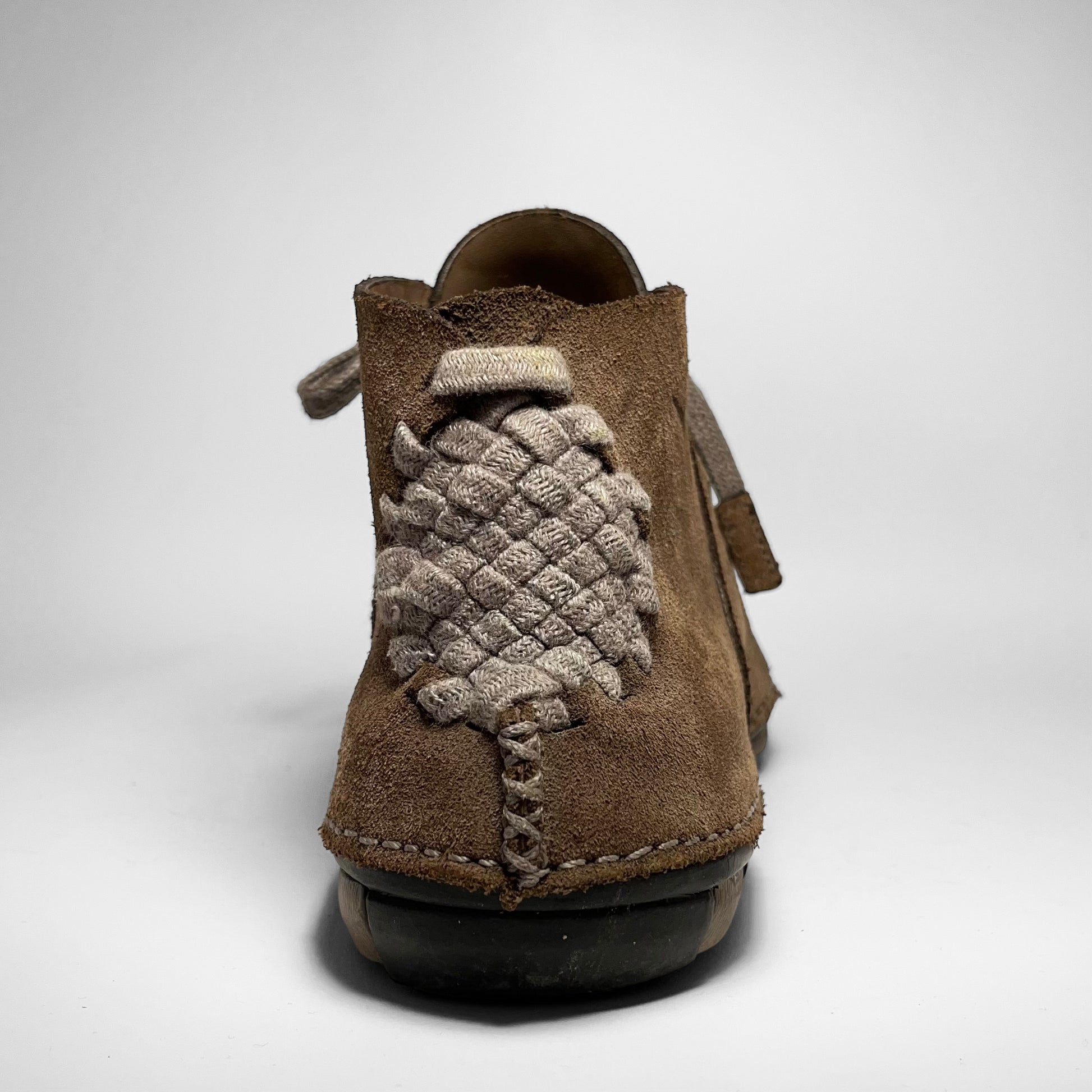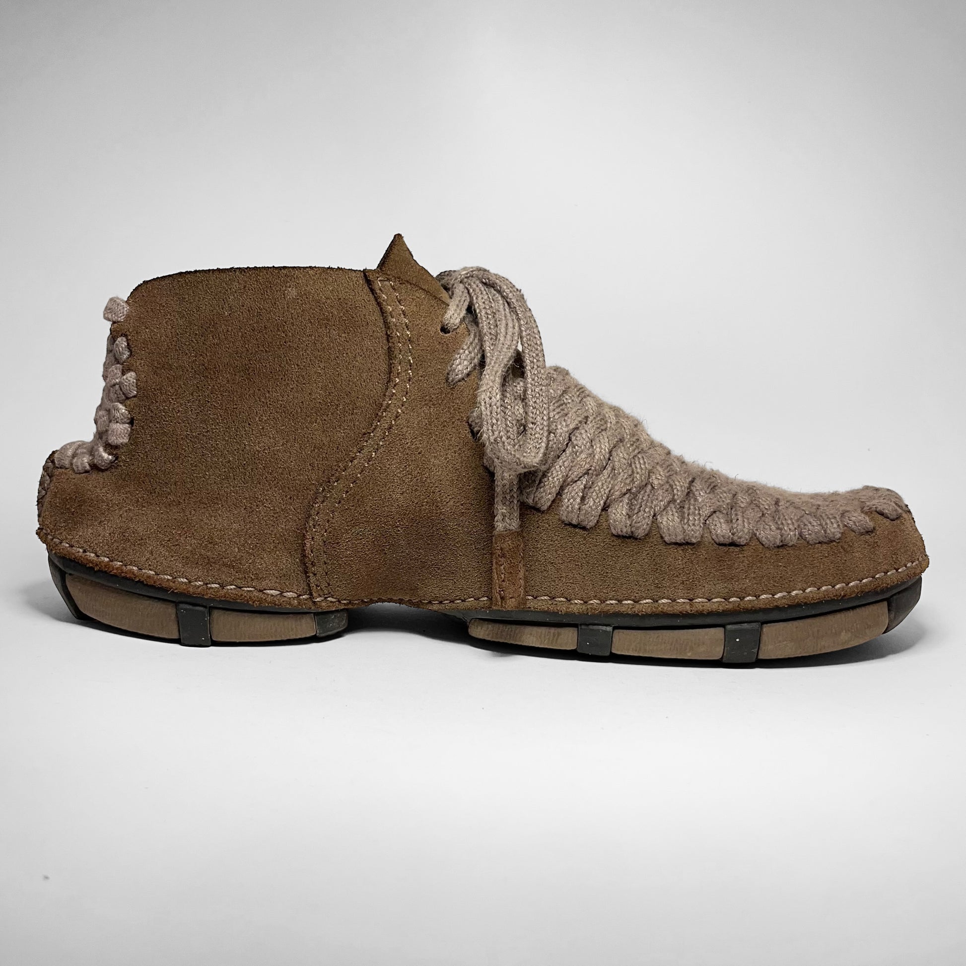 High top considered boot constructed from a brown suede upper and woven structure on the top and heel part with embossed swoosh branding on the outer-side and tongue.