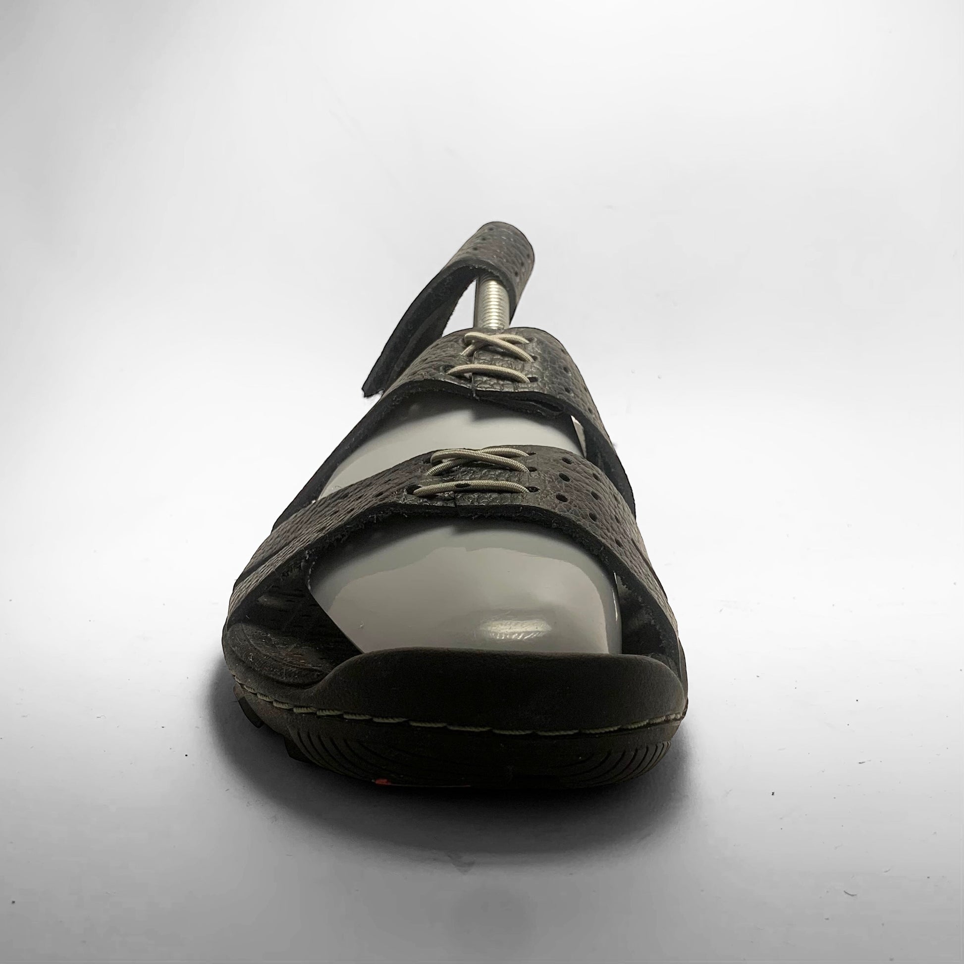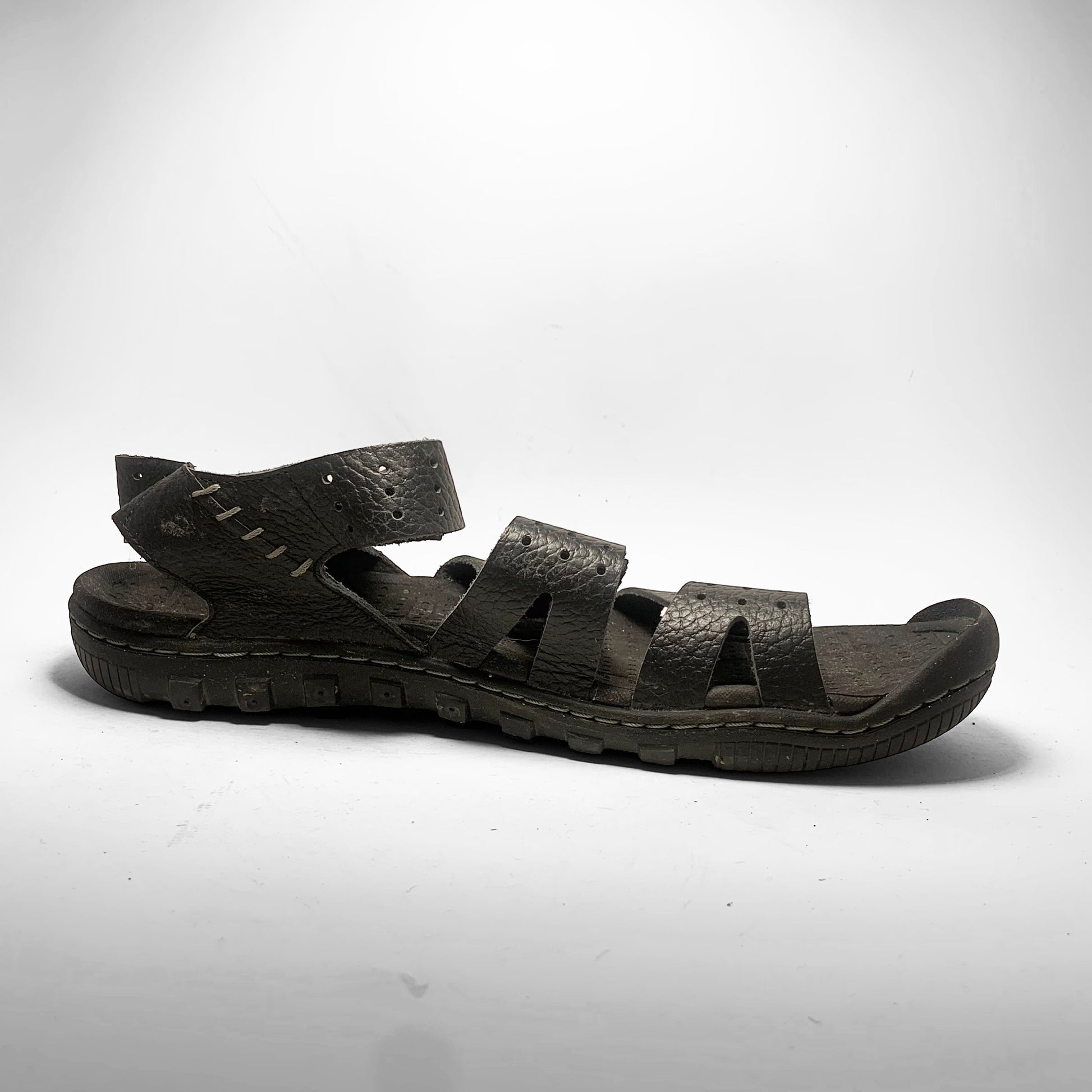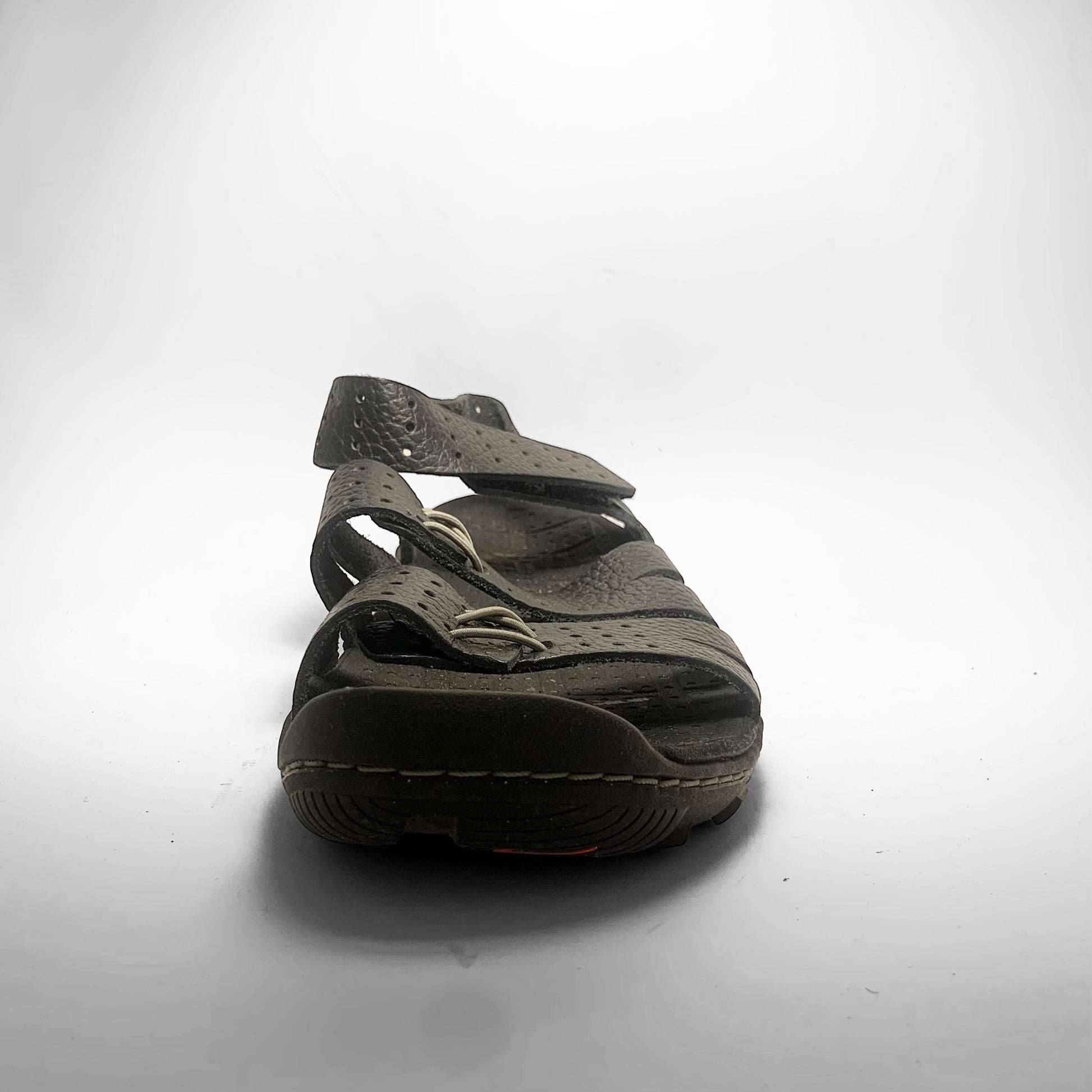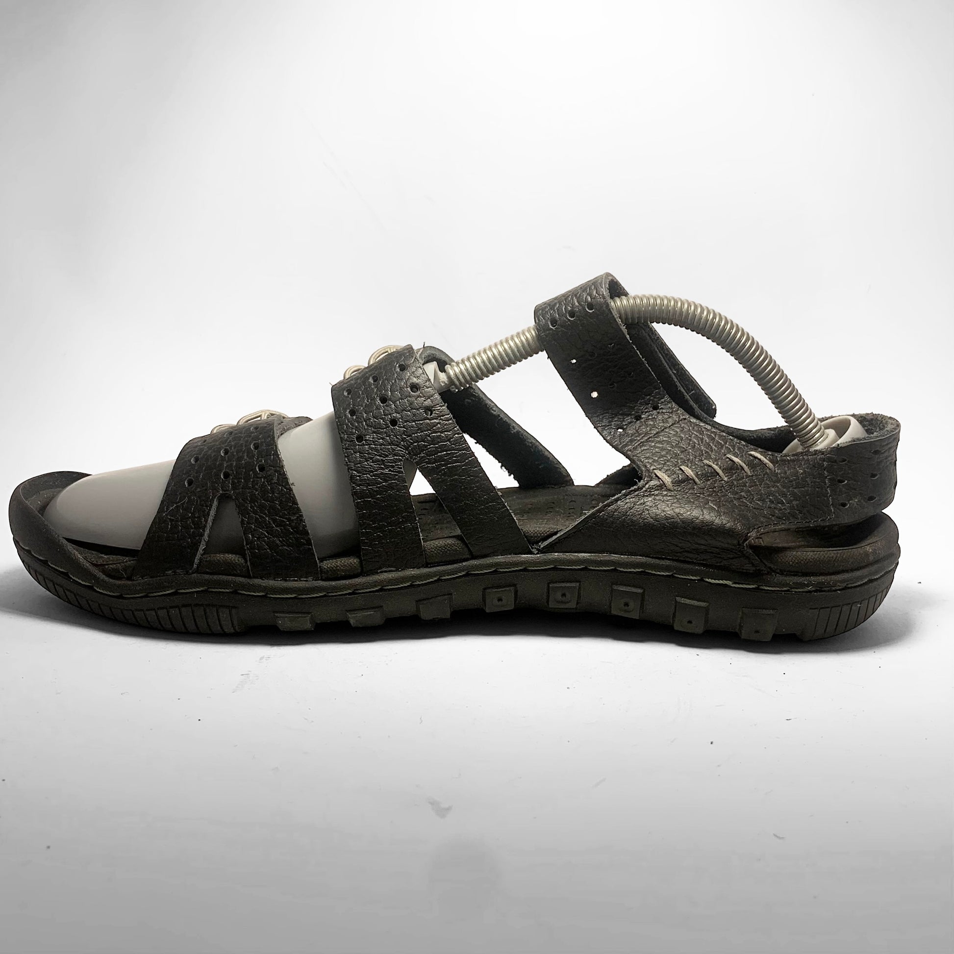 Leather straps stitched together with elastic cords and perforated details connecting to the rubber footbed.