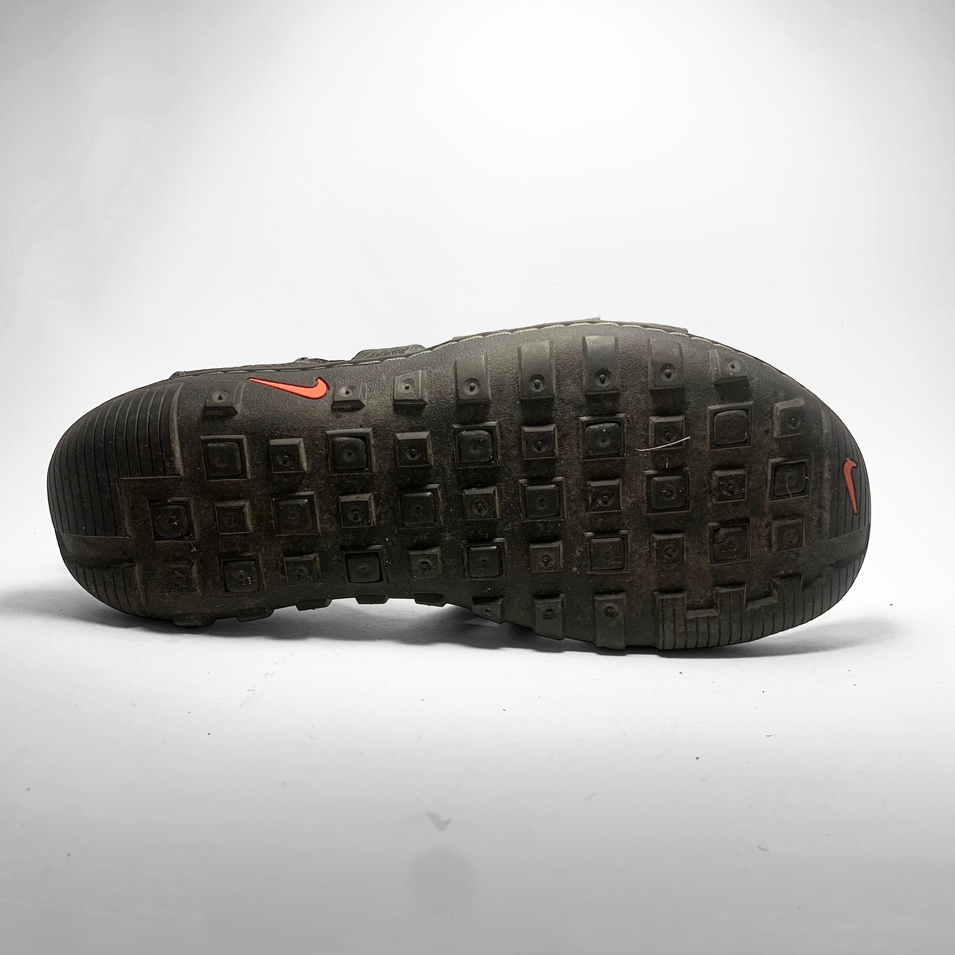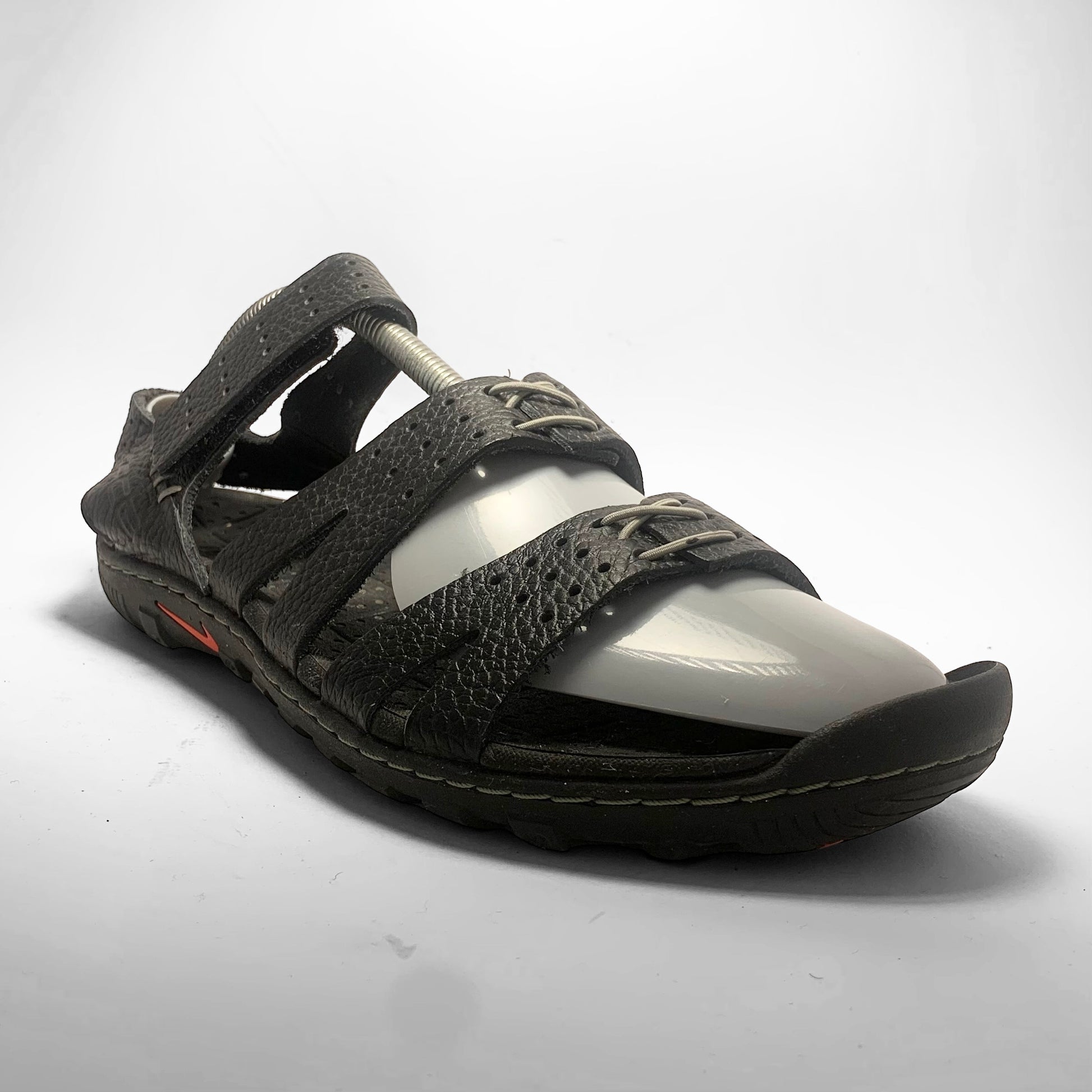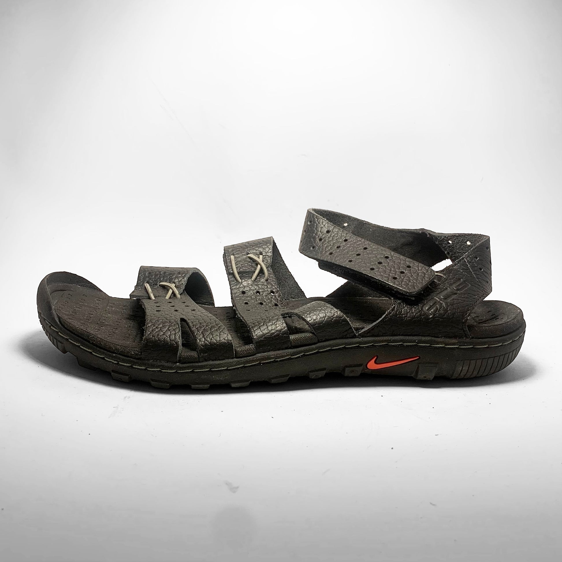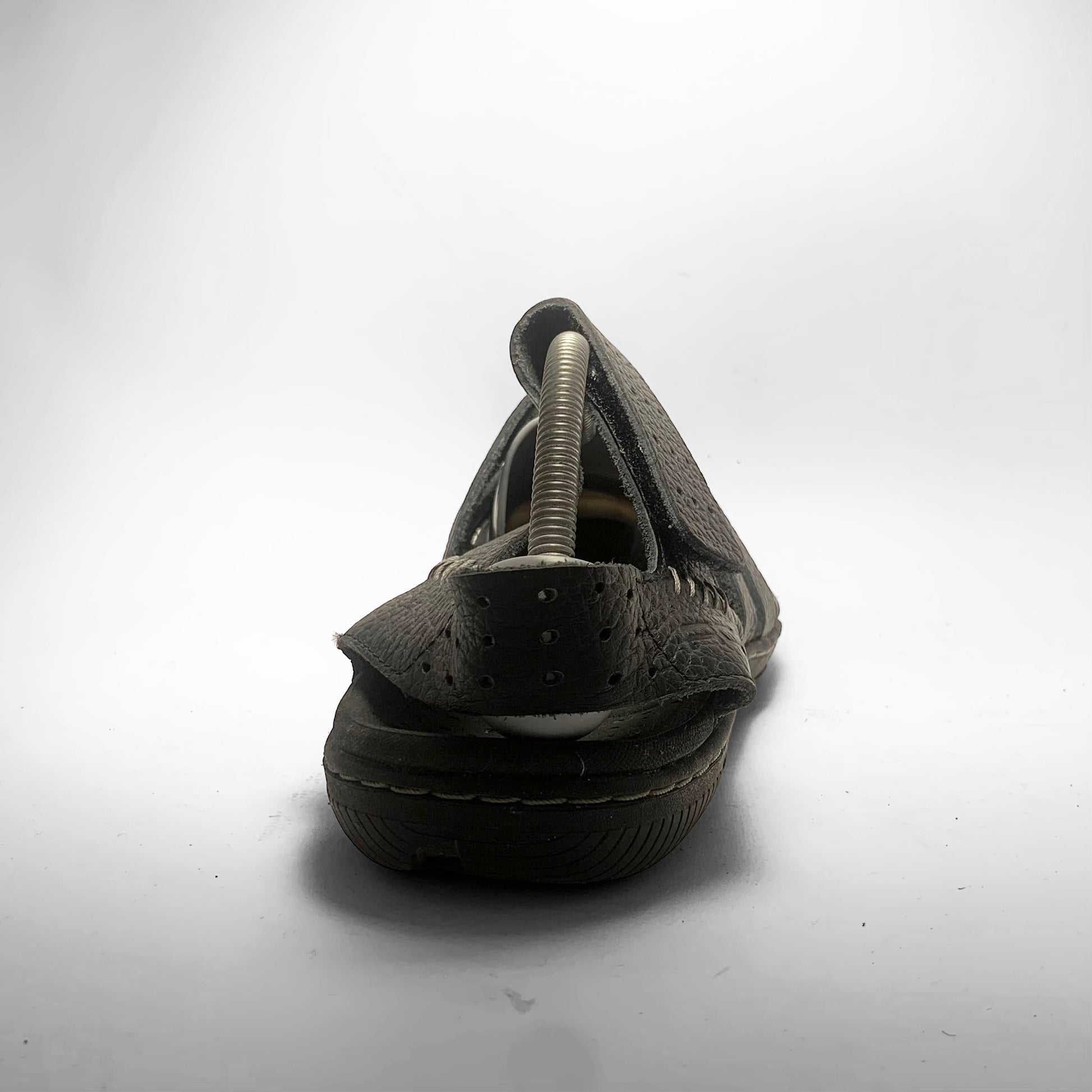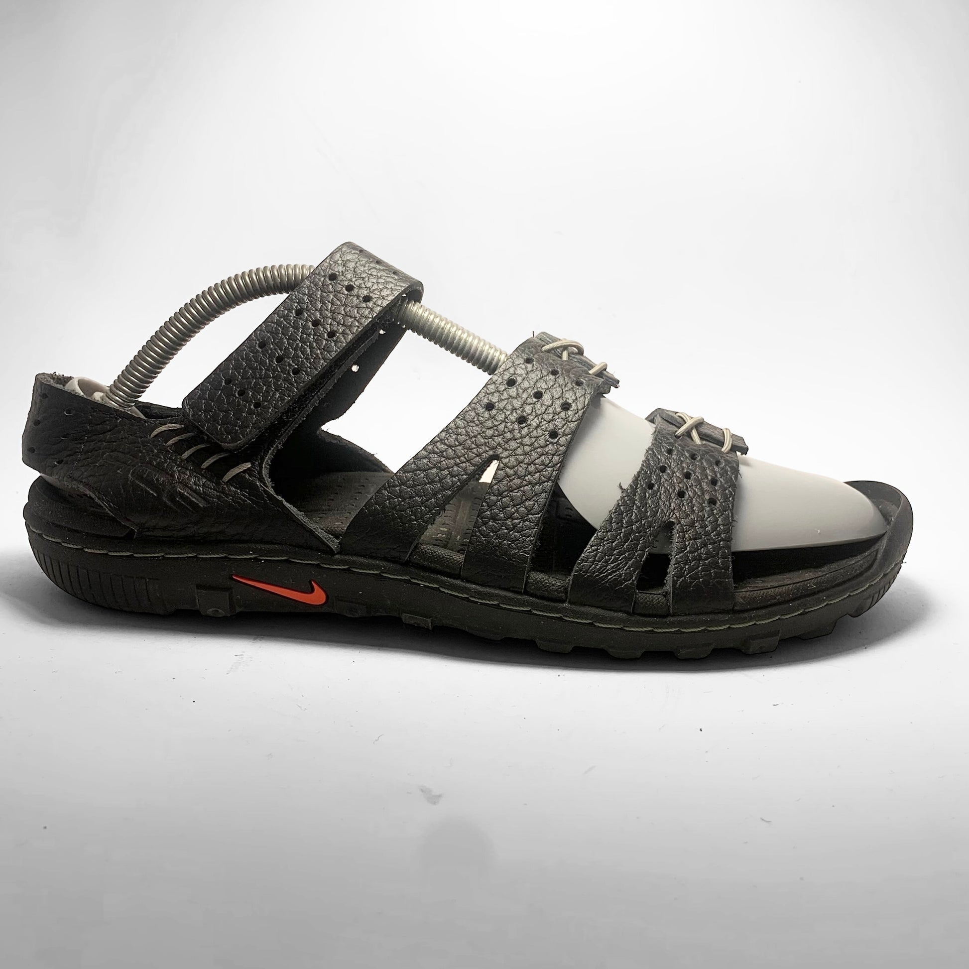 Leather straps stitched together with elastic cords and perforated details connecting to the rubber footbed.