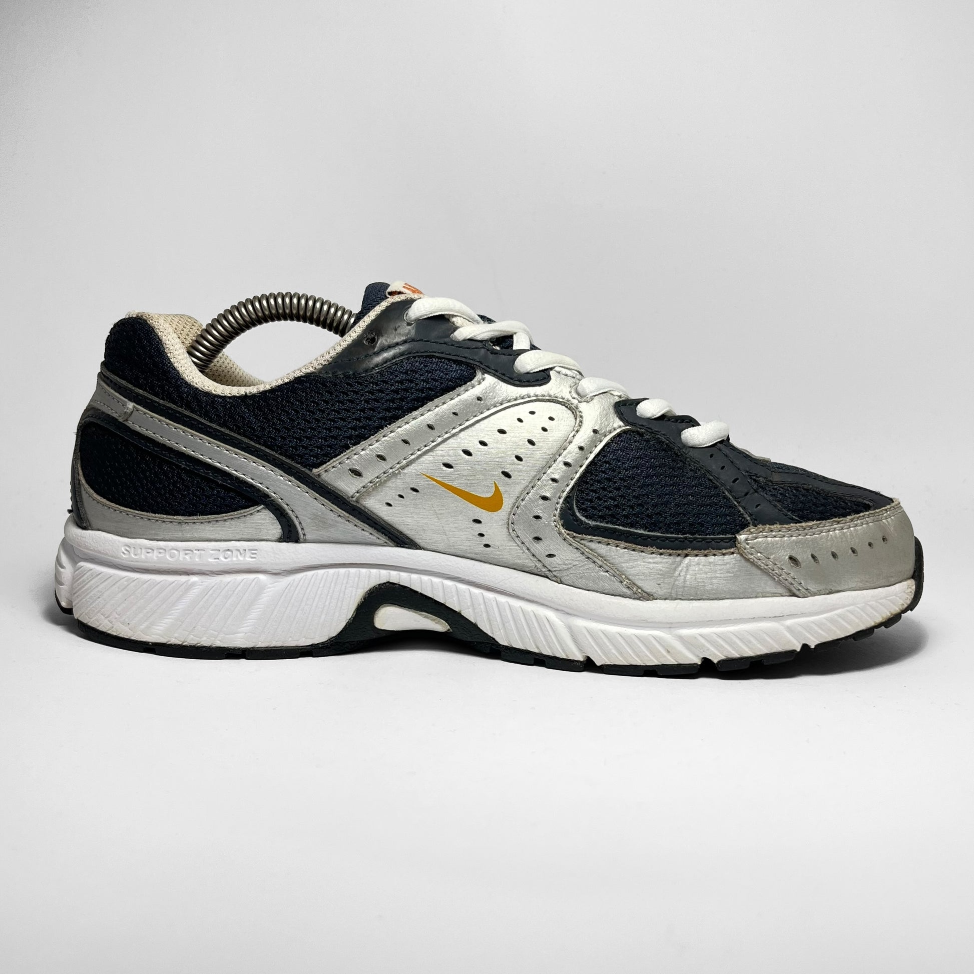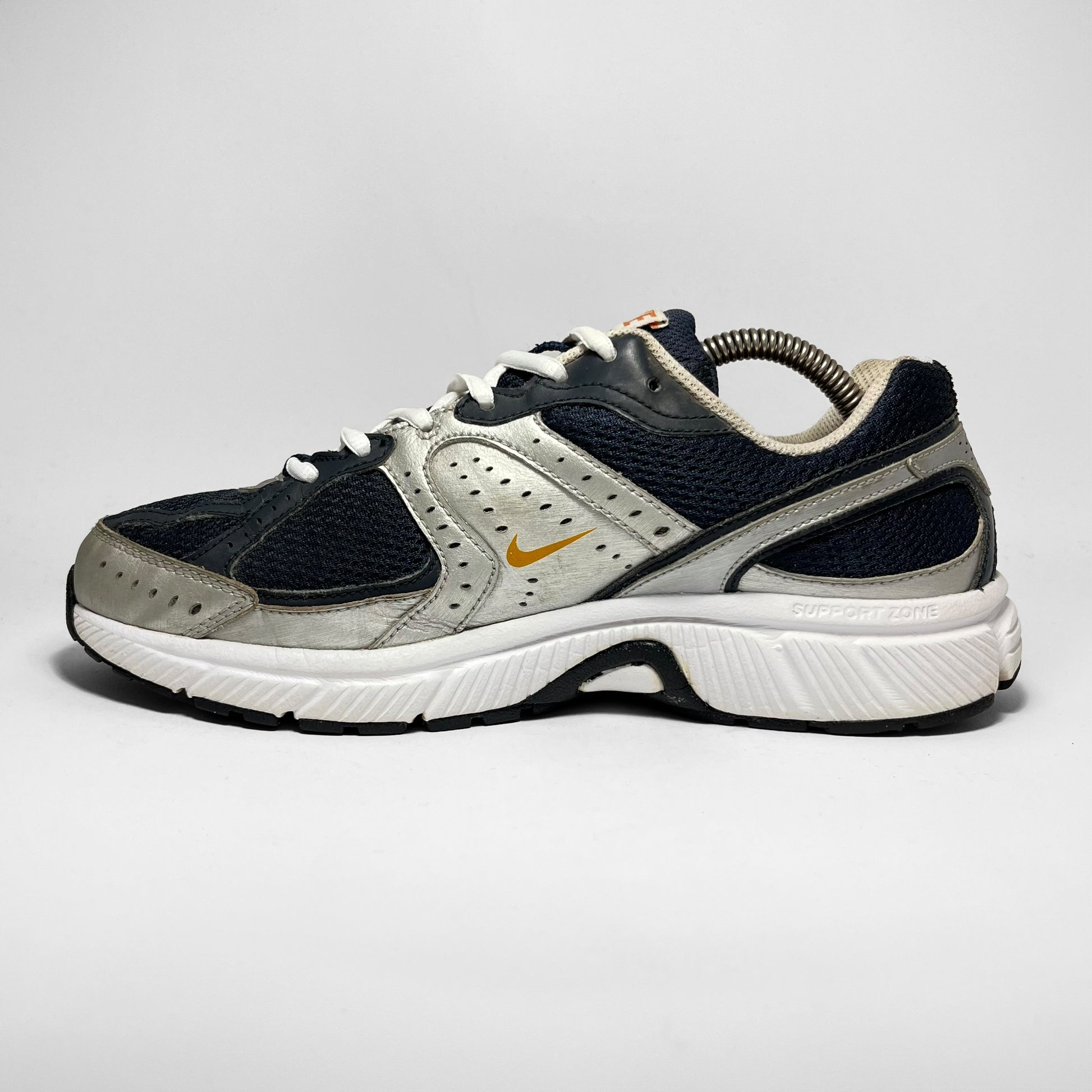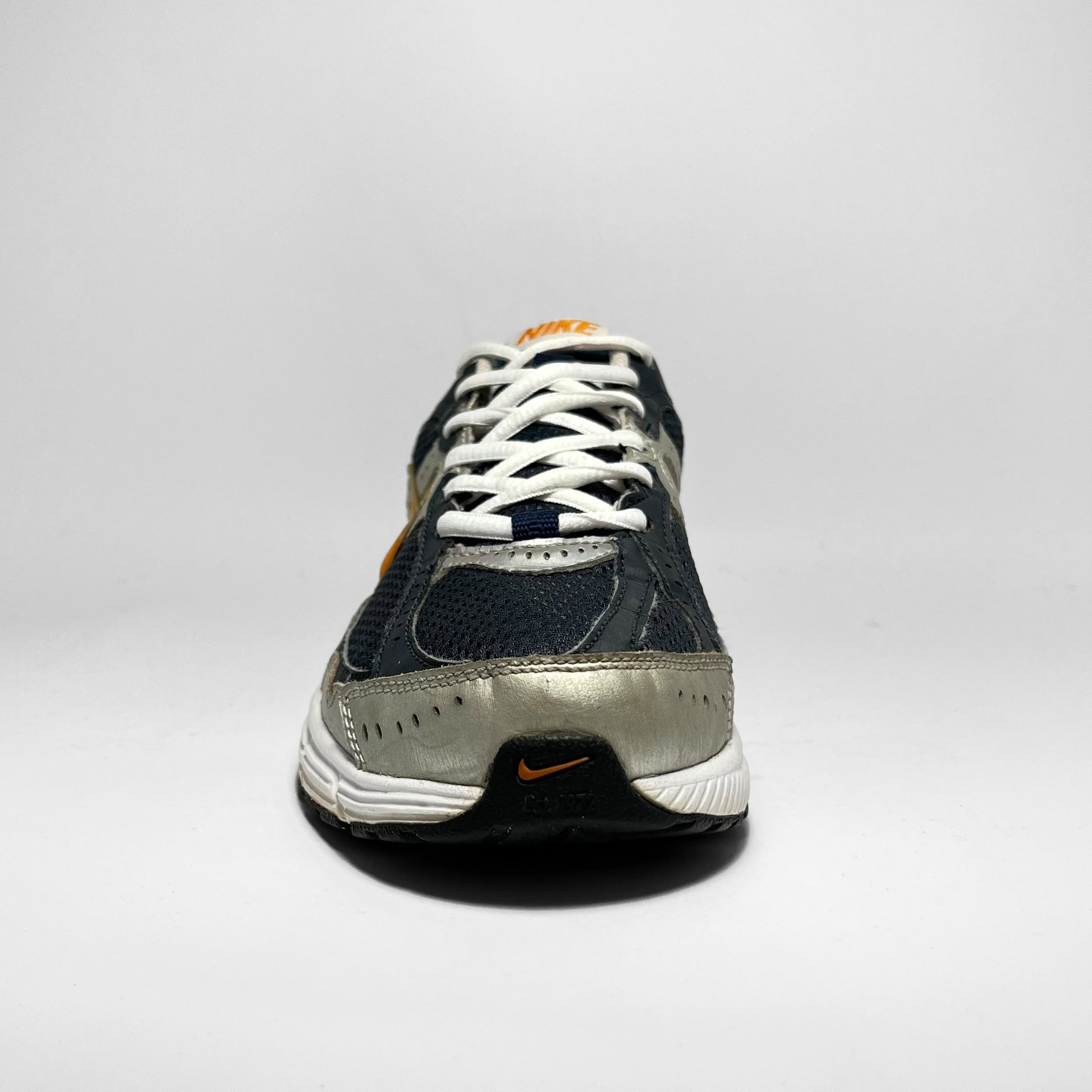 Navy mesh layered with navy and metallic embossed, perforated and detailed leather panels throughout, yellow branding such as tongue tab, heel, mini swoosh at front and medial side, and jewel swoosh.