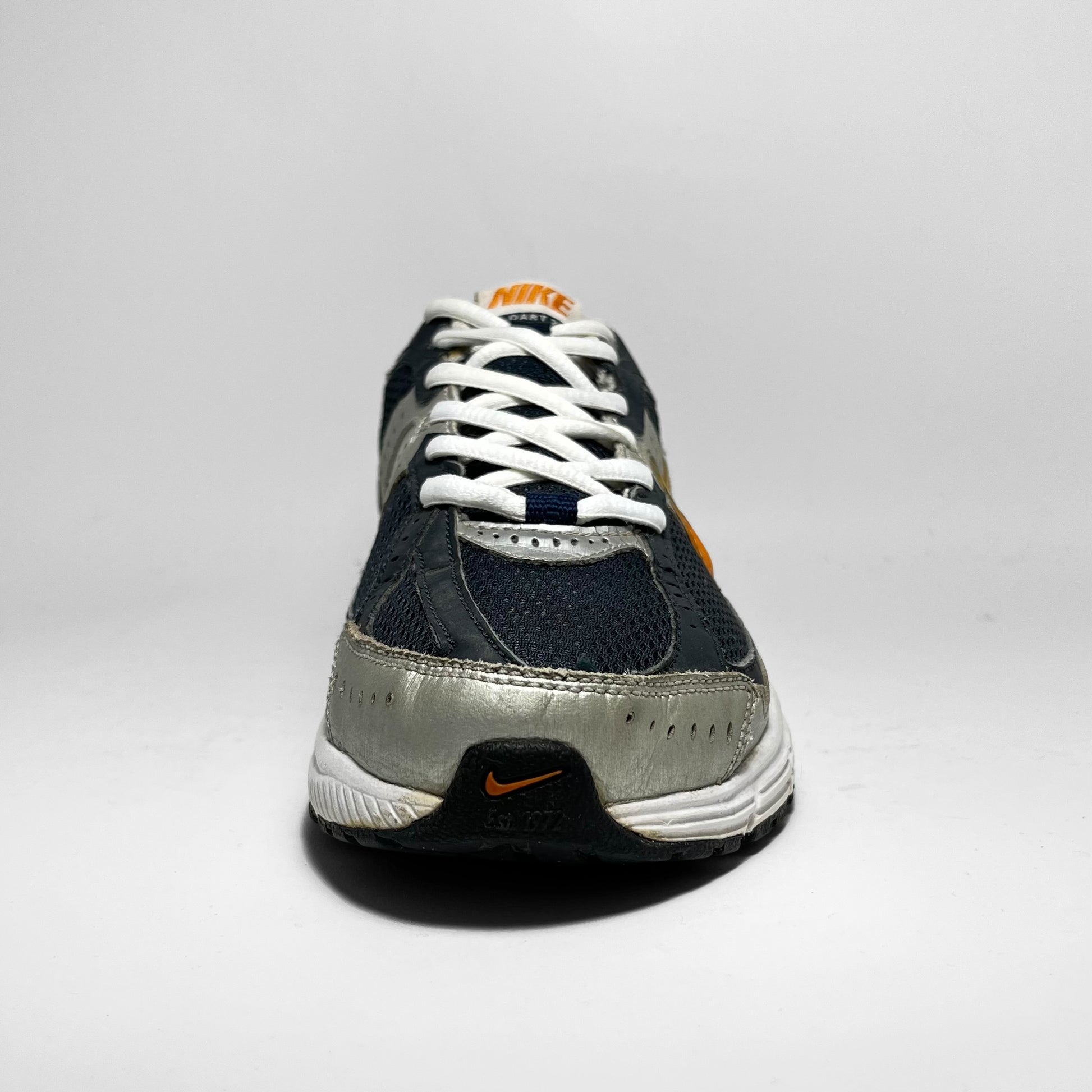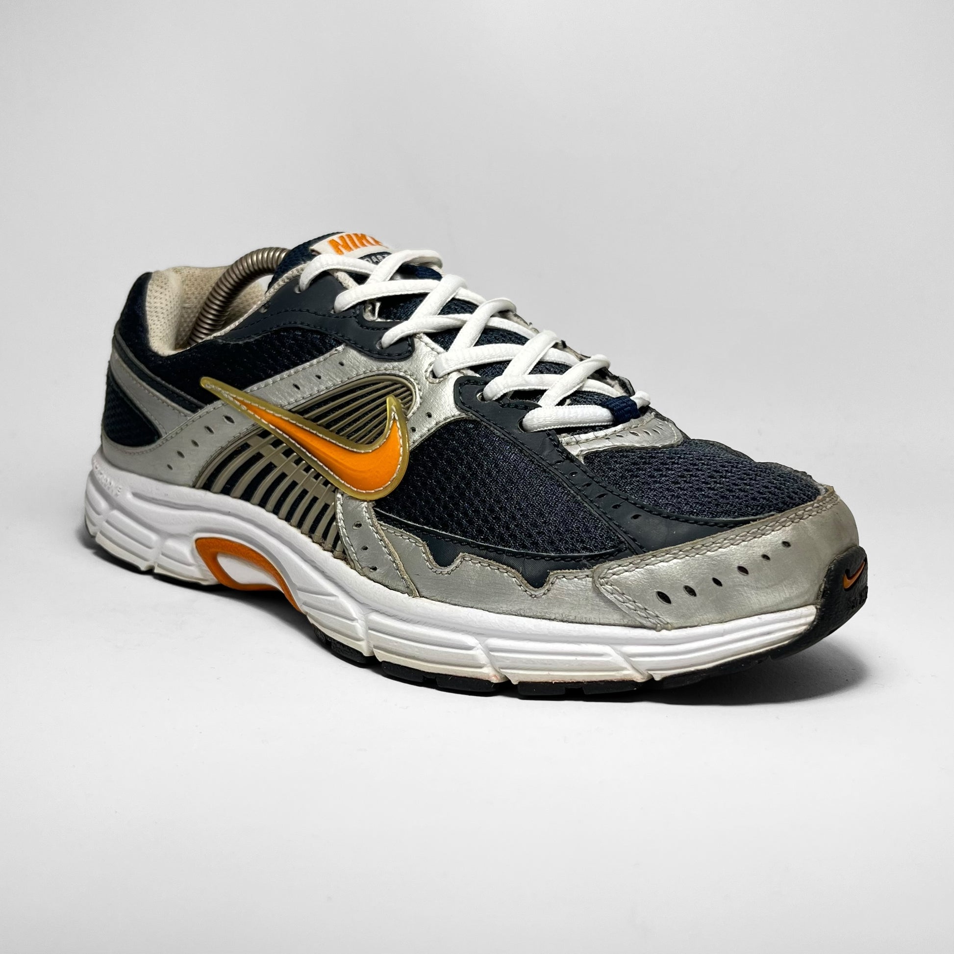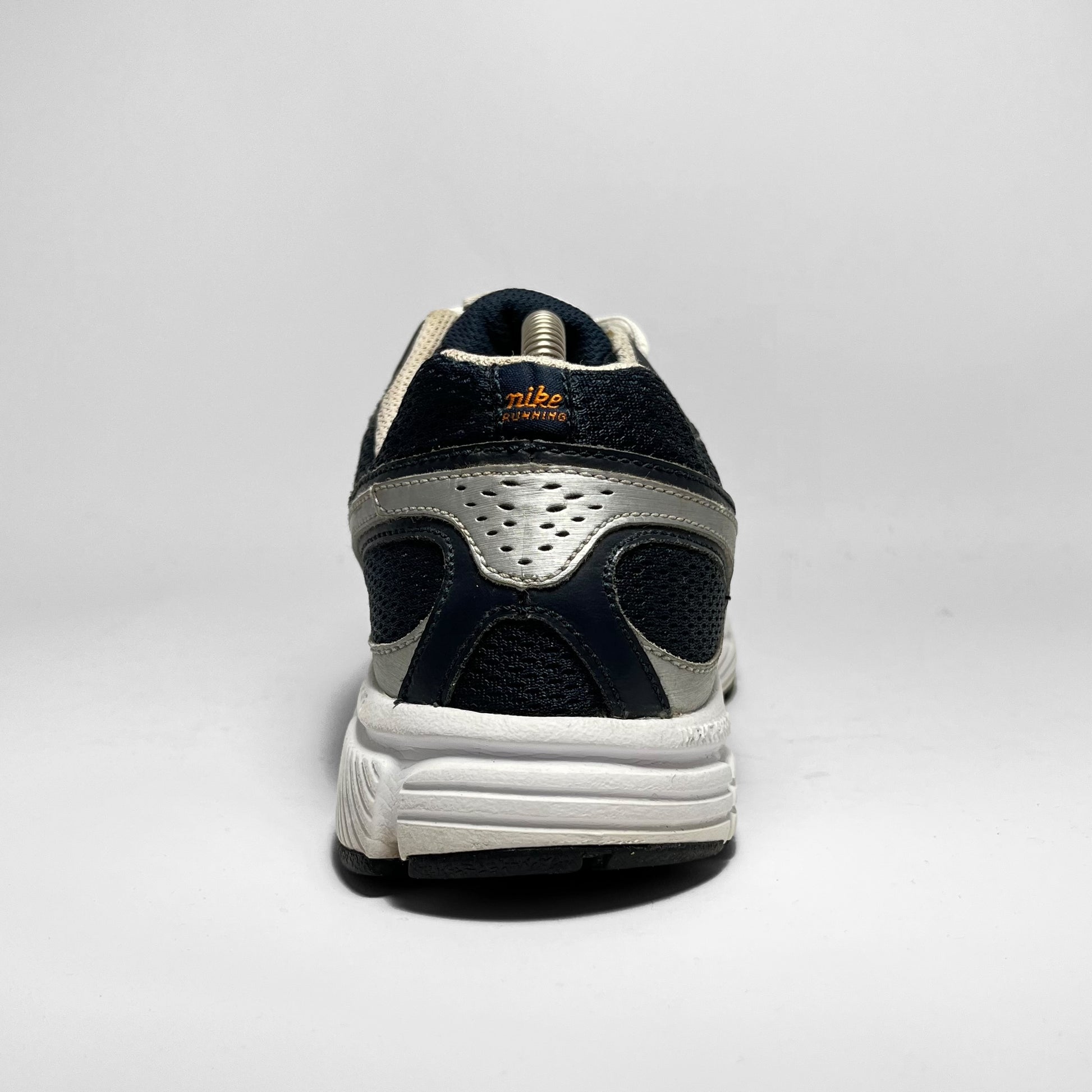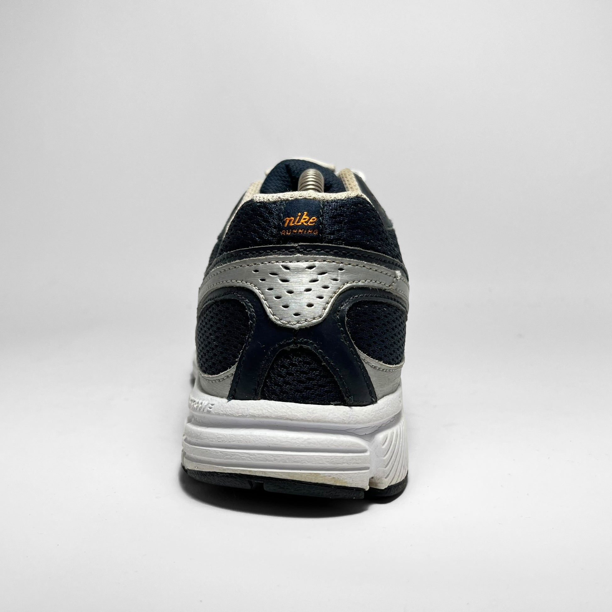 Navy mesh layered with navy and metallic embossed, perforated and detailed leather panels throughout, yellow branding such as tongue tab, heel, mini swoosh at front and medial side, and jewel swoosh.