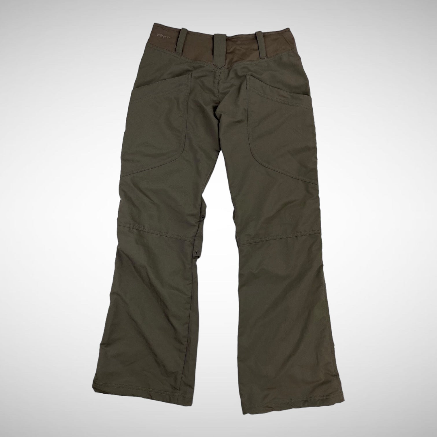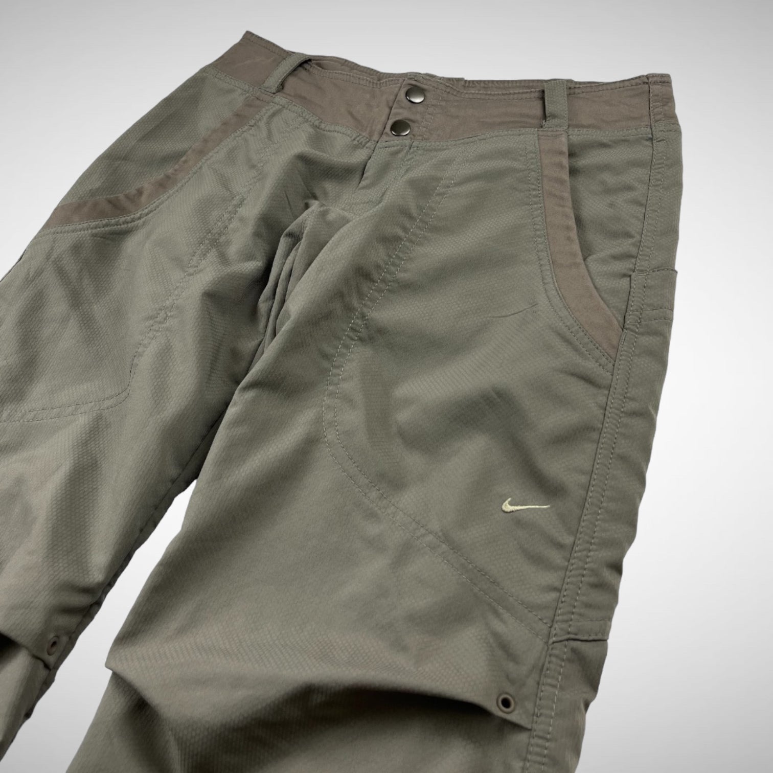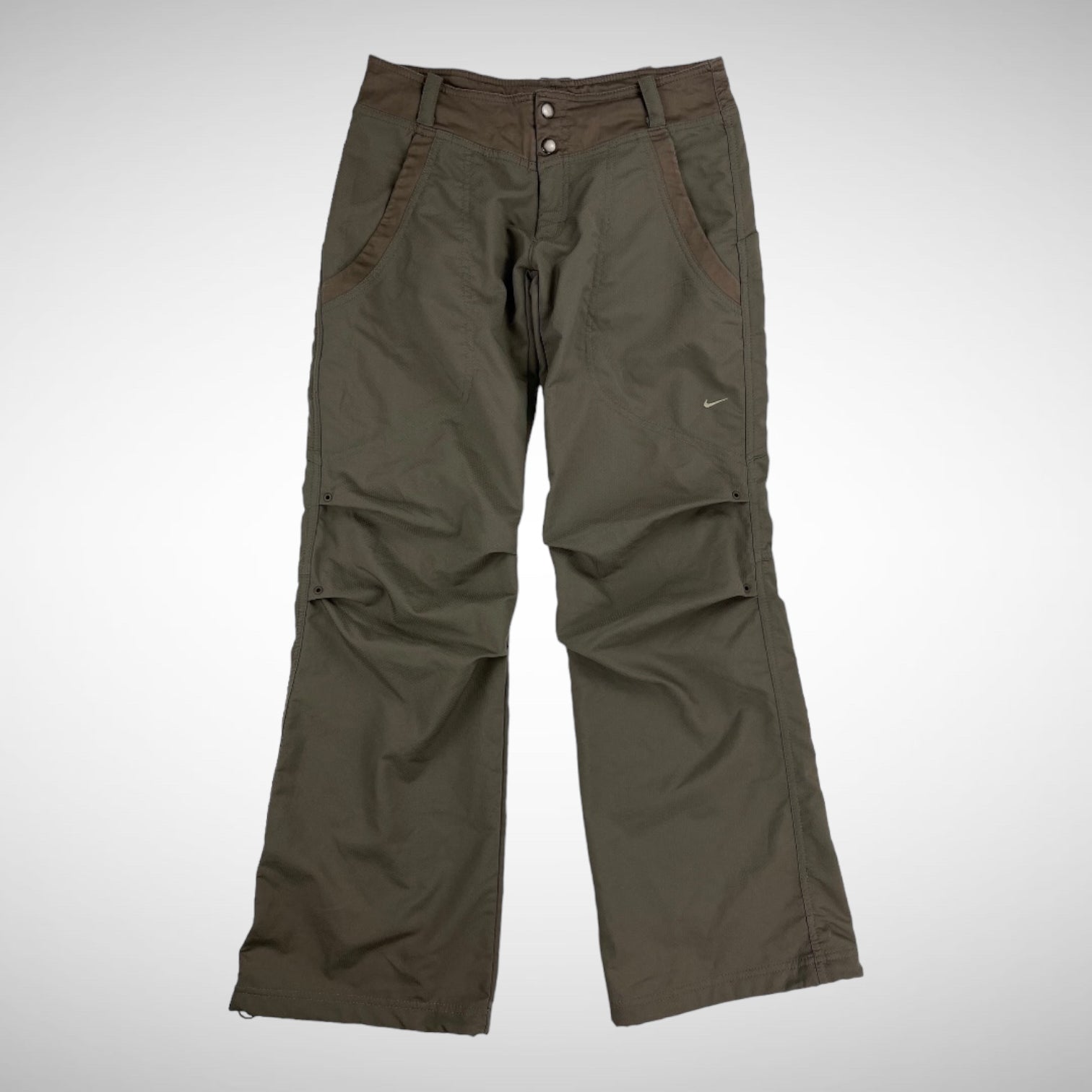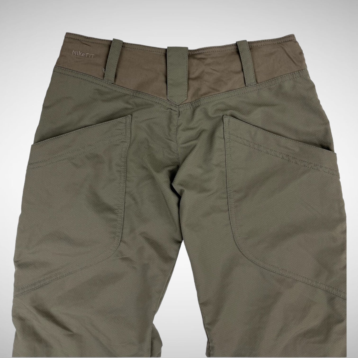 Nike Fit tactical wide leg soft pants with double button closure, two deep front and back pockets, brown cotton waist and pocket detailing, articulated knees with ventilation holes and adjustable cord-string ankles.