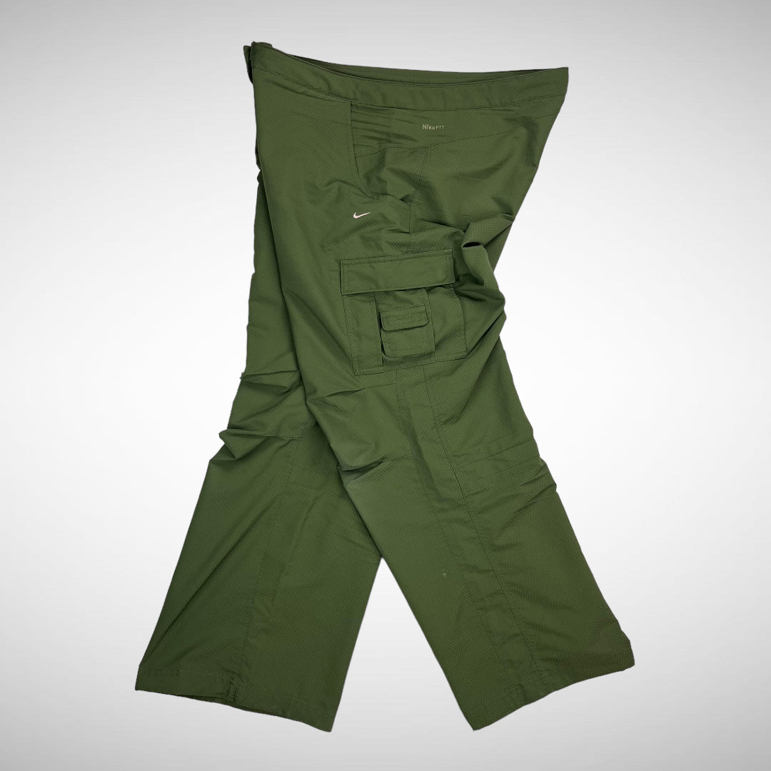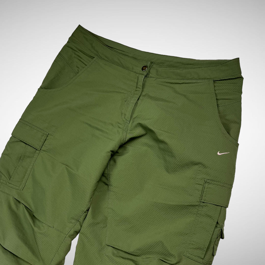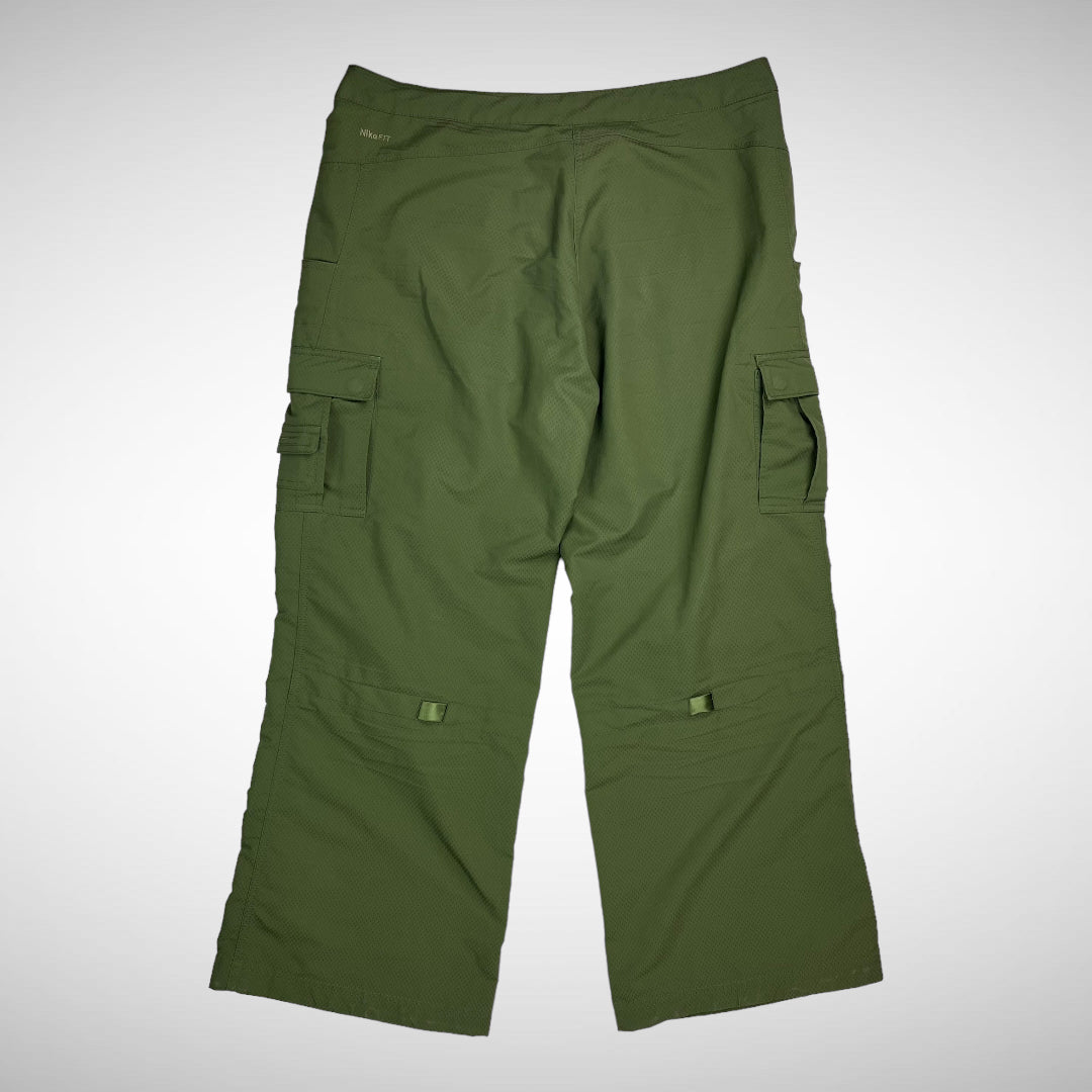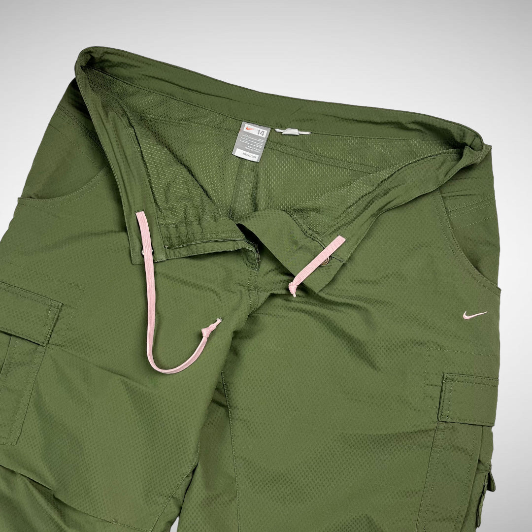 Sphere-like material with articulated knees, cargo pockets with pink mini swoosh and inside rope to adjust waist, and belt on backside to adjust and expand legs.