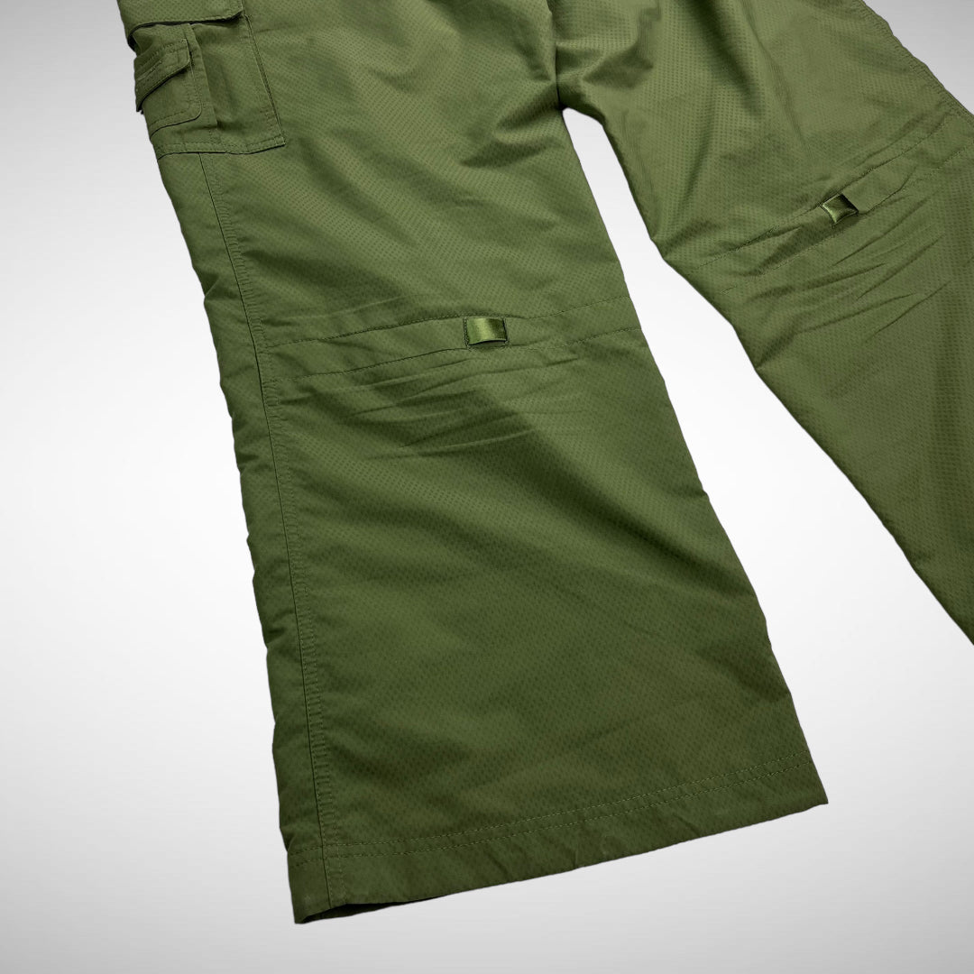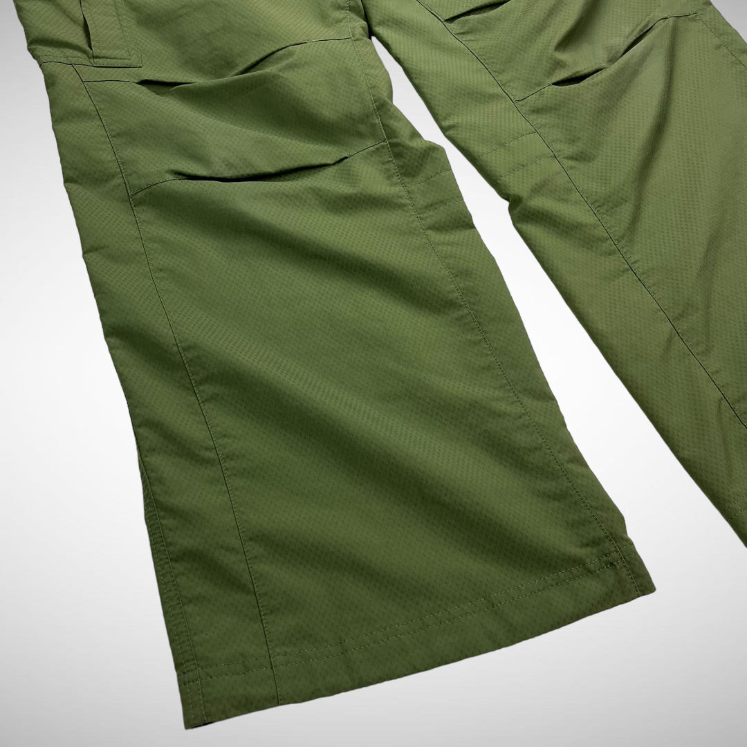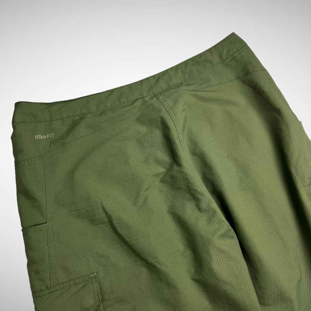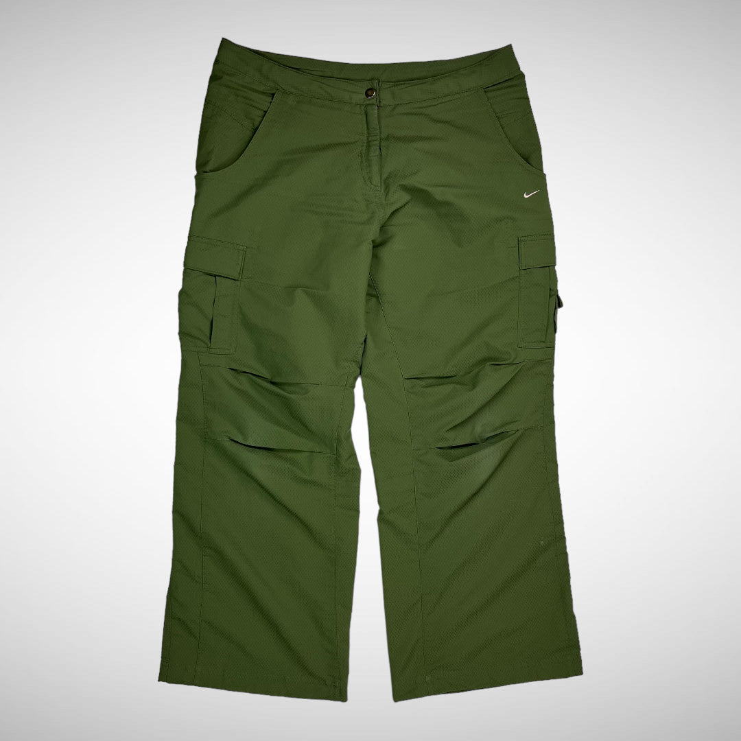 Sphere-like material with articulated knees, cargo pockets with pink mini swoosh and inside rope to adjust waist, and belt on backside to adjust and expand legs.