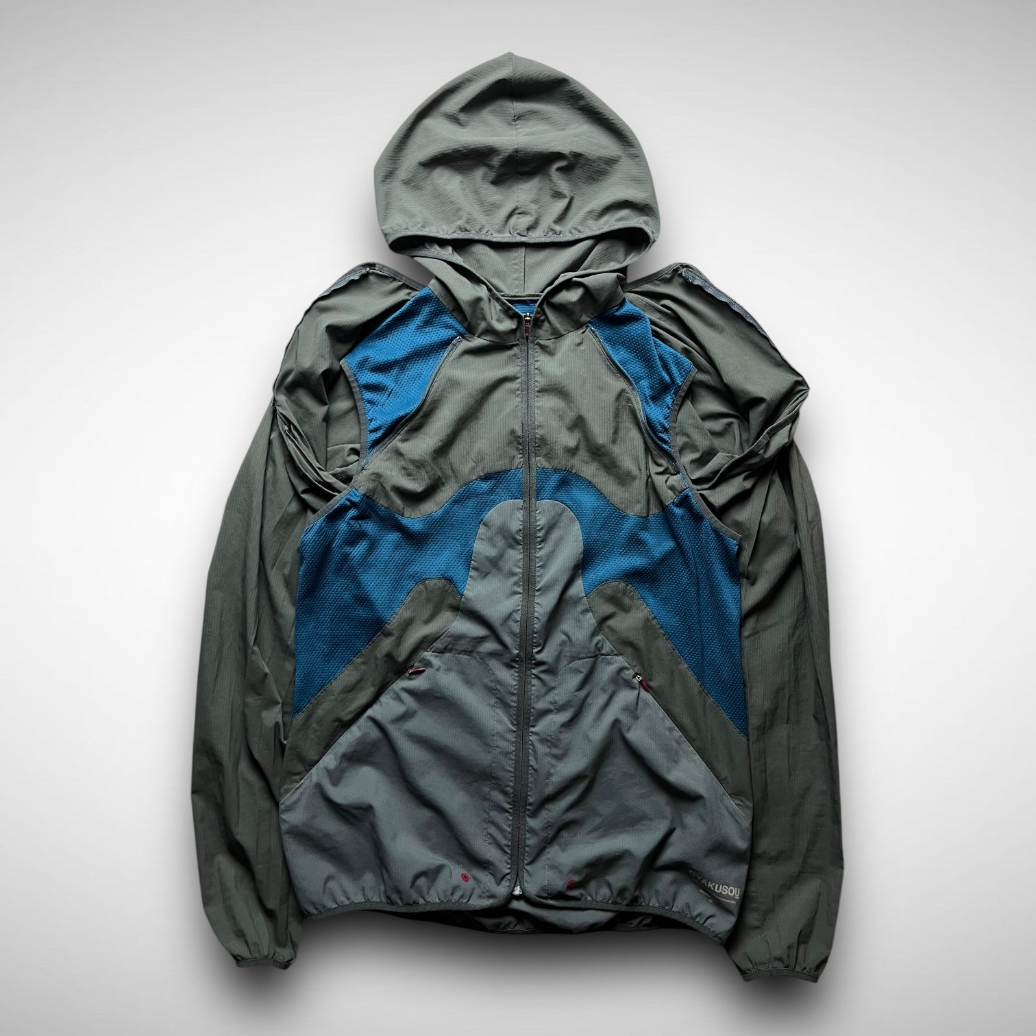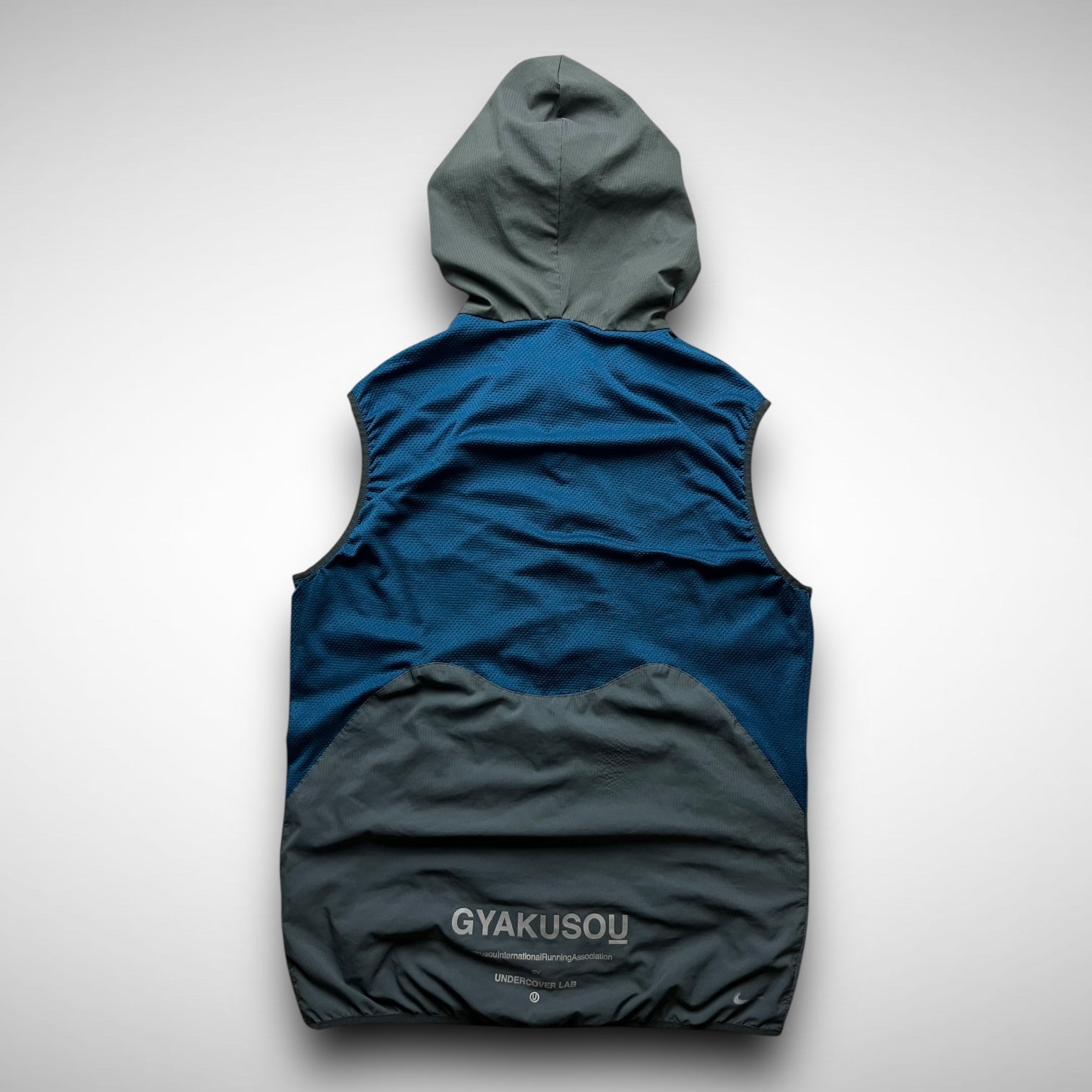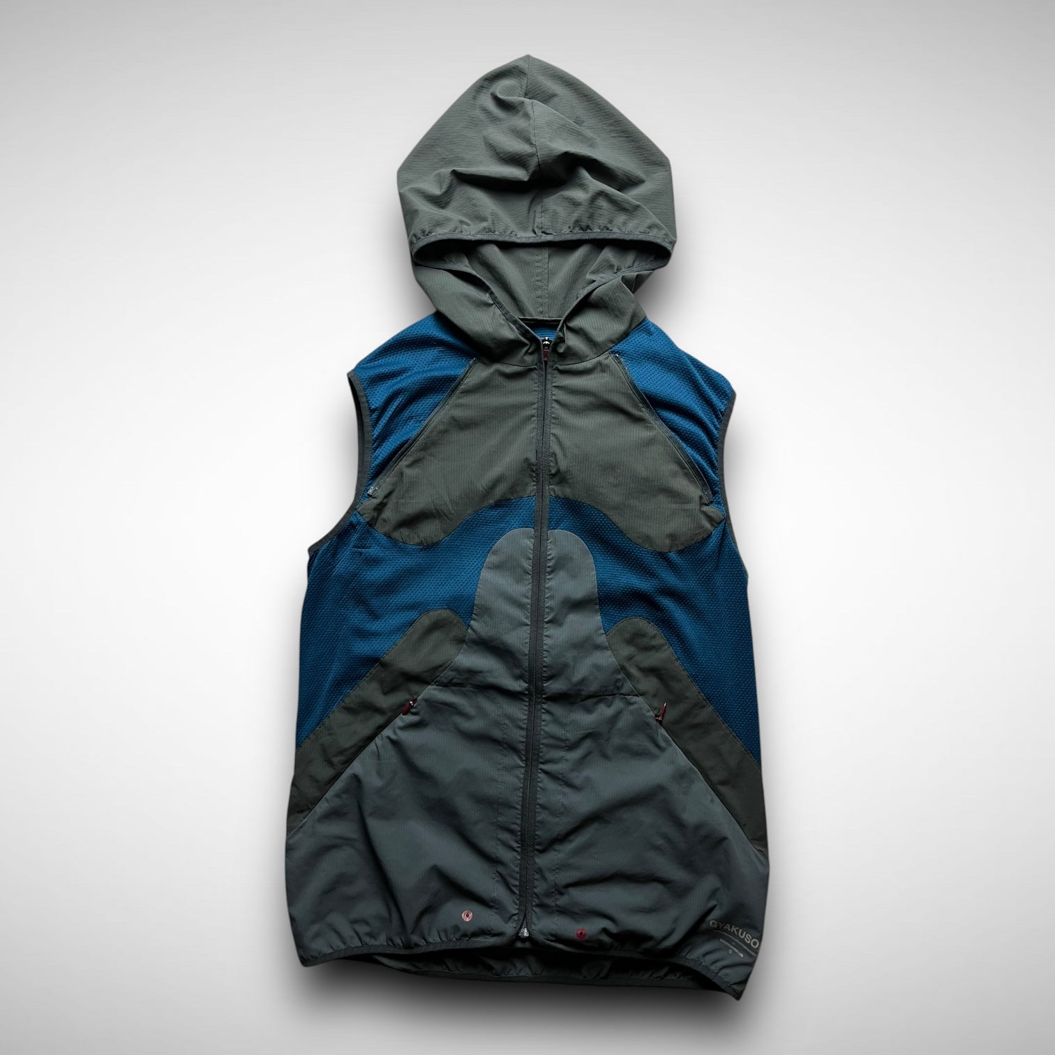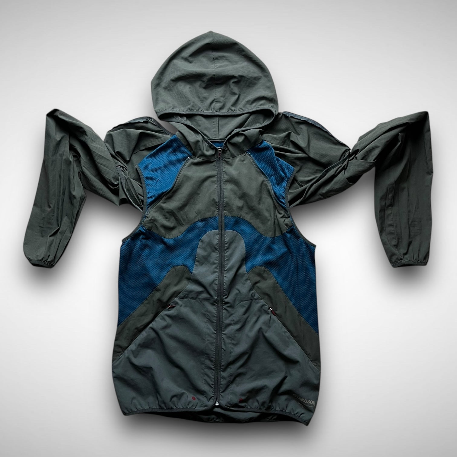 Nike Gyakusou 2012 transformable jacket — a standout piece from the early days of Jun Takahashi’s running line. Crafted from lightweight ripstop with bold mesh paneling, it features zip-off sleeves allowing a quick switch from jacket to vest. Functional design meets a signature asymmetrical aesthetic, finished with subtle branding and ergonomic pocket placement.