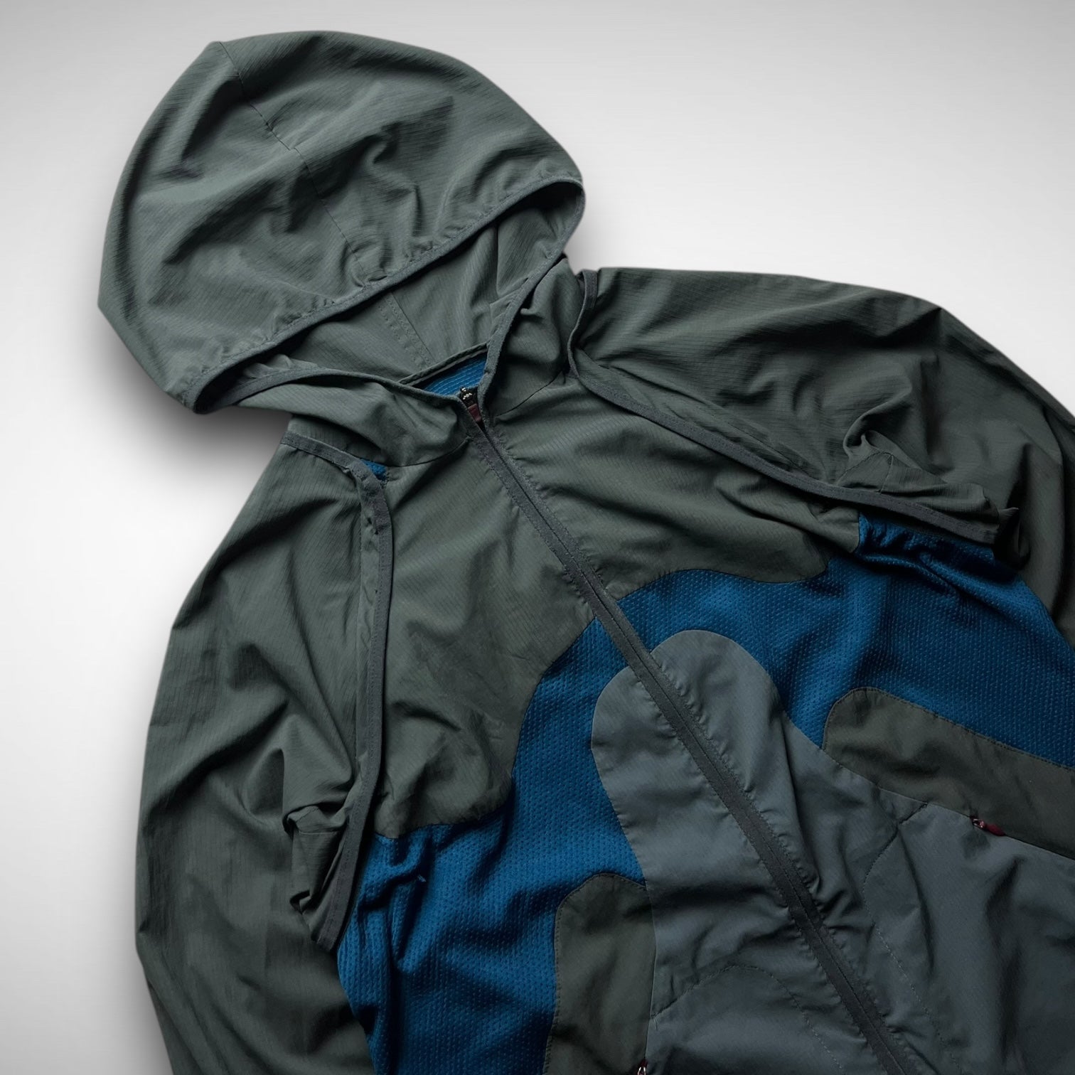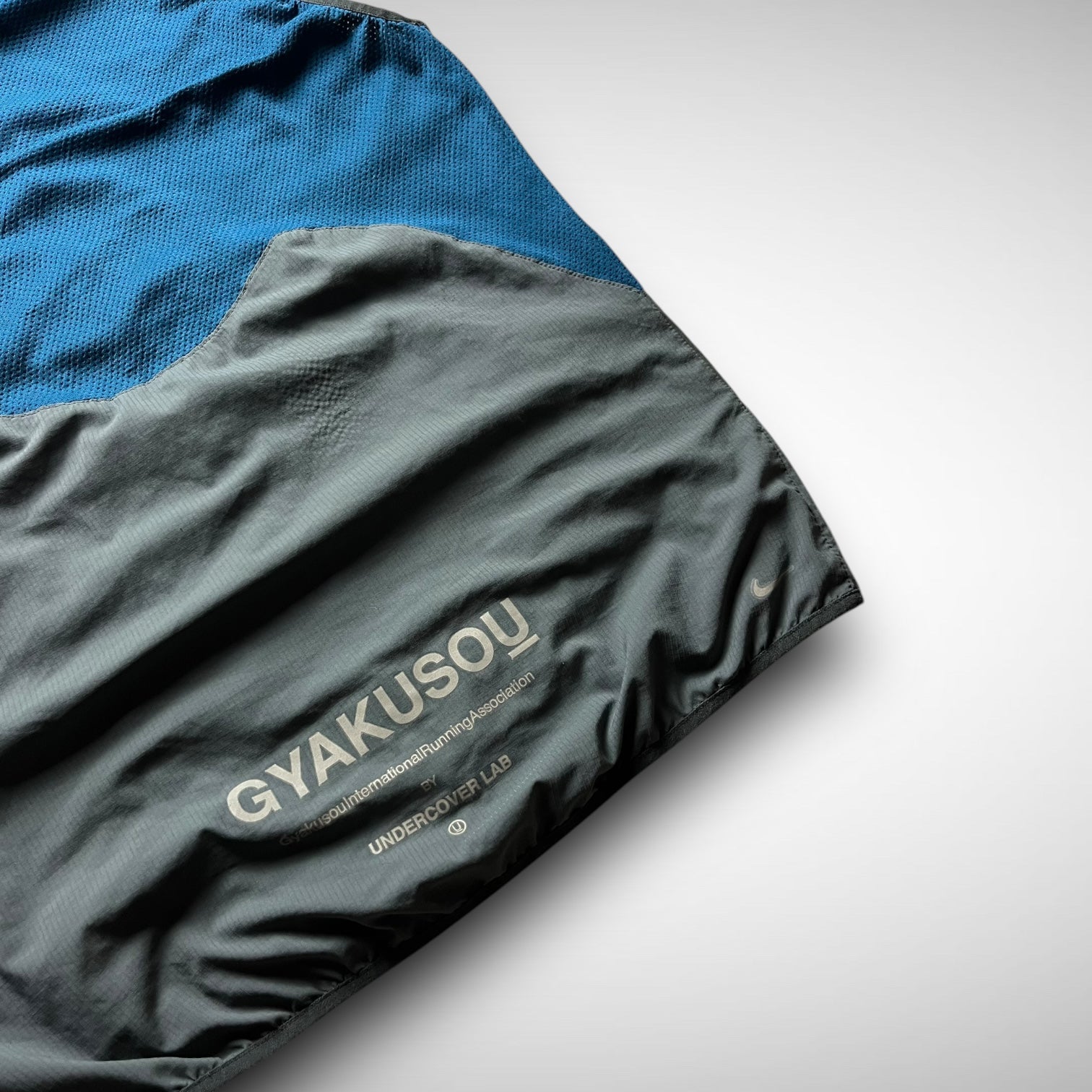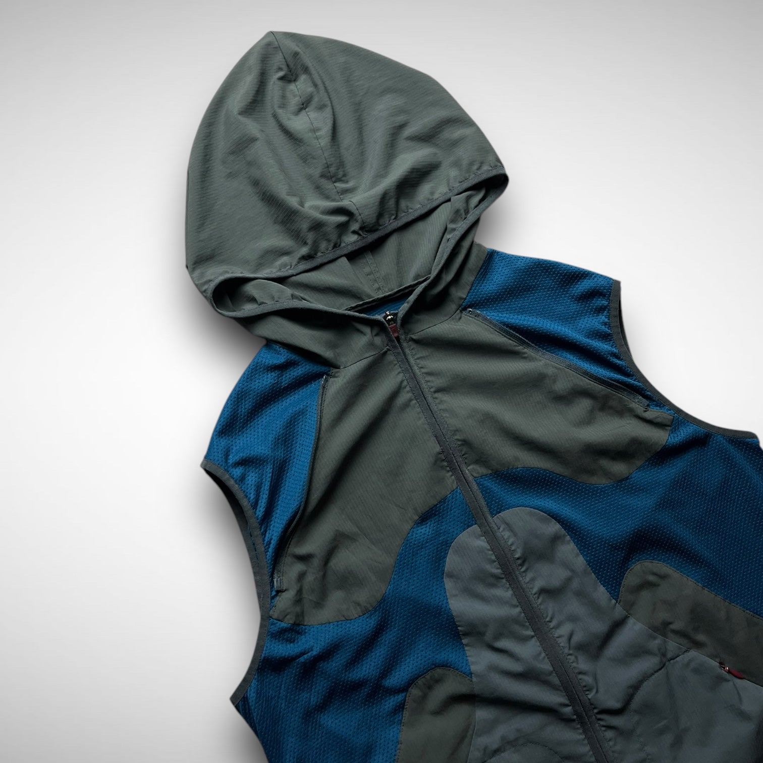 Nike Gyakusou 2012 transformable jacket — a standout piece from the early days of Jun Takahashi’s running line. Crafted from lightweight ripstop with bold mesh paneling, it features zip-off sleeves allowing a quick switch from jacket to vest. Functional design meets a signature asymmetrical aesthetic, finished with subtle branding and ergonomic pocket placement.