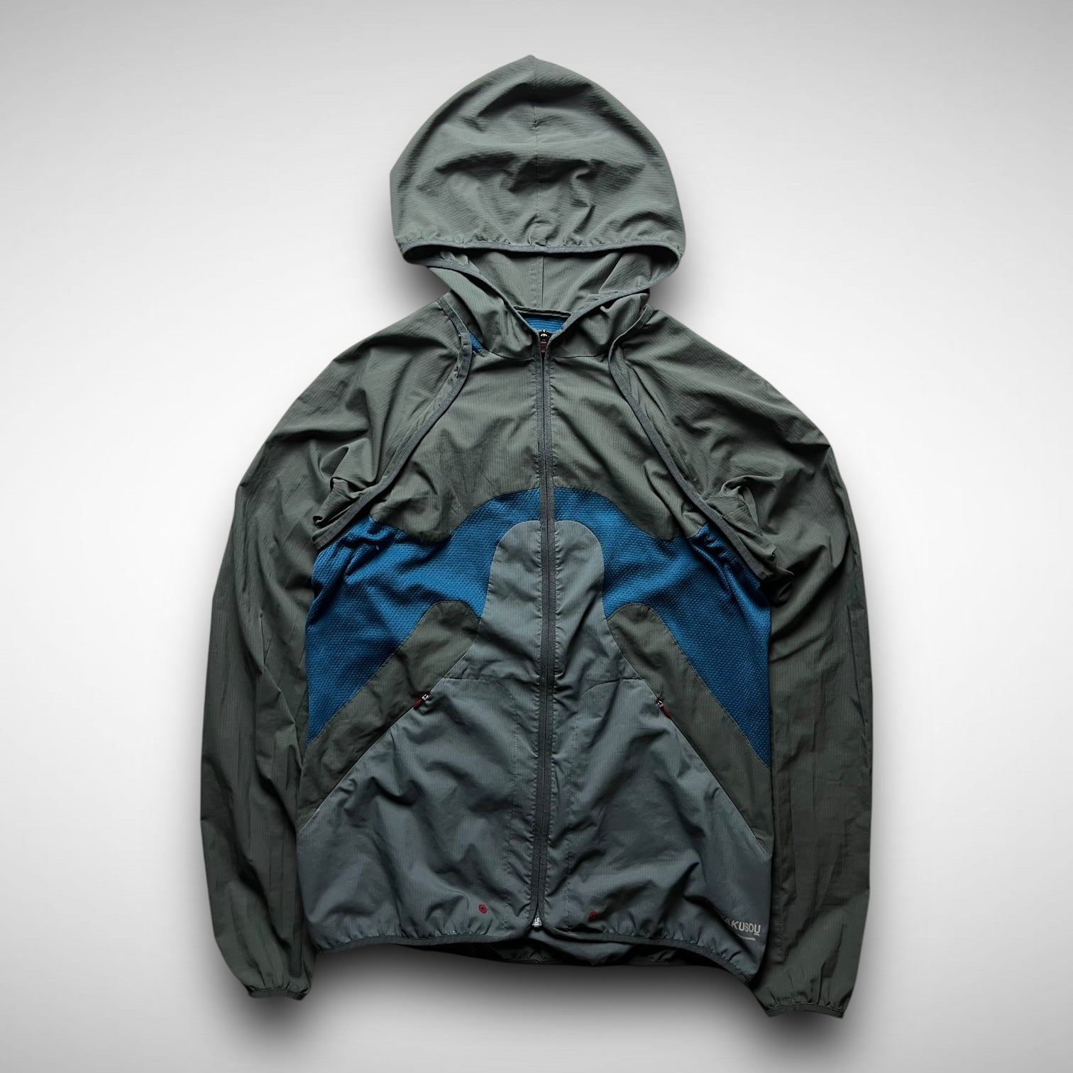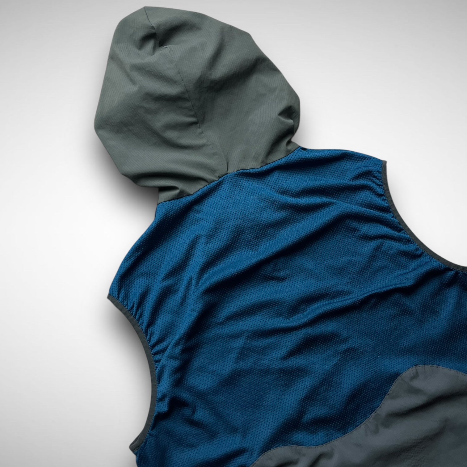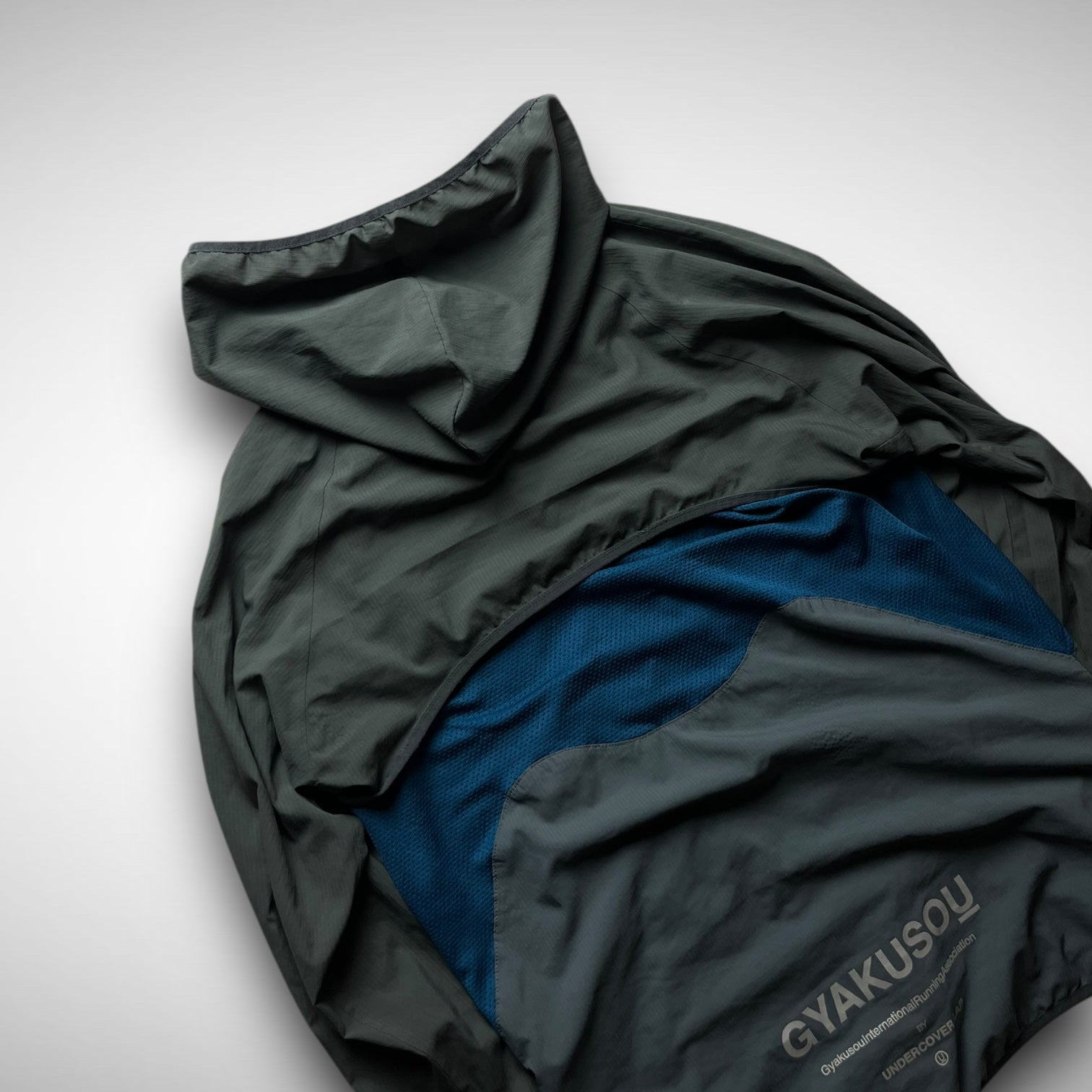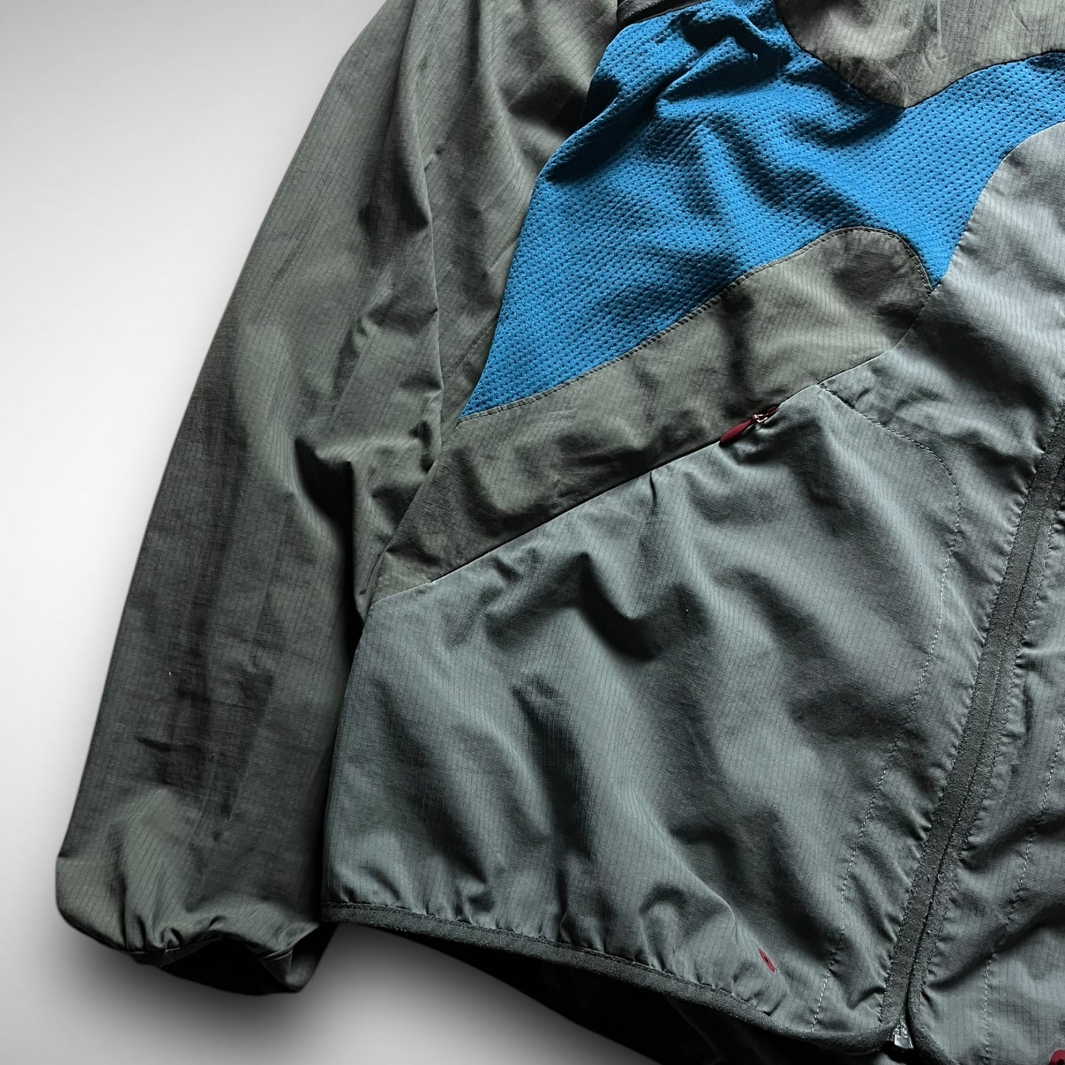 Nike Gyakusou 2012 transformable jacket — a standout piece from the early days of Jun Takahashi’s running line. Crafted from lightweight ripstop with bold mesh paneling, it features zip-off sleeves allowing a quick switch from jacket to vest. Functional design meets a signature asymmetrical aesthetic, finished with subtle branding and ergonomic pocket placement.
