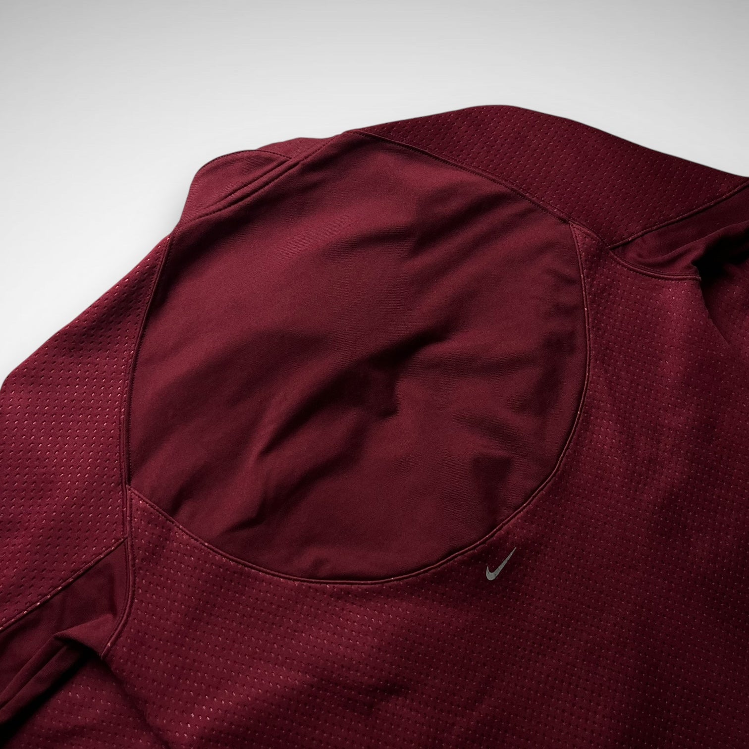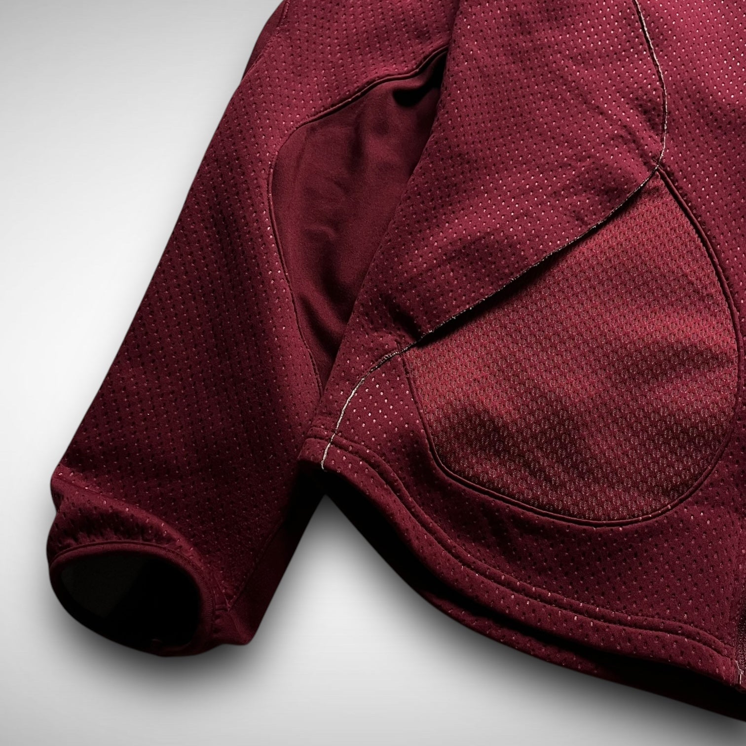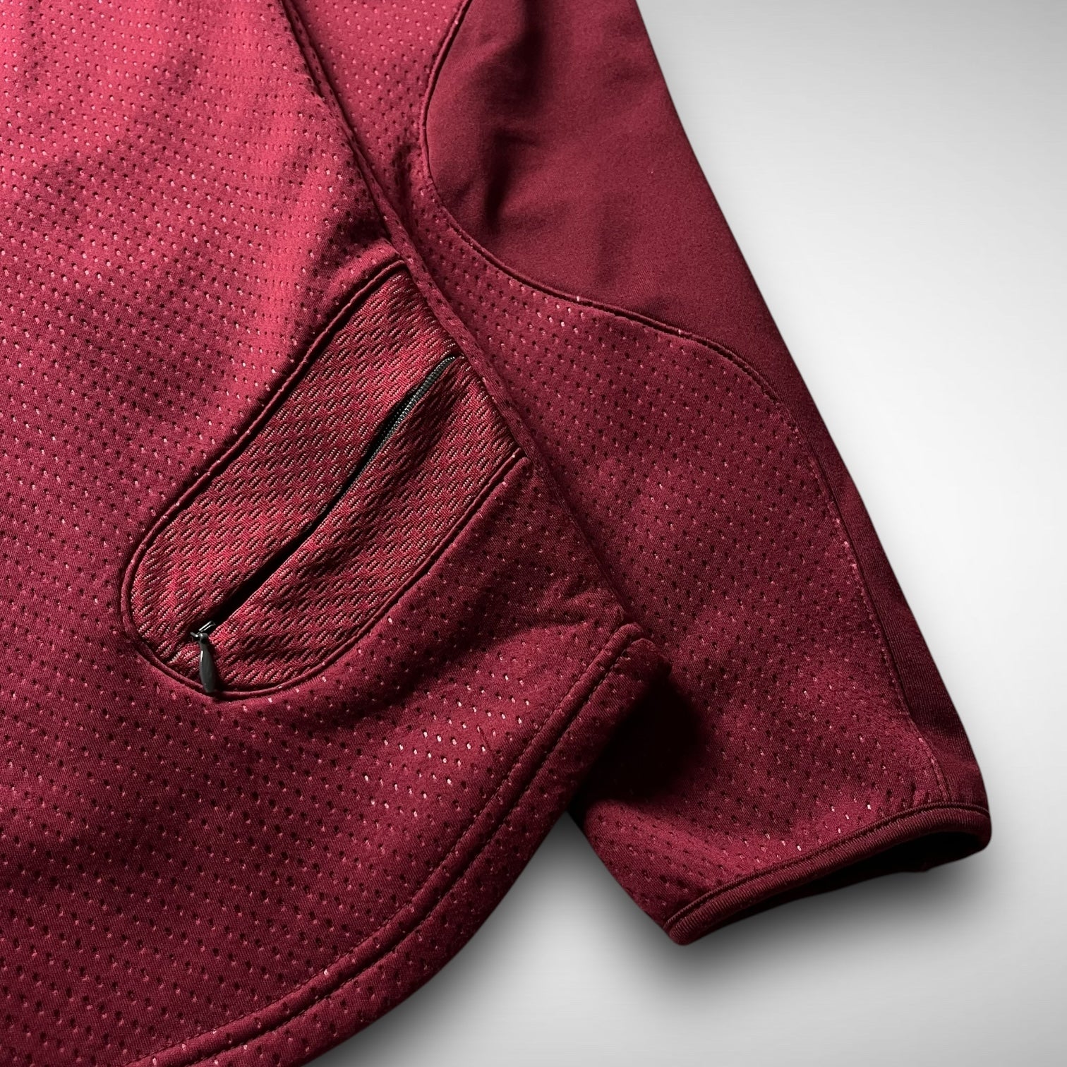 Bonded double layered mesh in burgundy and articulated panels for improved movability, comfort and breathability, laser cut handwarmer pockets, 3M lining and printed branding on chest and swoosh on center-back, including hidden zip-pocket.