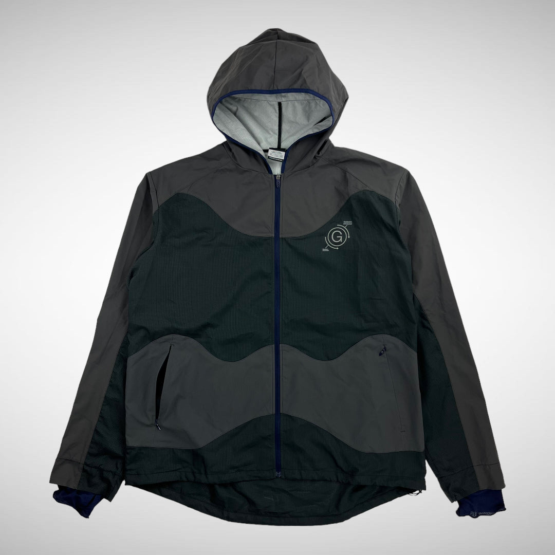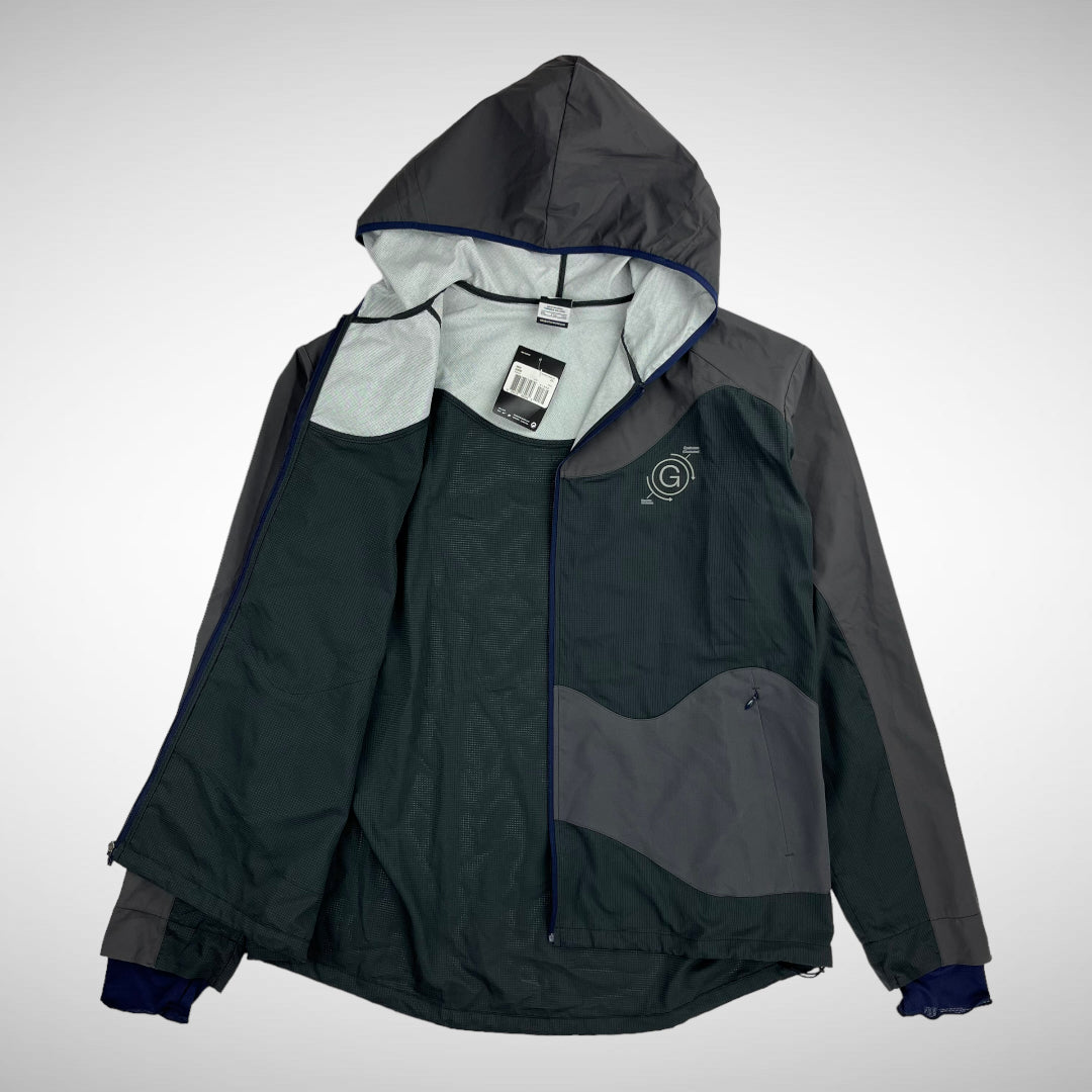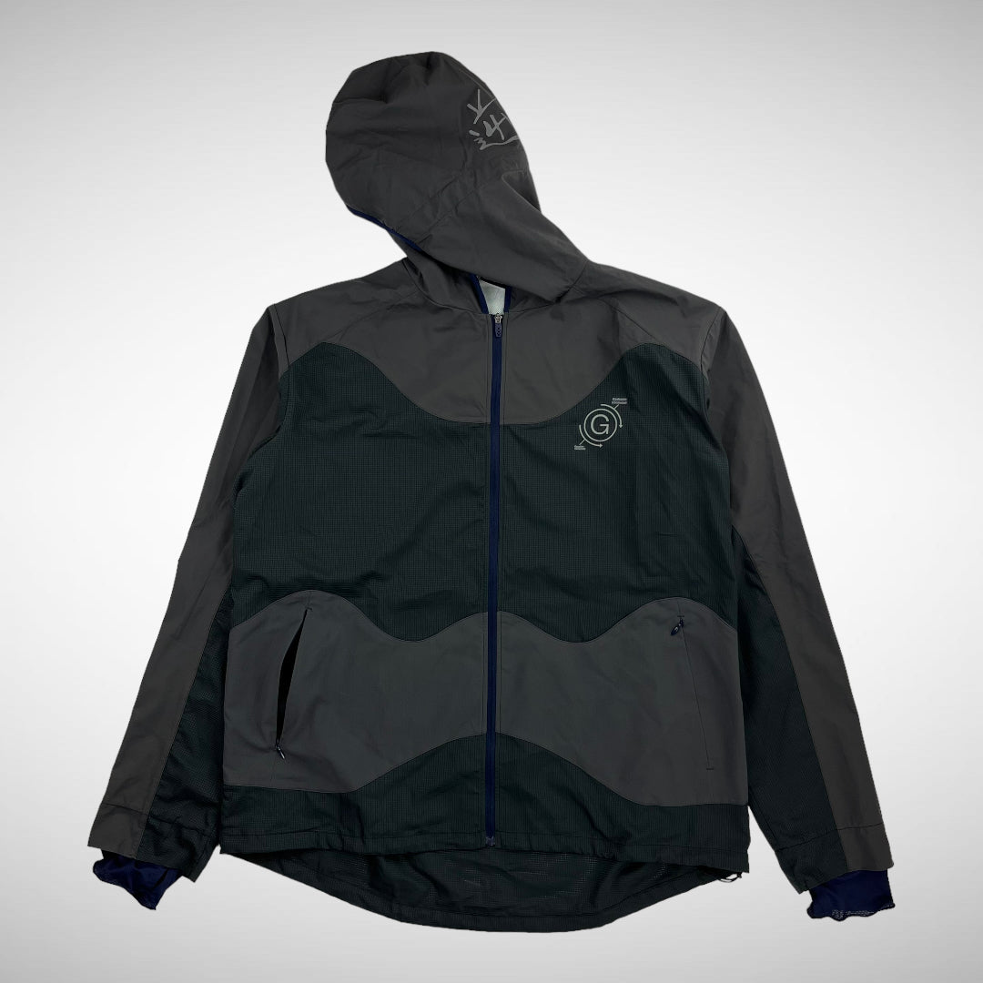 Ultra-lightweight running jacket featuring wavy mesh panels, 3M detailed branding on hood, front and back, extended handwarmers cuffs, hidden zip compartments on front and smaller units on the sides.