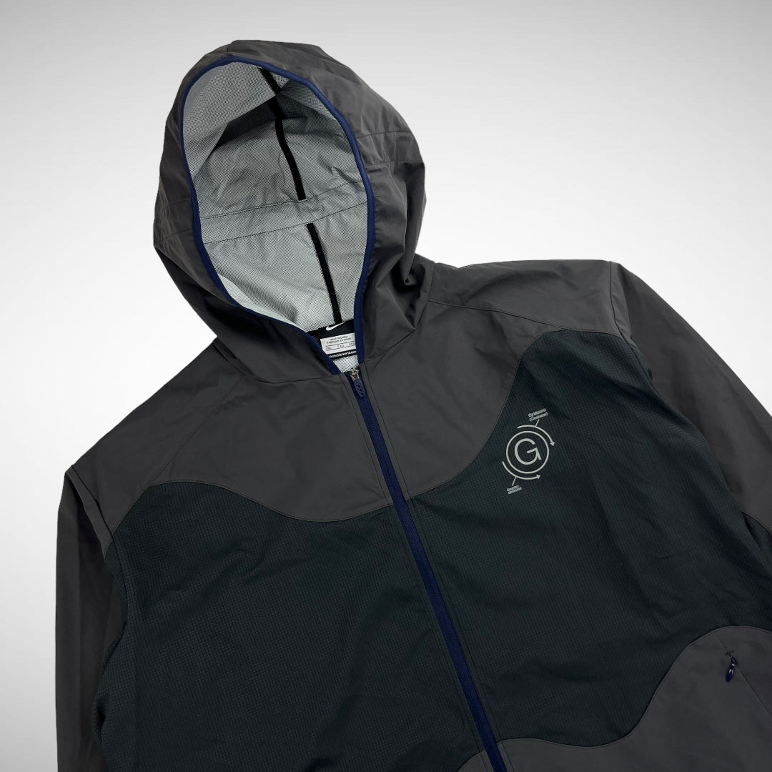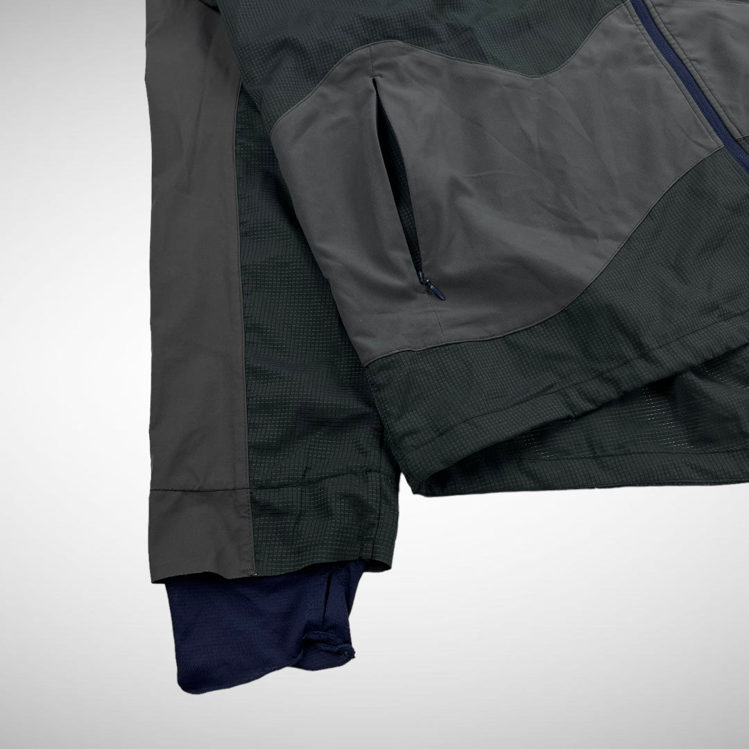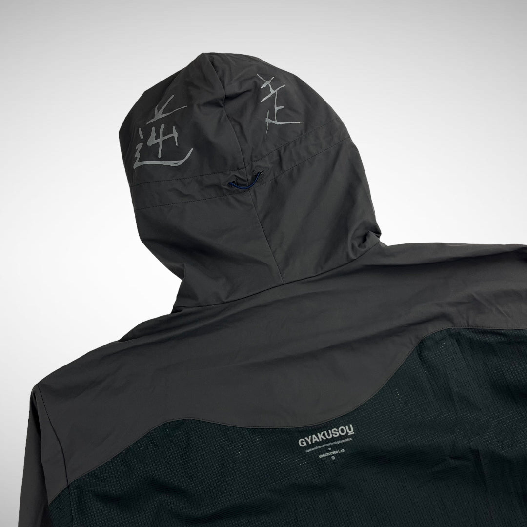 Ultra-lightweight running jacket featuring wavy mesh panels, 3M detailed branding on hood, front and back, extended handwarmers cuffs, hidden zip compartments on front and smaller units on the sides.