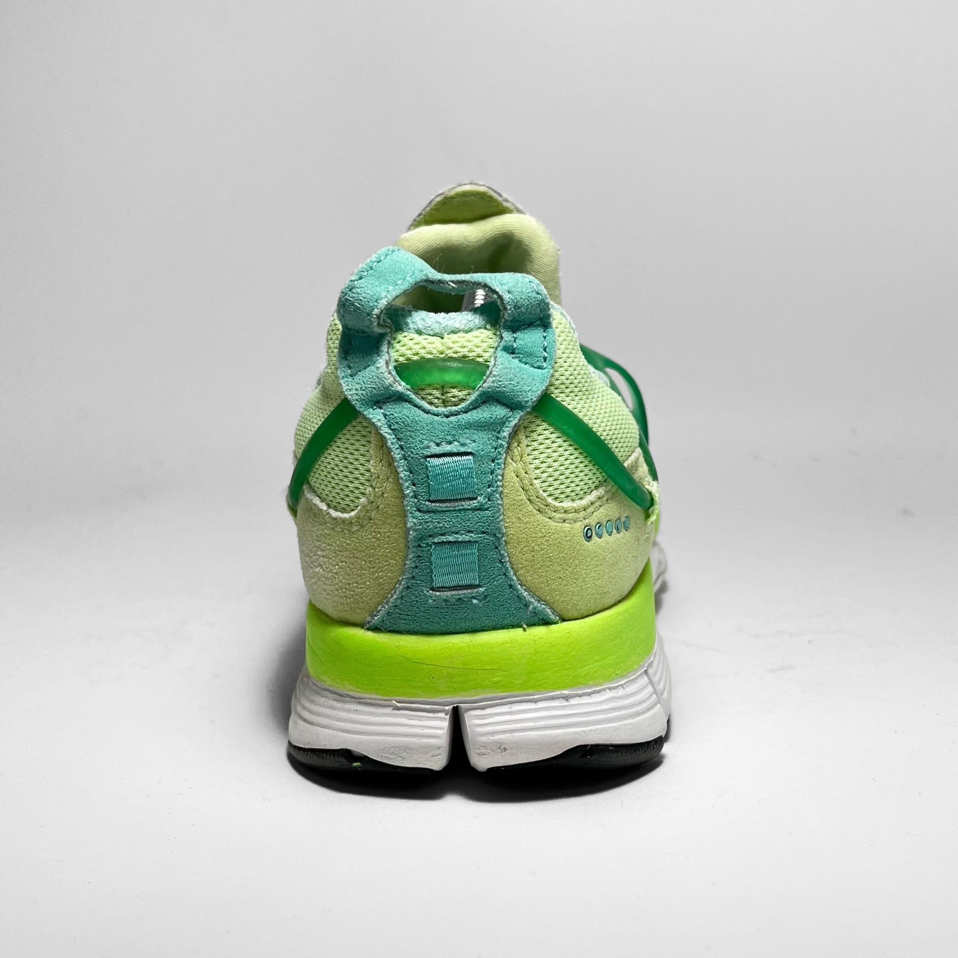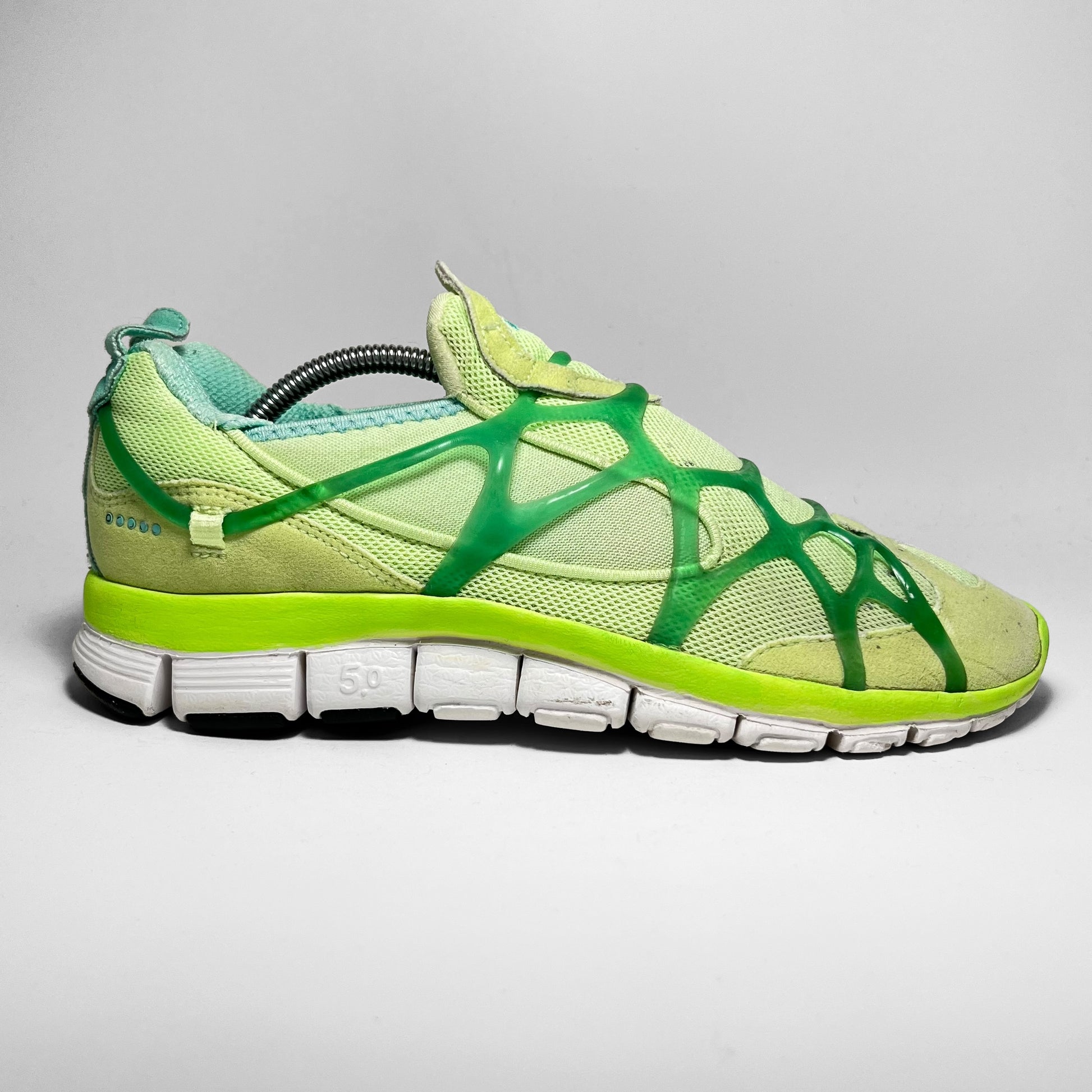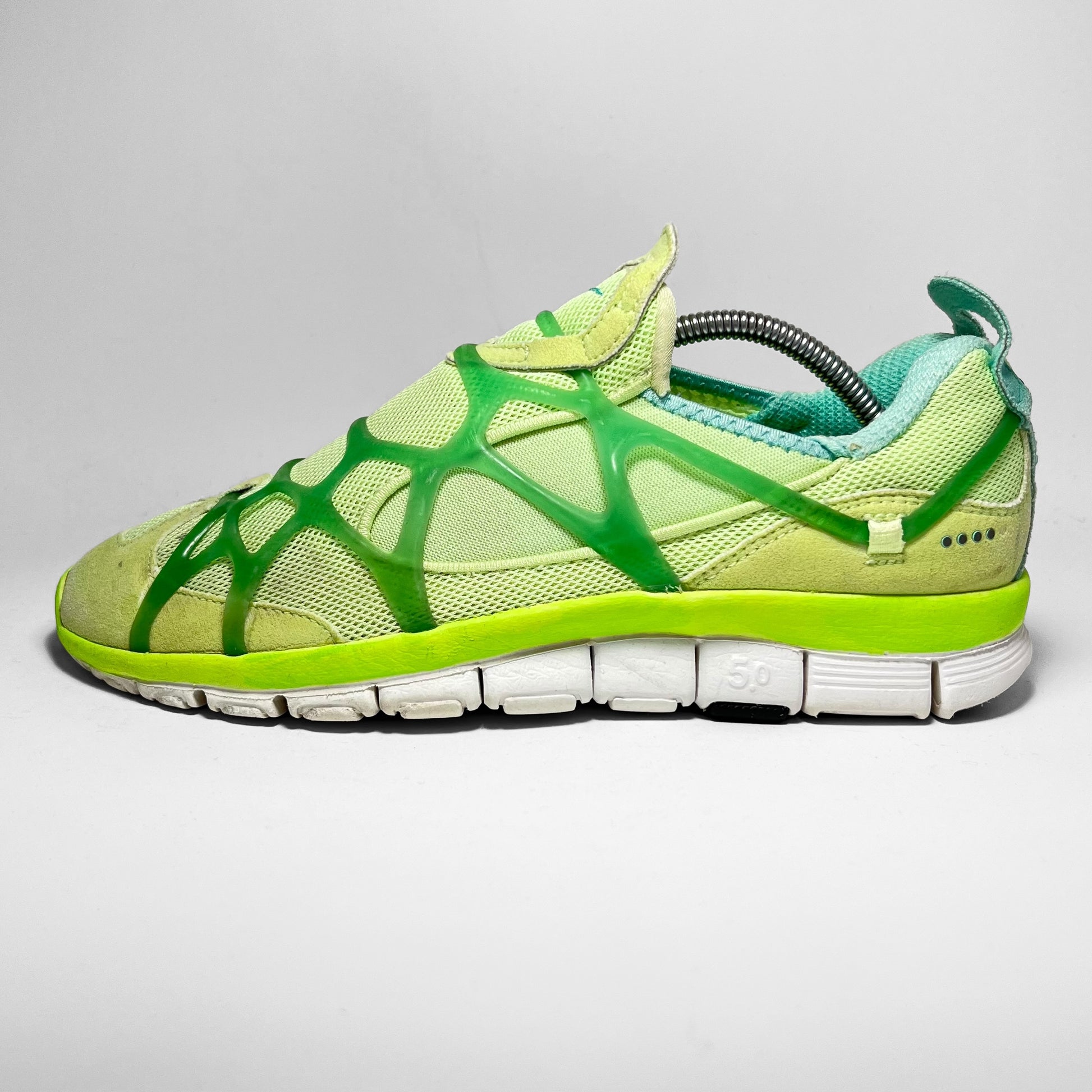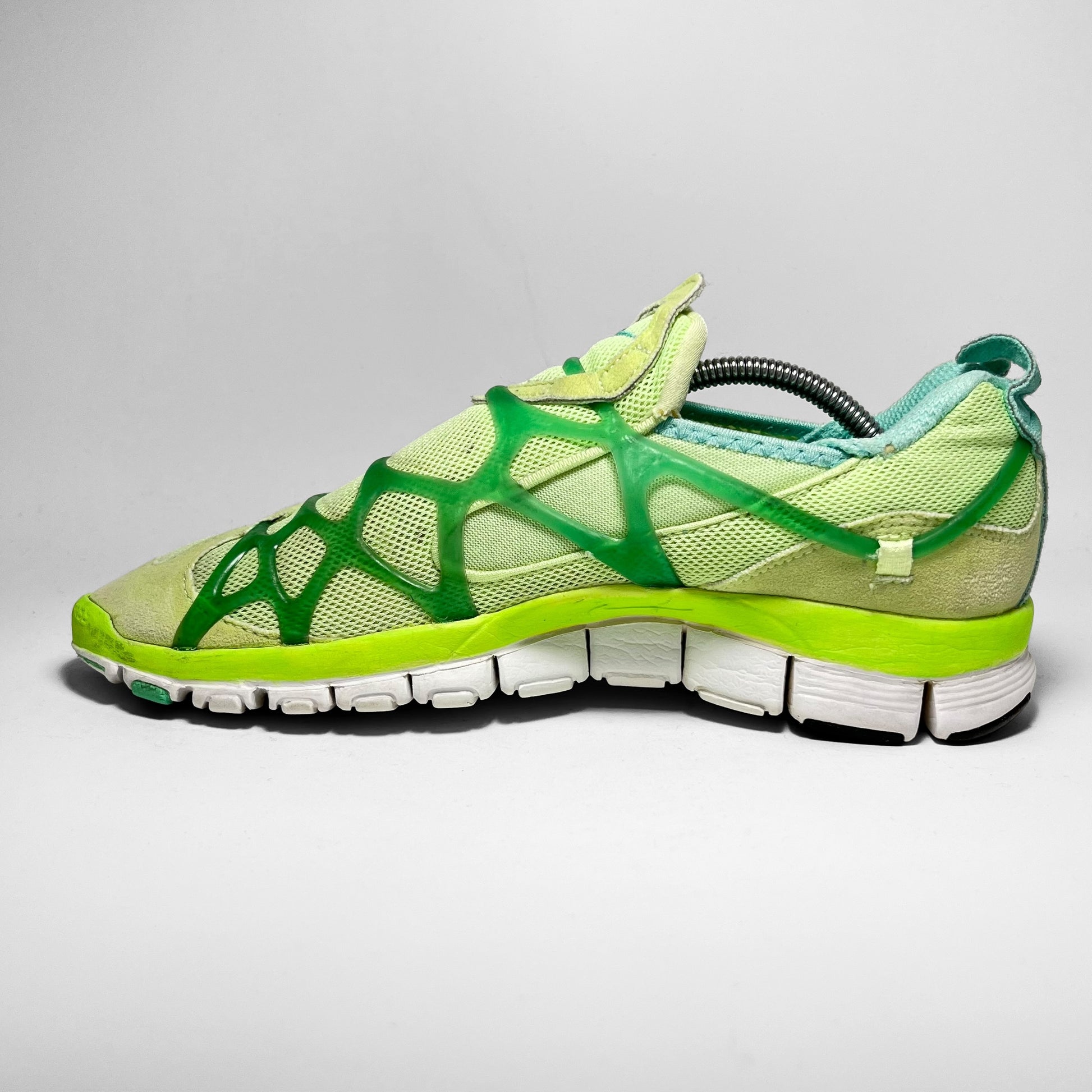 ‘Liquid lime’-edition featuring suede upper panels mixed with mesh and neo-prene for easy acces and overall comfort, now famous Kukini exo-skeleton barbed through the heel and sides, Free tooling and five-dots, which usually refer to Alpha Project releases.