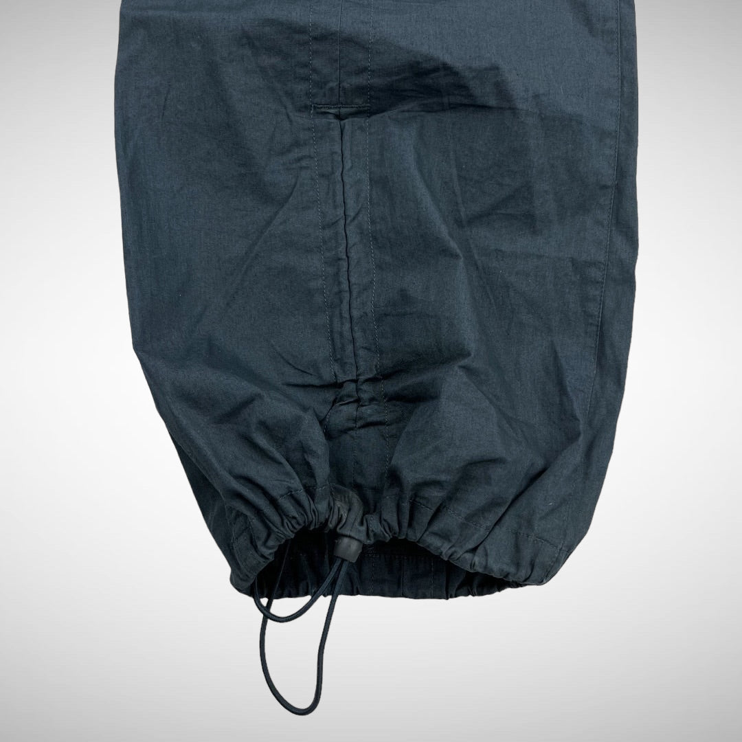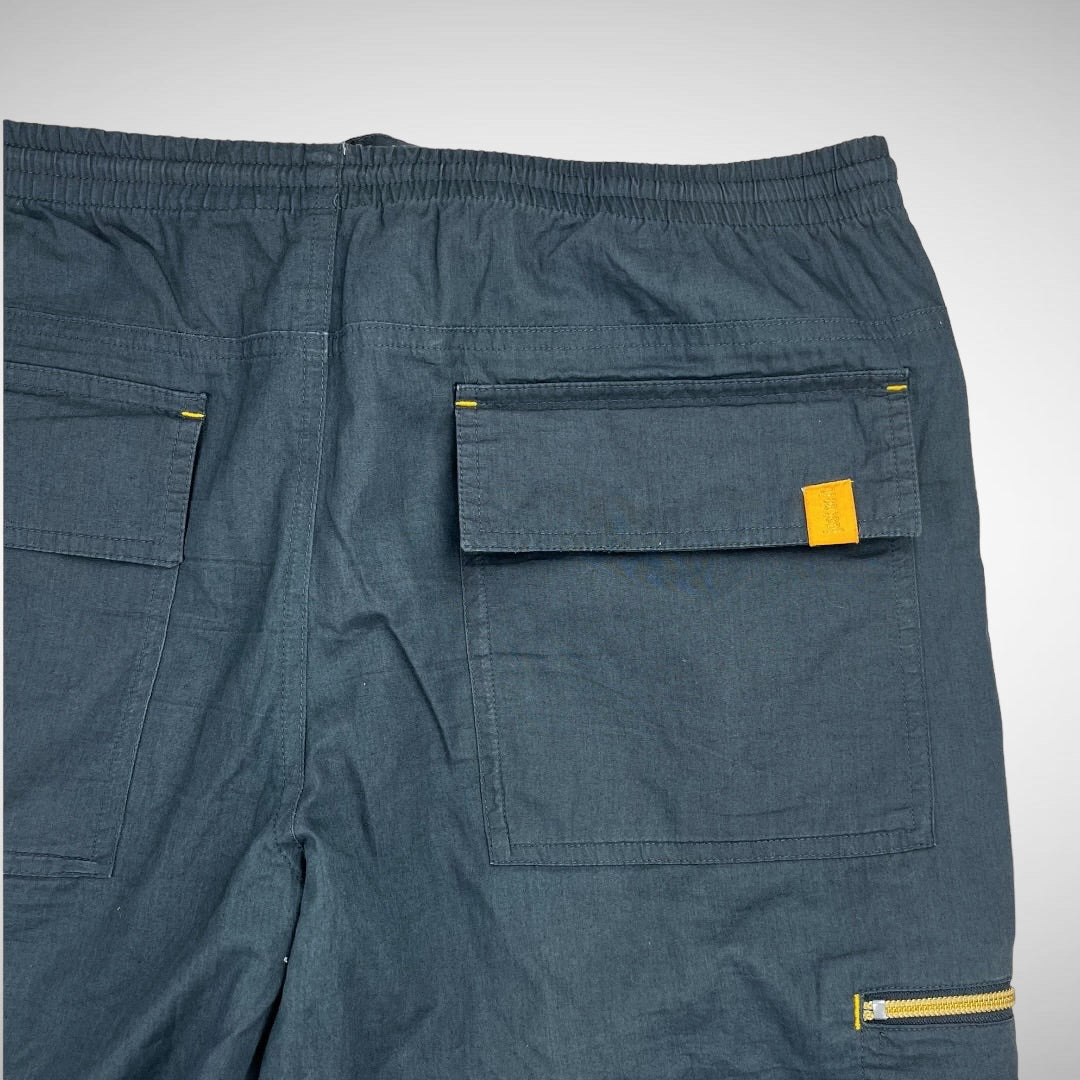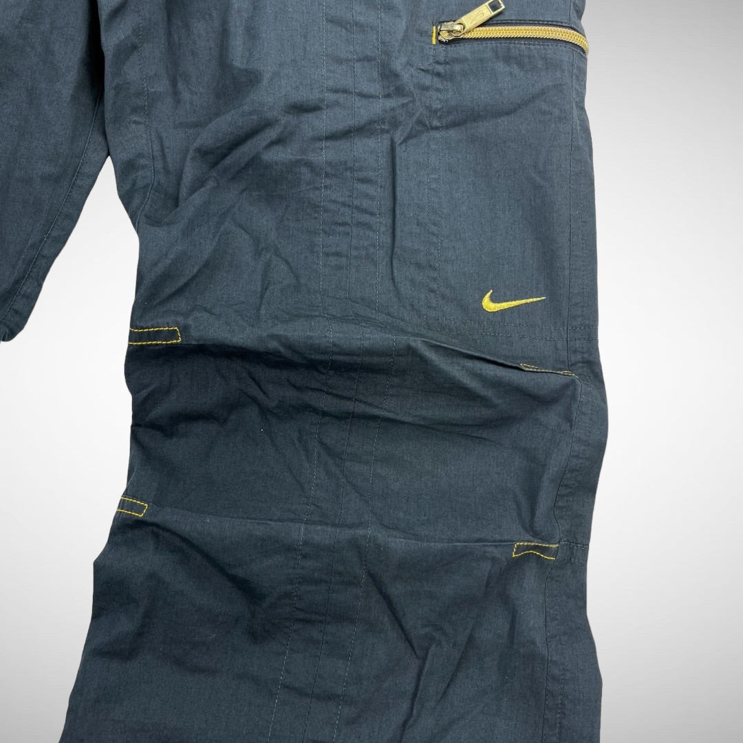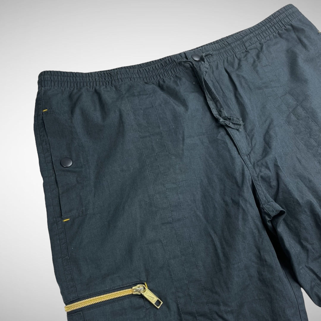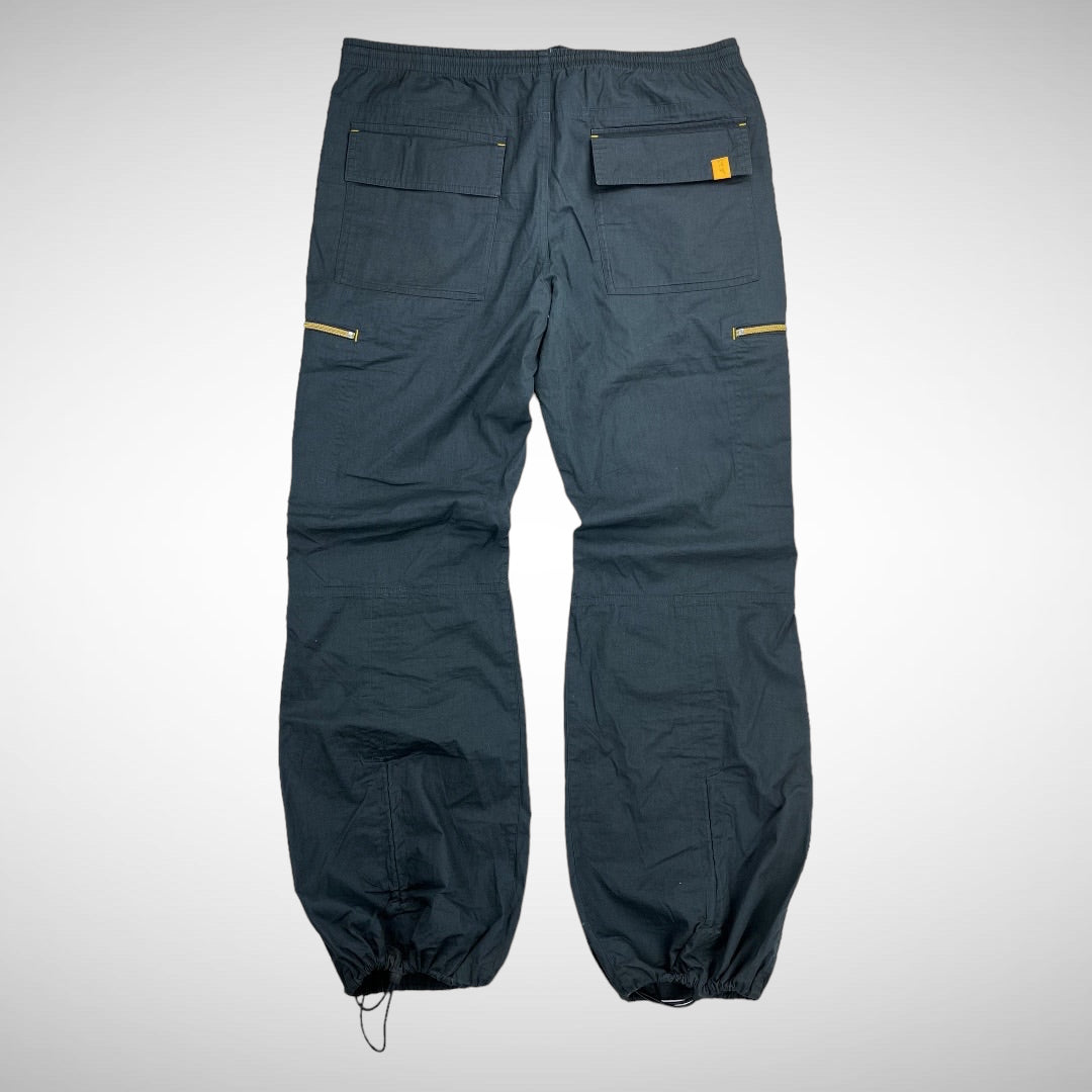 Tactical pants made from cotton with adjustable elastic toggles at ankles and ropes at waist, golden zip-pockets matching the stitching details near press-button pockets, highlighting the knees, embroidered swoosh and back flap-pockets together with an unfamiliar ‘Just do it’ patch on the backside.
