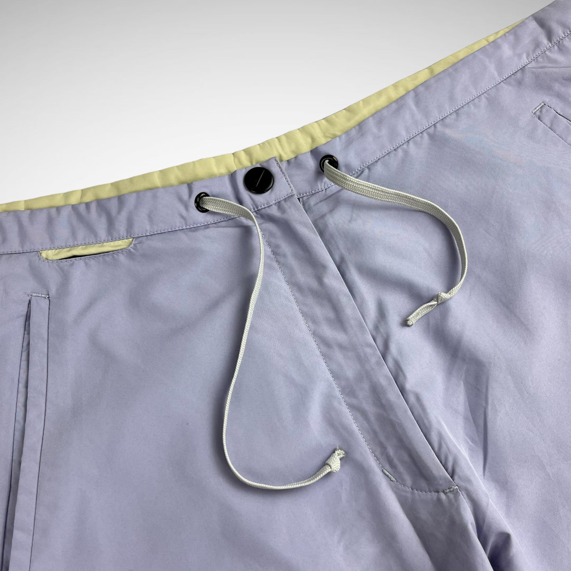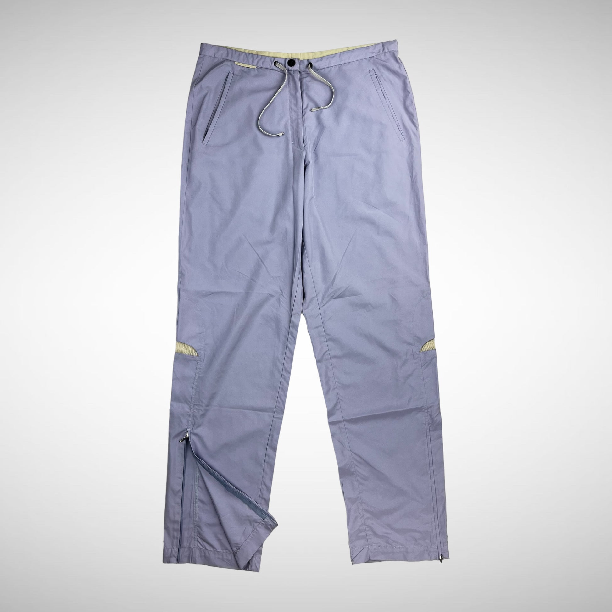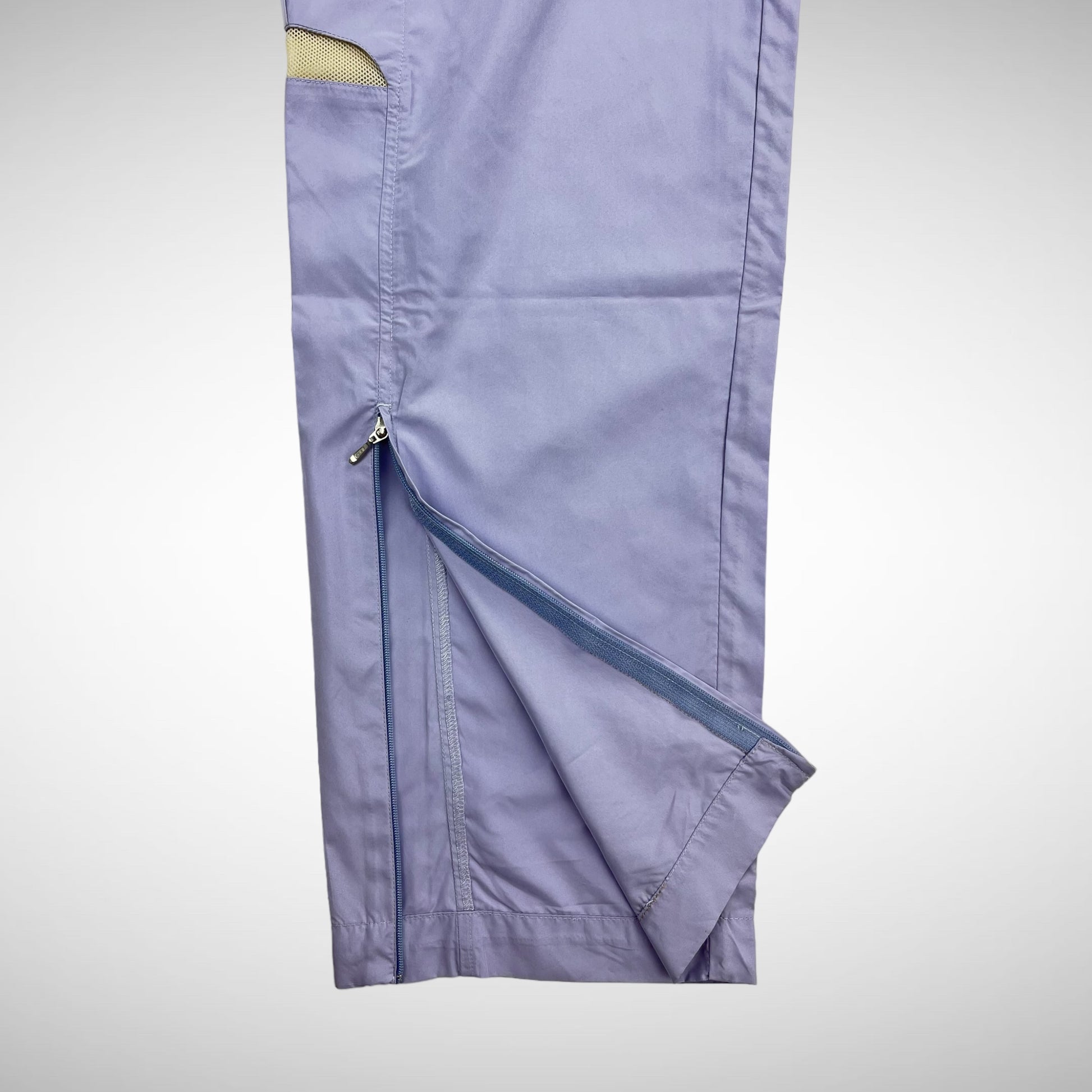 Lilac nylon with mesh intakes, zip pockets, exposed drawstrings and zip expandable ankles.