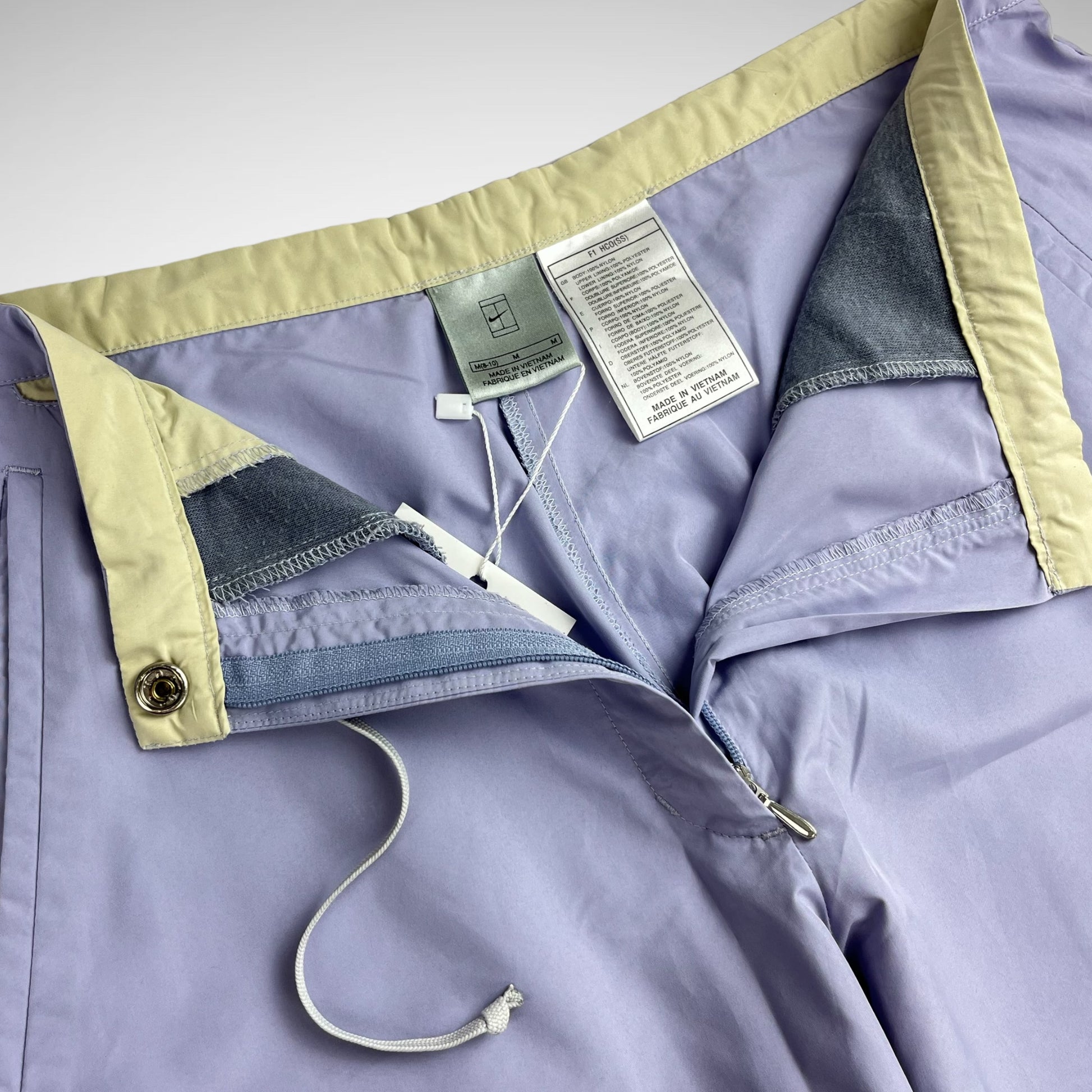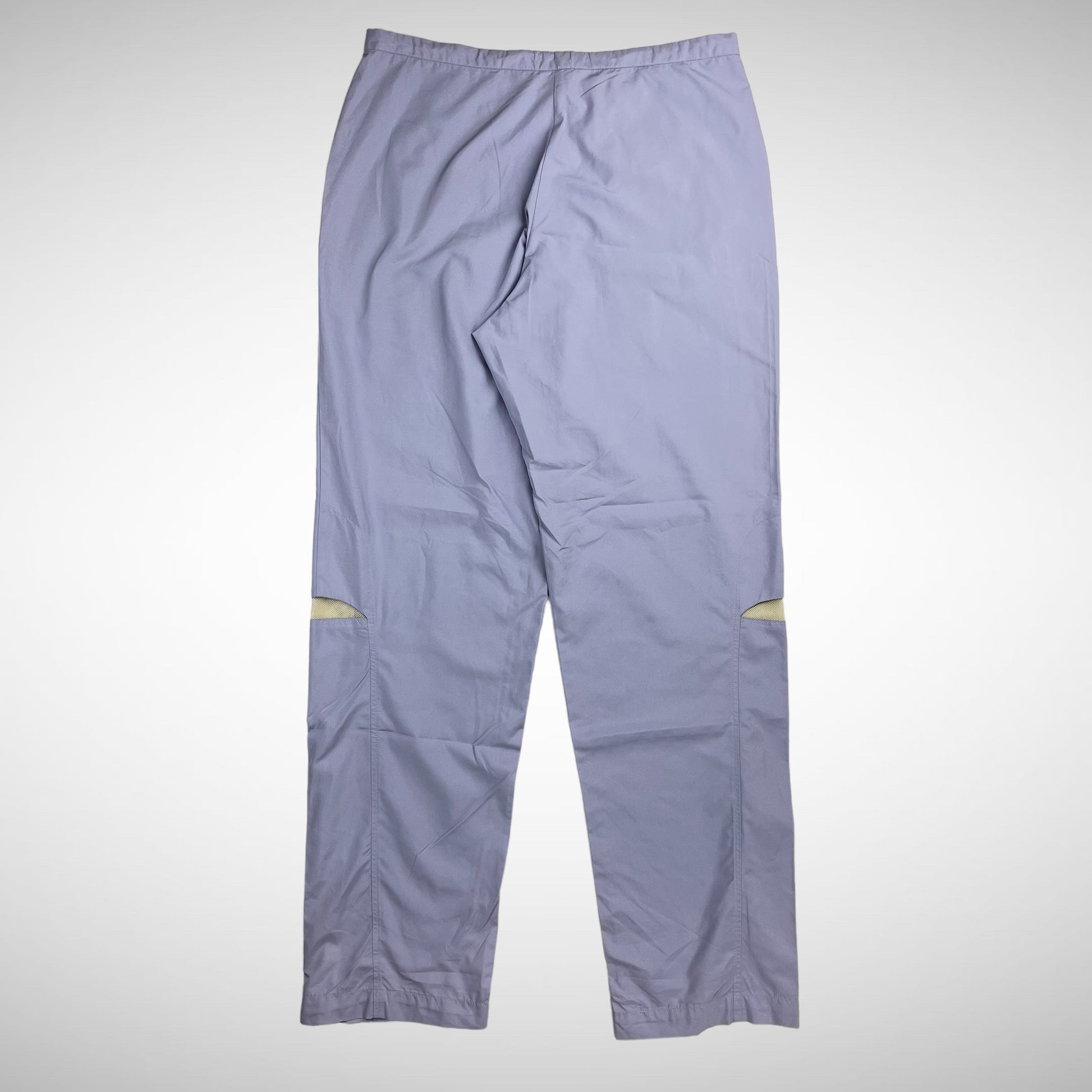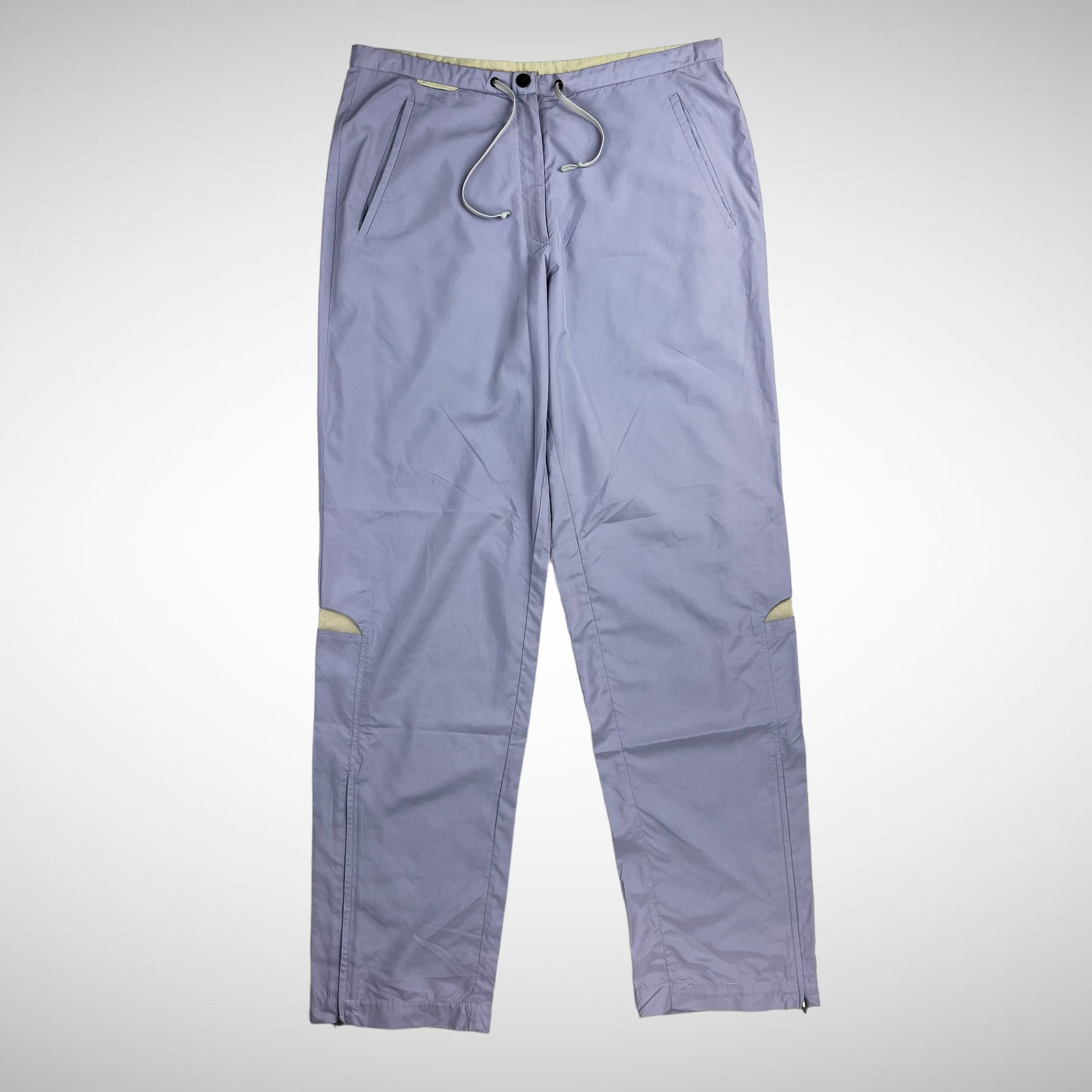 Lilac nylon with mesh intakes, zip pockets, exposed drawstrings and zip expandable ankles.