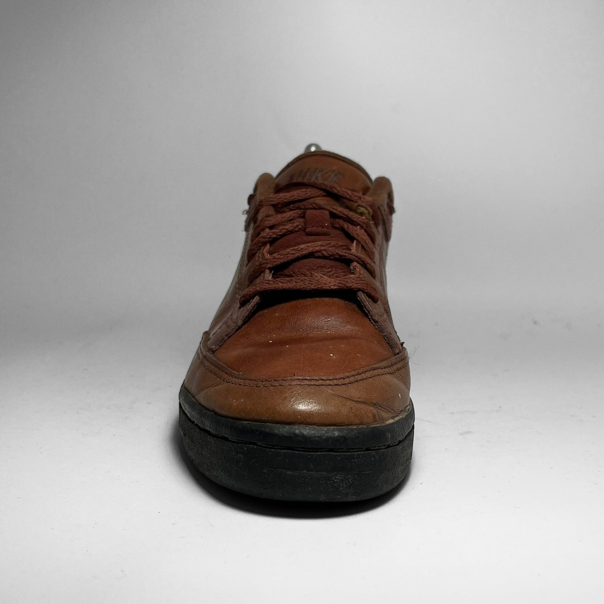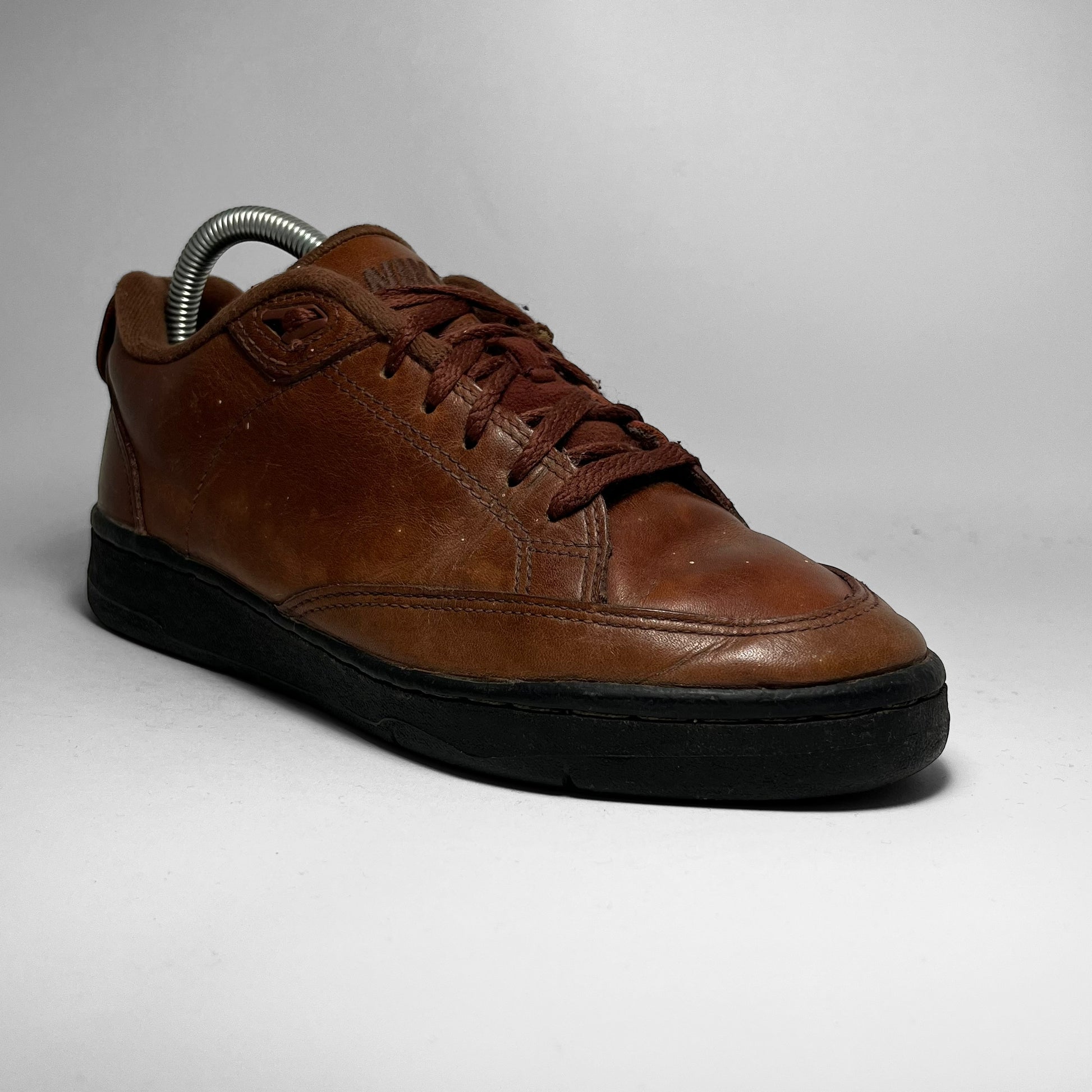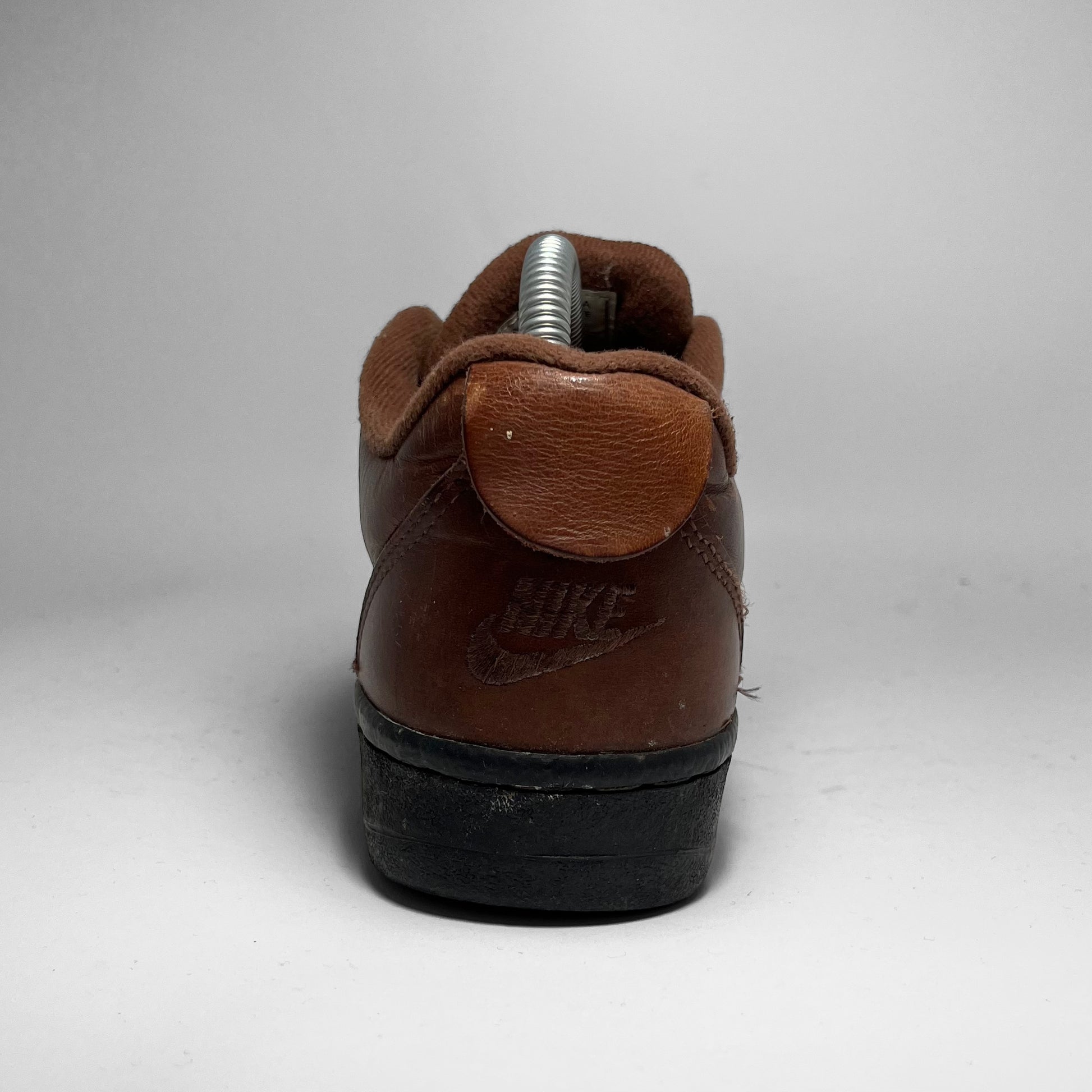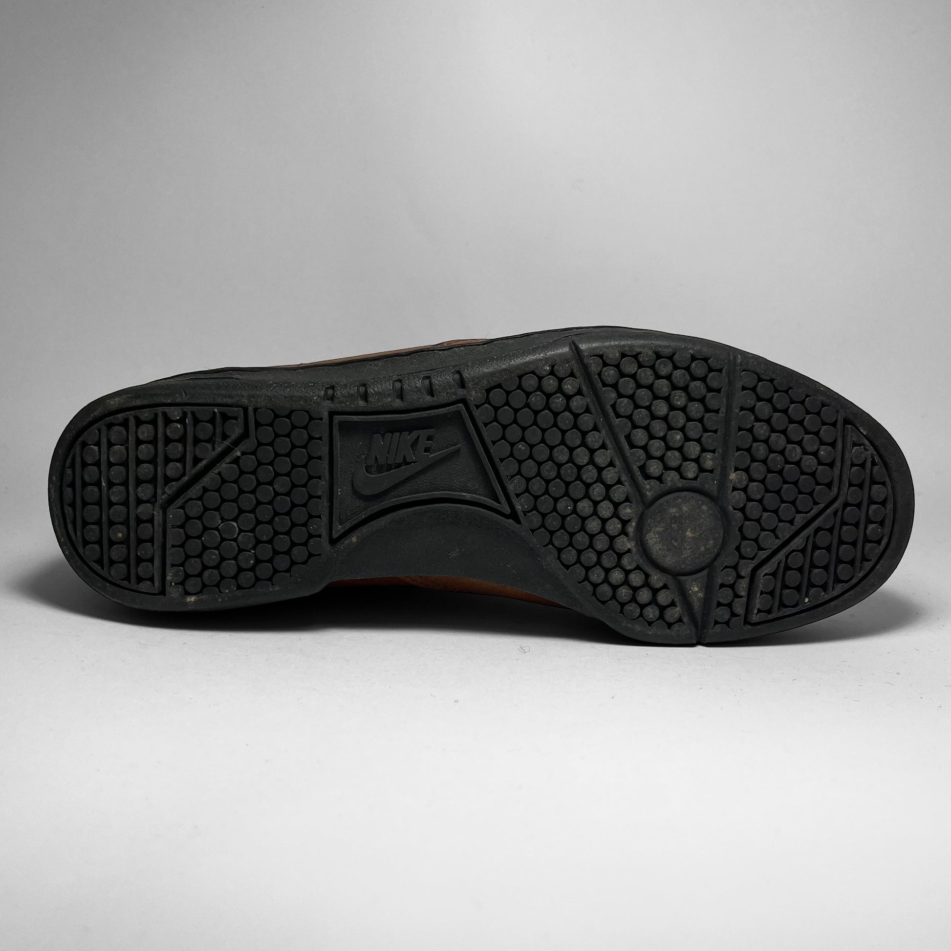 Proper vintage, old goodness. Leather upper panels in brown with minimal branding (no swoosh), hidden embossed logo beneath the heel-flap also seen on tongue, soft leather with beautiful aging and partly stitched sole unit.