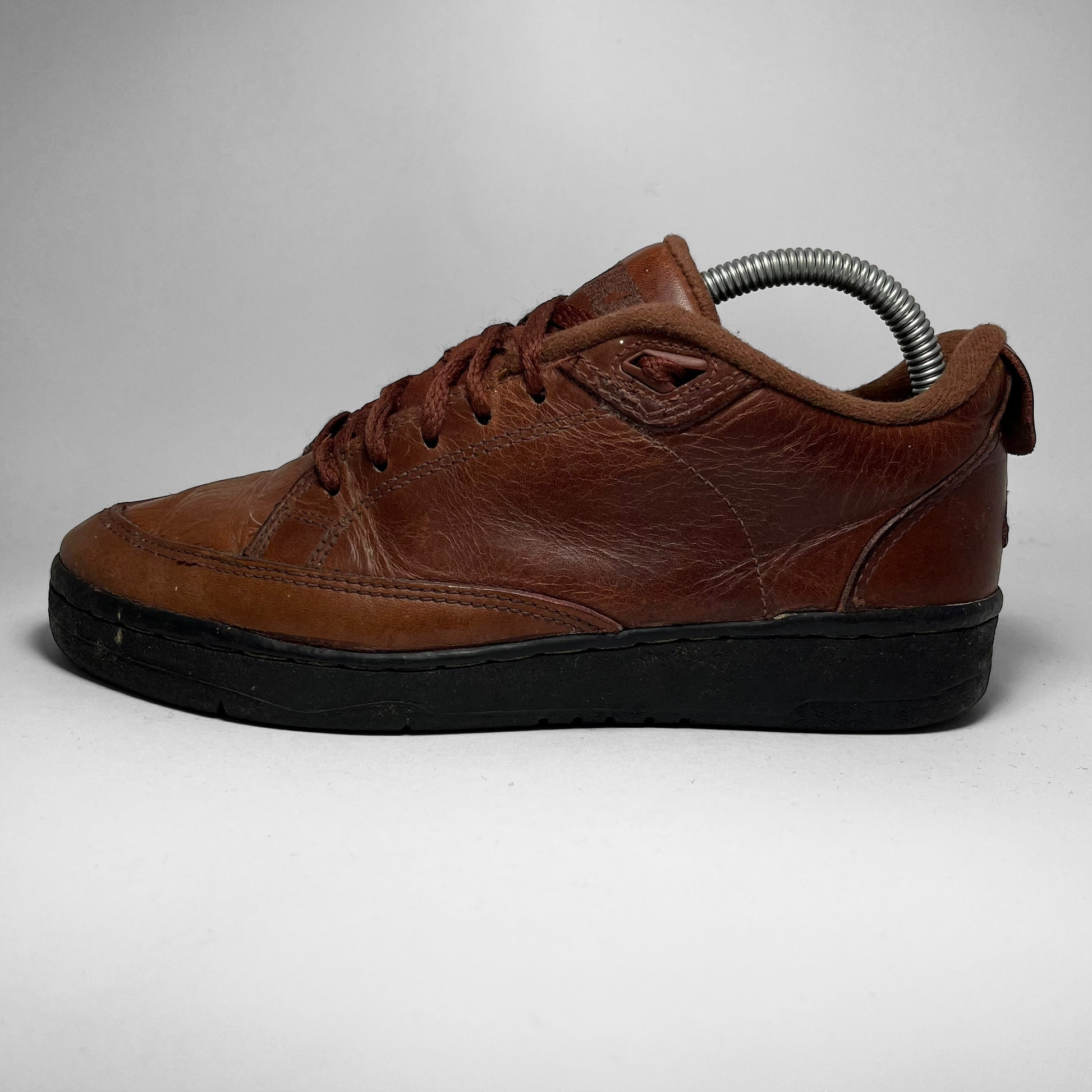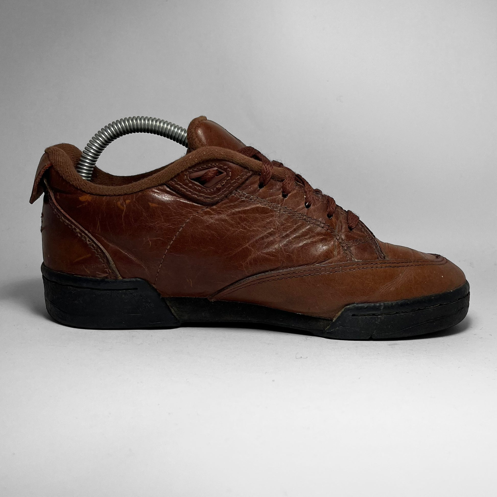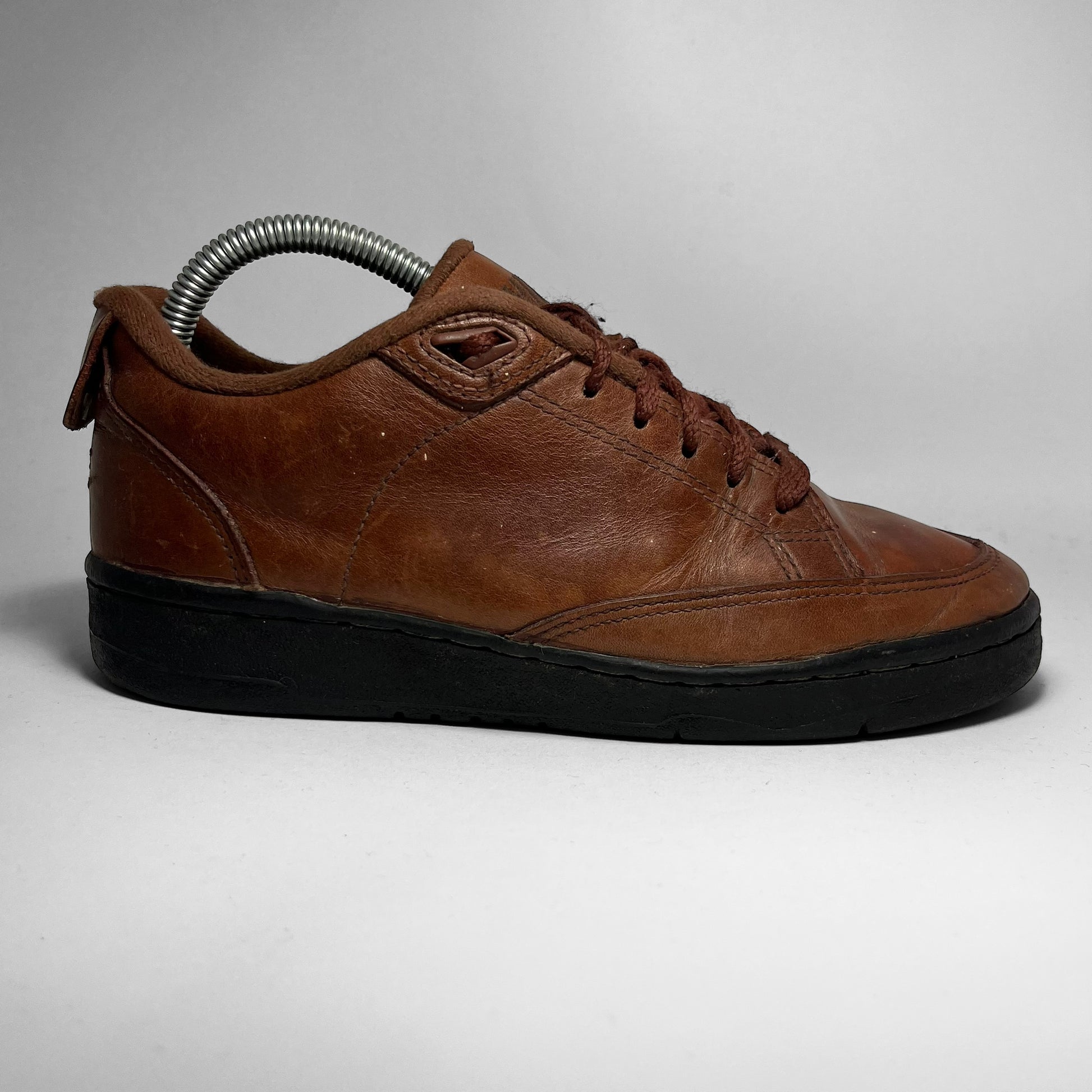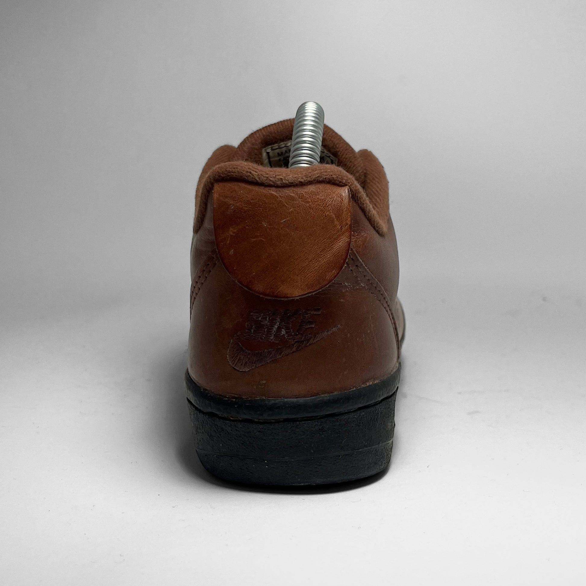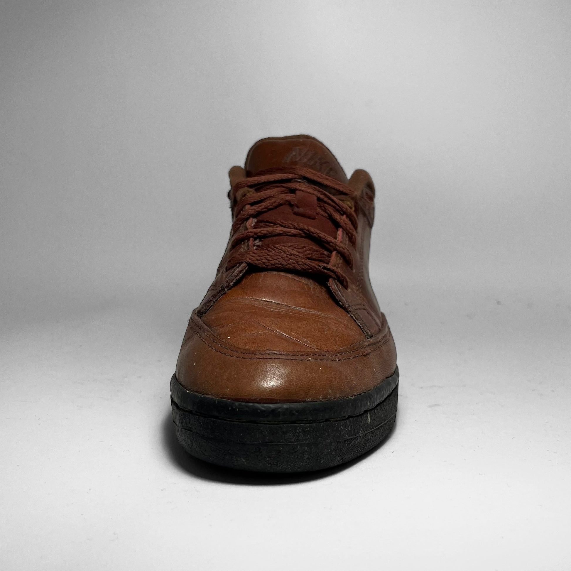 Proper vintage, old goodness. Leather upper panels in brown with minimal branding (no swoosh), hidden embossed logo beneath the heel-flap also seen on tongue, soft leather with beautiful aging and partly stitched sole unit.